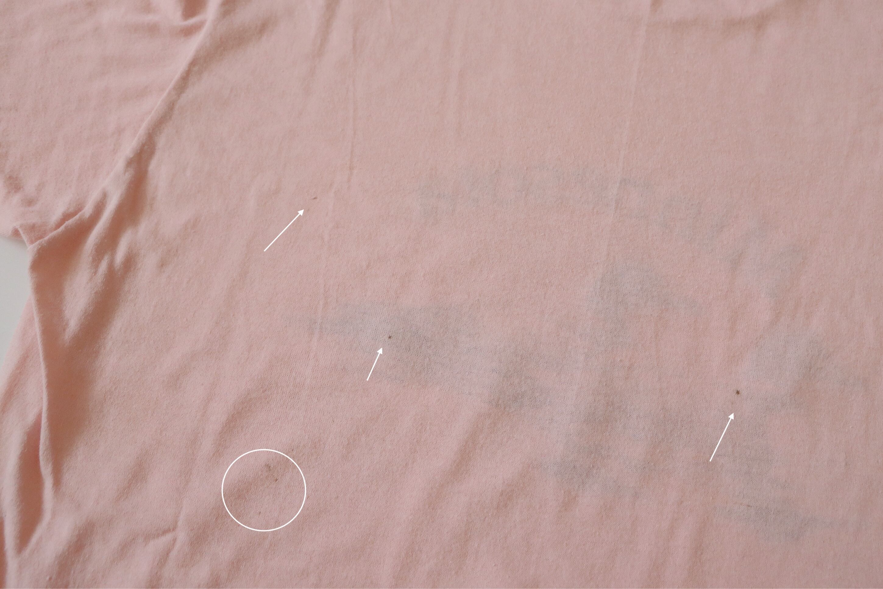 UsedTシャツ特有の適度な使用感と、後ろ身頃にベージュ系の小さな点とスレ汚れがございます。