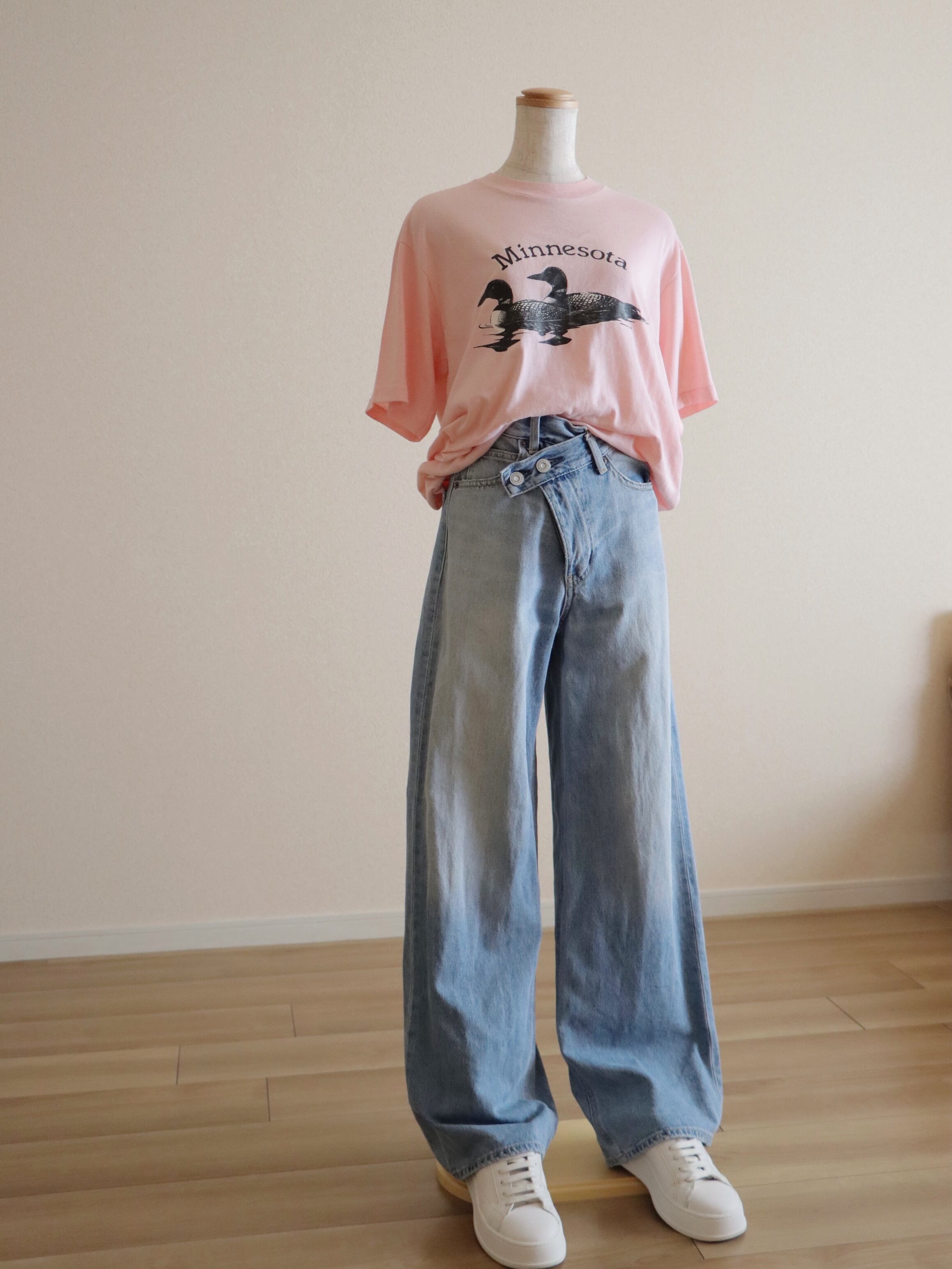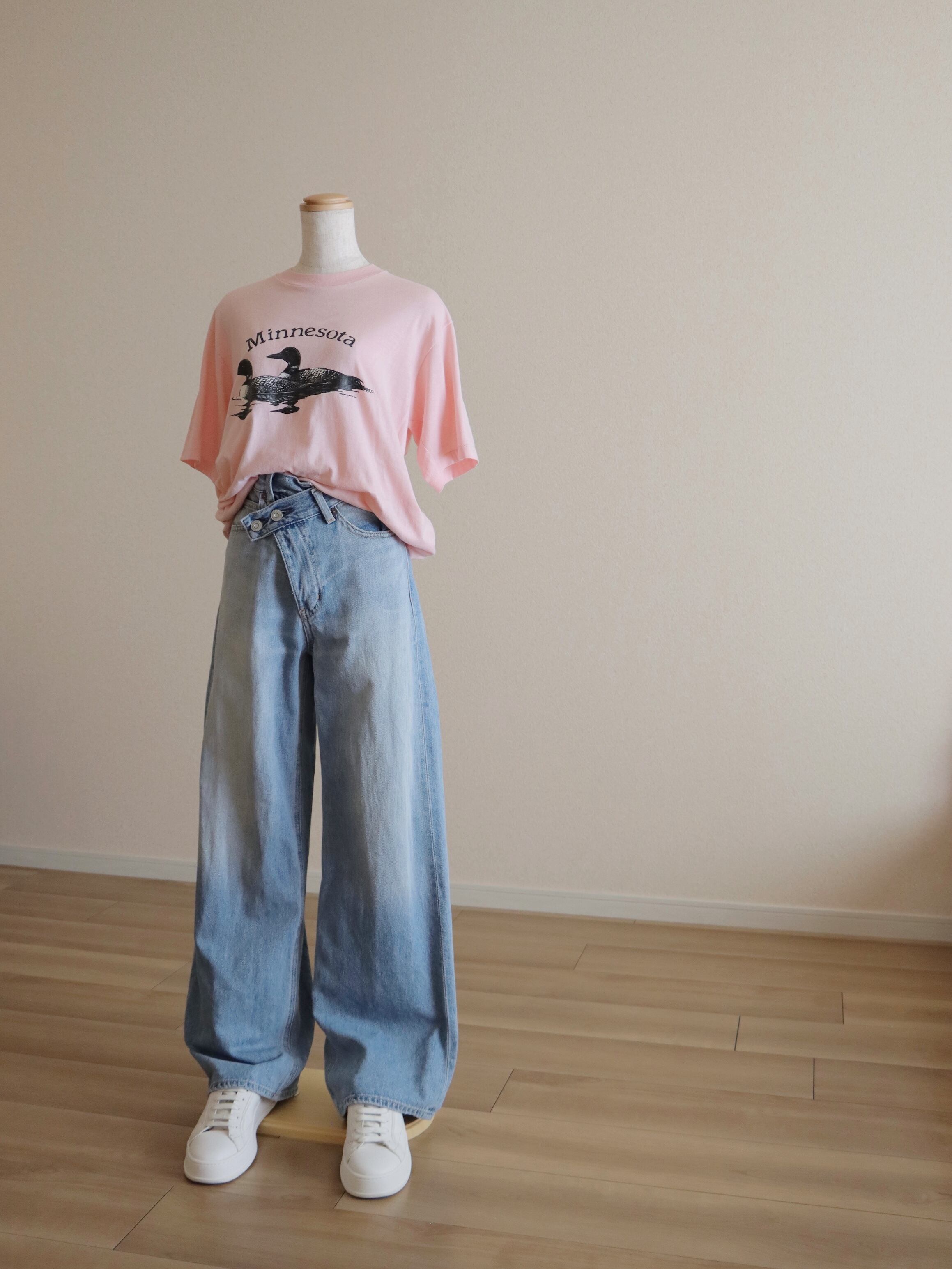 フロントの可愛らしいプリントと、淡く優しいピンクカラーが目を惹く1着◎