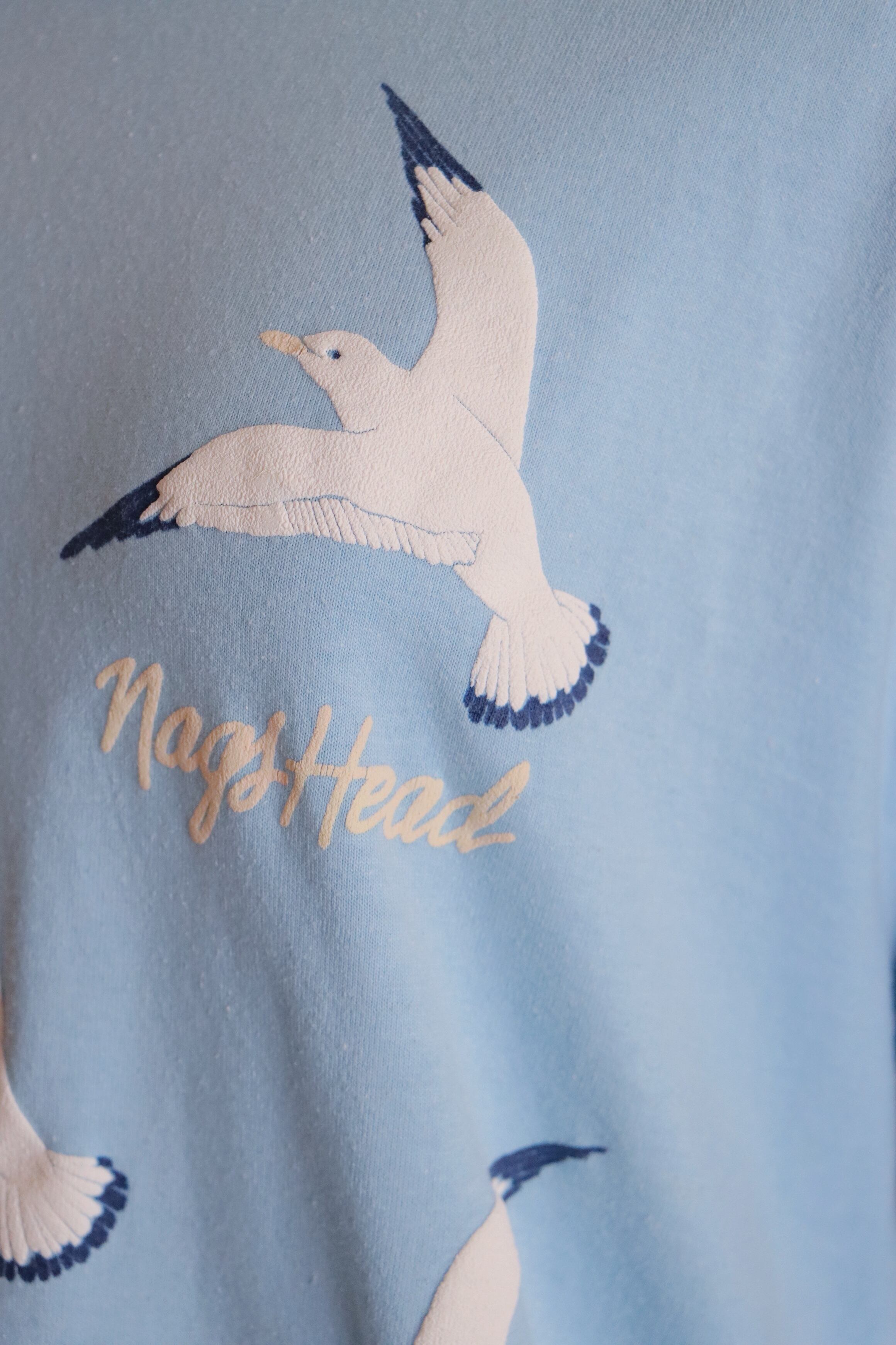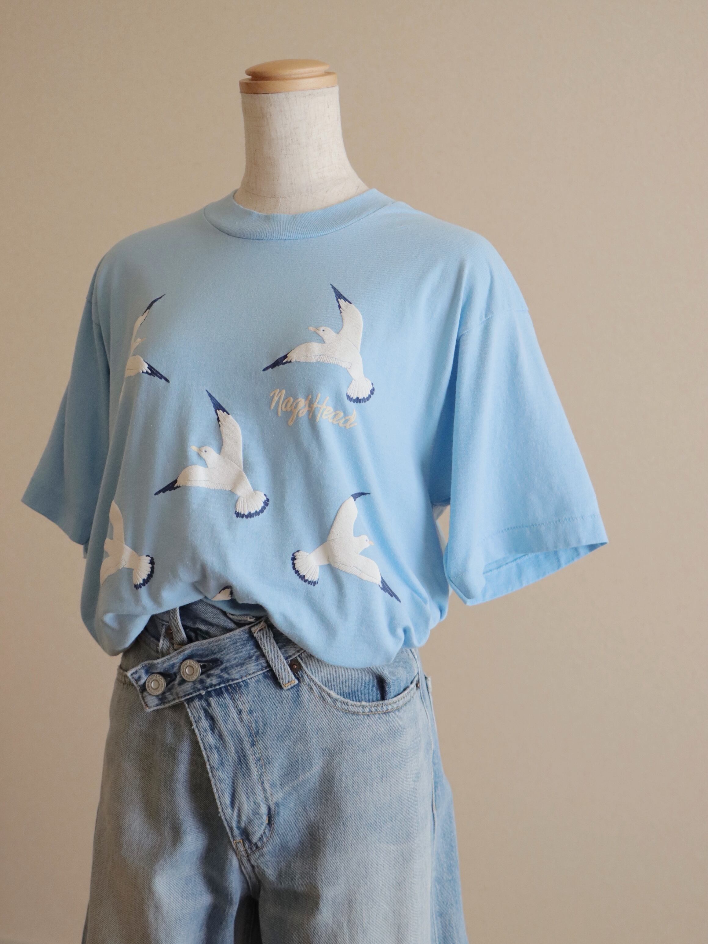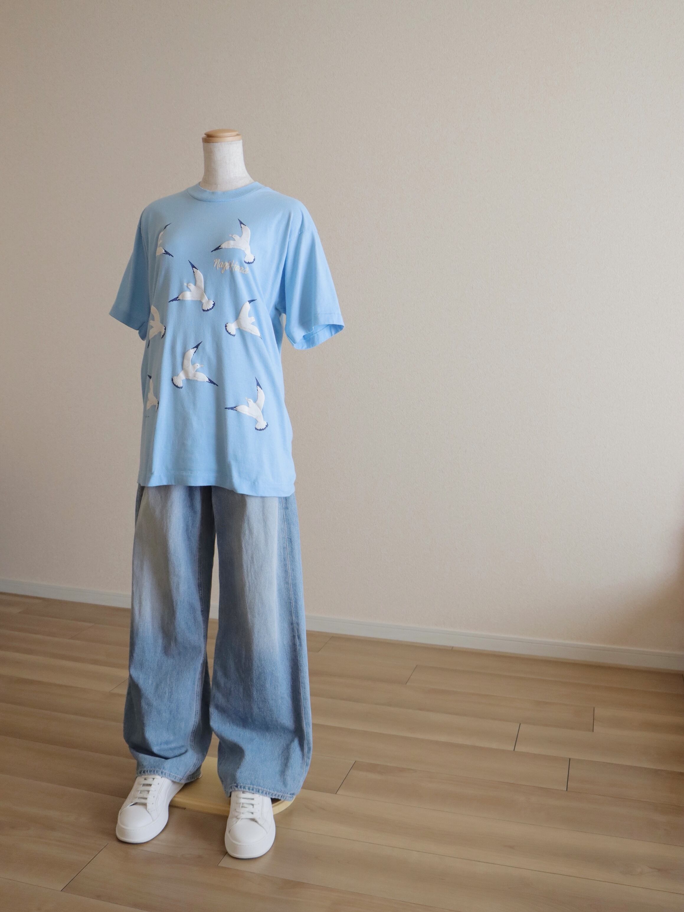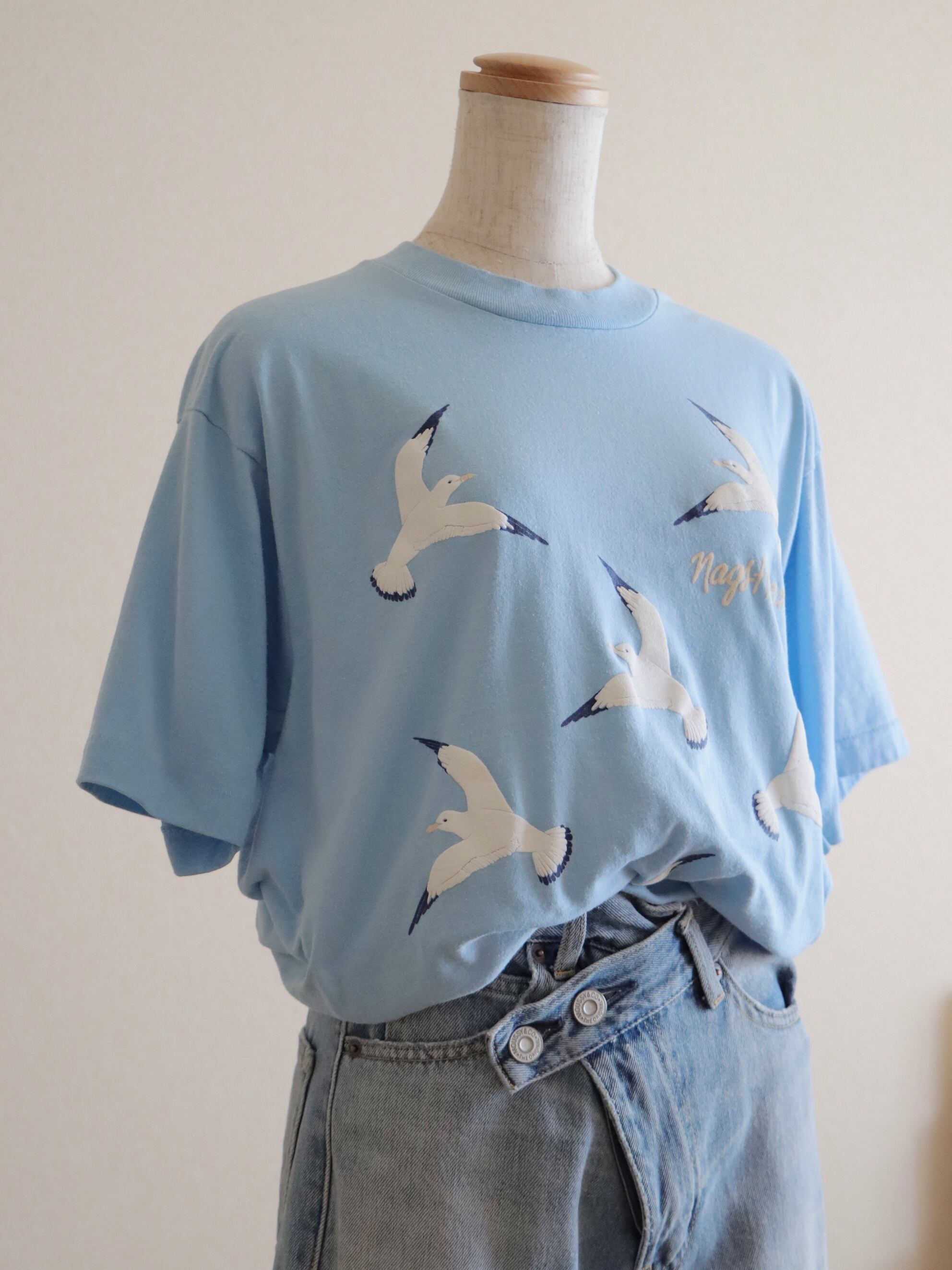 淡く優しいペールブルーのボディに、マリンテイストのカモメプリントが目を惹く1着です。