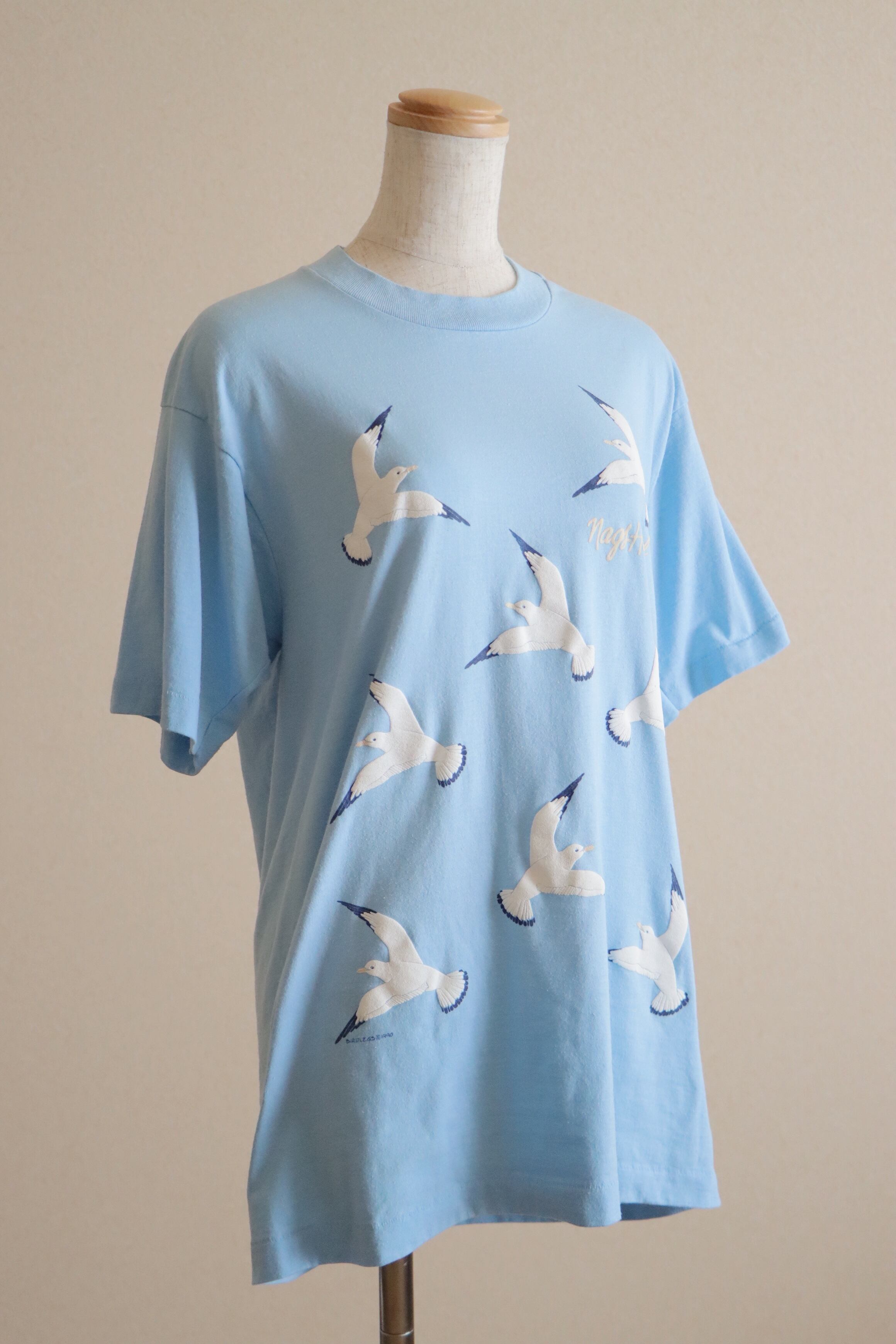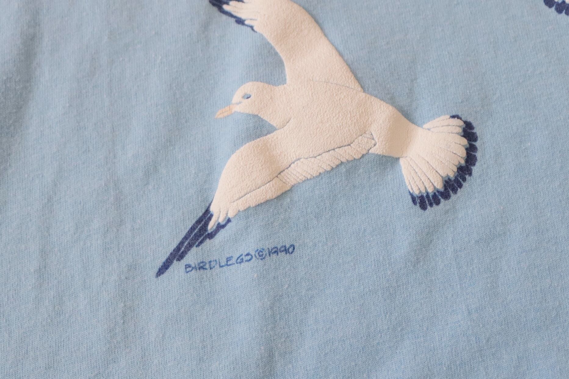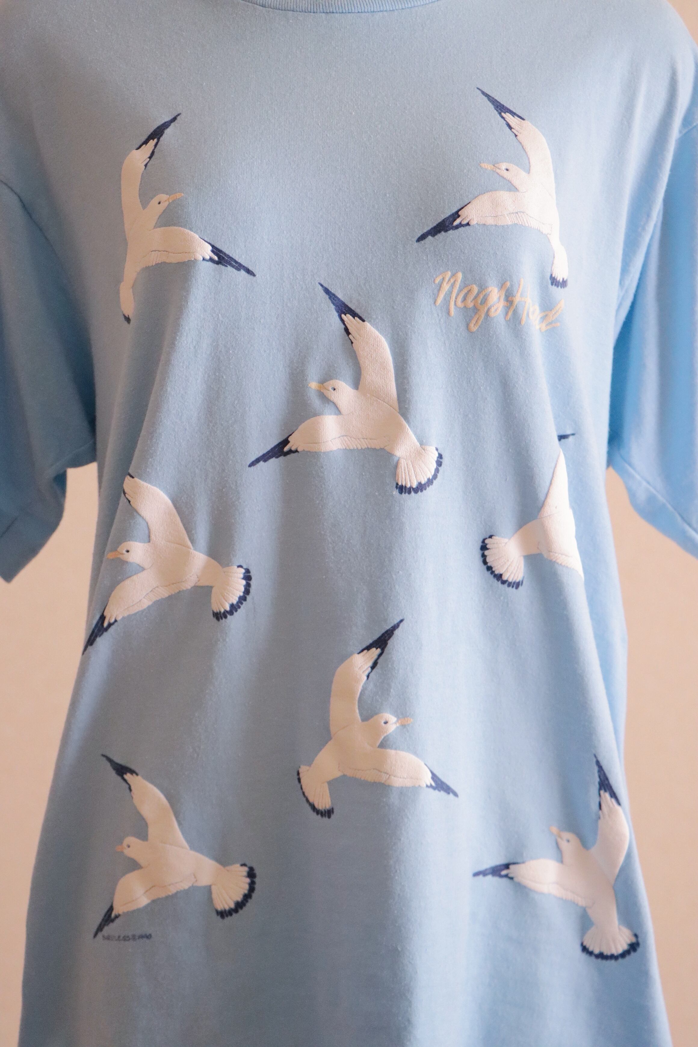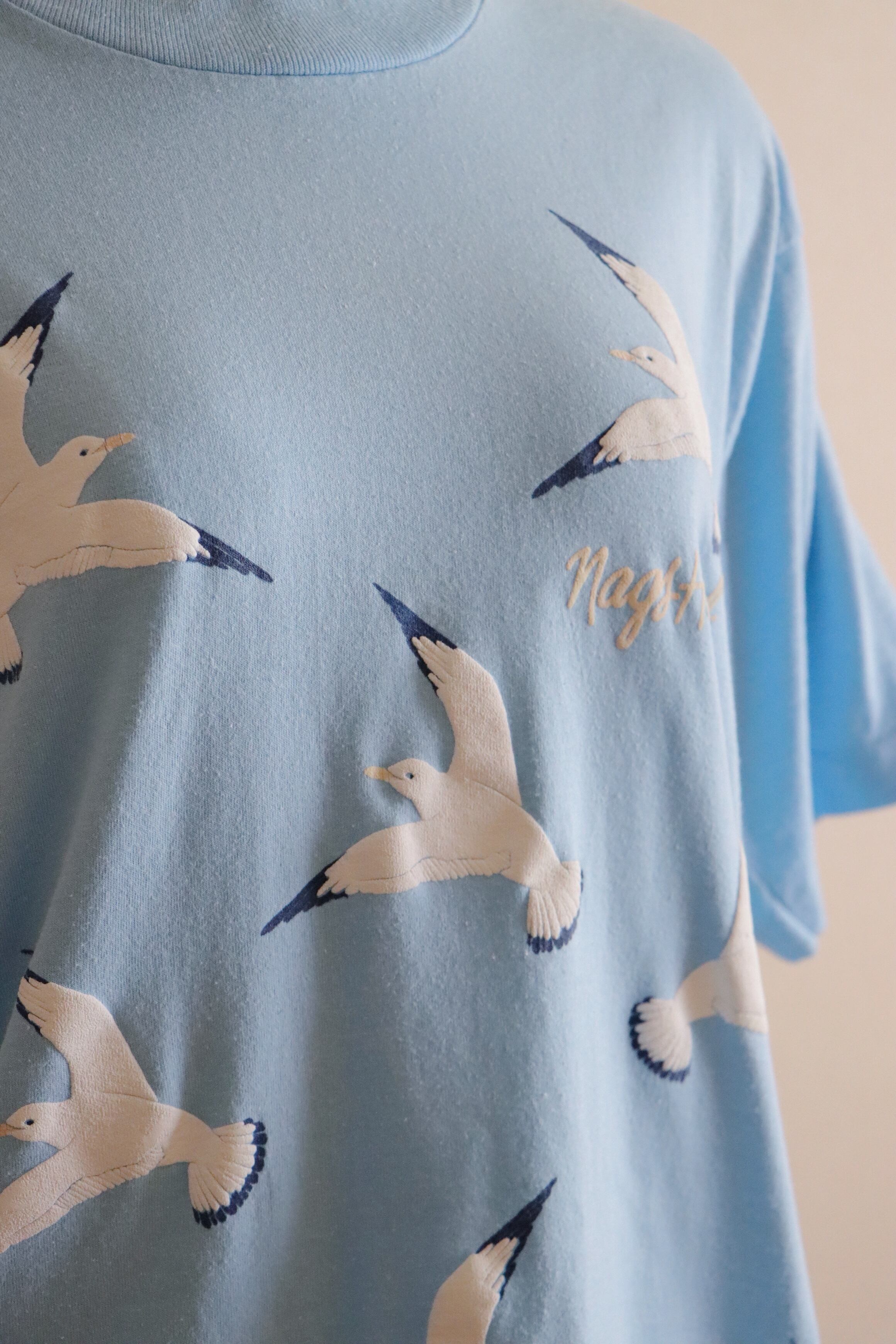 淡く優しいペールブルーのボディに、マリンテイストのカモメプリントが目を惹く1着です。