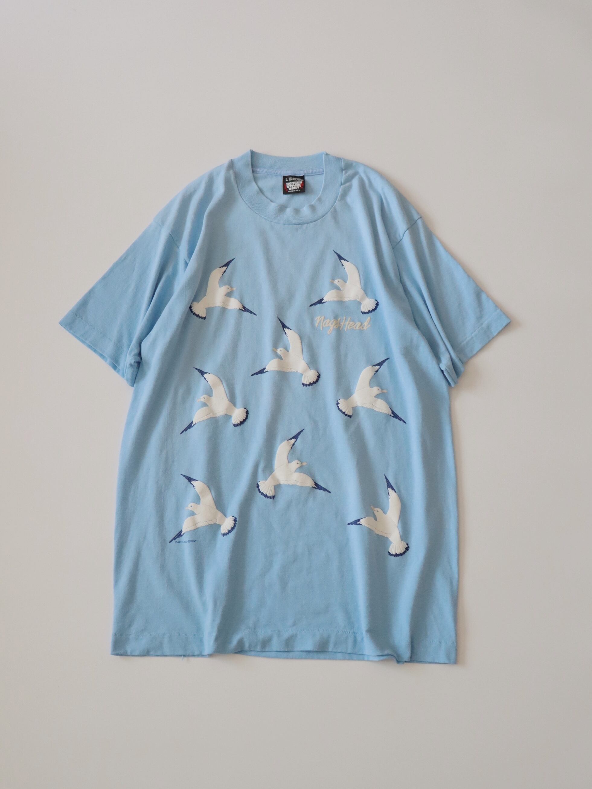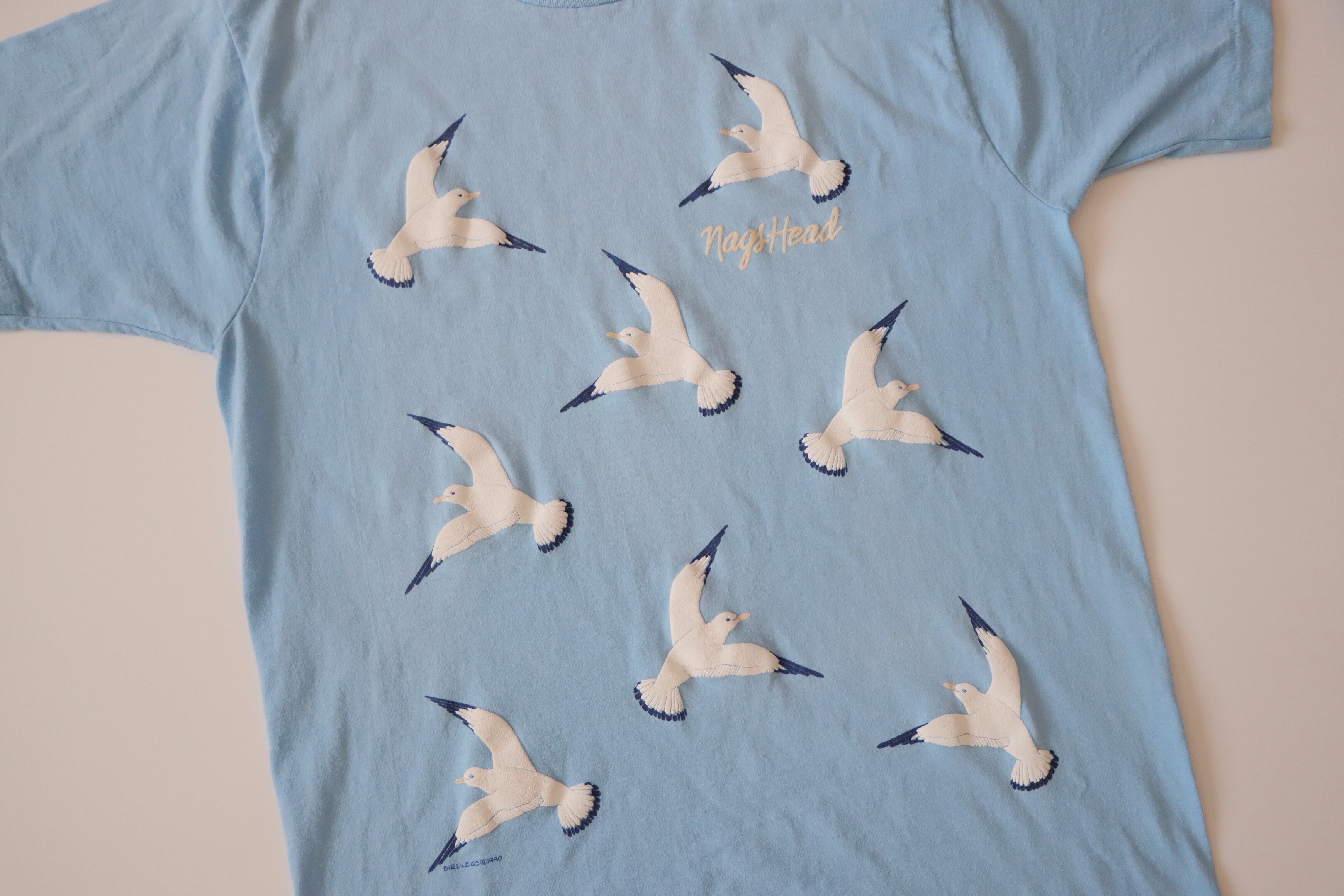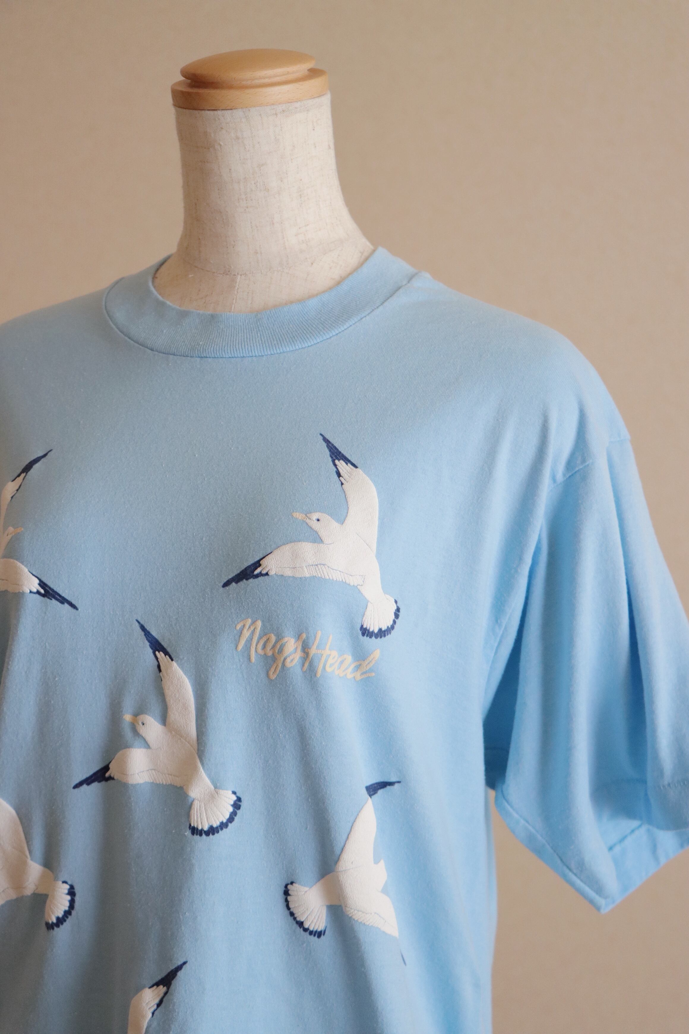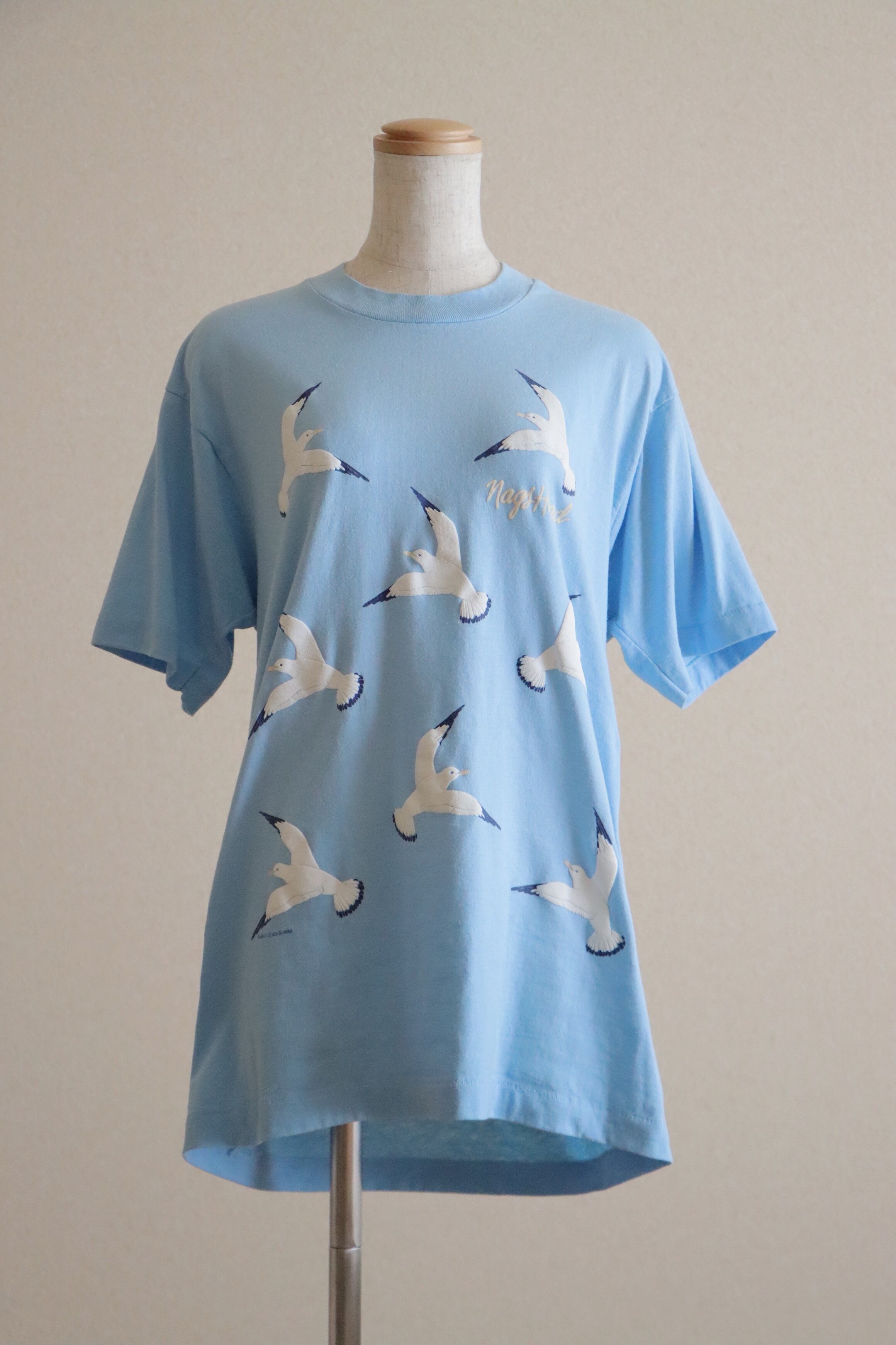 淡く優しいペールブルーのボディに、マリンテイストのカモメプリントが目を惹く1着です。