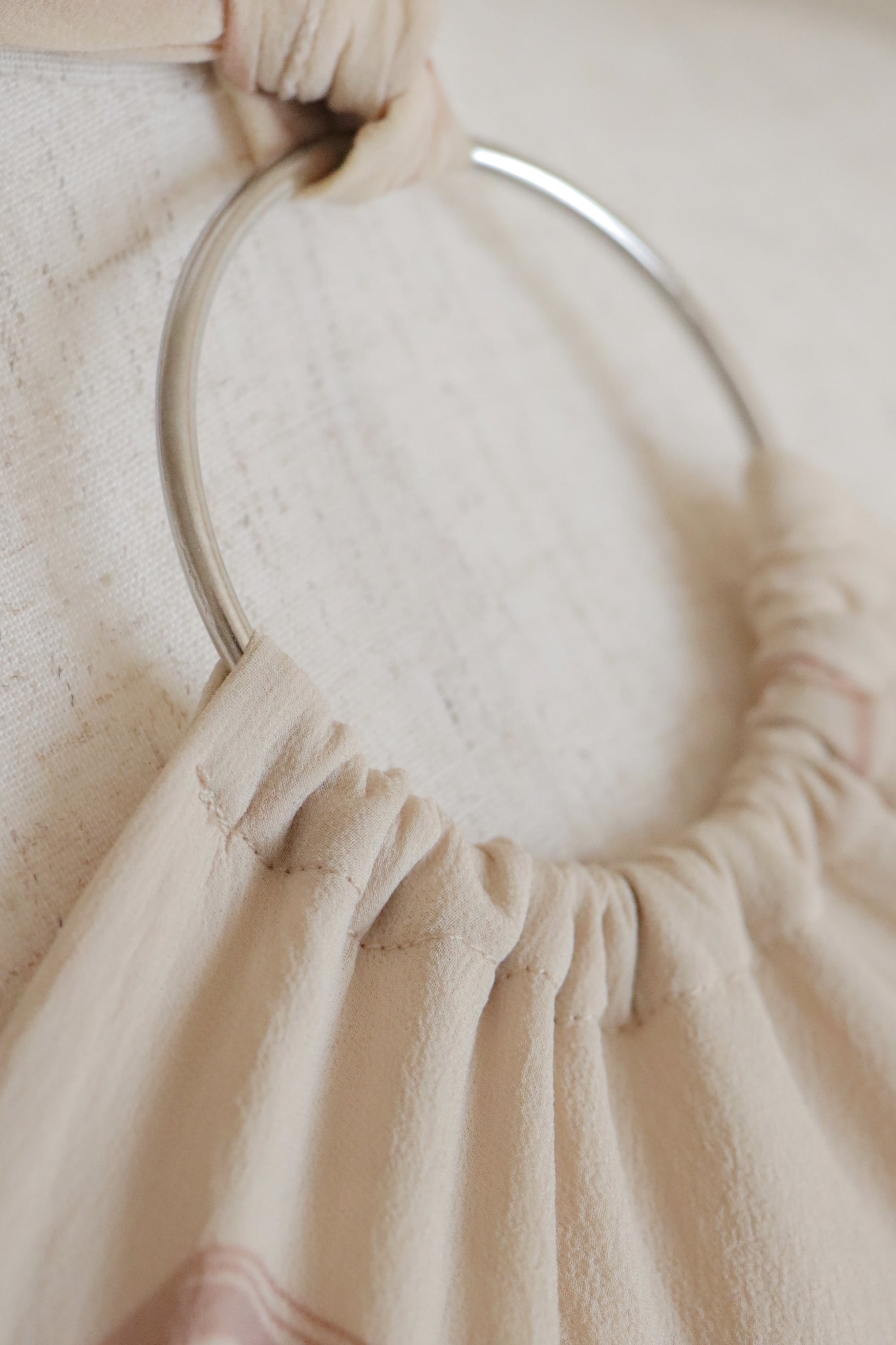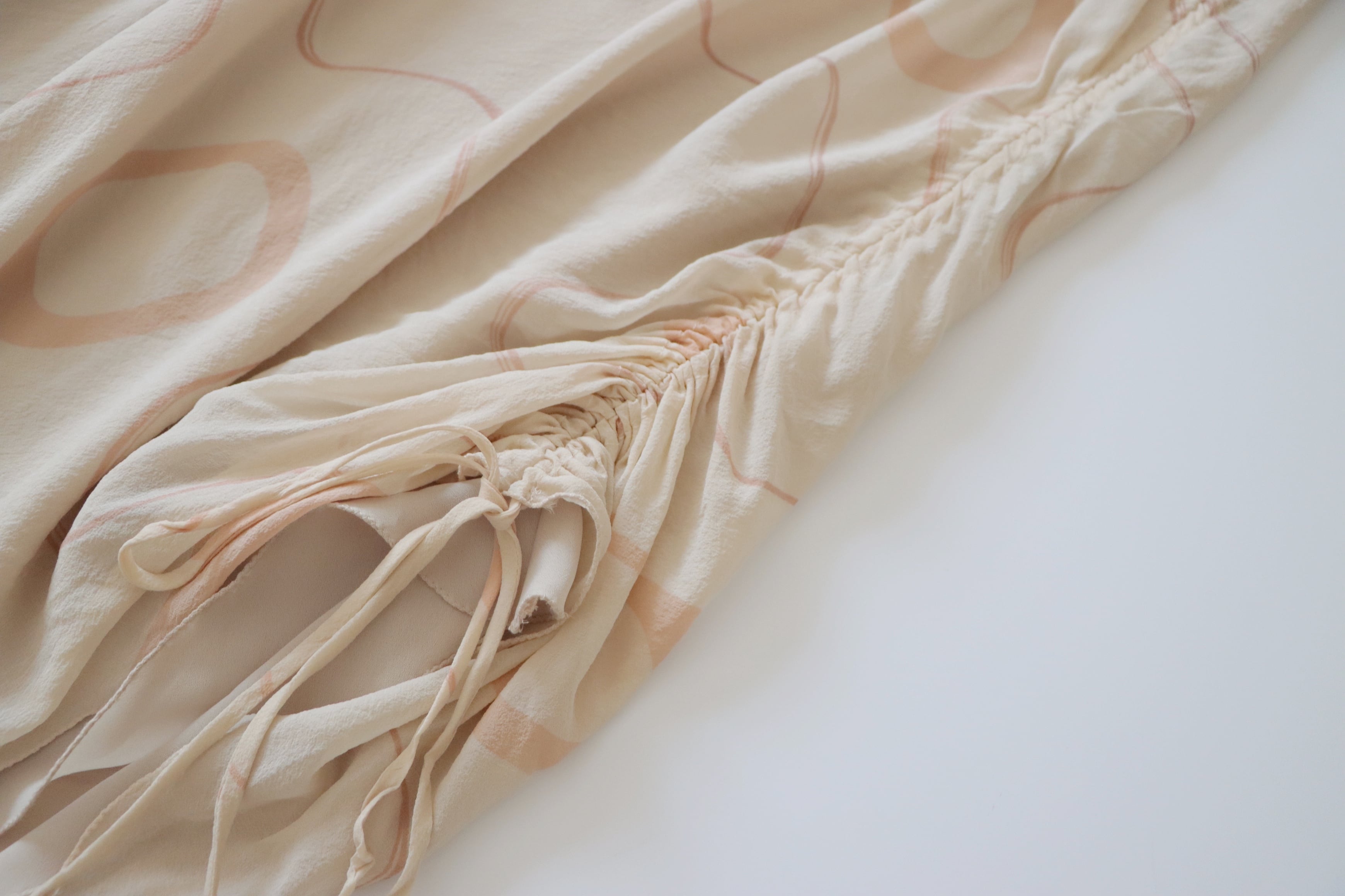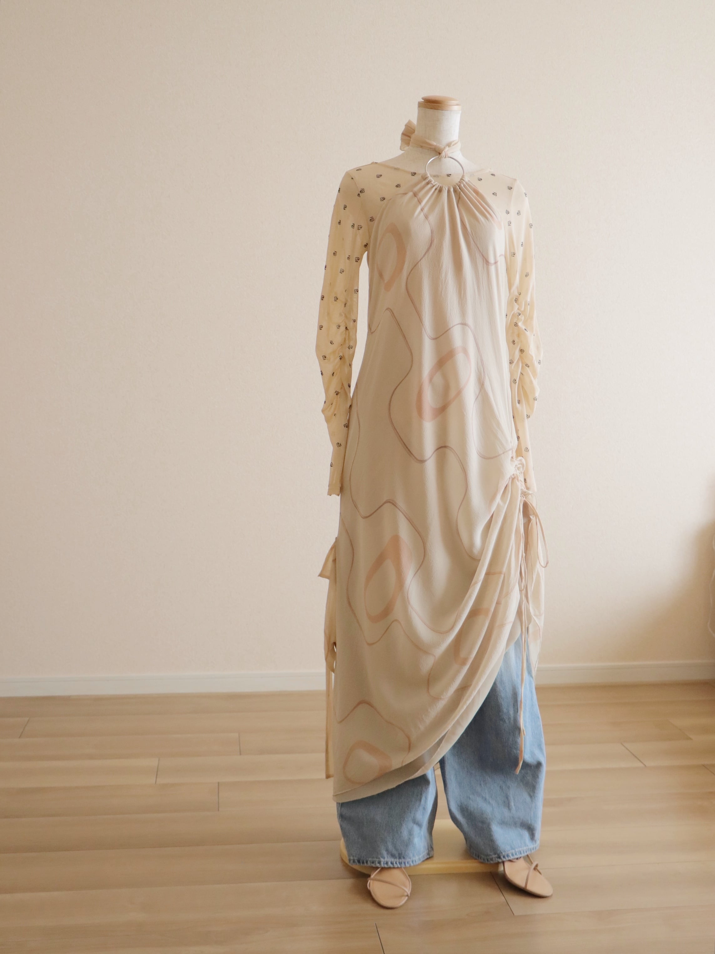 淡く優しいマーブル調の幾何学柄で上品さを出しつつ、サイドのポケットやシャーリング紐でカジュアルさを出した、甘さ控えめな大人のカジュアル感あふれるアイテムです。