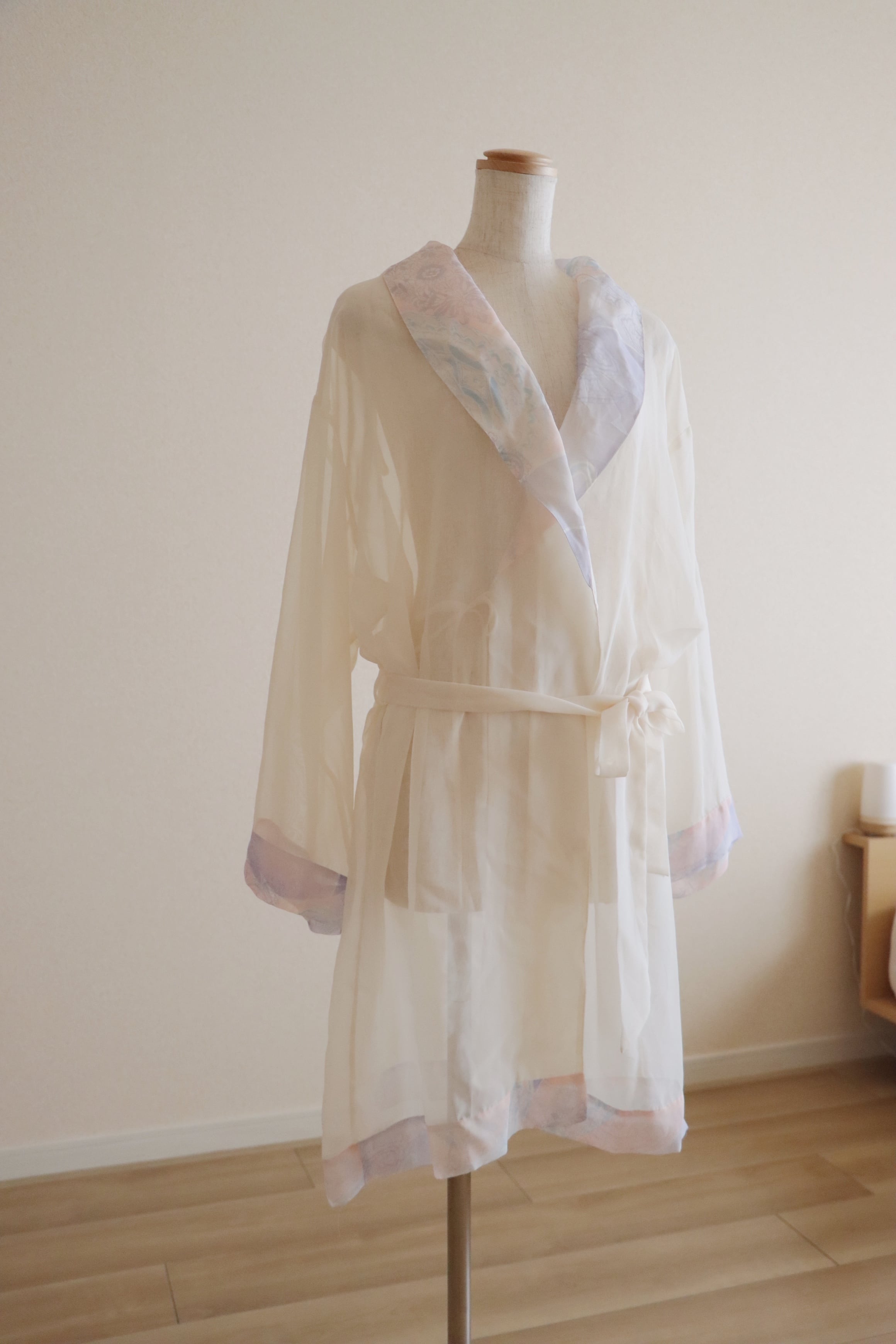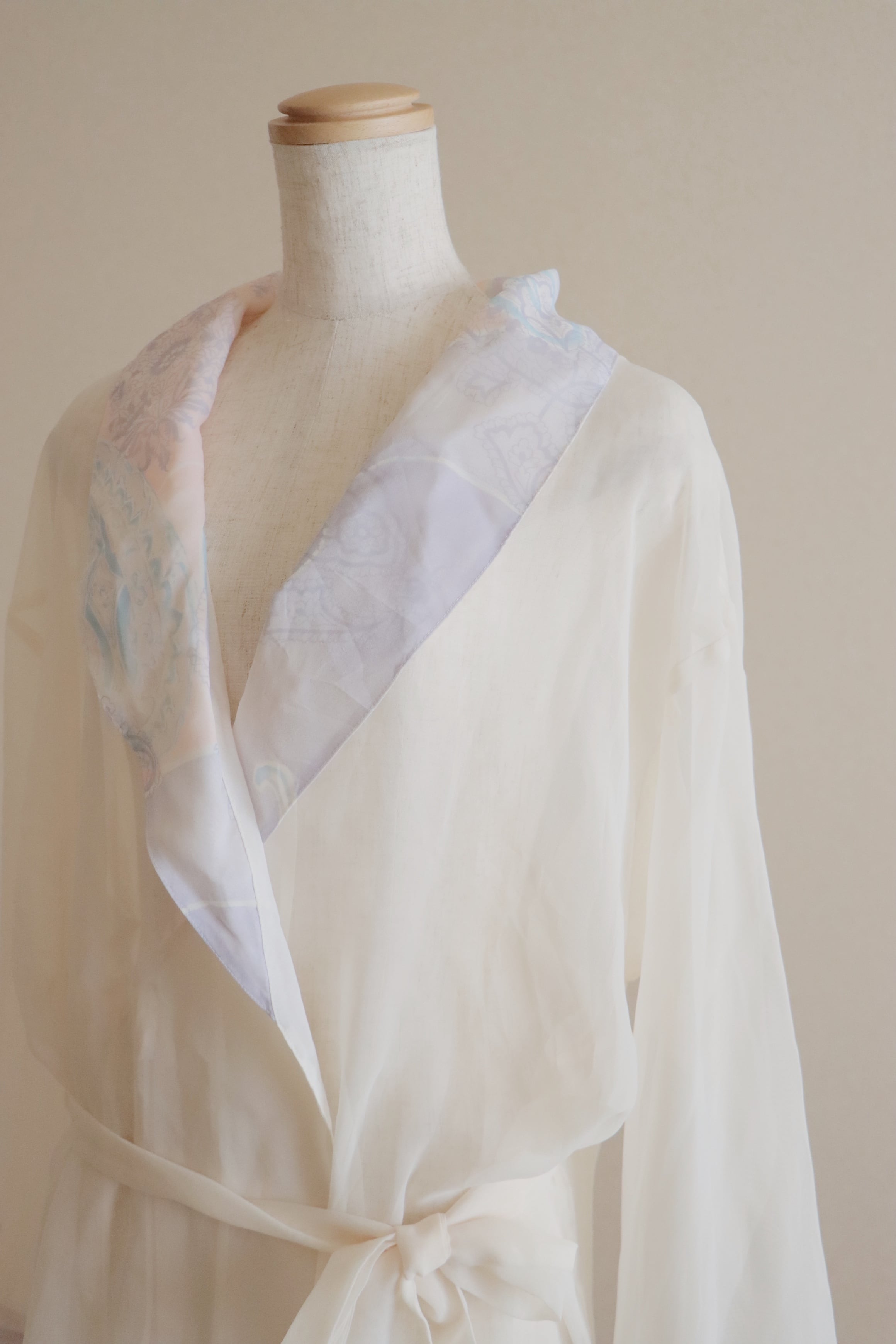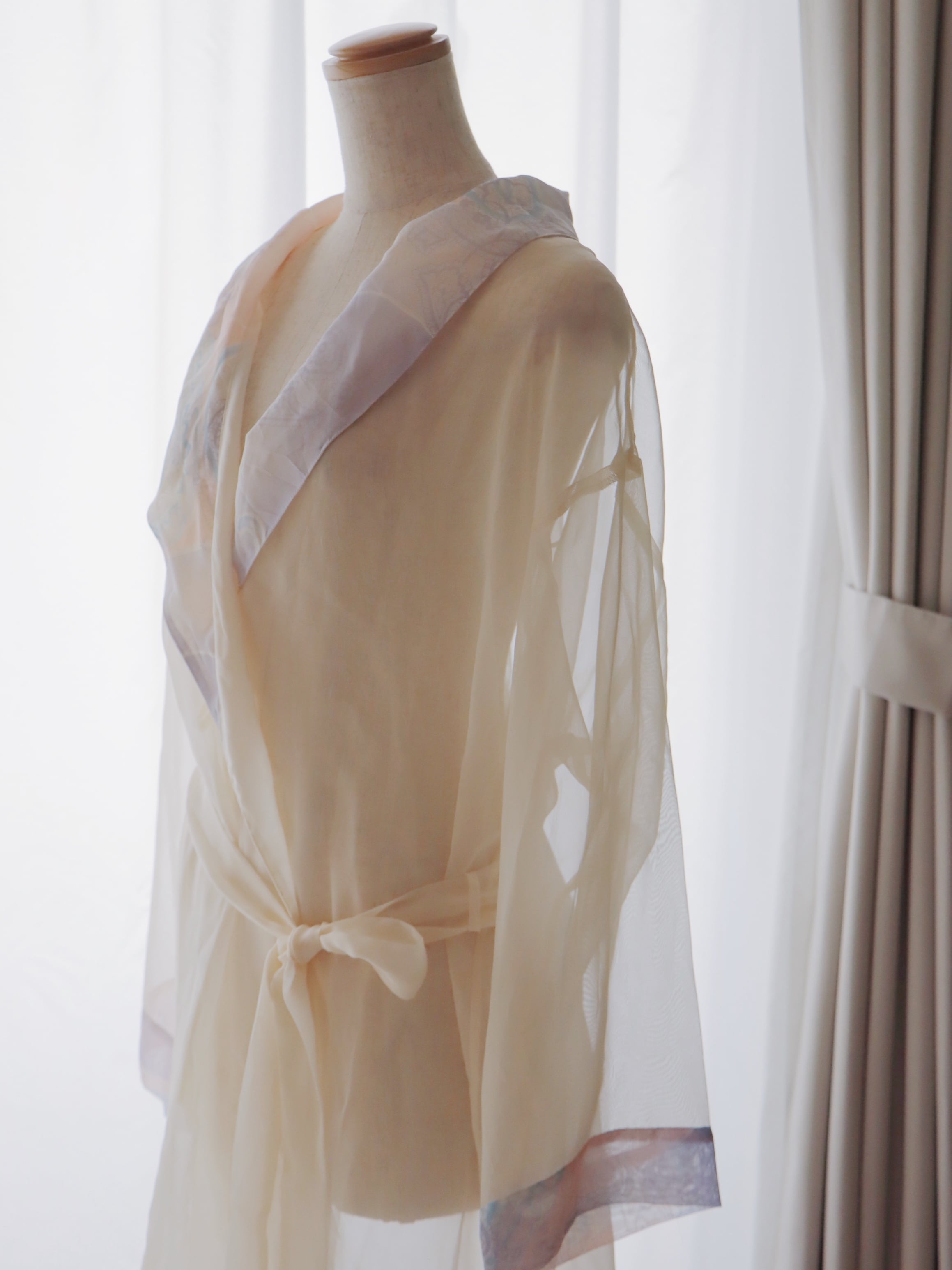 襟元の淡く優しい花柄の生地がアクセントになった、リラックス感溢れるシアーガウン。
