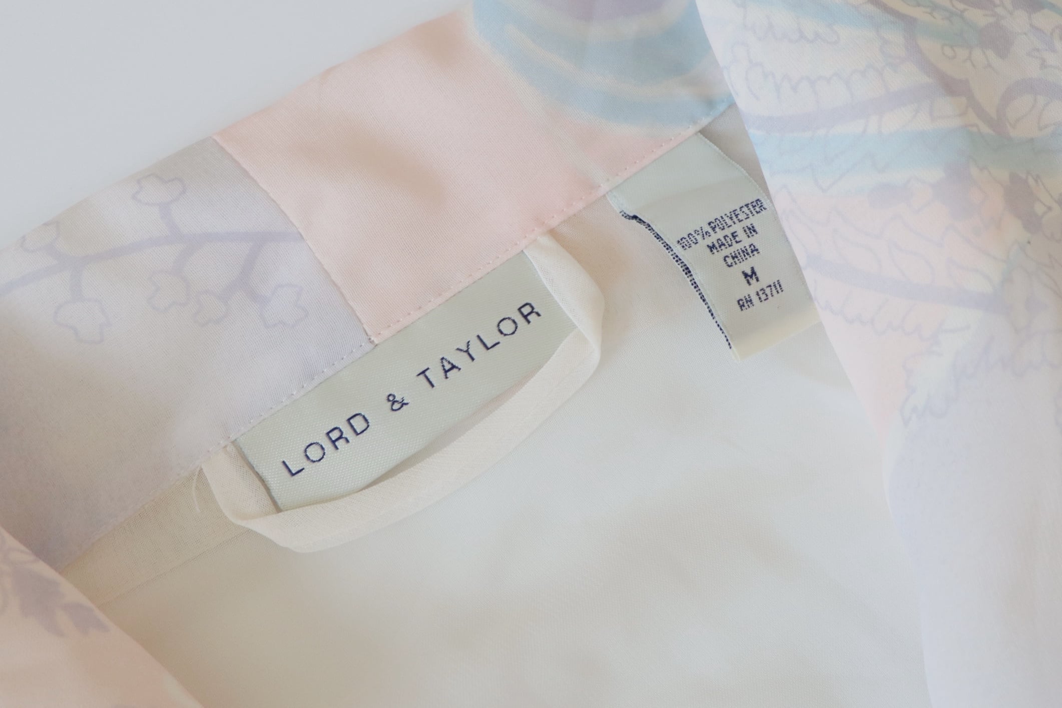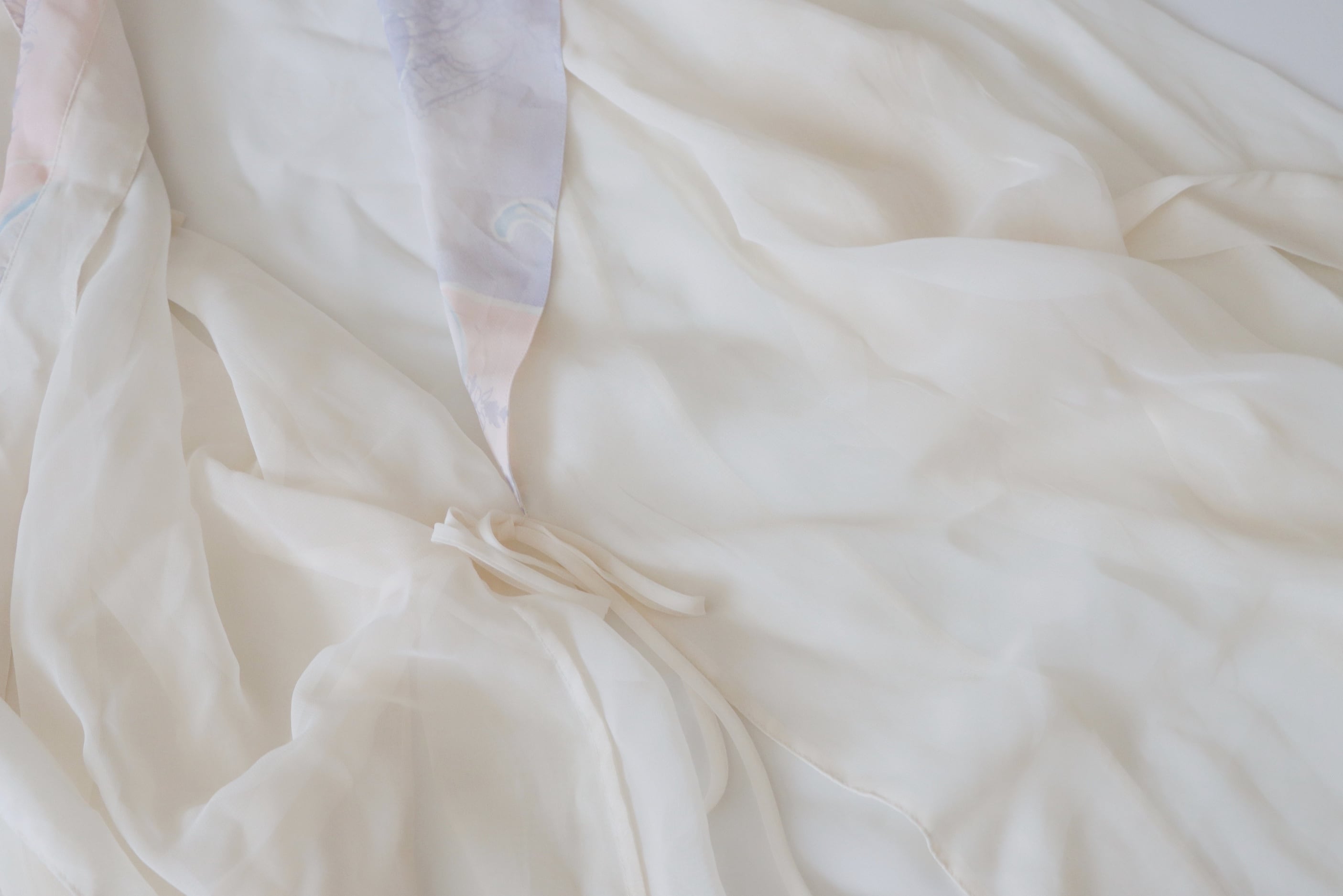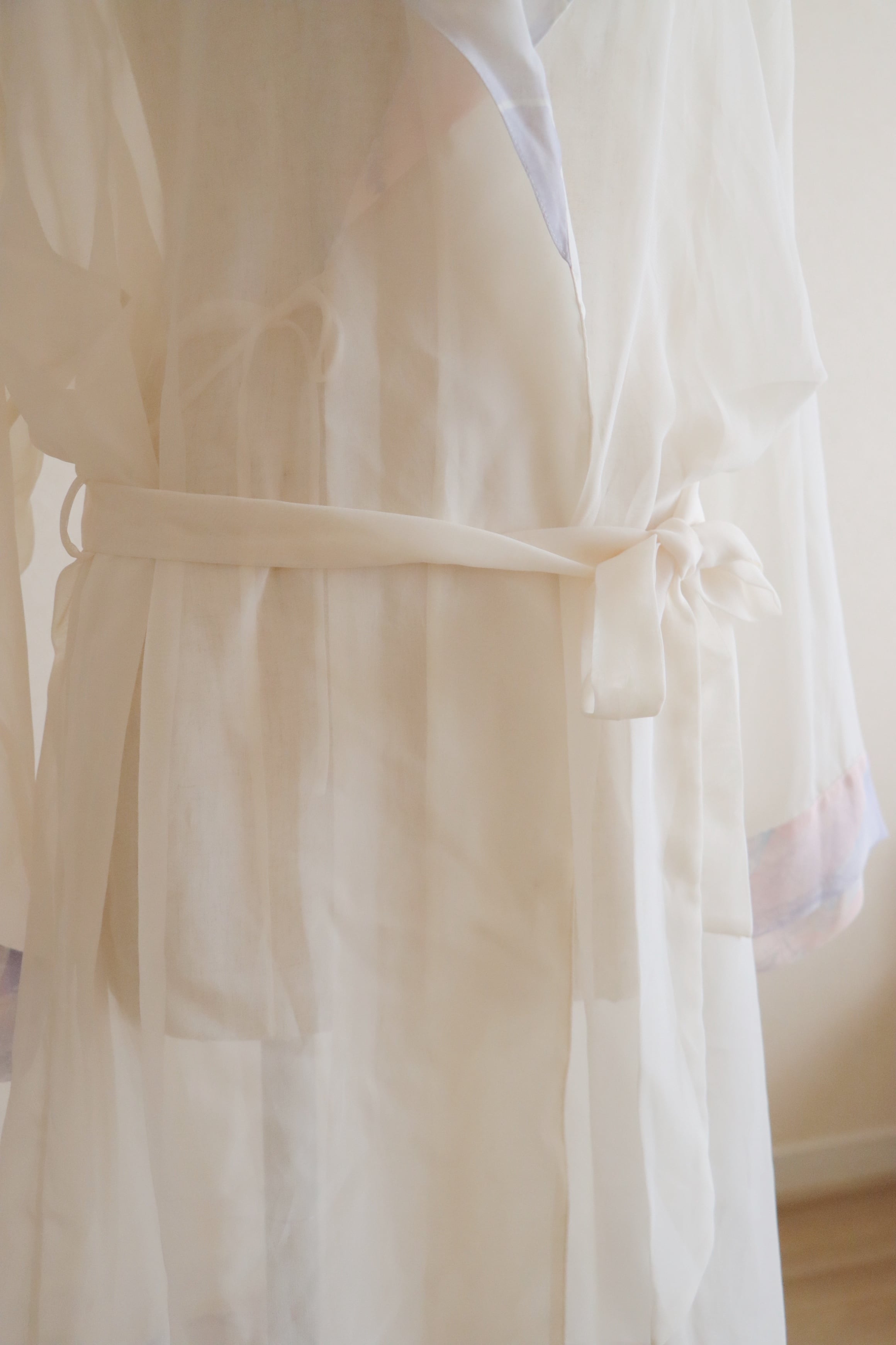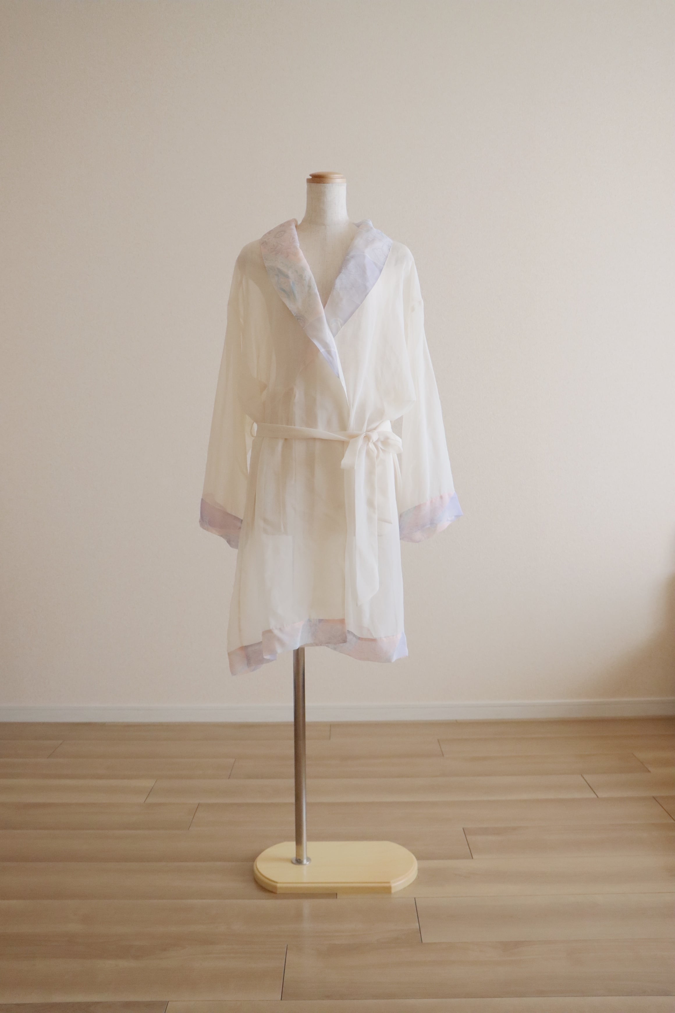 襟元の淡く優しい花柄の生地がアクセントになった、リラックス感溢れるシアーガウン。