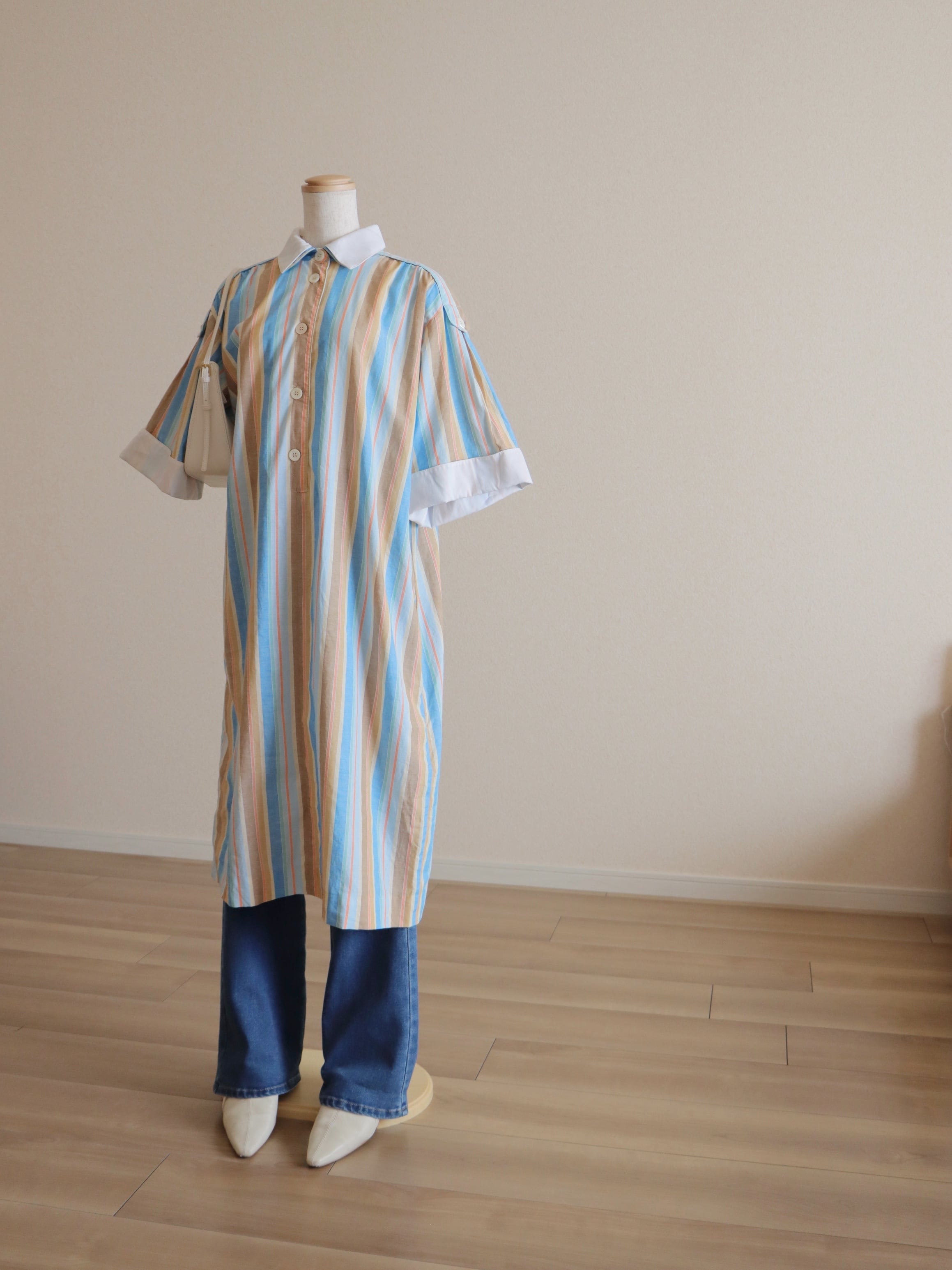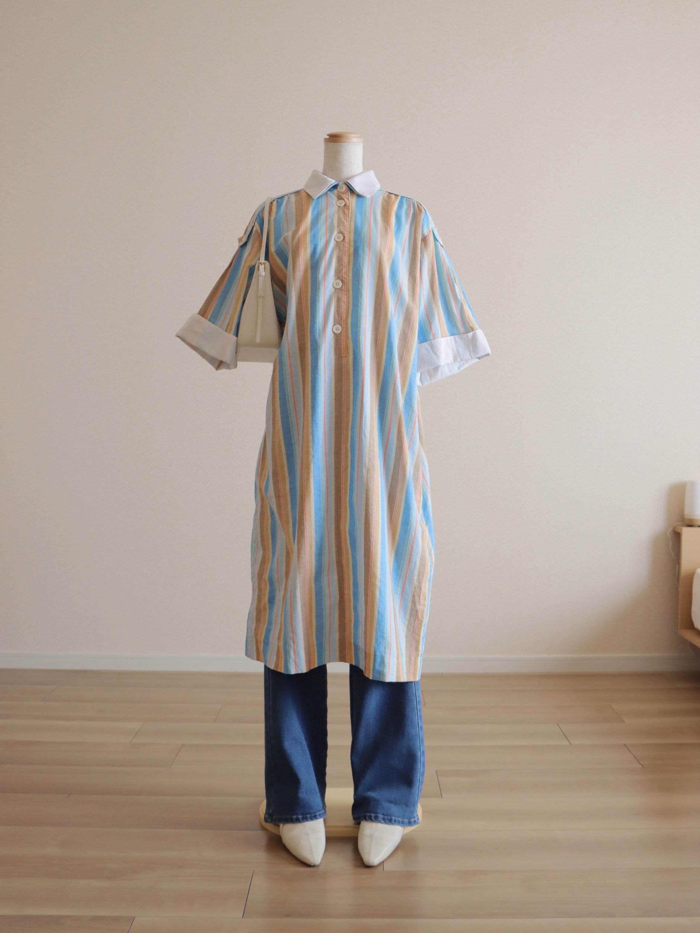 爽やかな配色にリラックス感のあるシルエット、2枚襟や折り返しのお袖など細かなディテールが可愛いアイテムです。