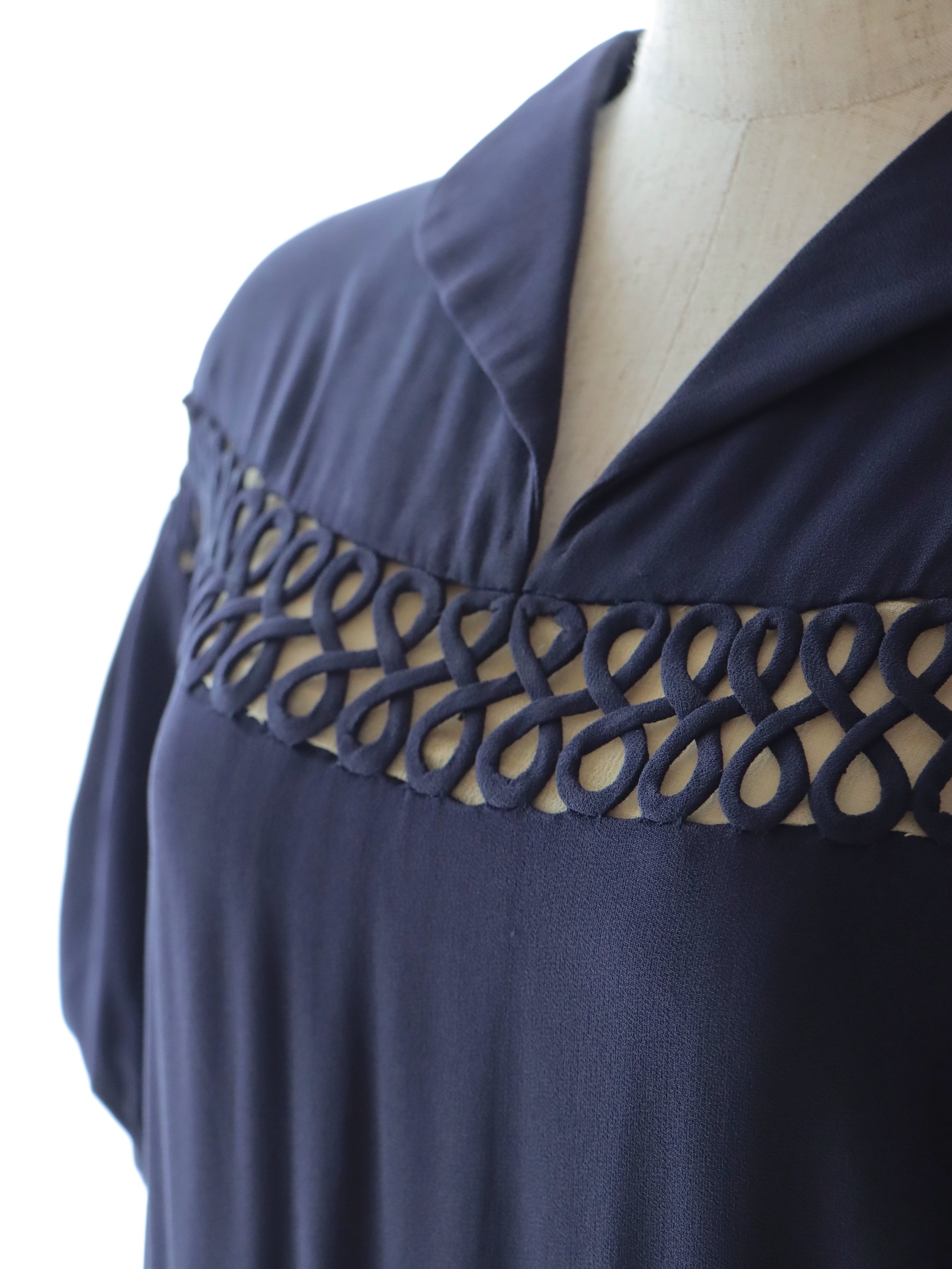 胸元から肩まわりにかけて共布で表現されたコード刺繍がアクセントに◎
