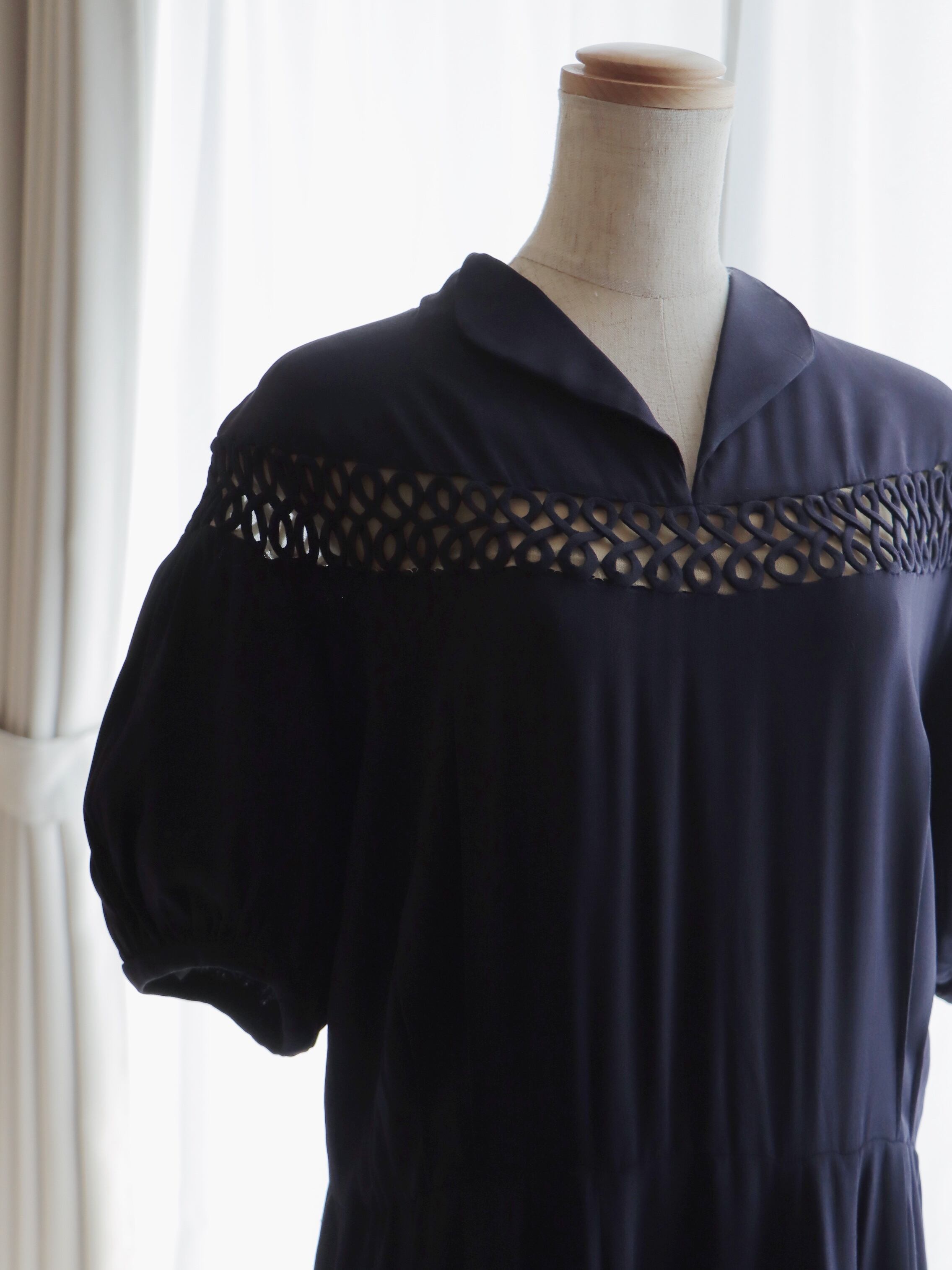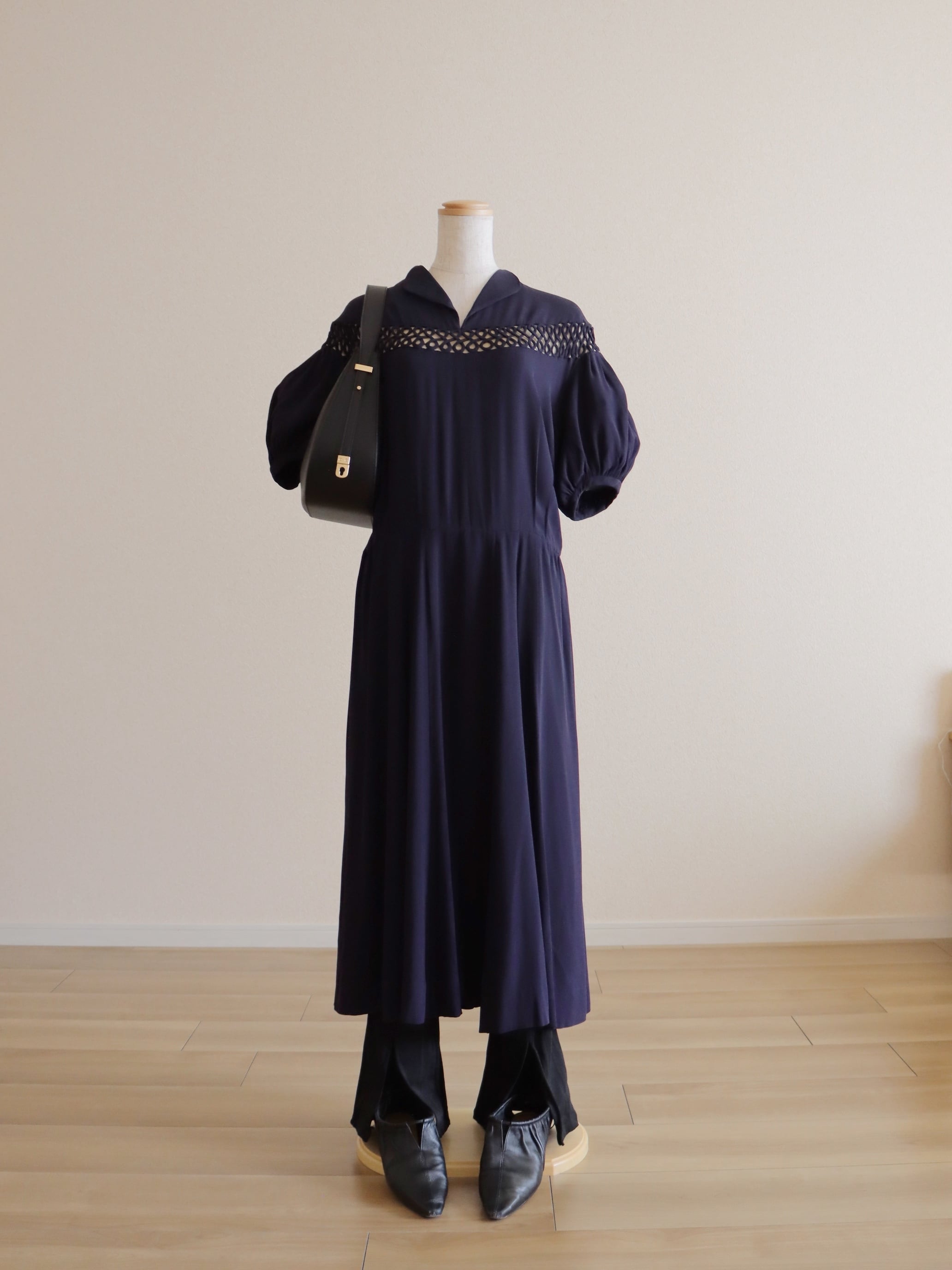 ●embroidery detail puff sleeve navy color dress