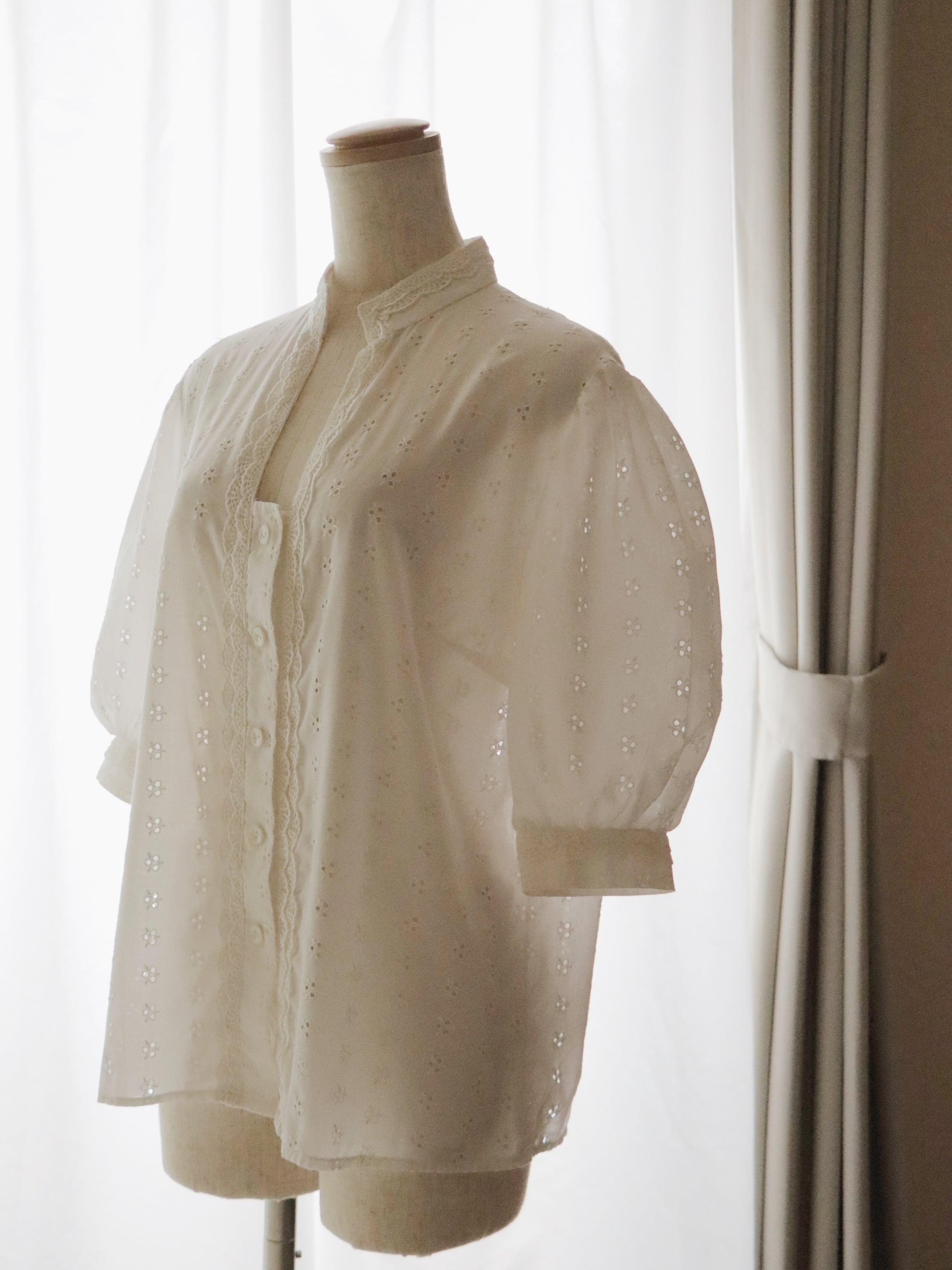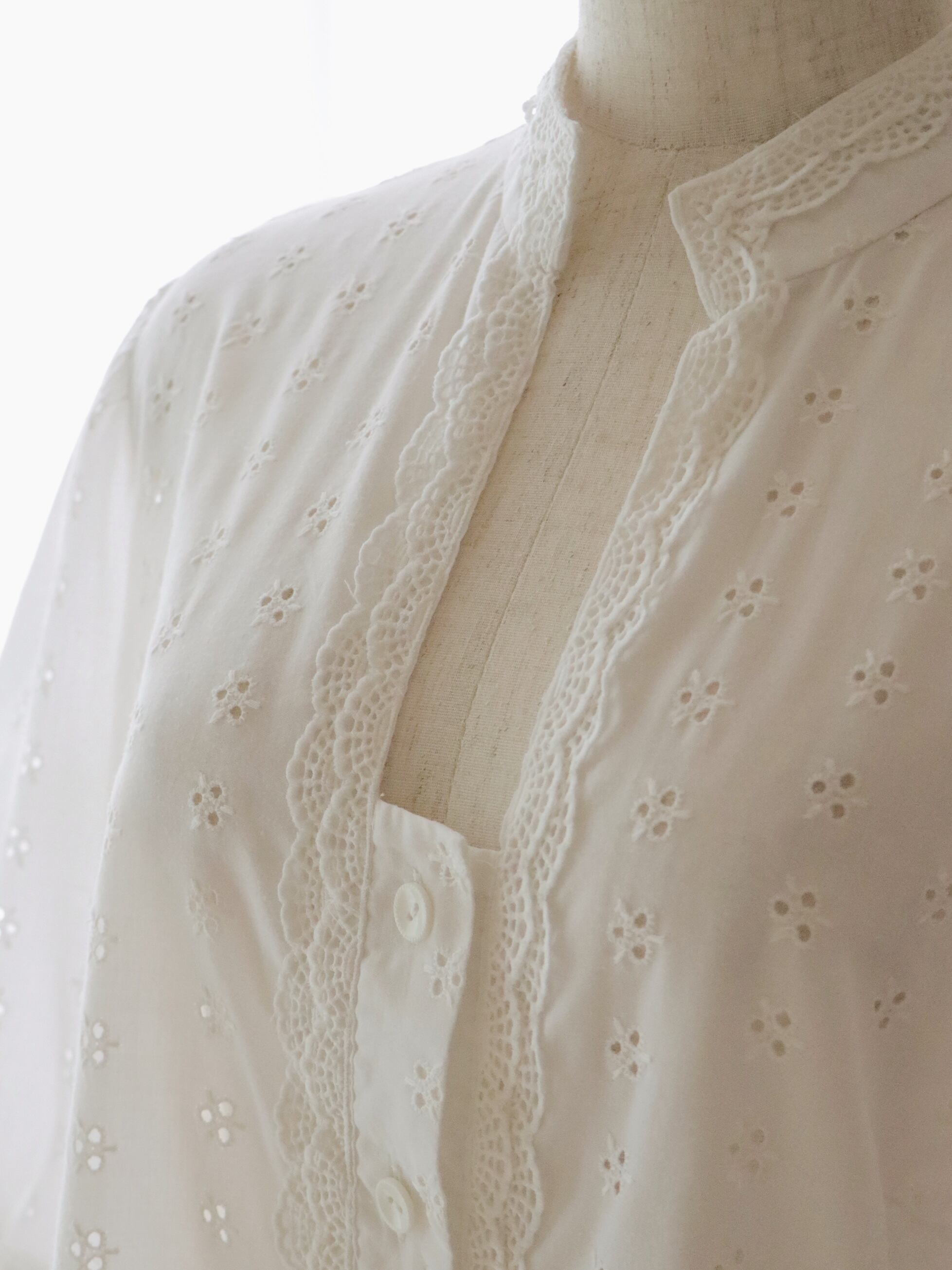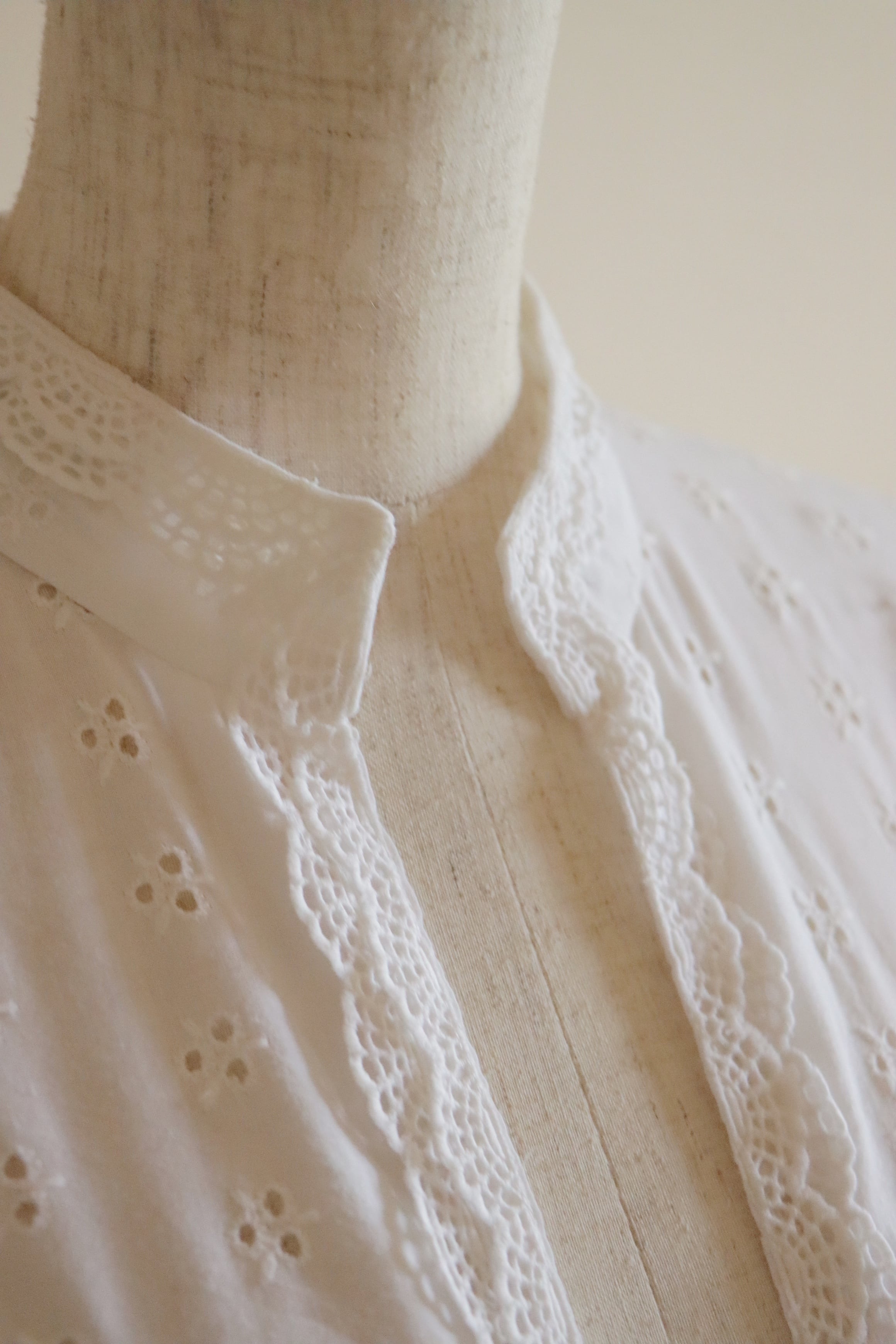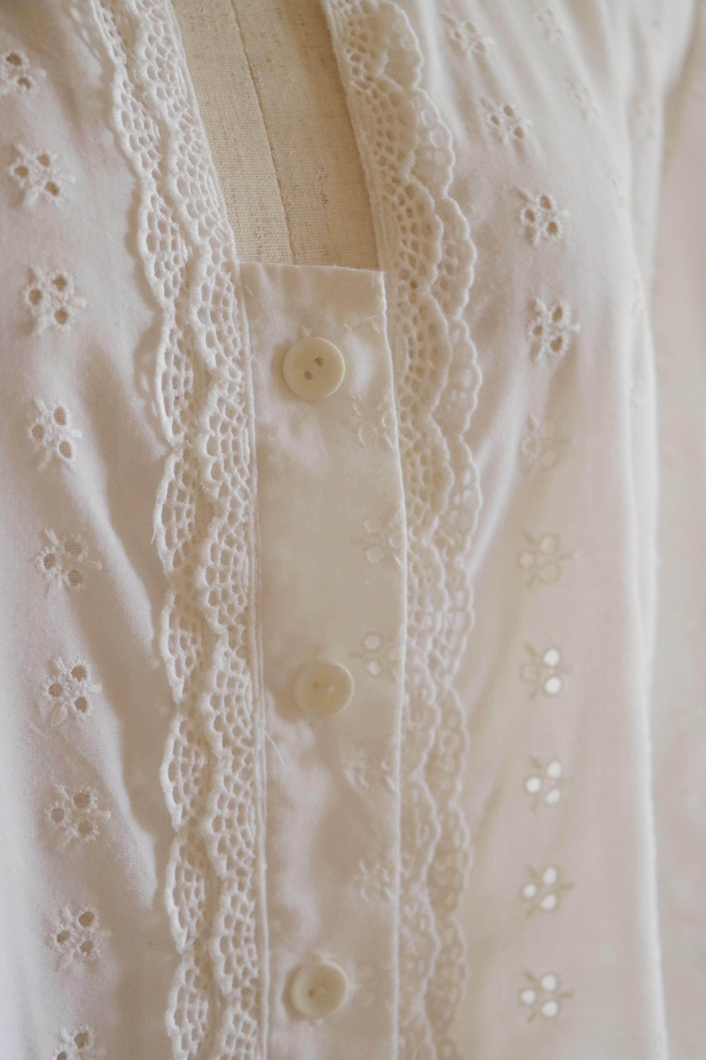 控えめなアイレットレース生地を使用した可愛らしいコットンブラウス。