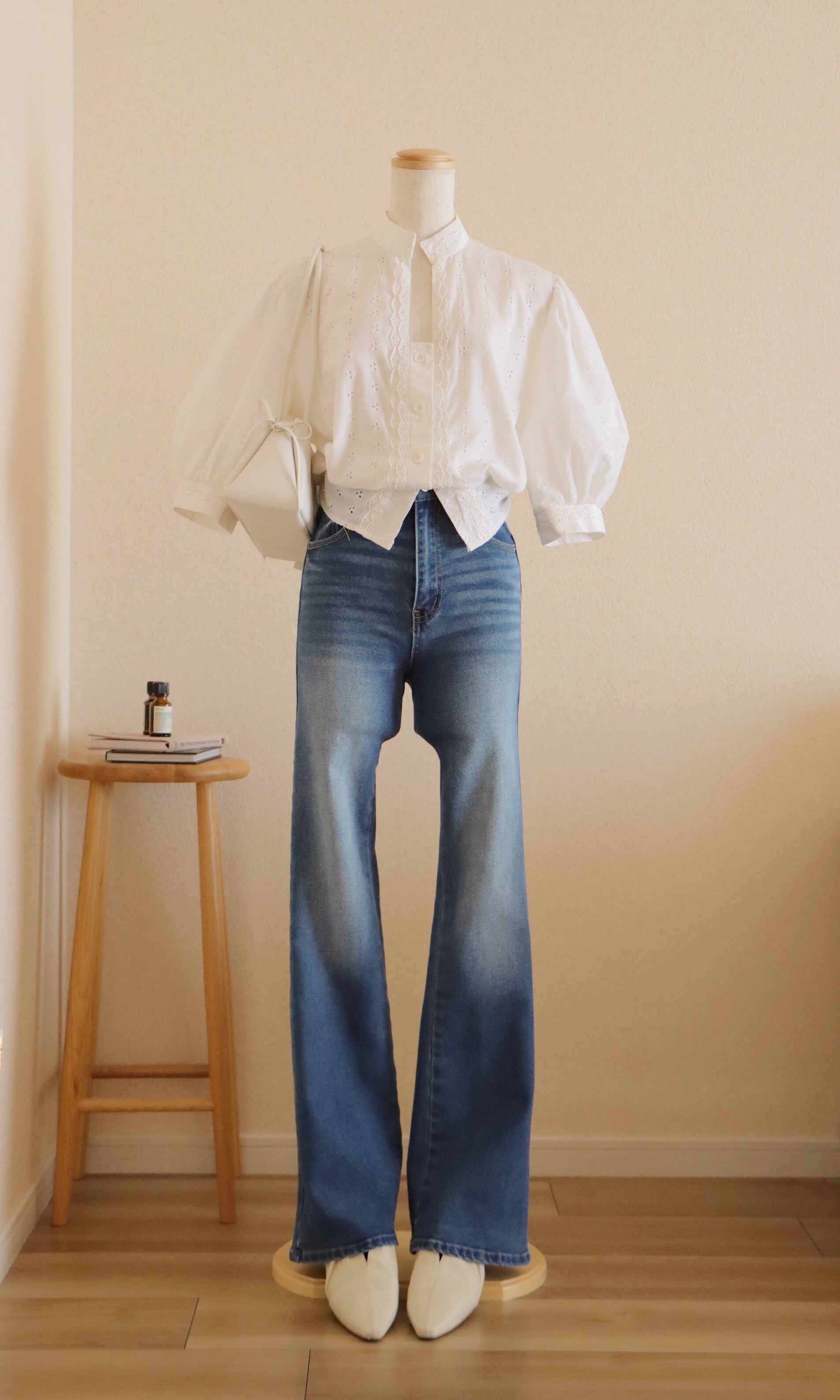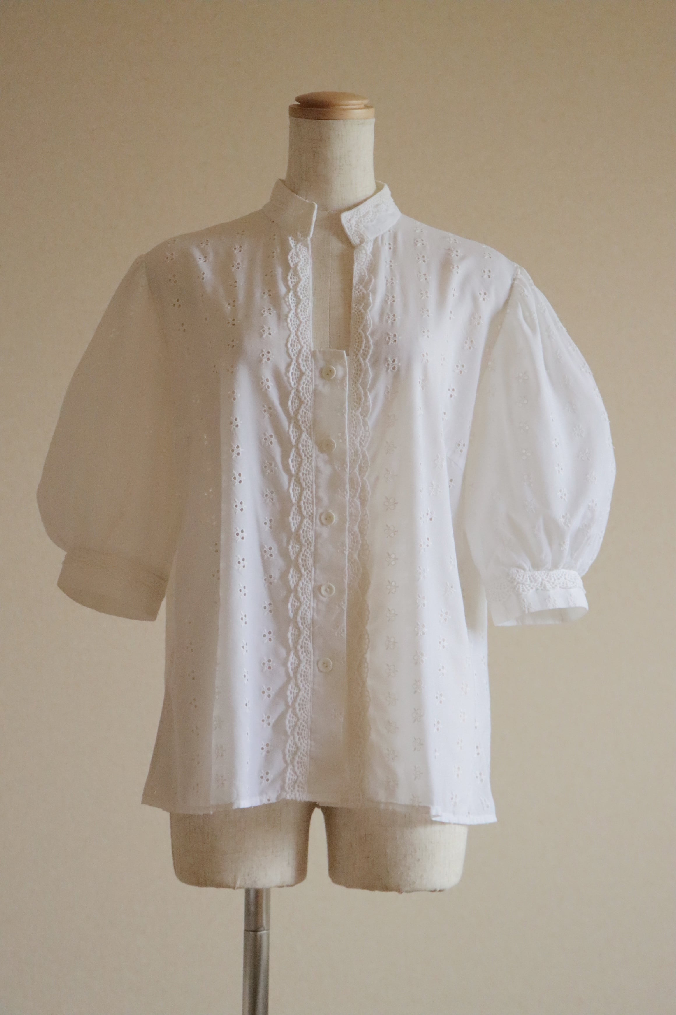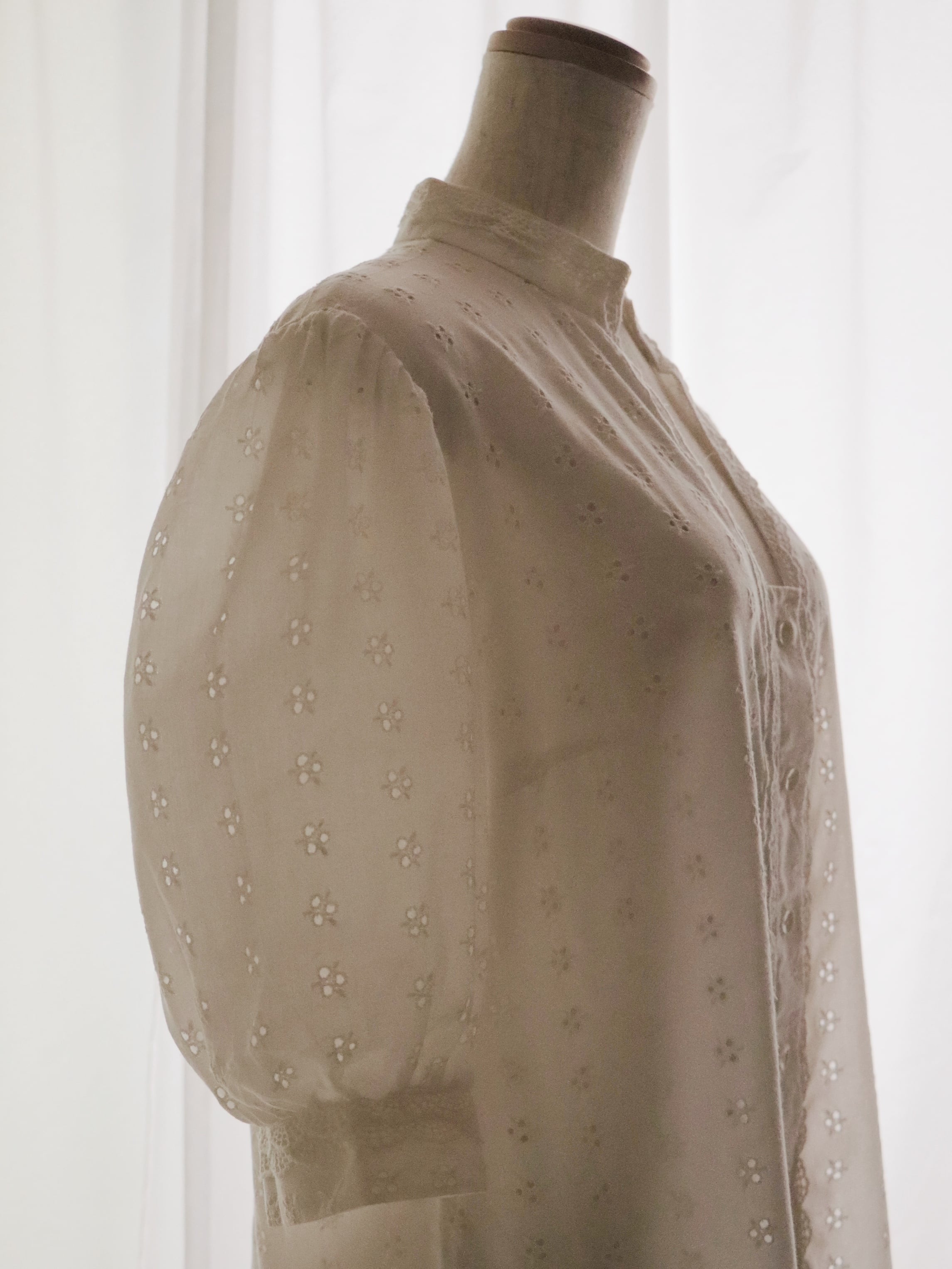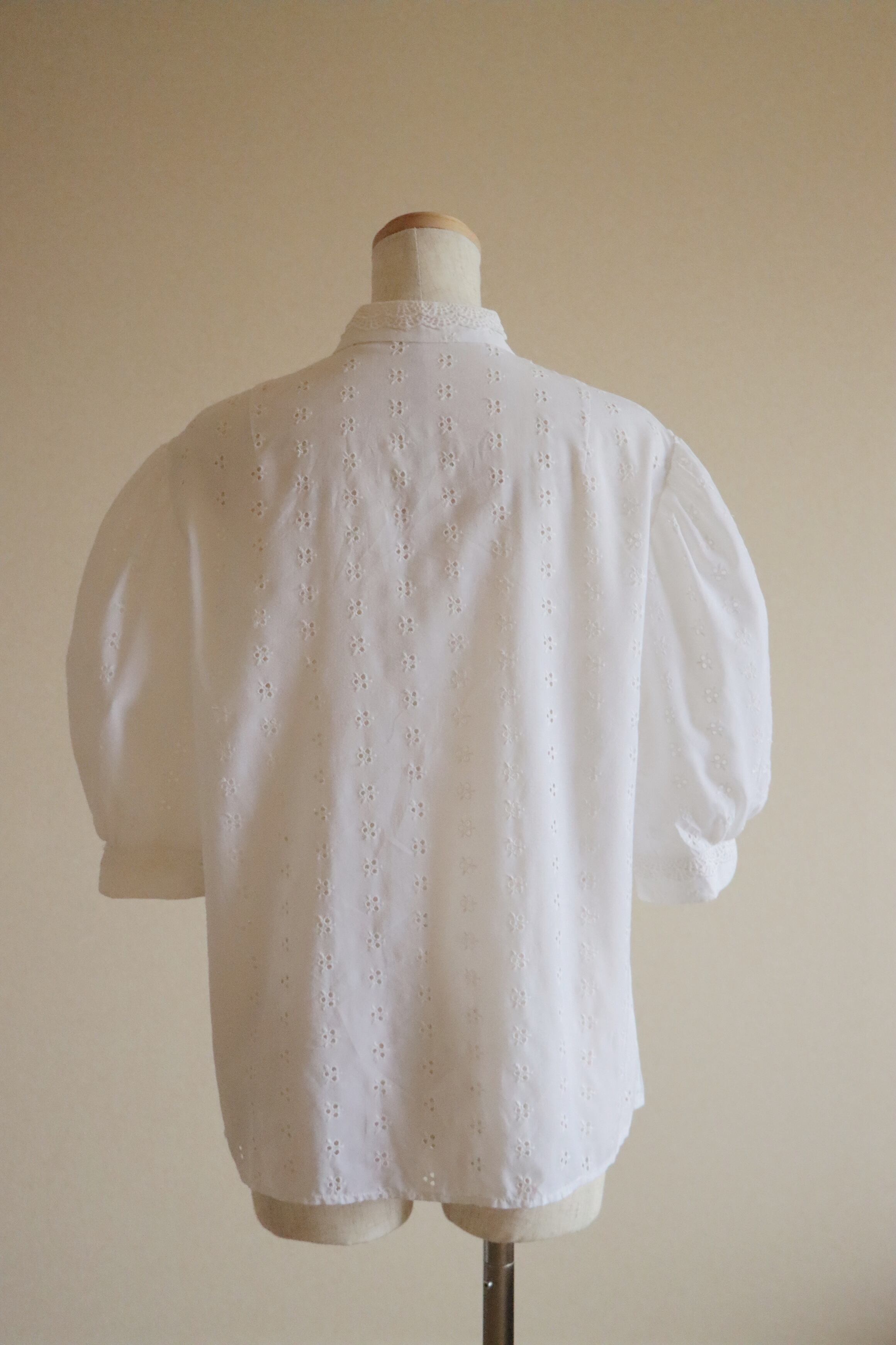 控えめなアイレットレース生地を使用した可愛らしいコットンブラウス。