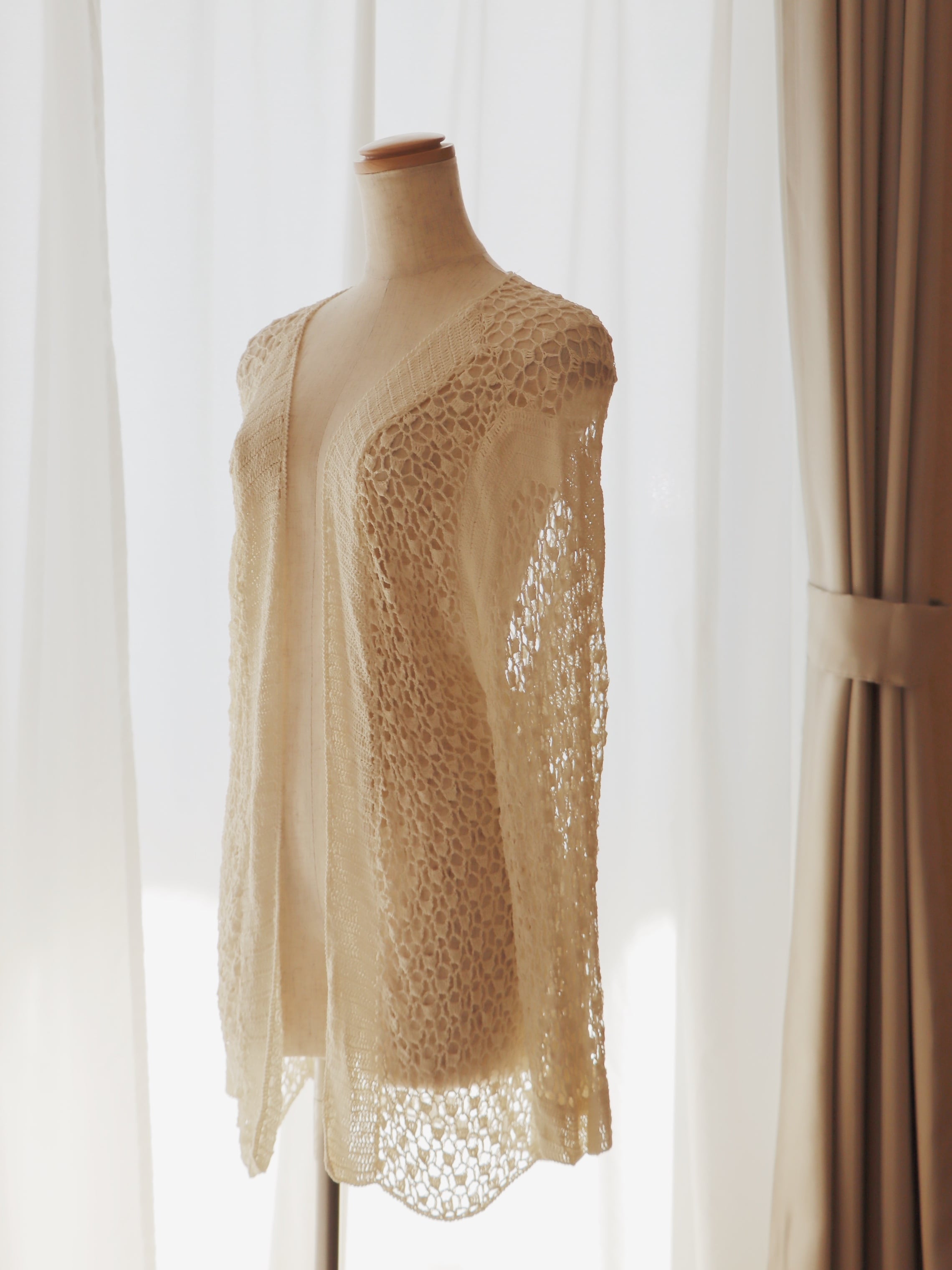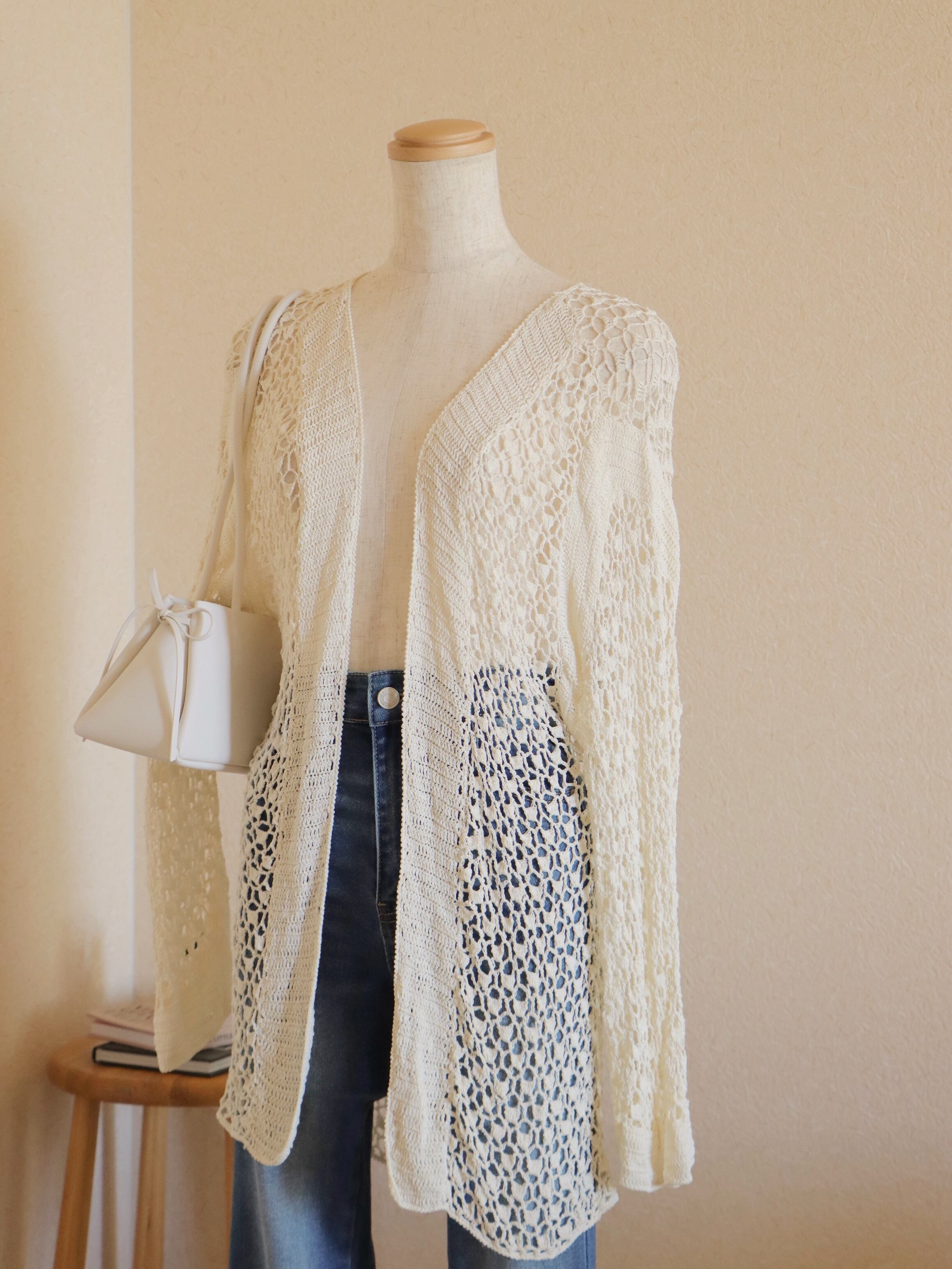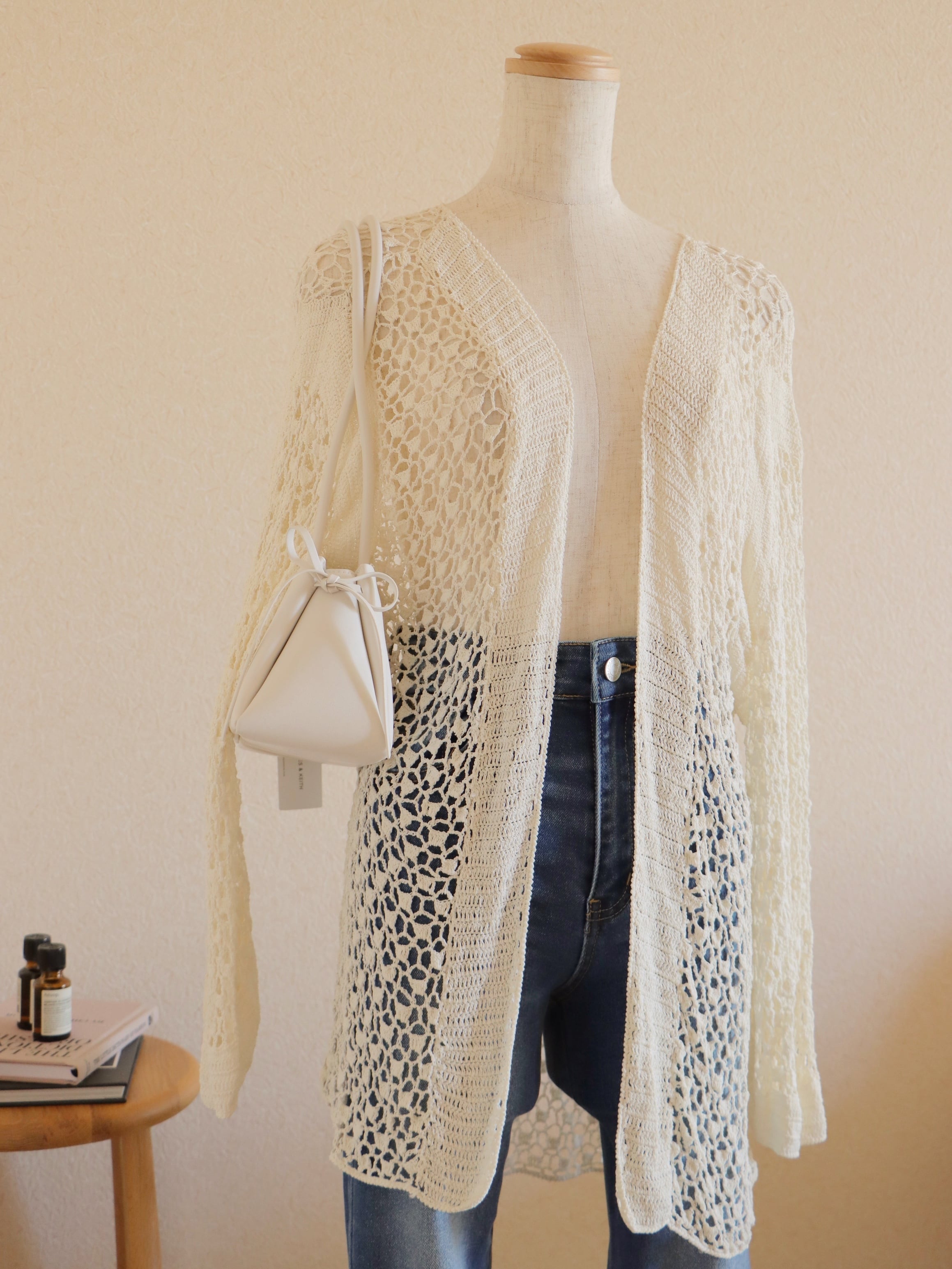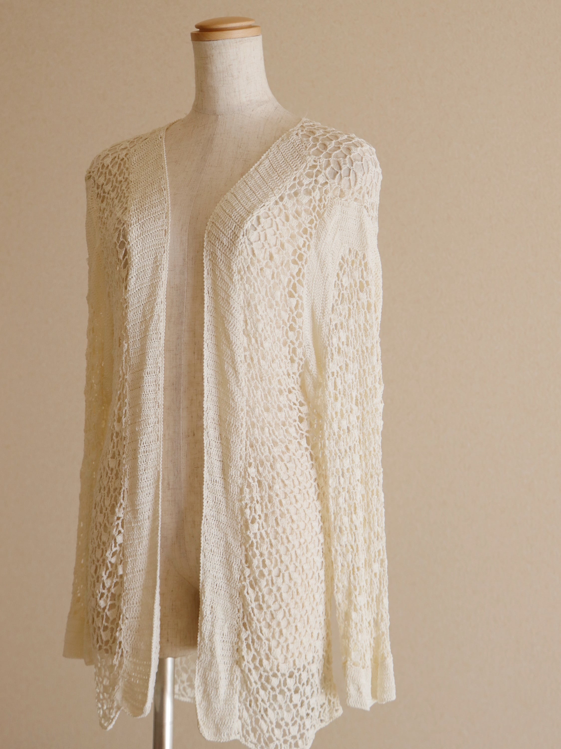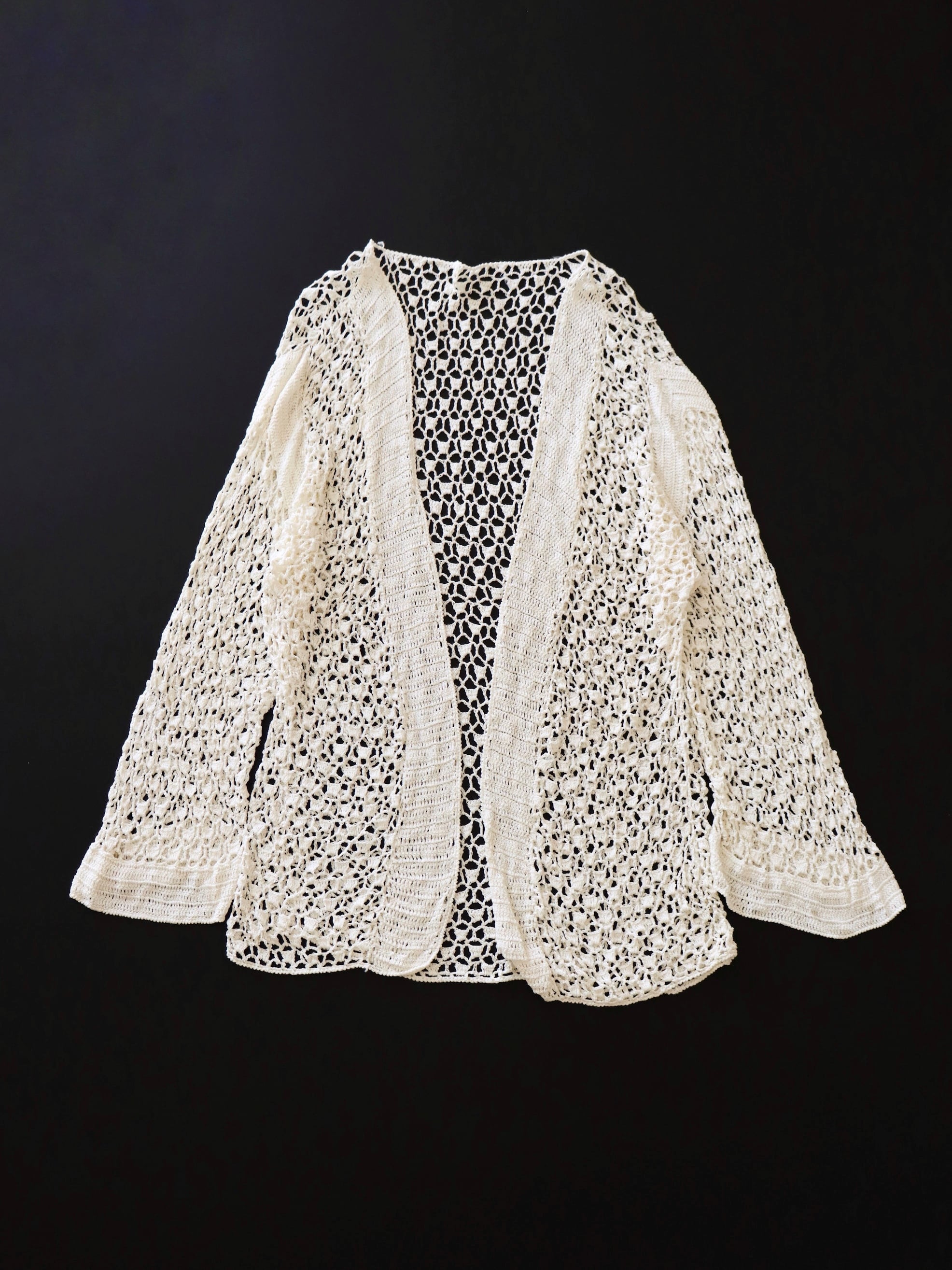 繊細に編まれたかぎ針編みが可愛いクロシェカーディガン。