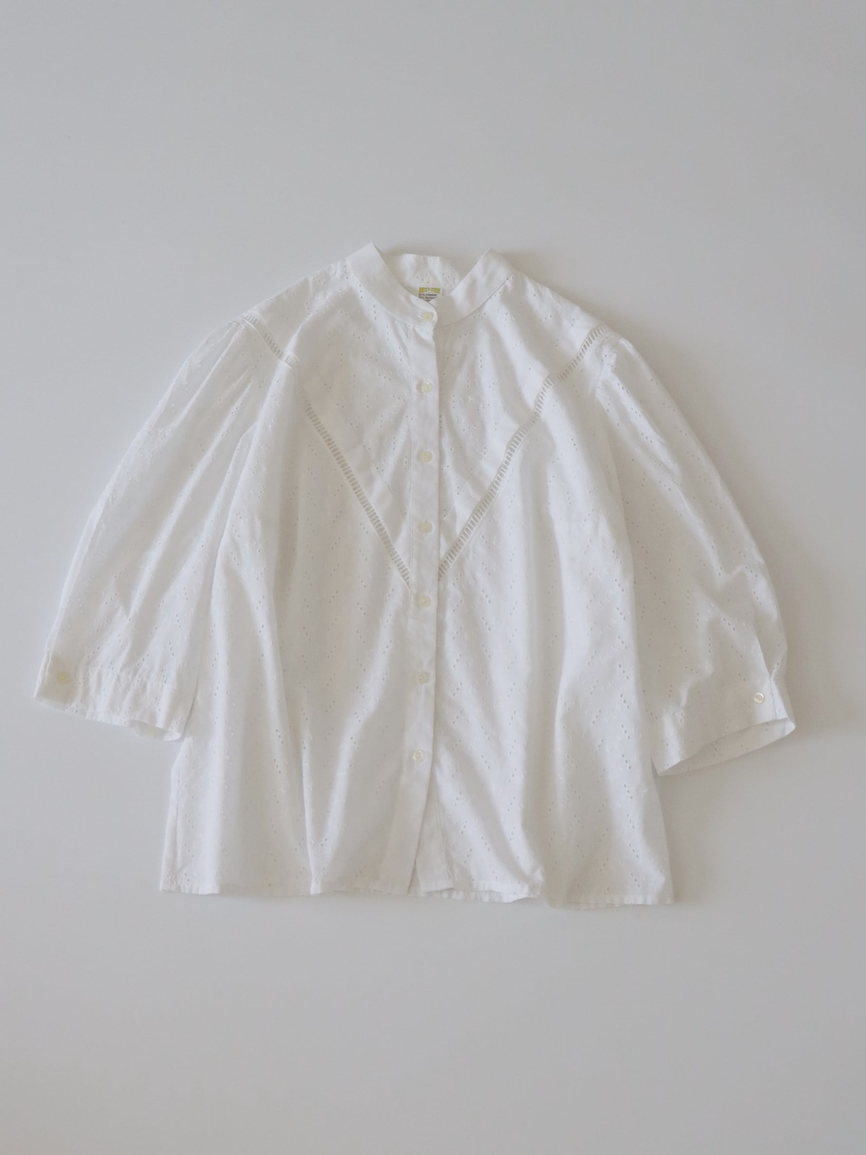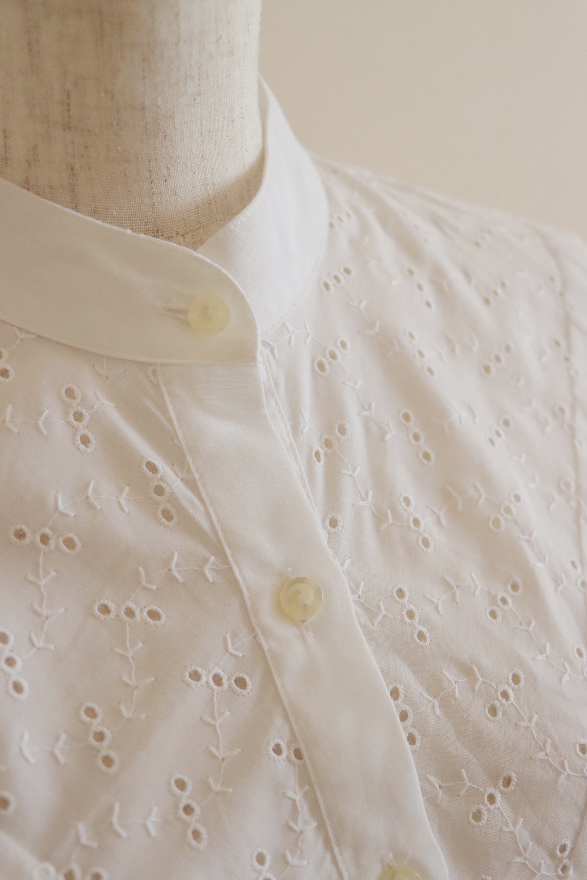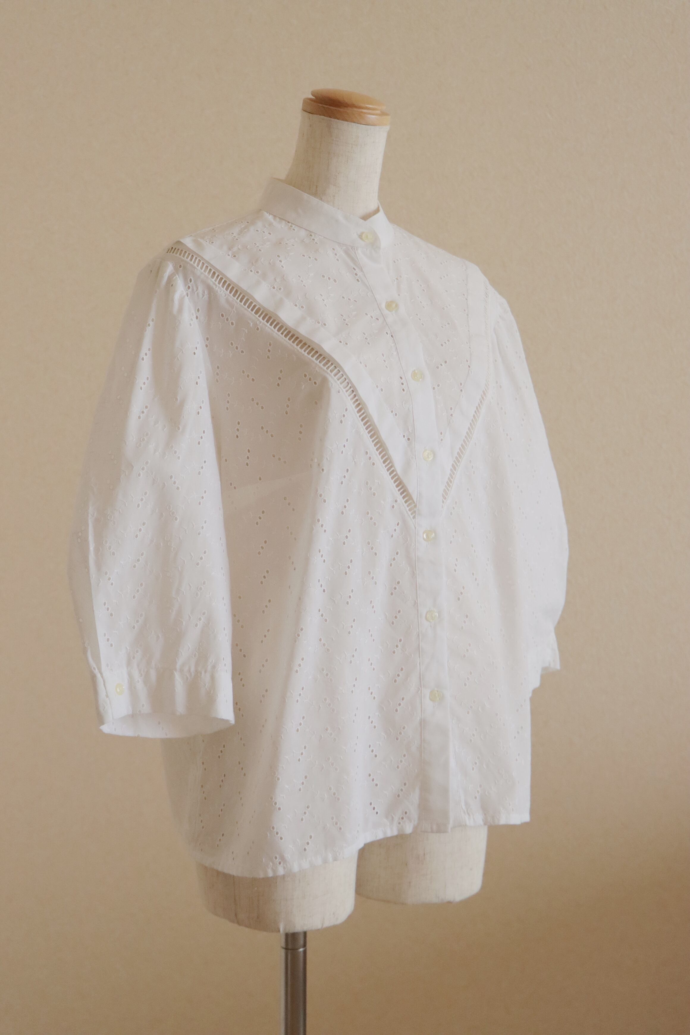 控えめなアイレットレース生地を使用した可愛らしいコットンブラウス。
