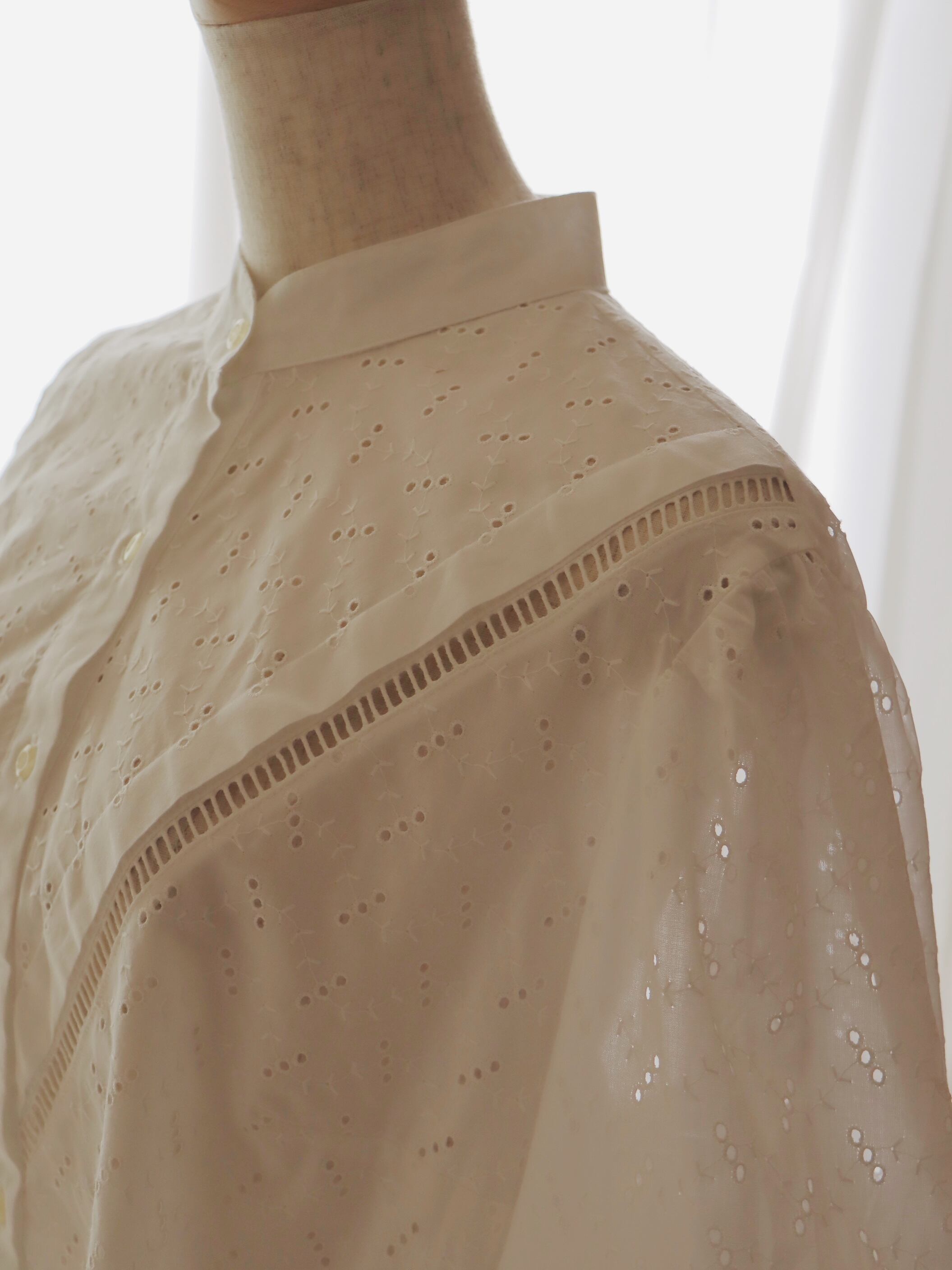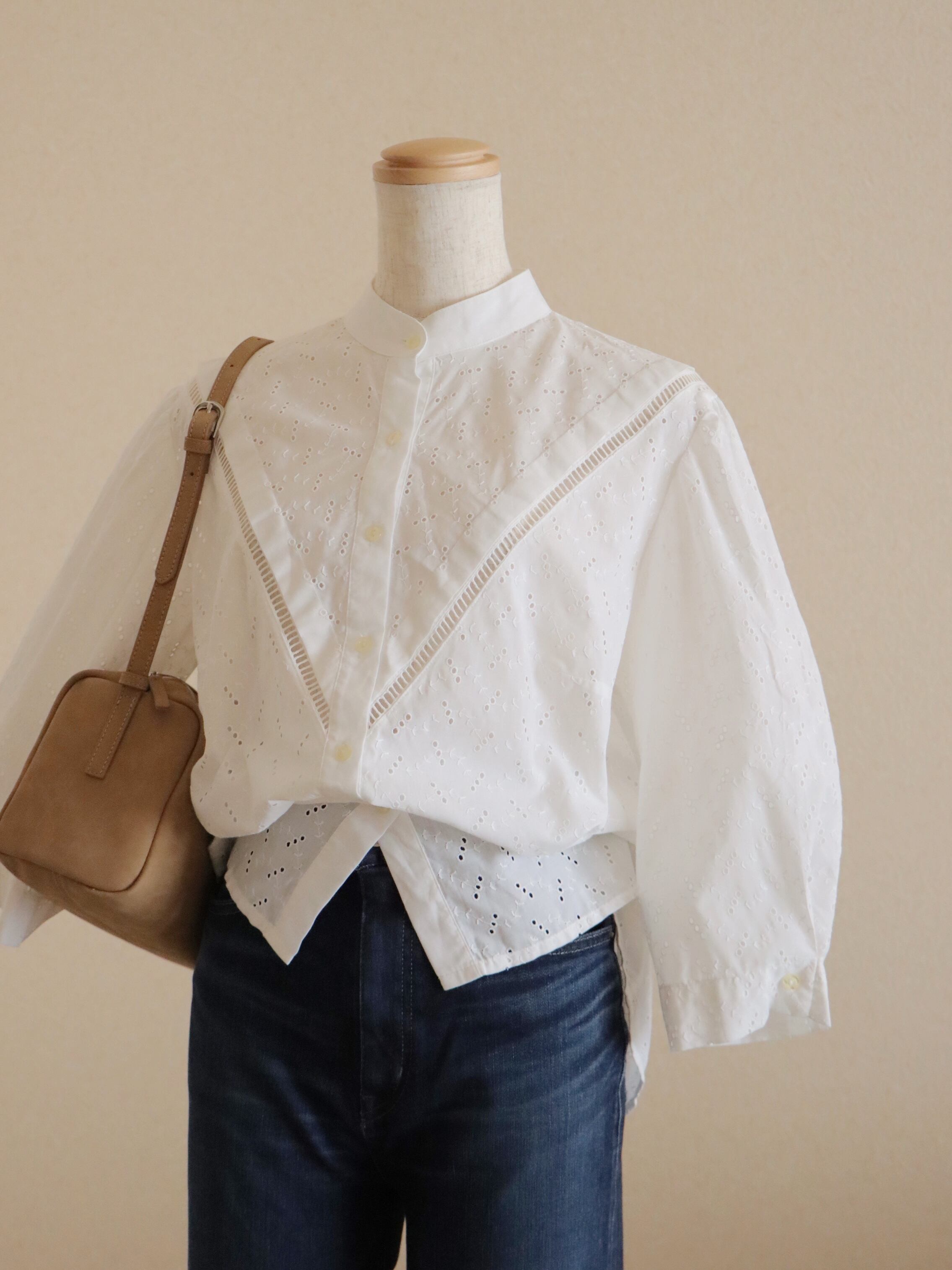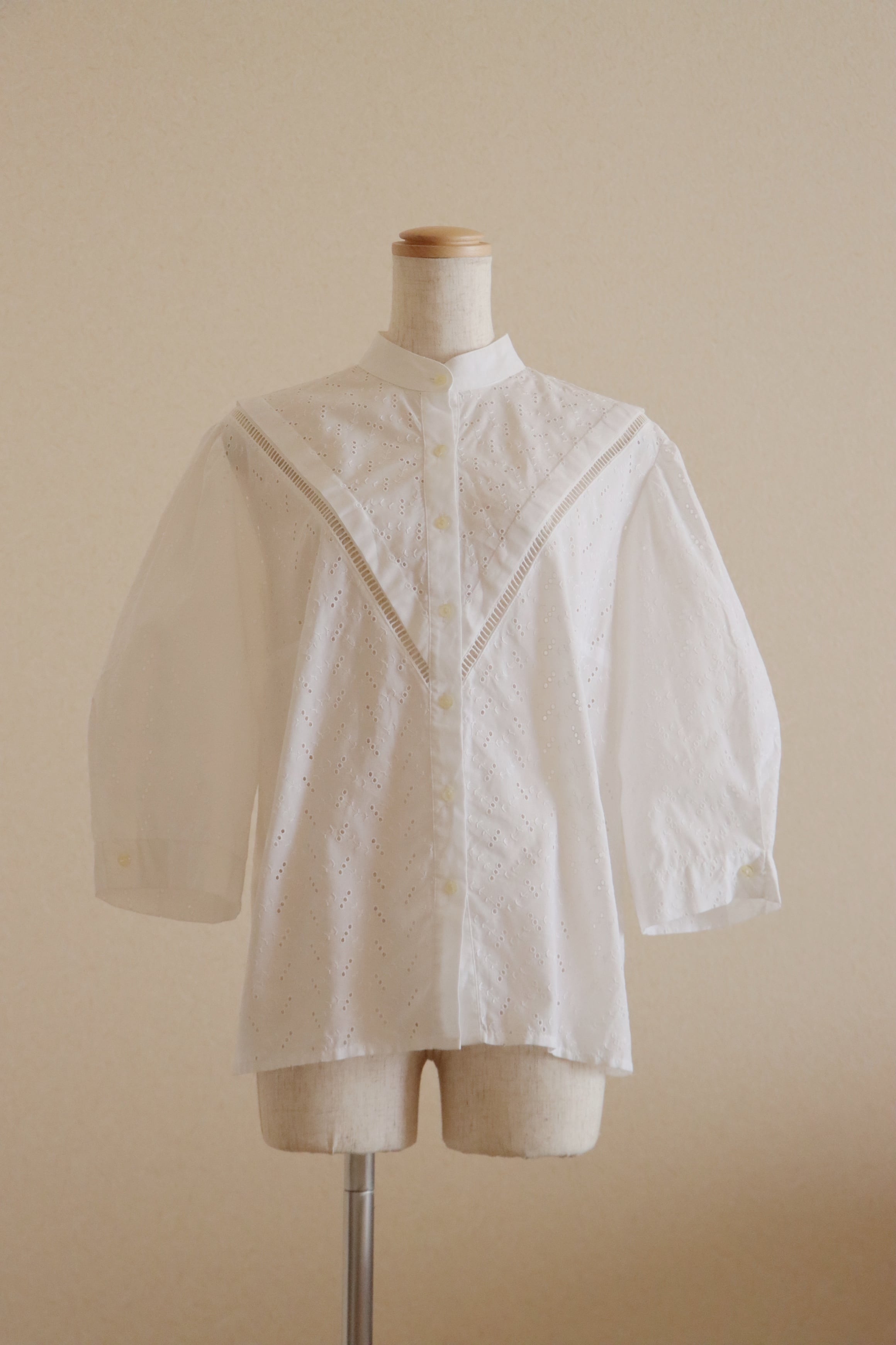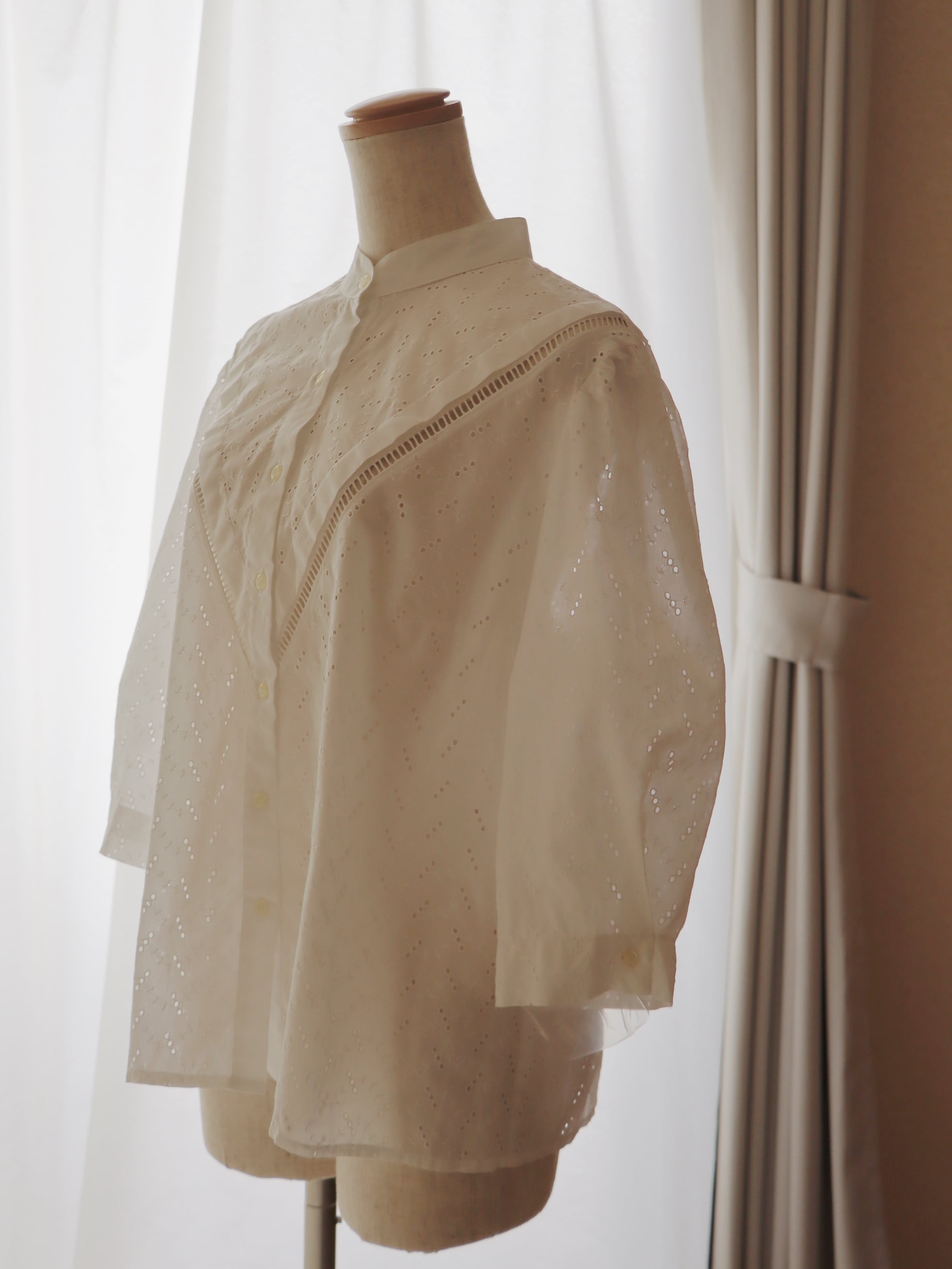 控えめなアイレットレース生地を使用した可愛らしいコットンブラウス。