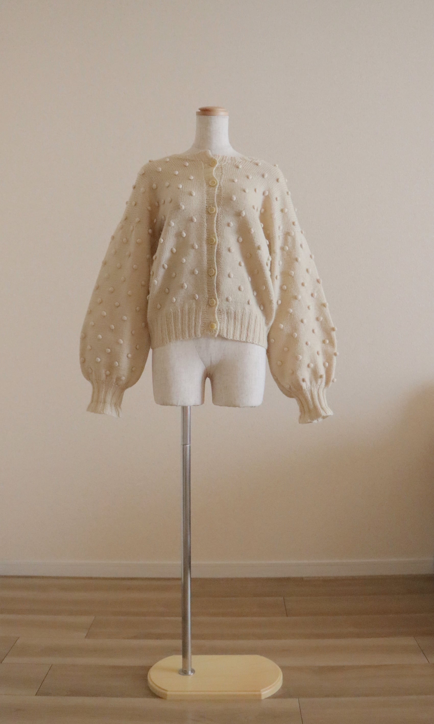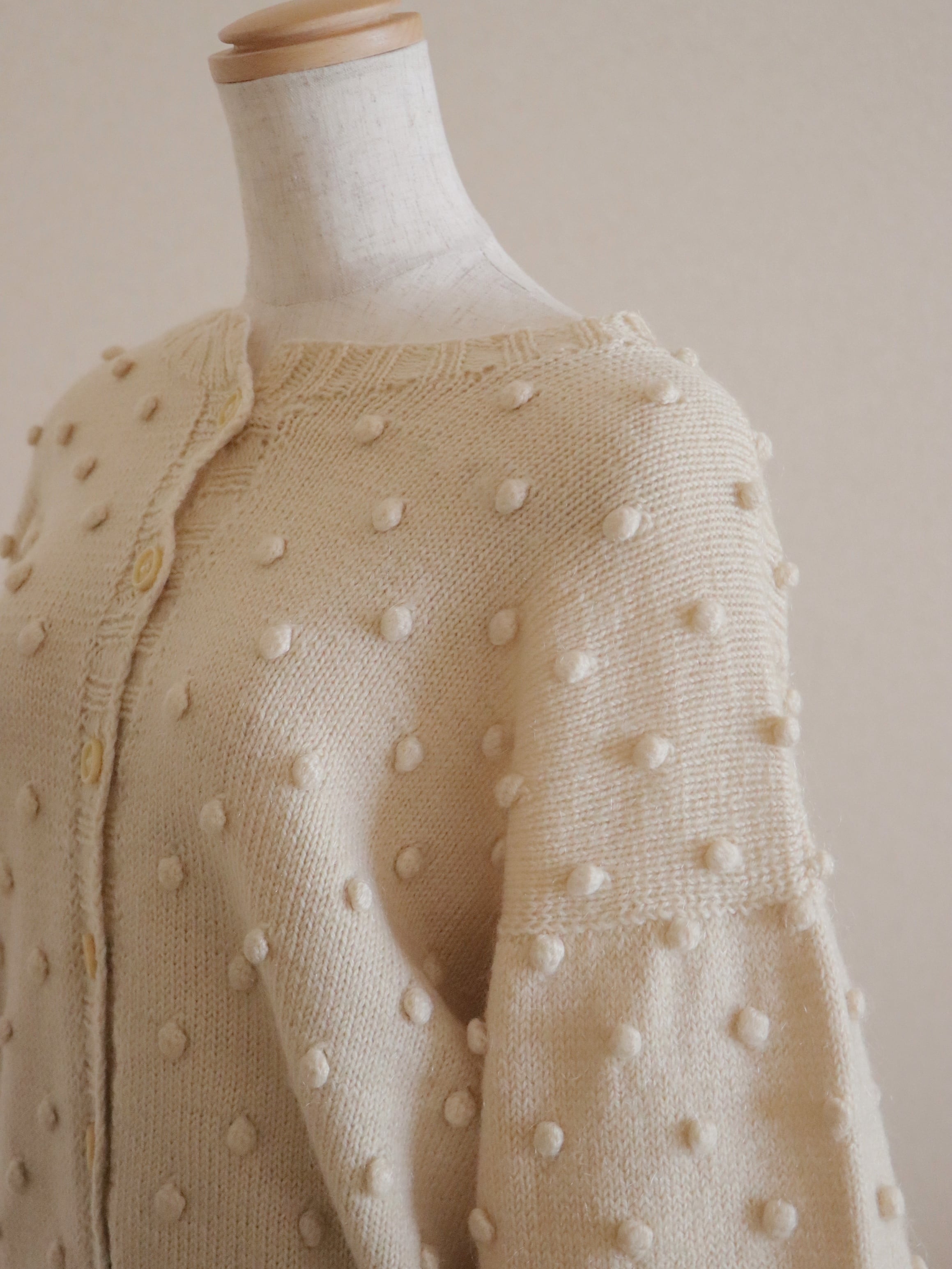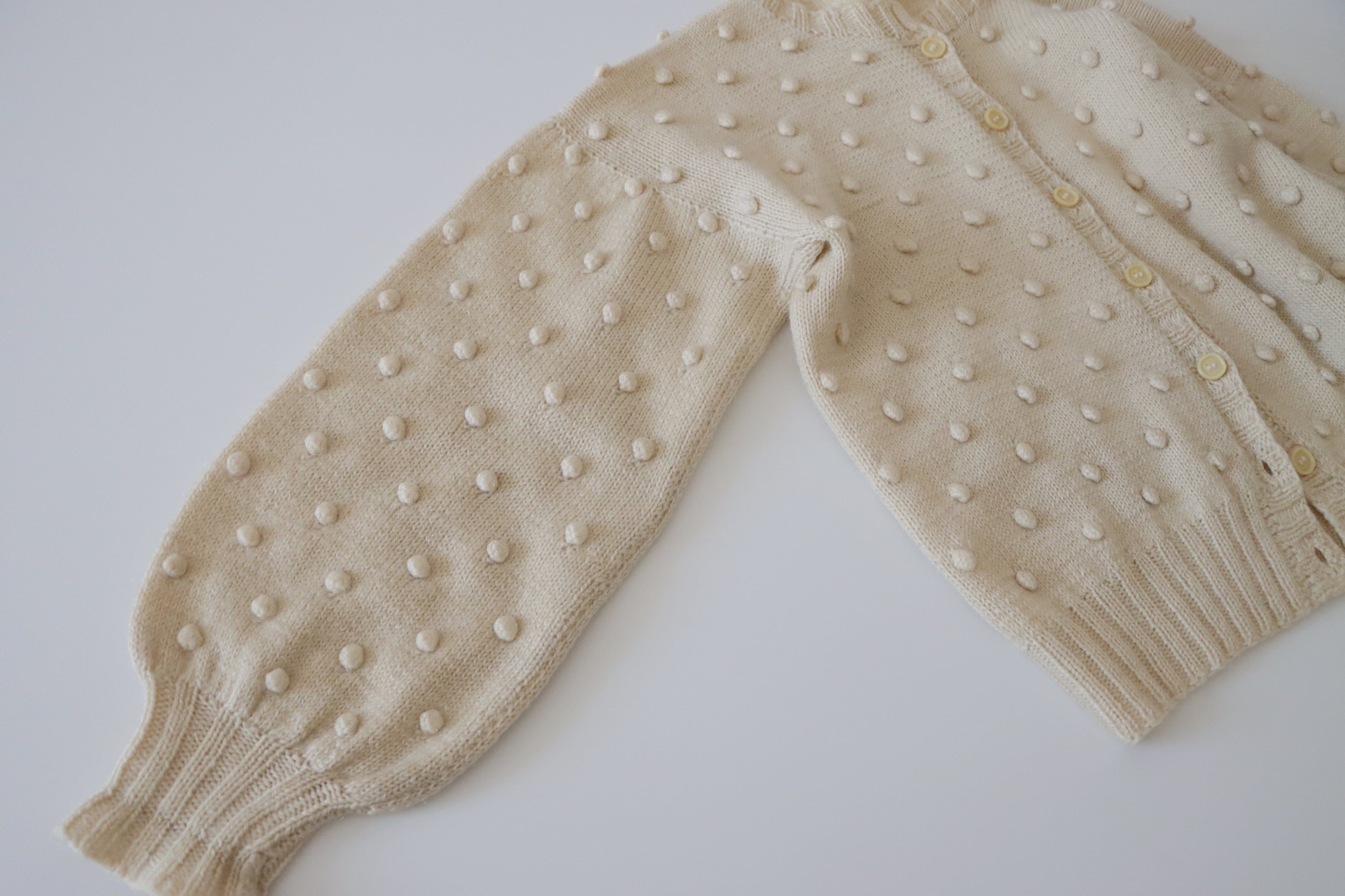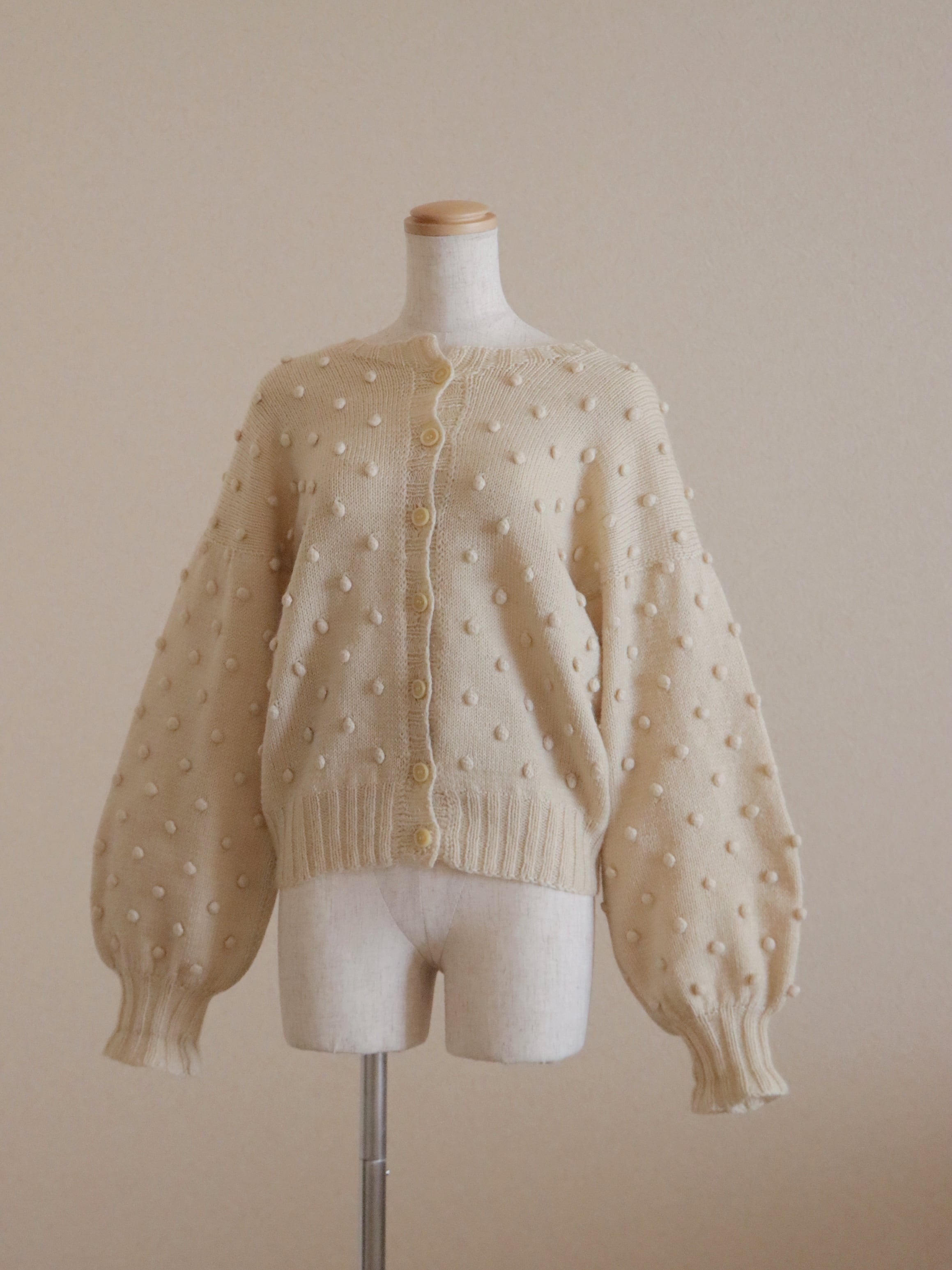 立体的なポンポン編みが全体に施された可愛らしいニットカーディガン。