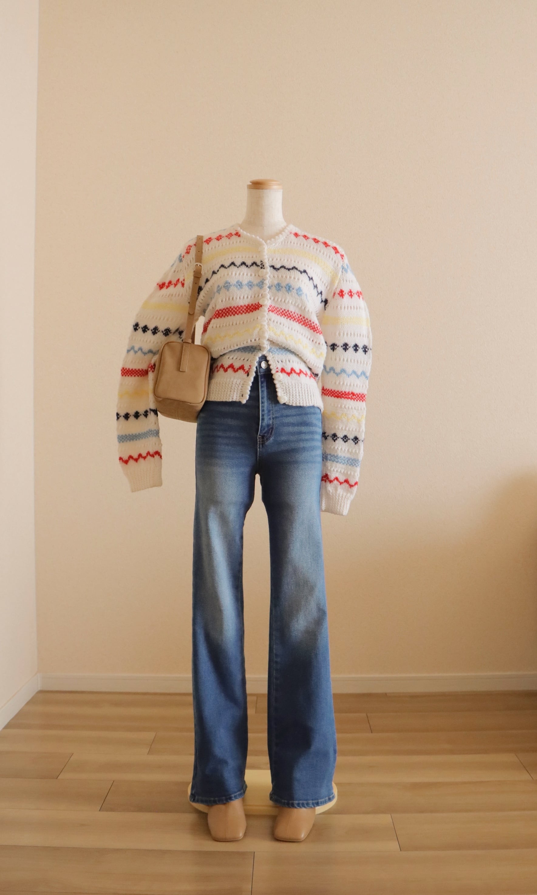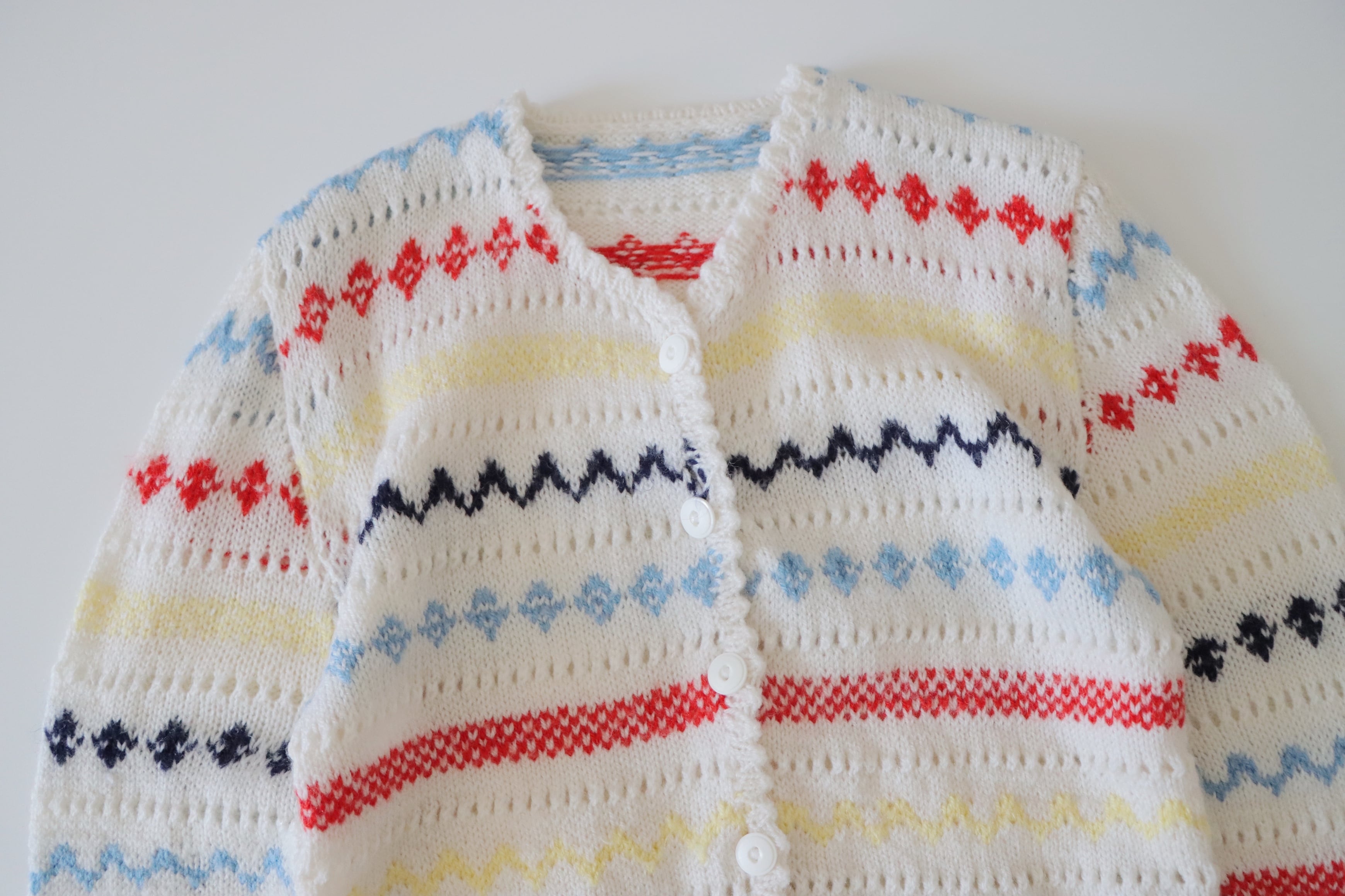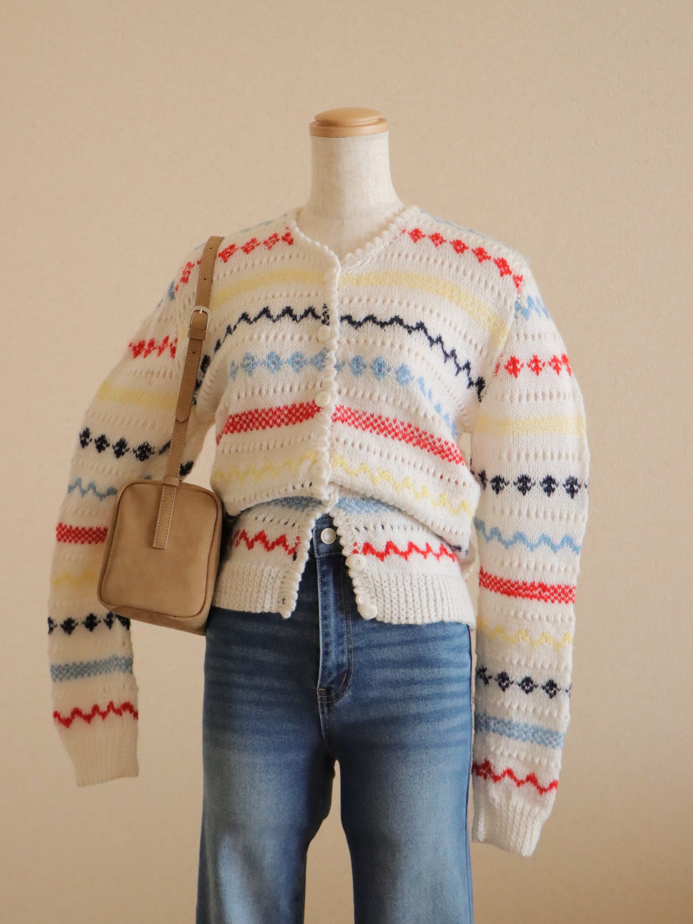 優しいホワイト系の色味をベースに、カラフルな配色で表現された可愛い編地が、スタイリングの主役になってくれます。