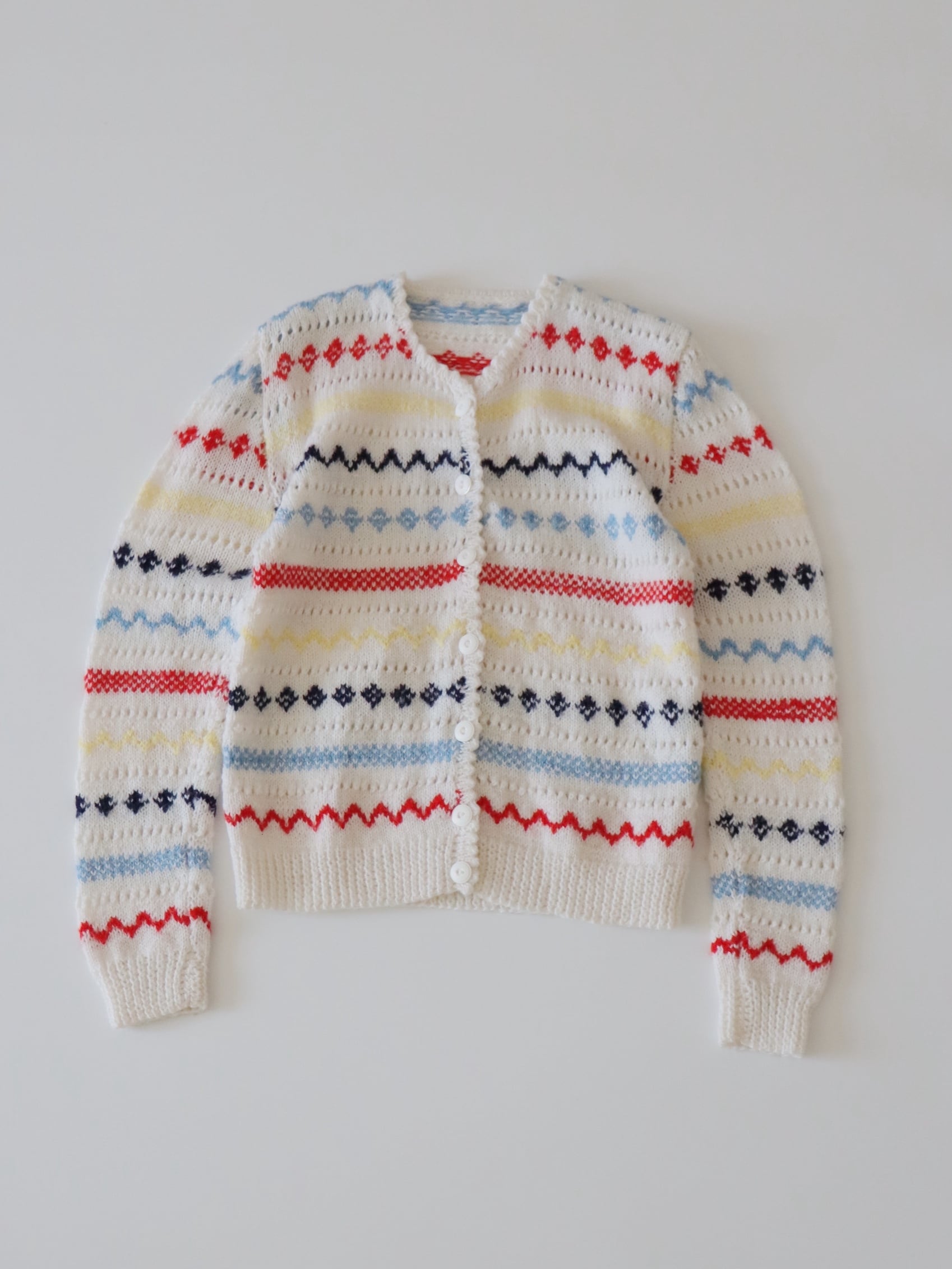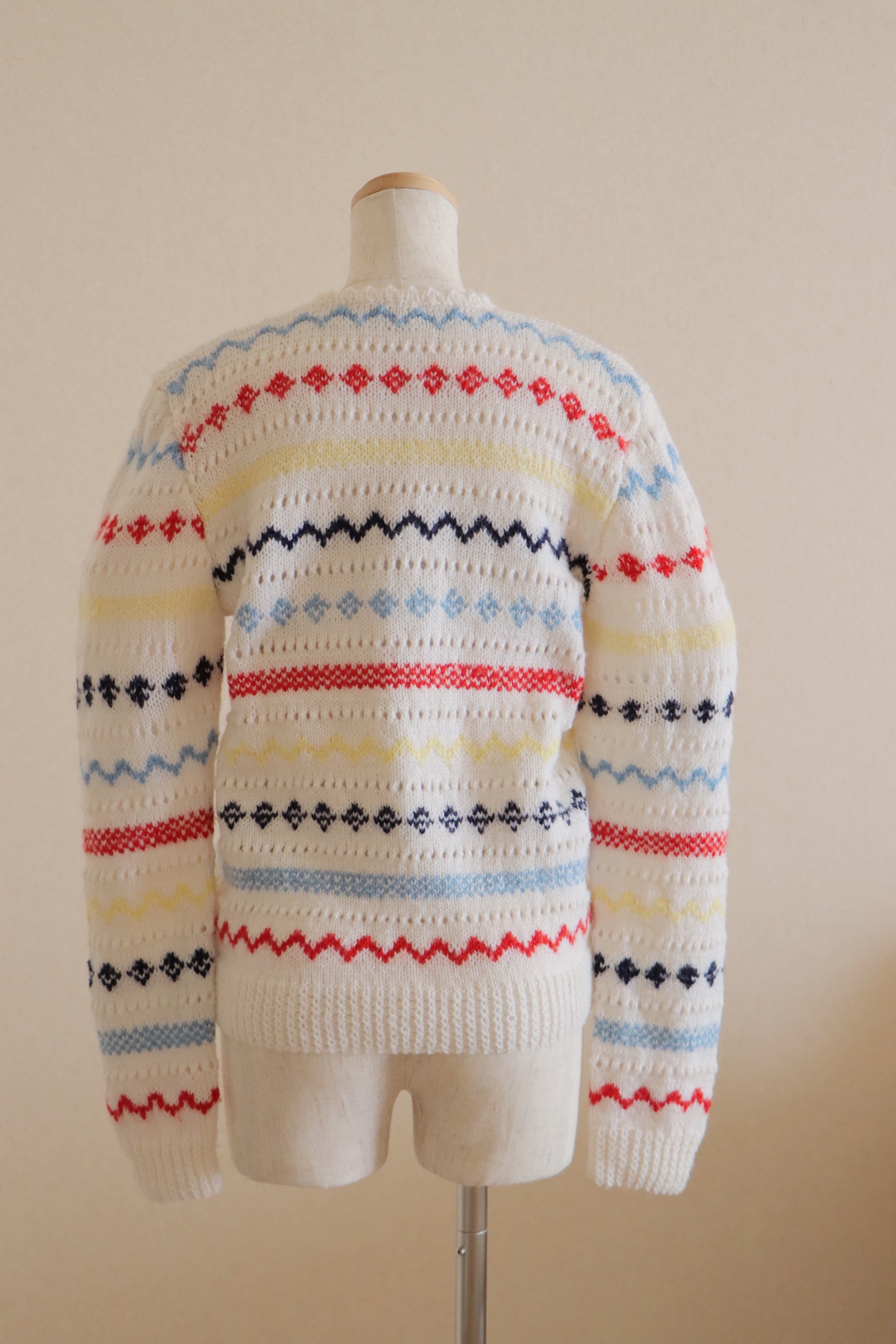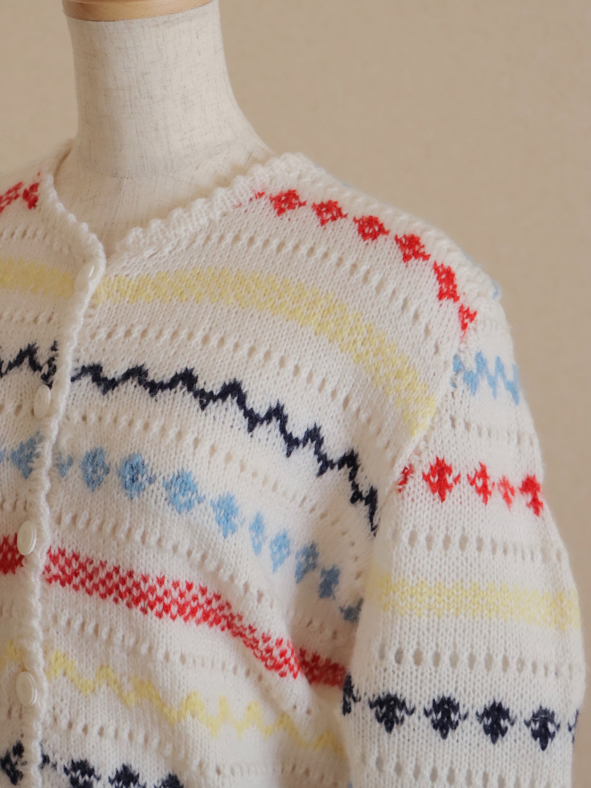優しいホワイト系の色味をベースに、カラフルな配色で表現された可愛い編地が、スタイリングの主役になってくれます。