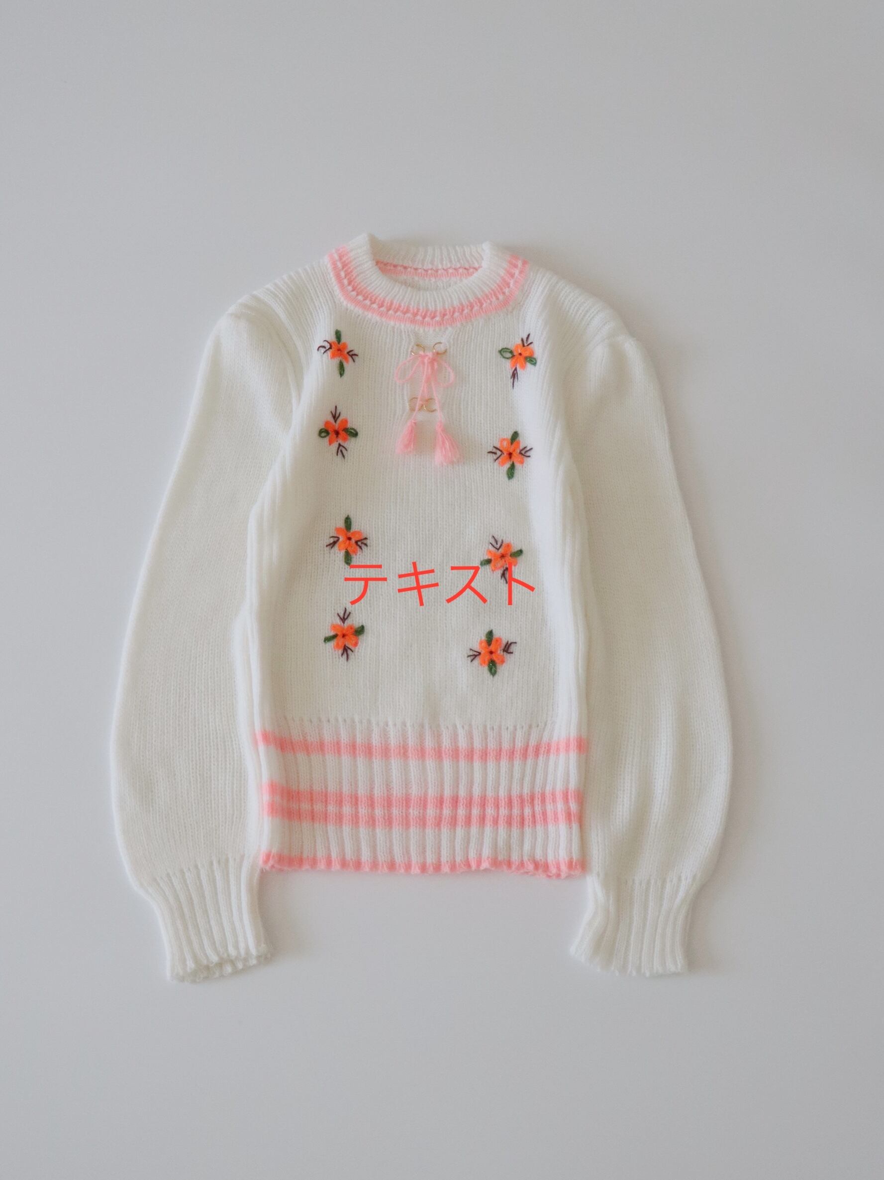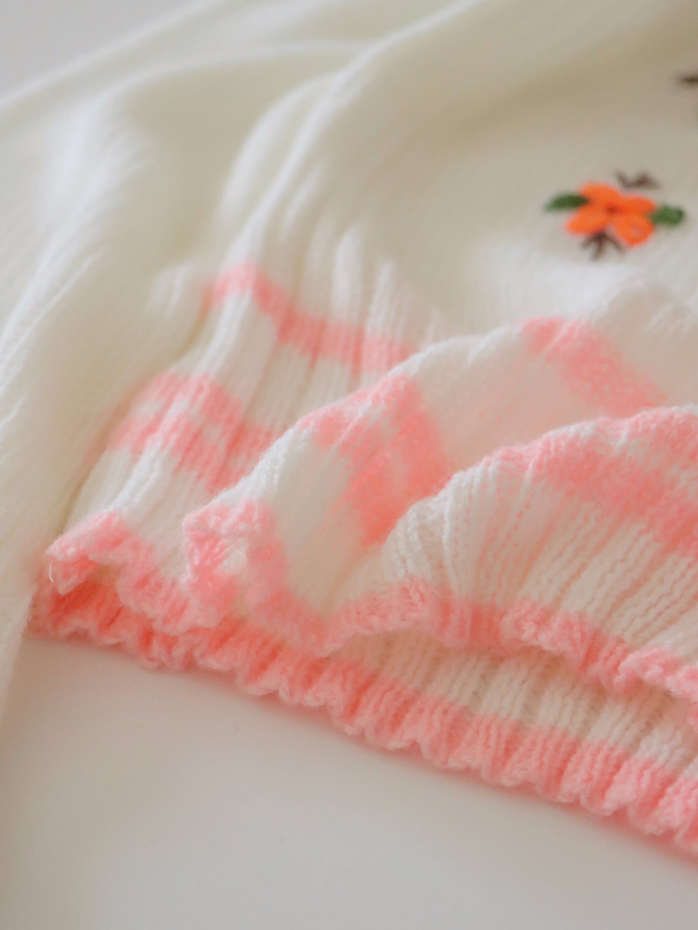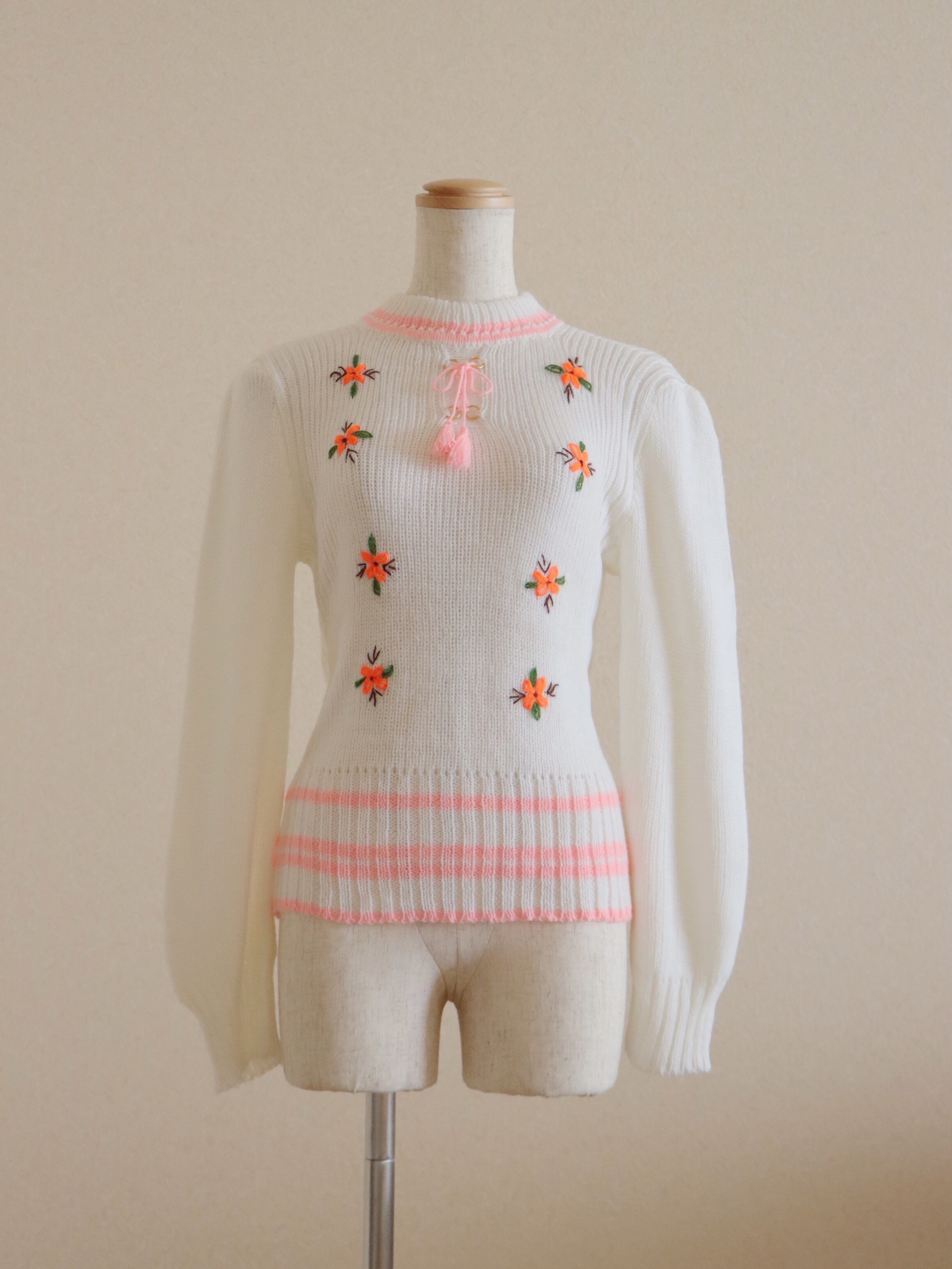 ●pink & white color flower embroidery ribbon knitted top