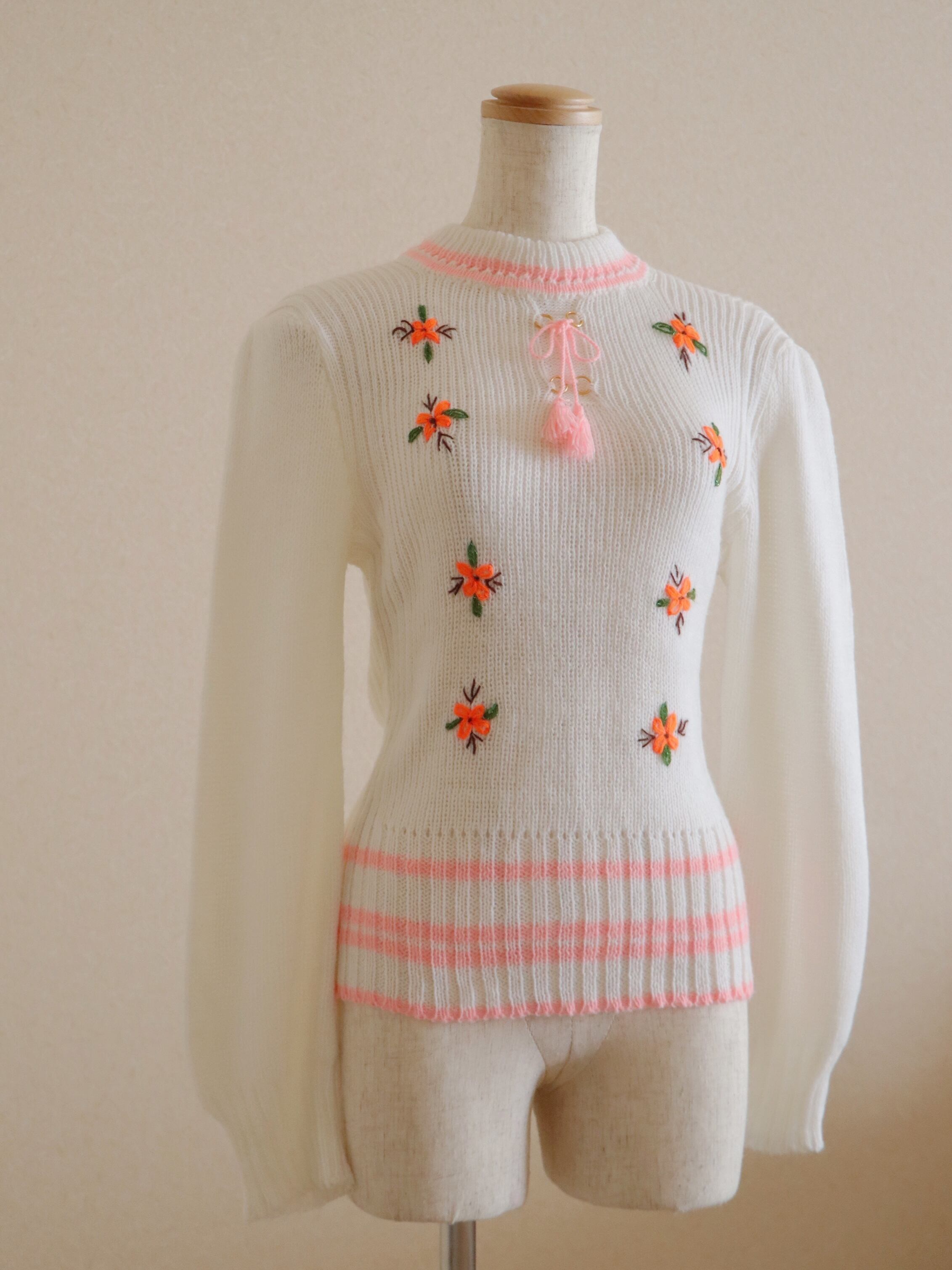 ●pink & white color flower embroidery ribbon knitted top.