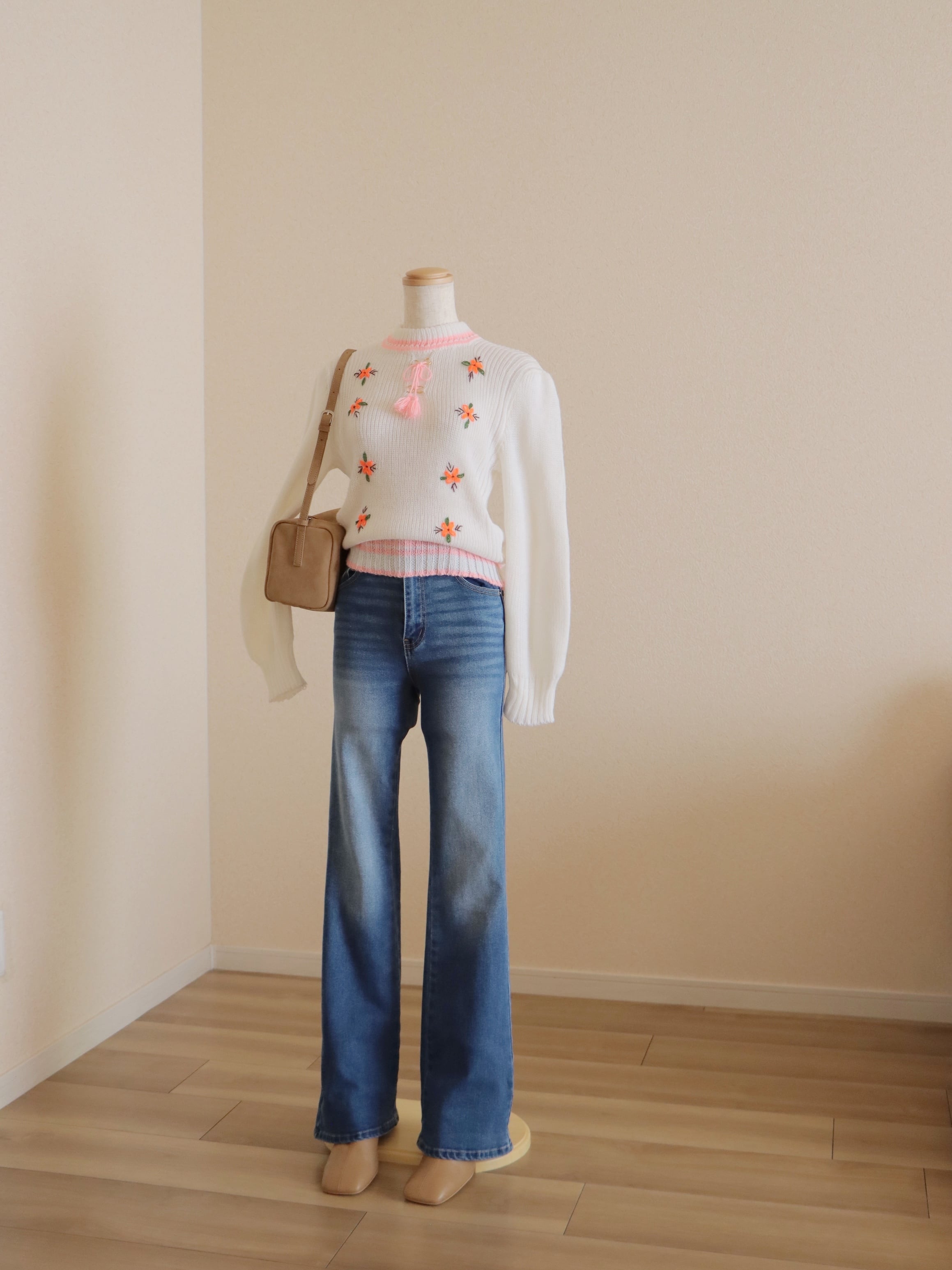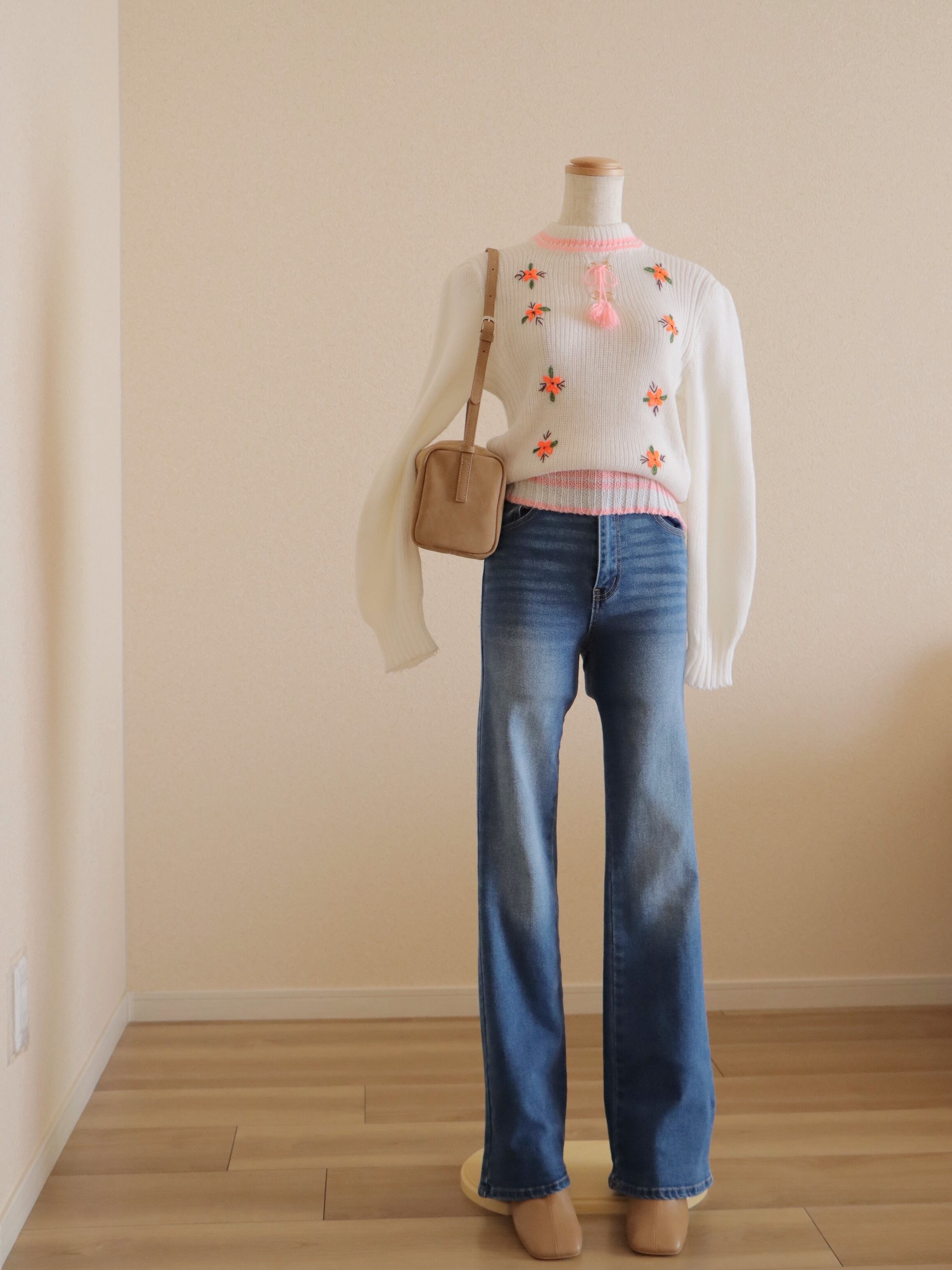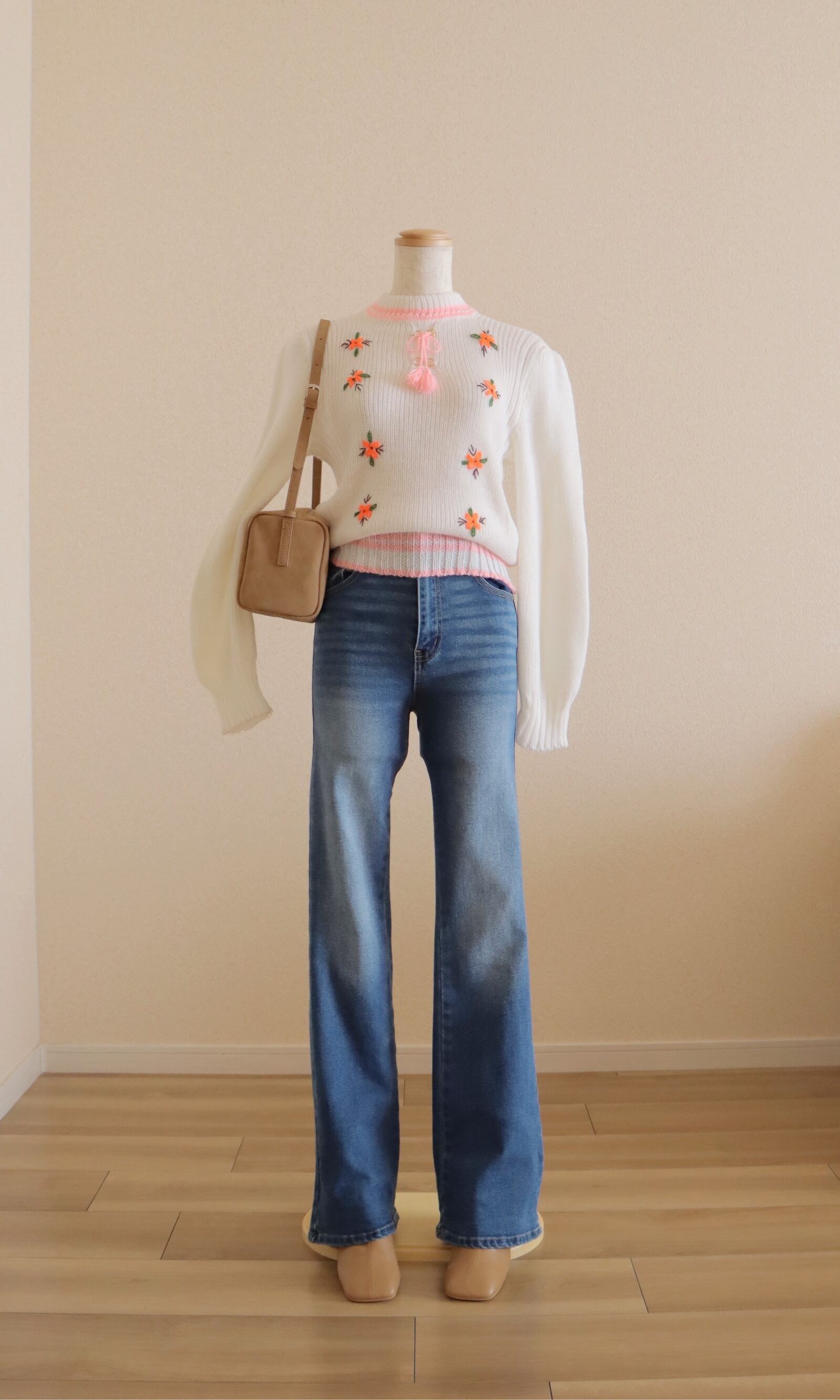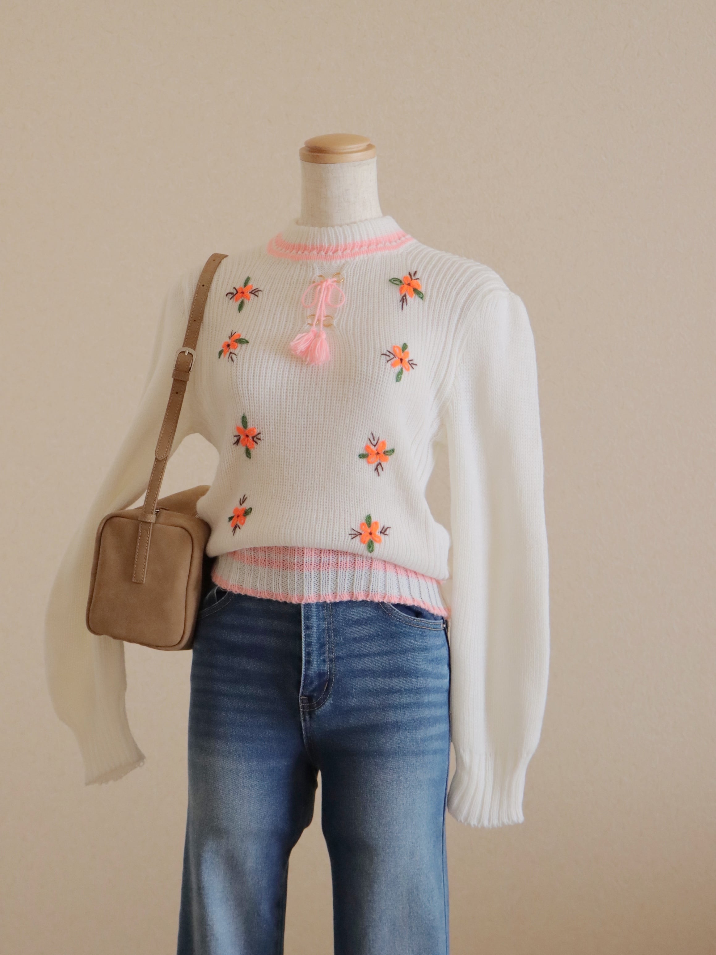 フロントのレースアップリボンやフラワー刺繍がアクセントになった、これからの季節にお勧めのニットトップス。
