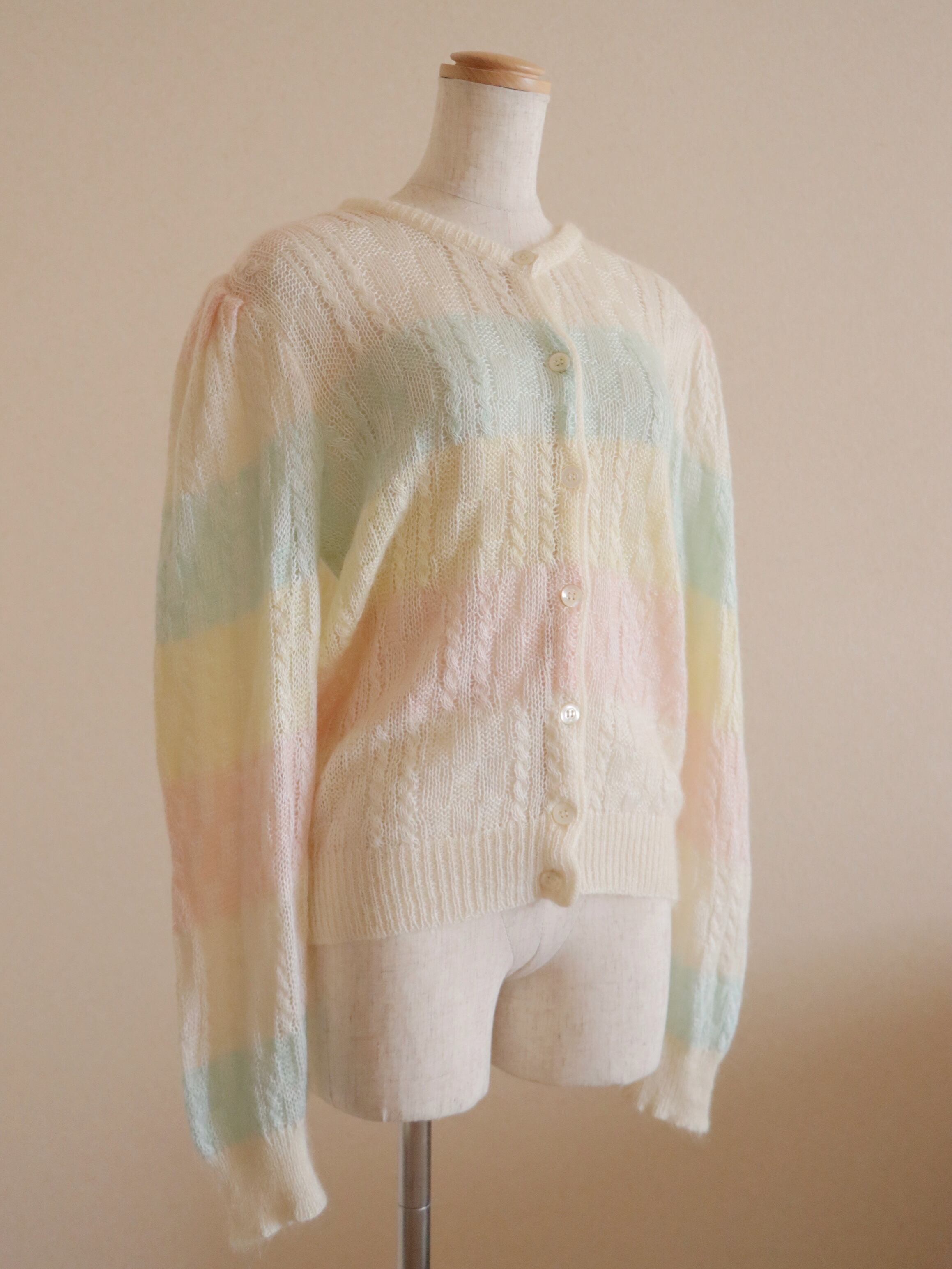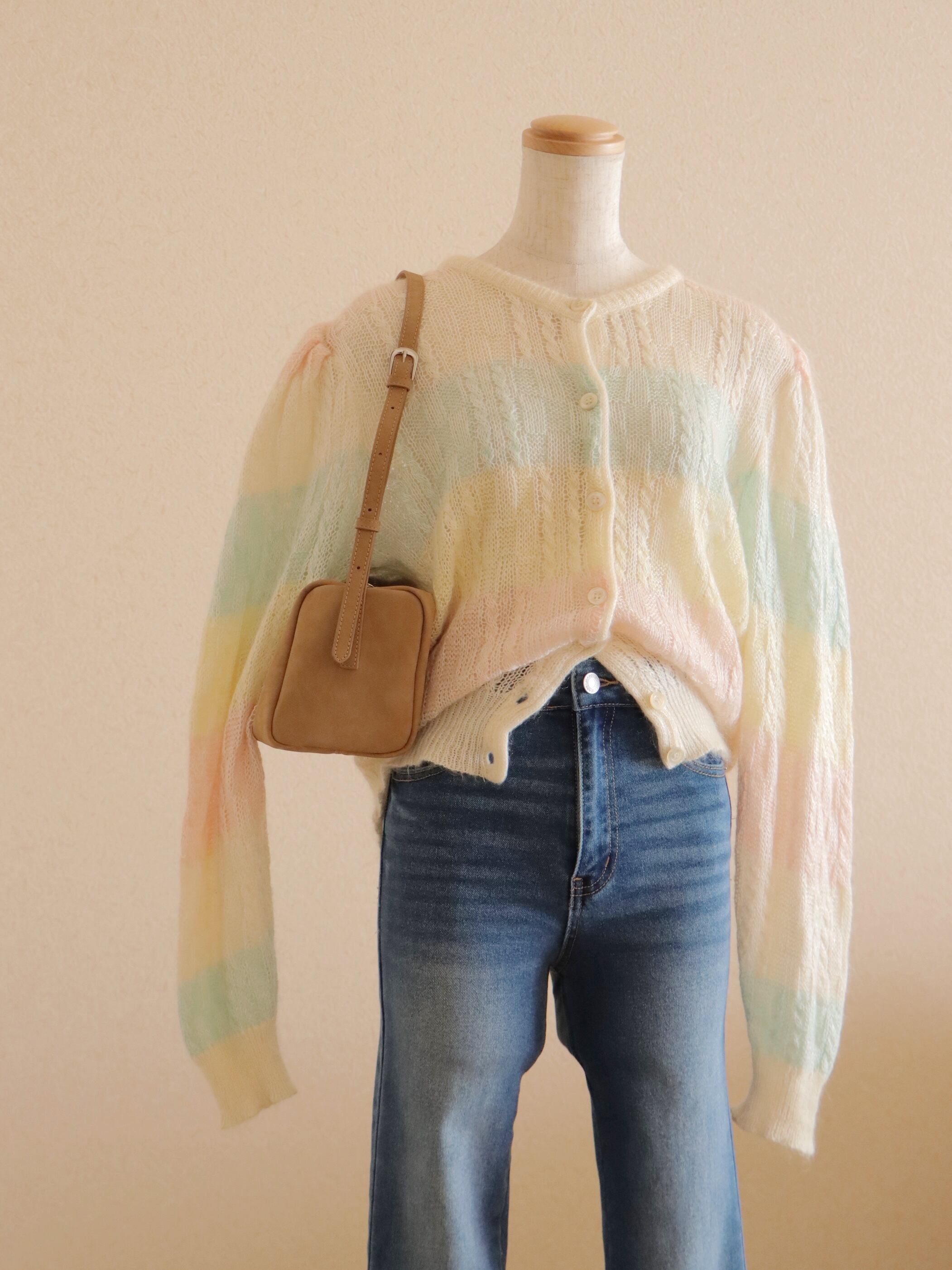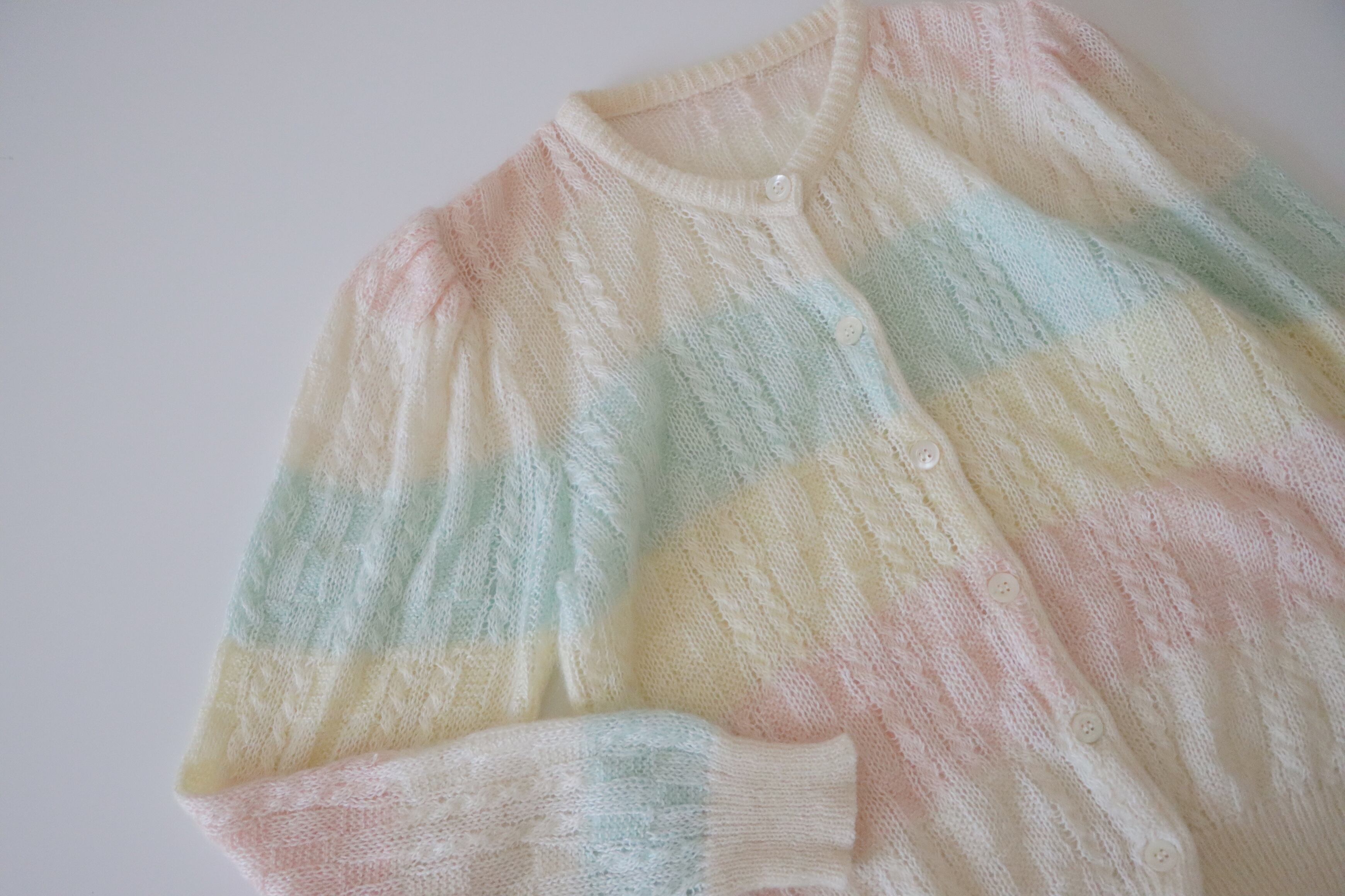 淡く優しいペールカラーの配色が可愛い、秋口から長くご愛用いただけるカーディガンです。