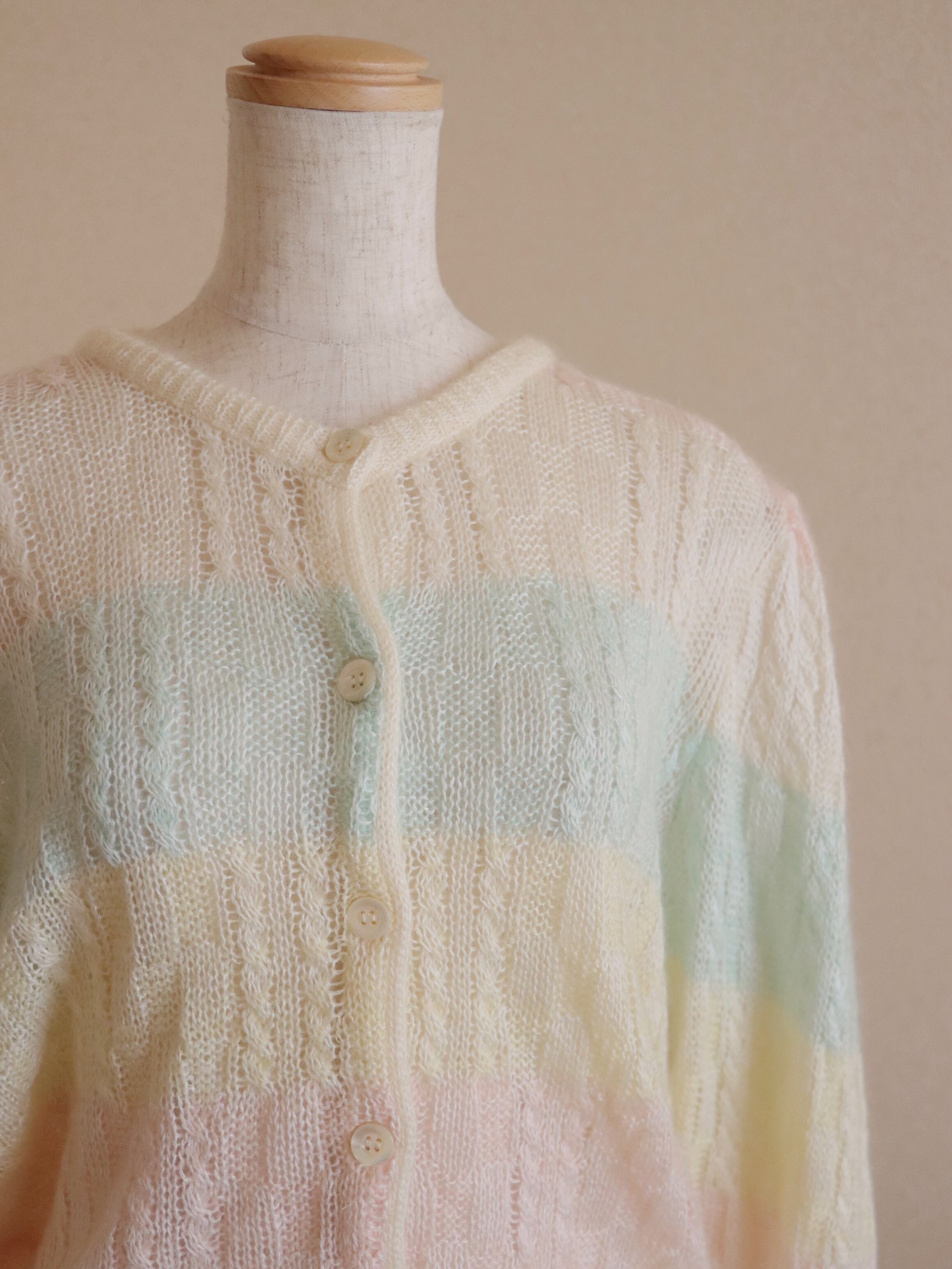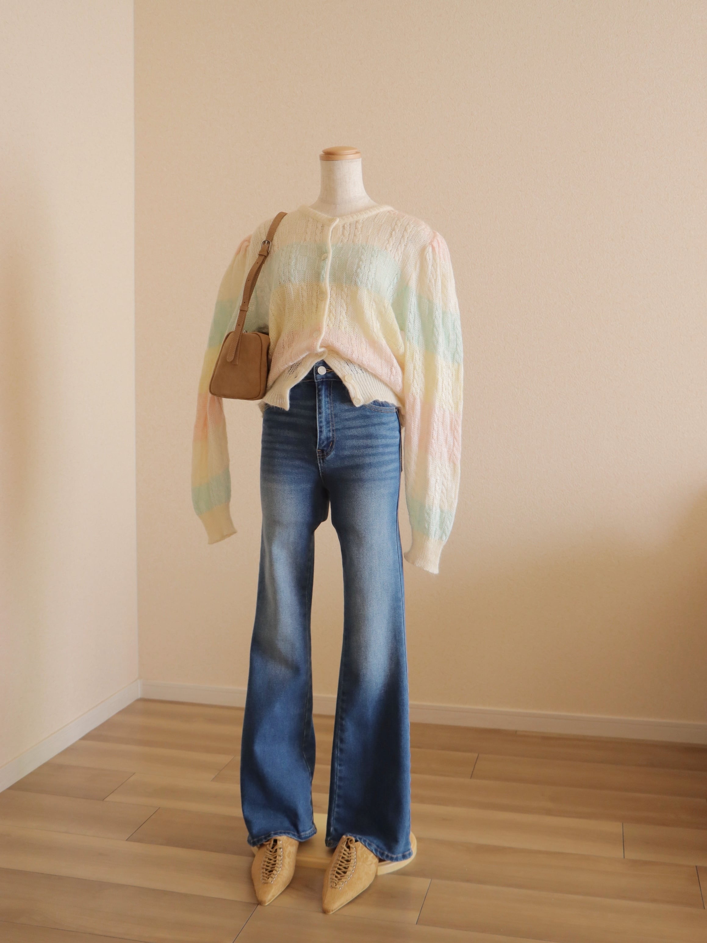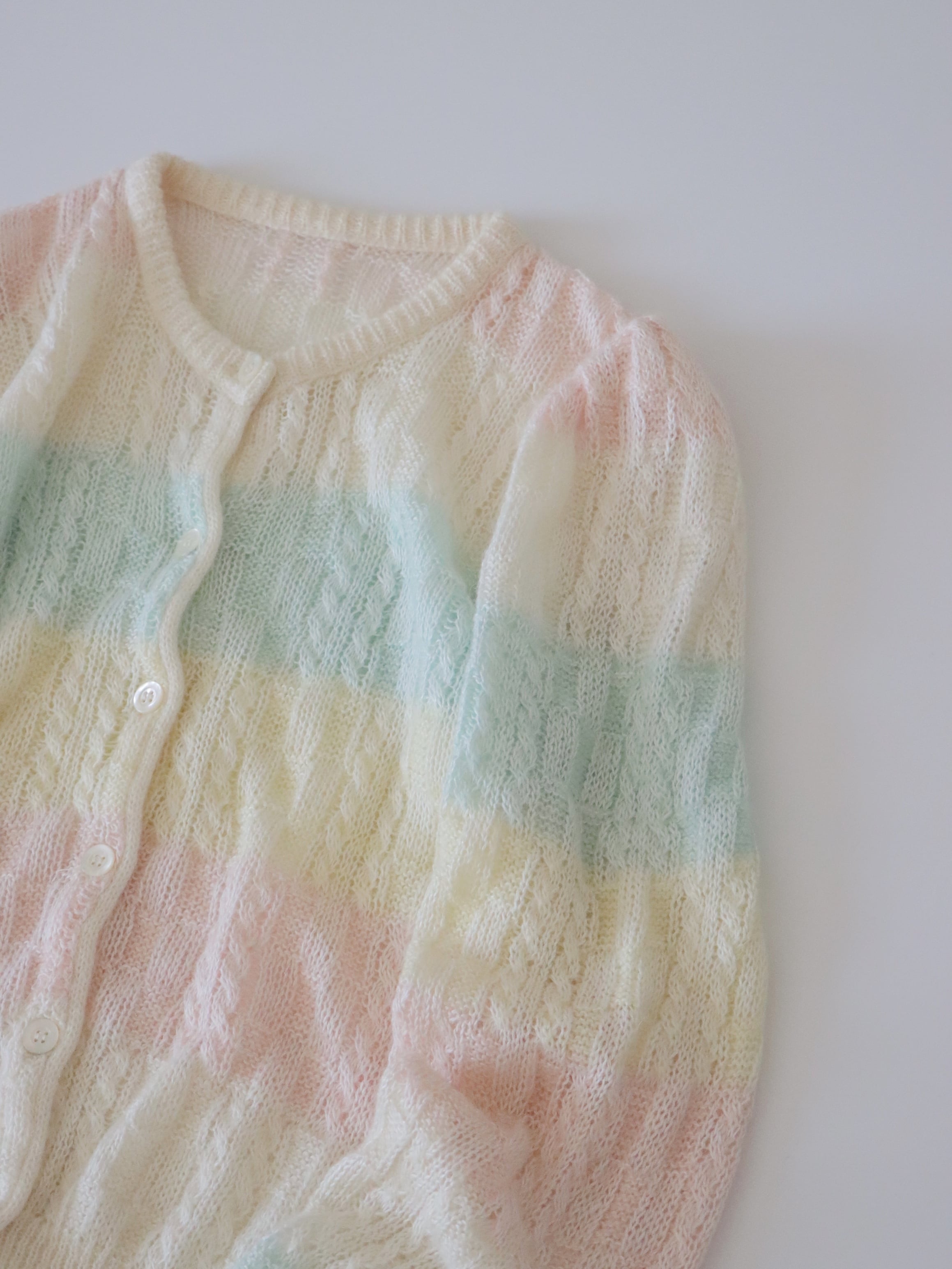 淡く優しいペールカラーの配色が可愛い、秋口から長くご愛用いただけるカーディガンです。
