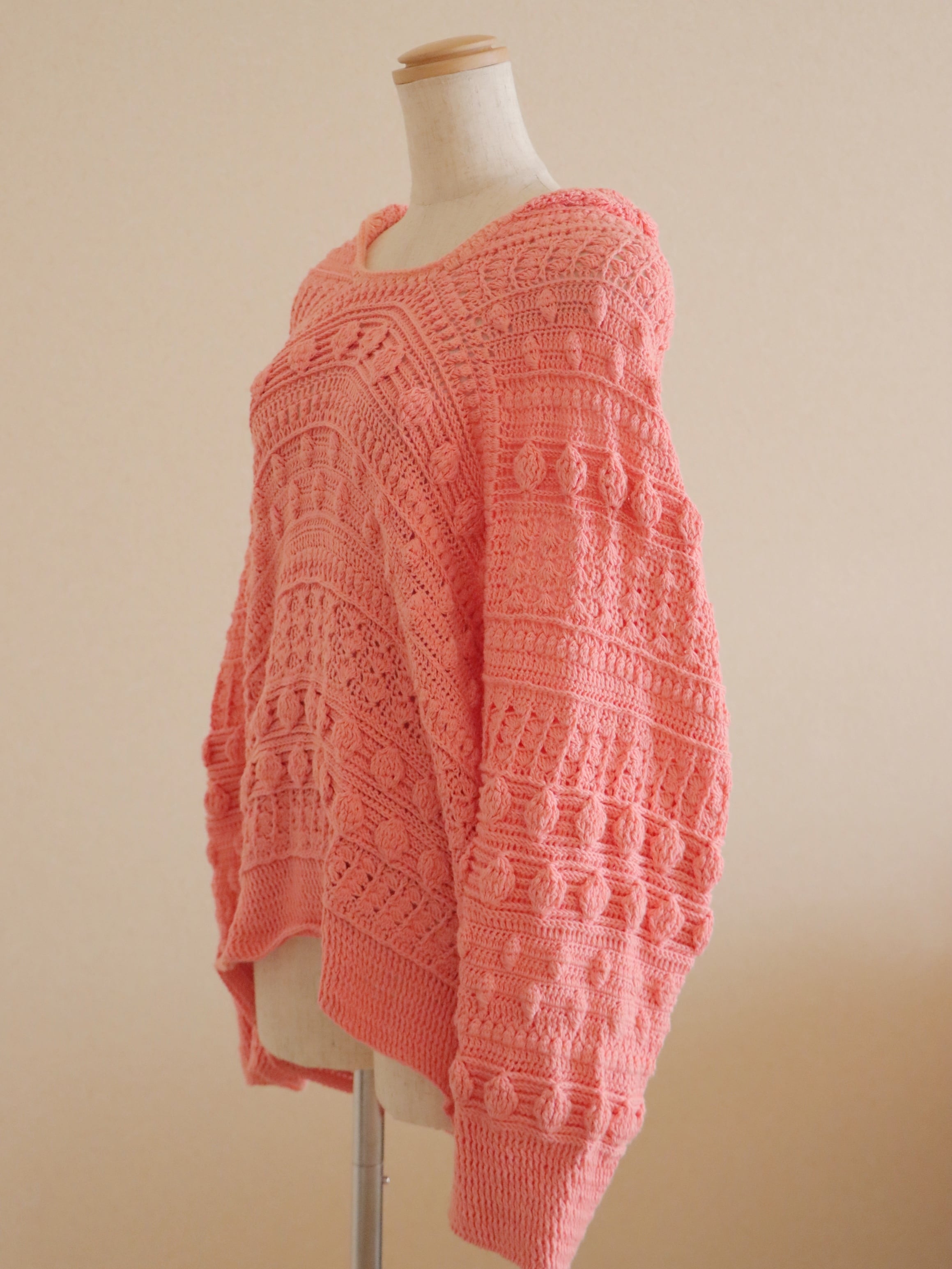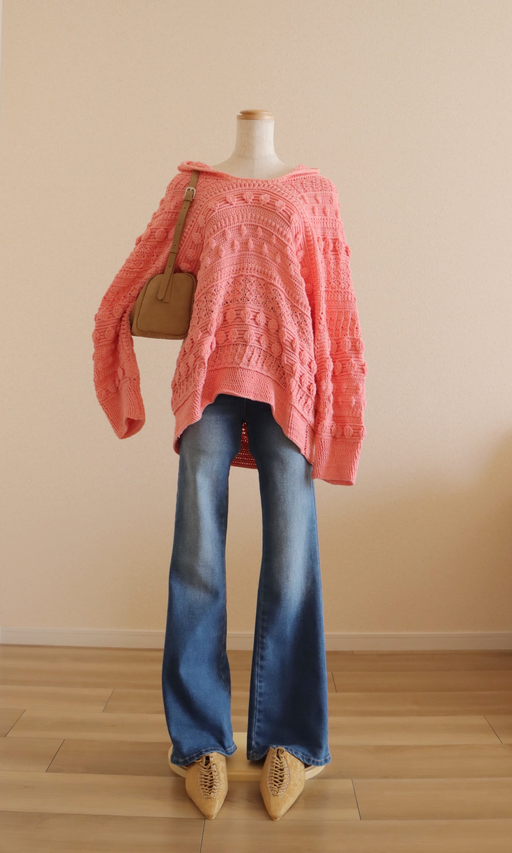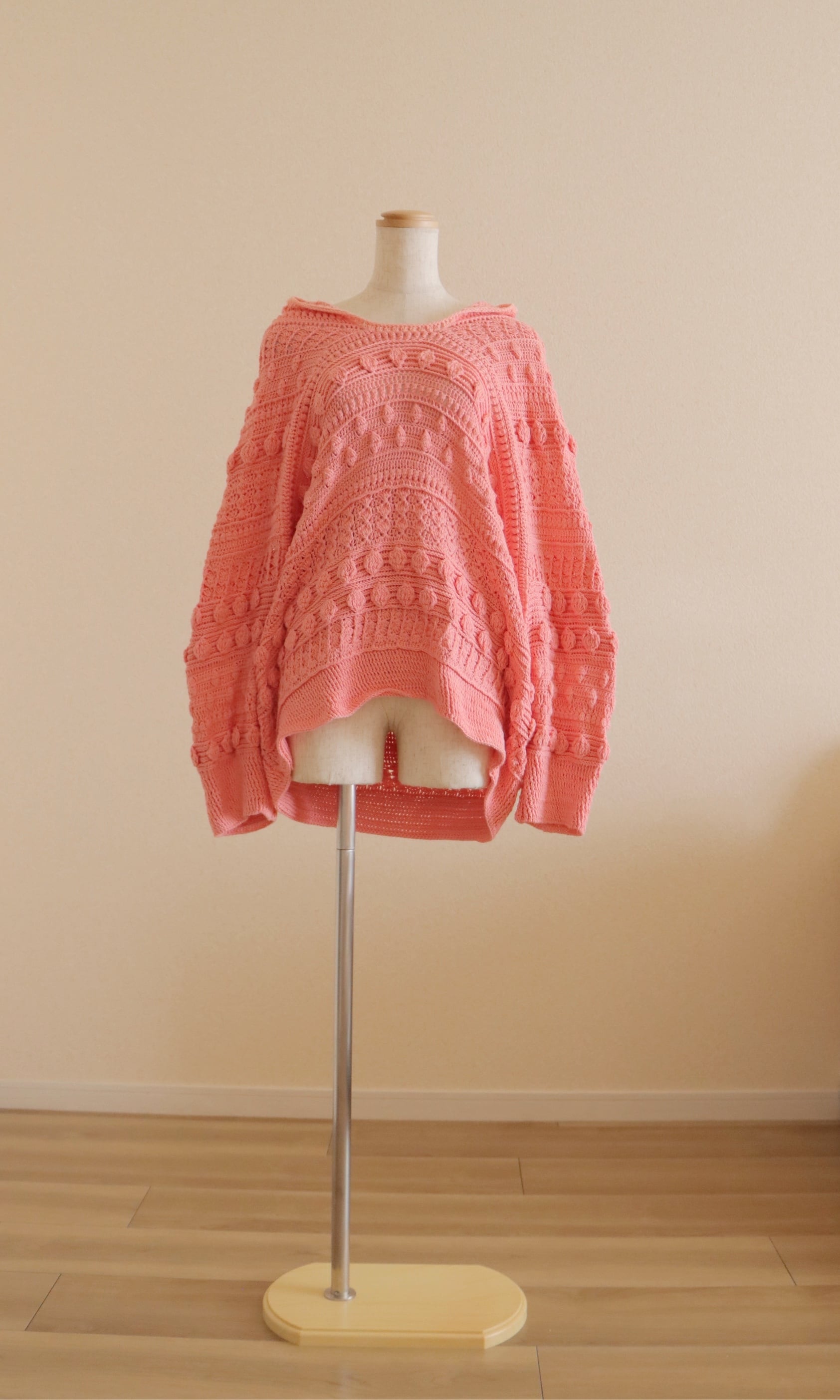 凹凸感のある立体的な編地に、スタイリングの主役になってくれる色味が可愛い1着。