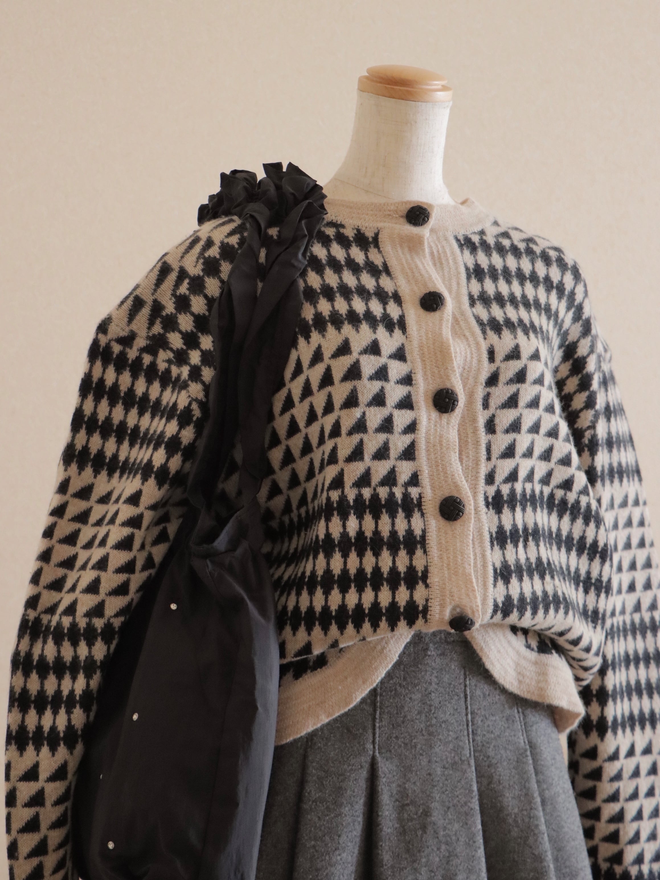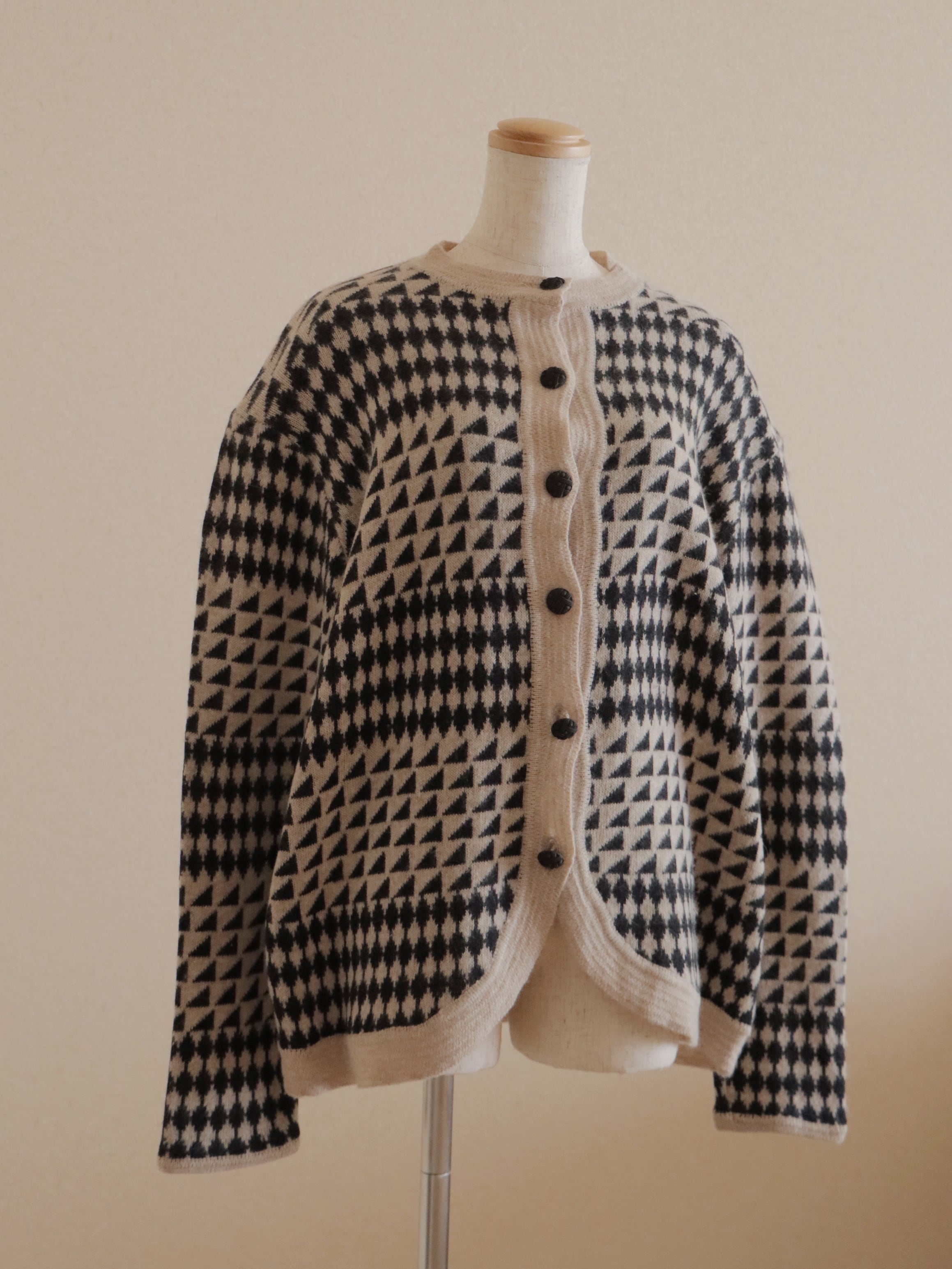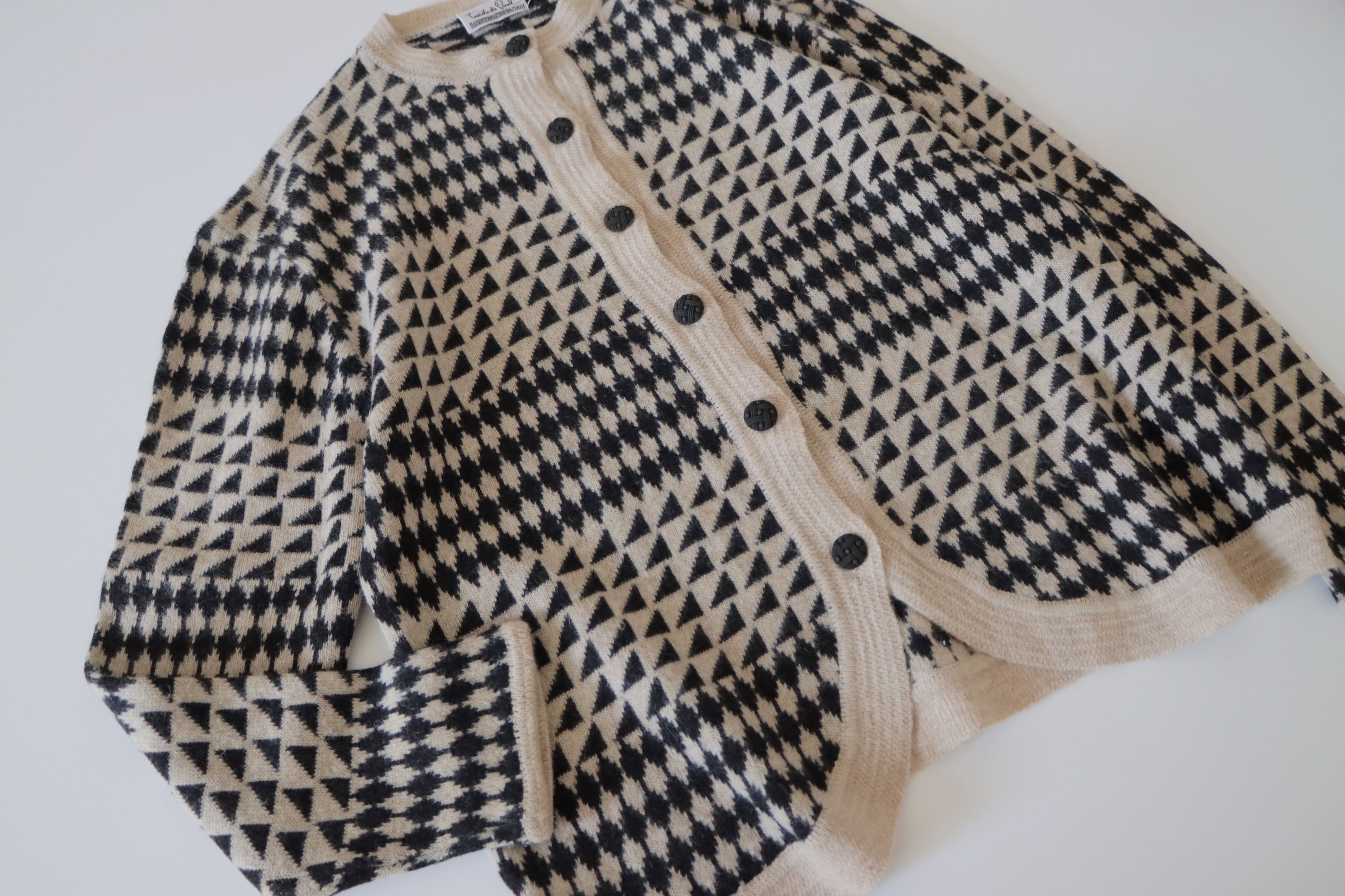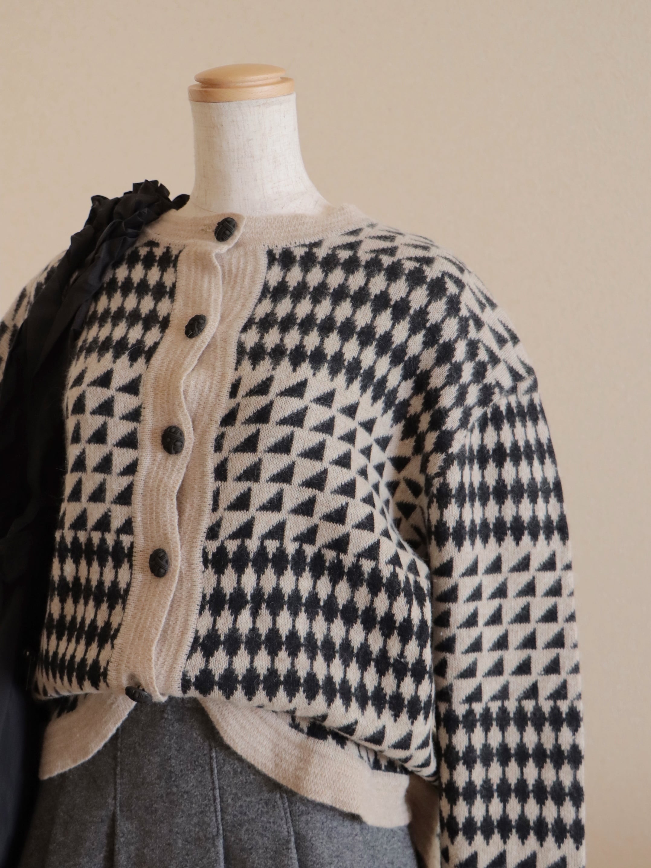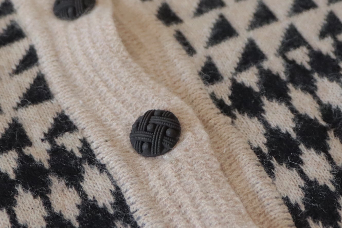 落ち着いたモノトーンカラーの幾何学柄に立体的なデザインボタンがアクセントになった、これからの季節にお勧めの1着です。