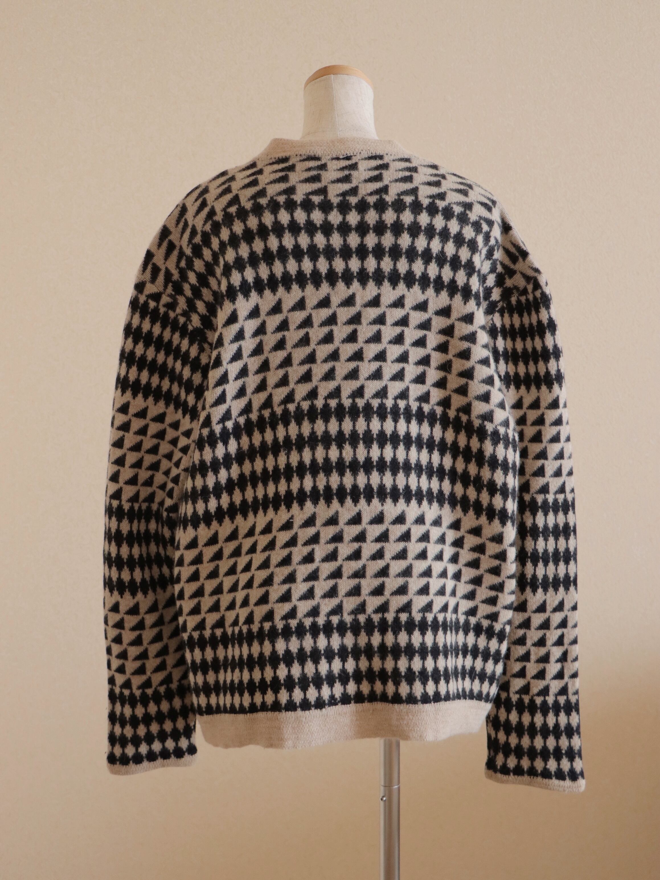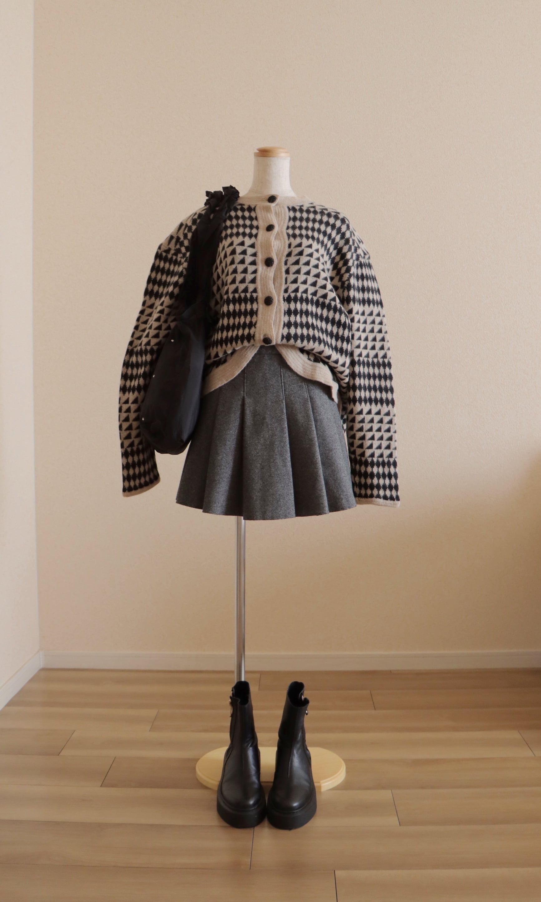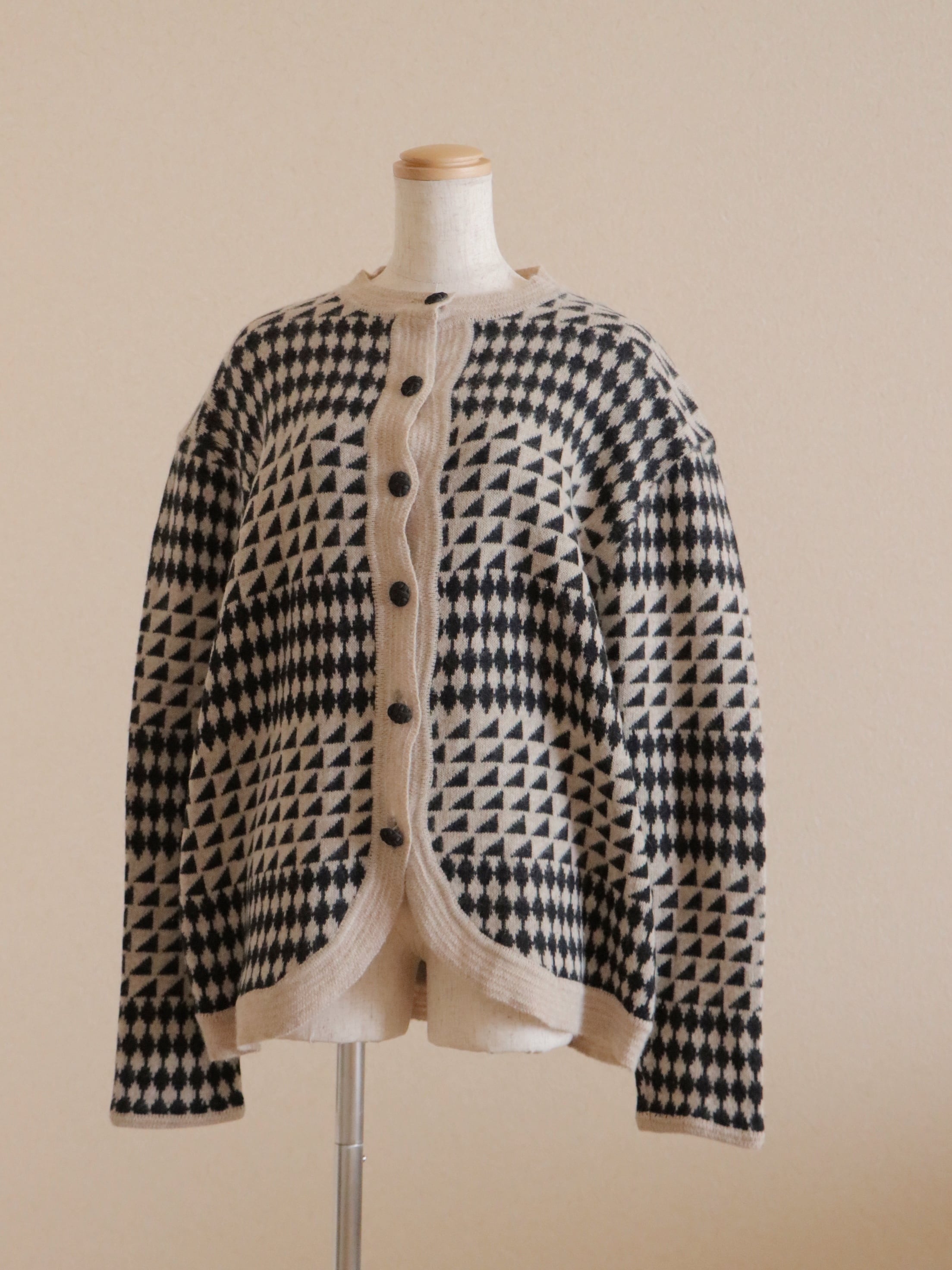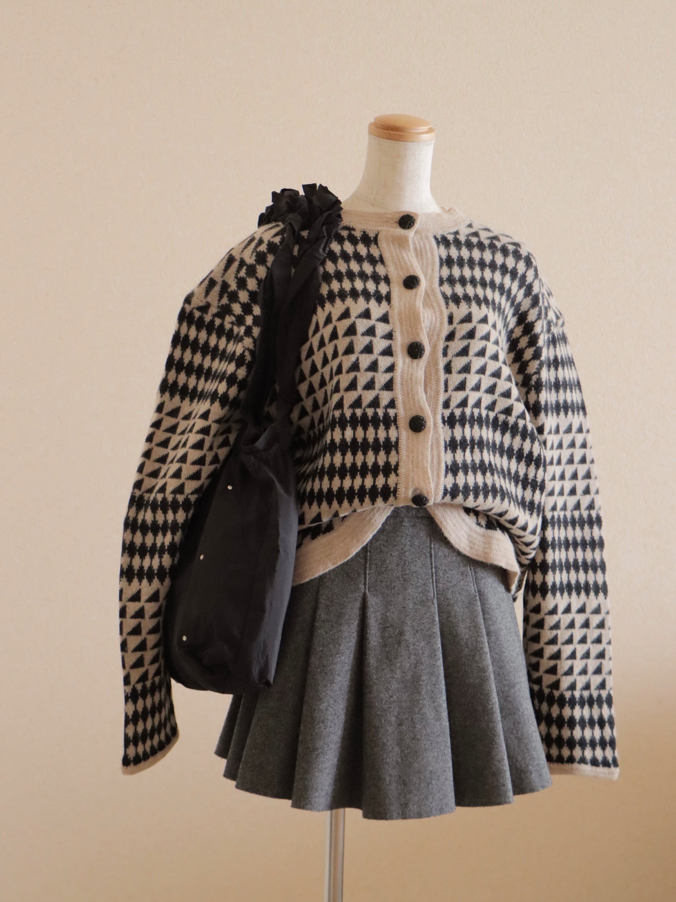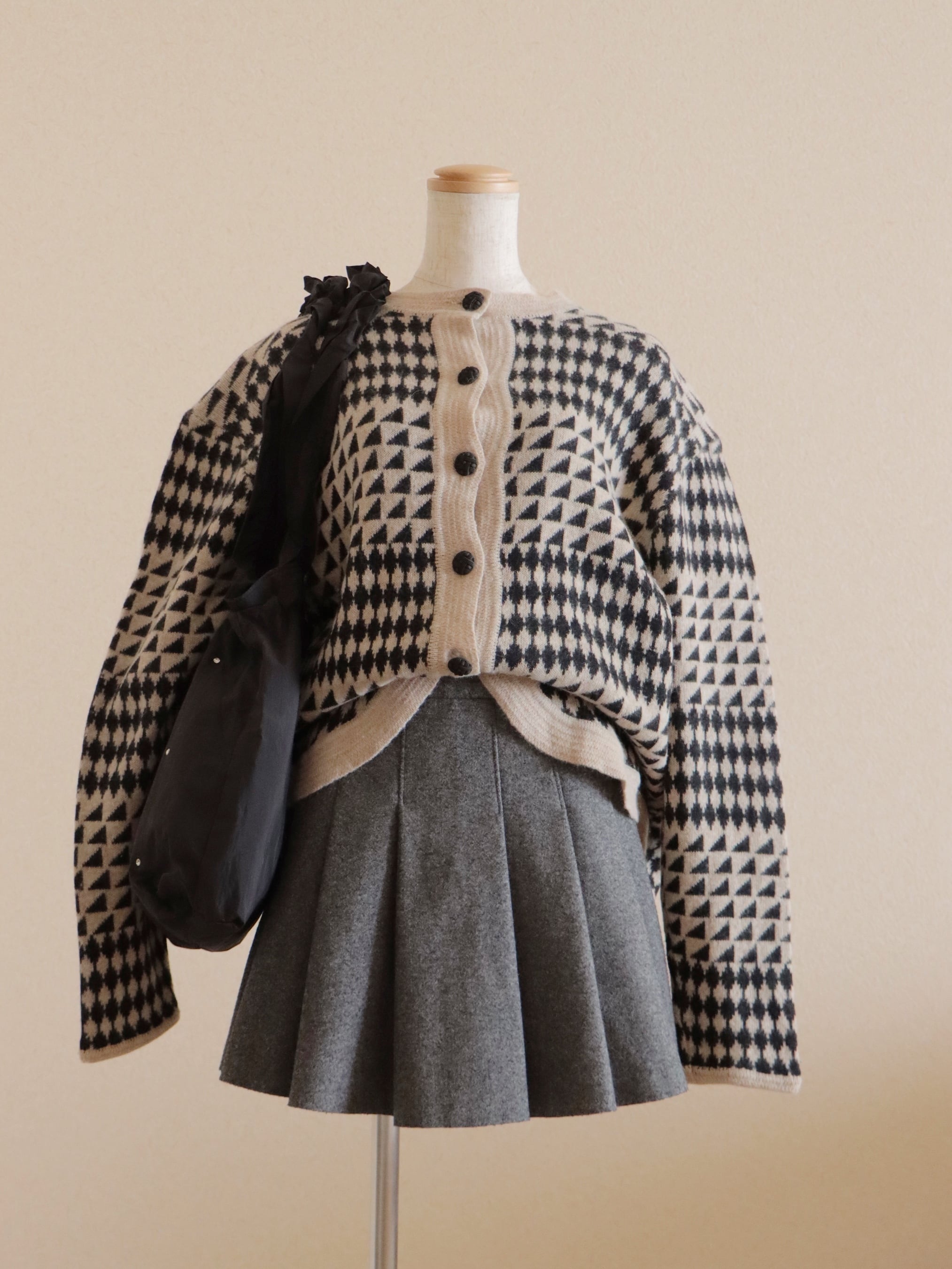 落ち着いたモノトーンカラーの幾何学柄に立体的なデザインボタンがアクセントになった、これからの季節にお勧めの1着です。