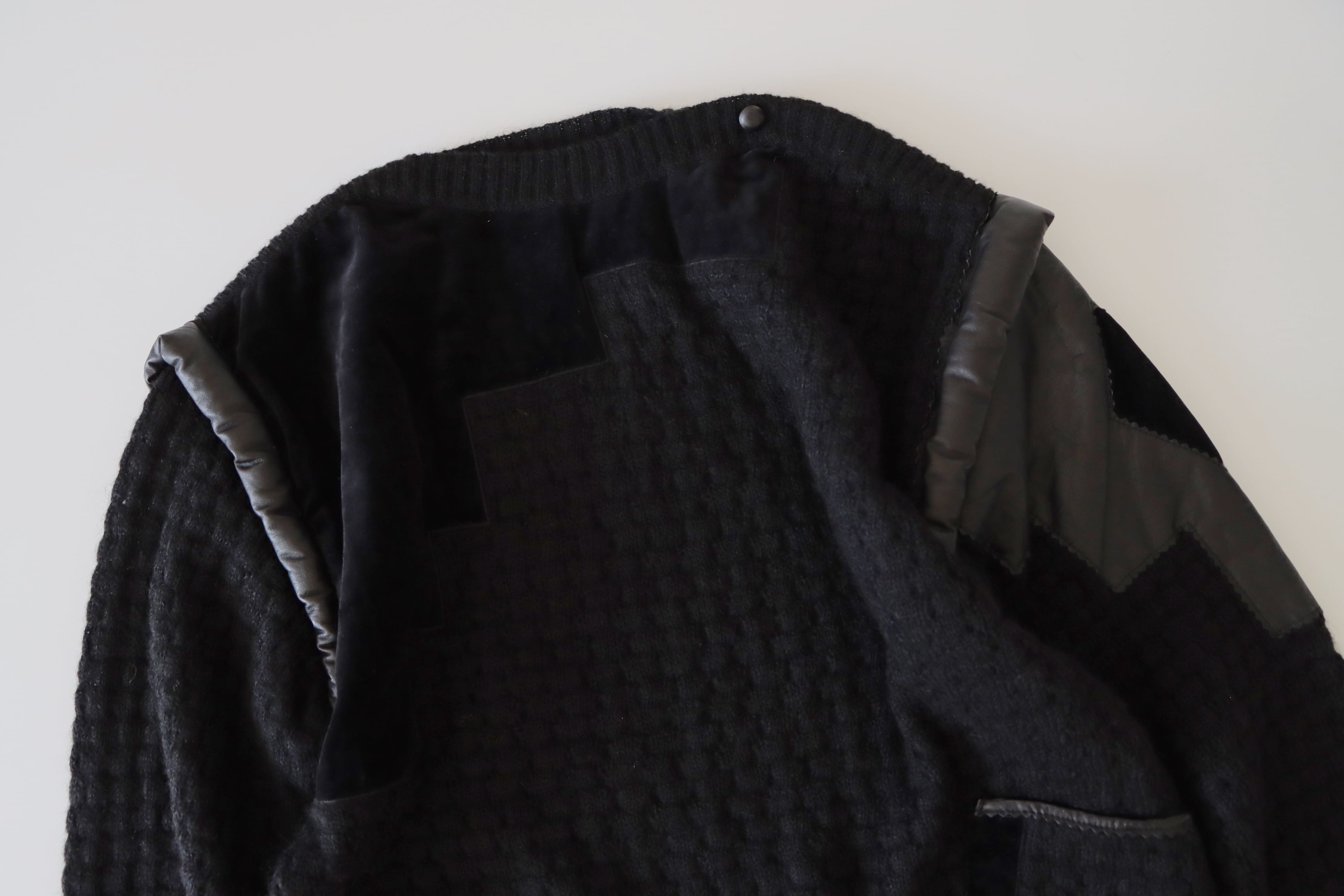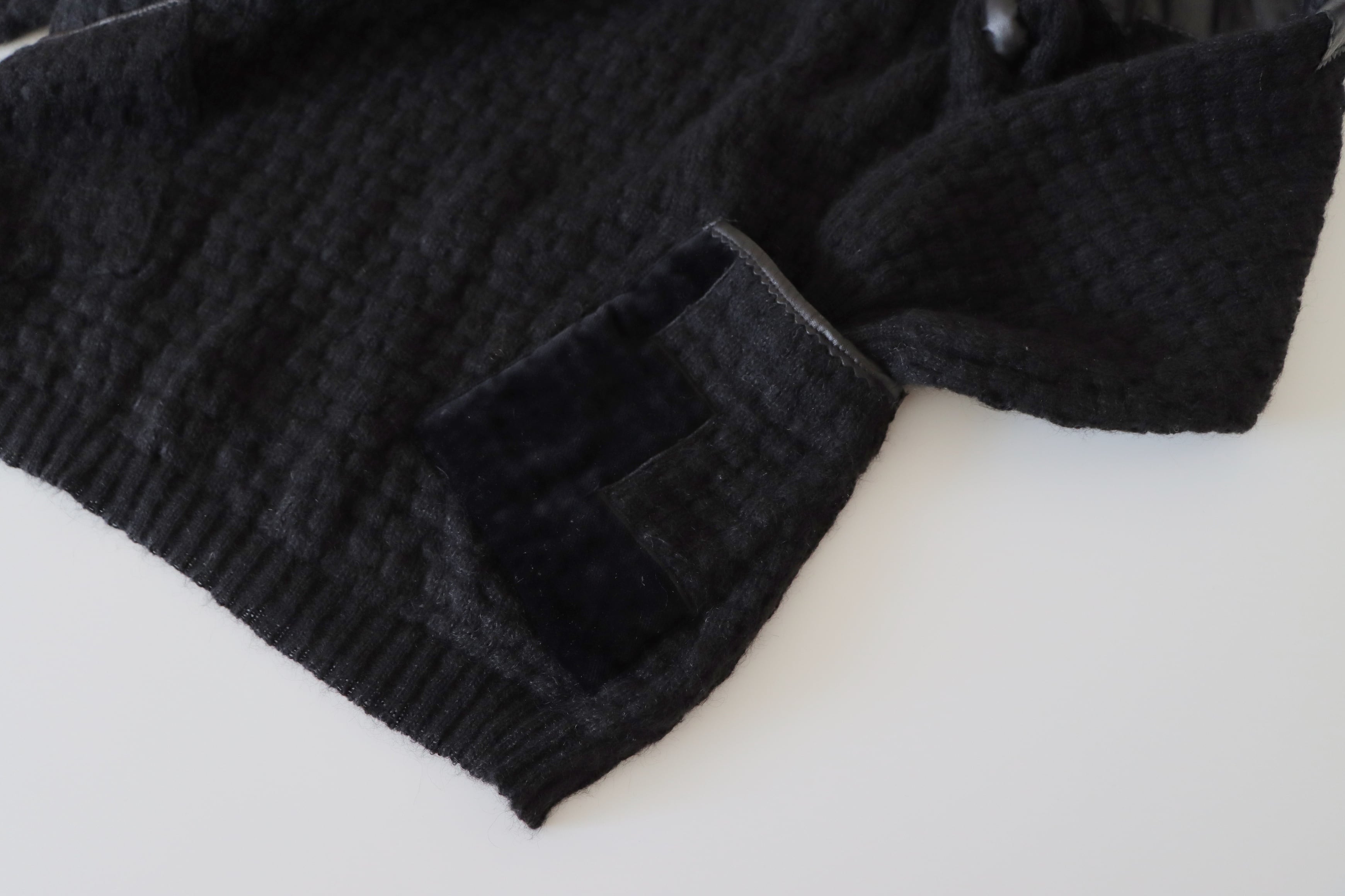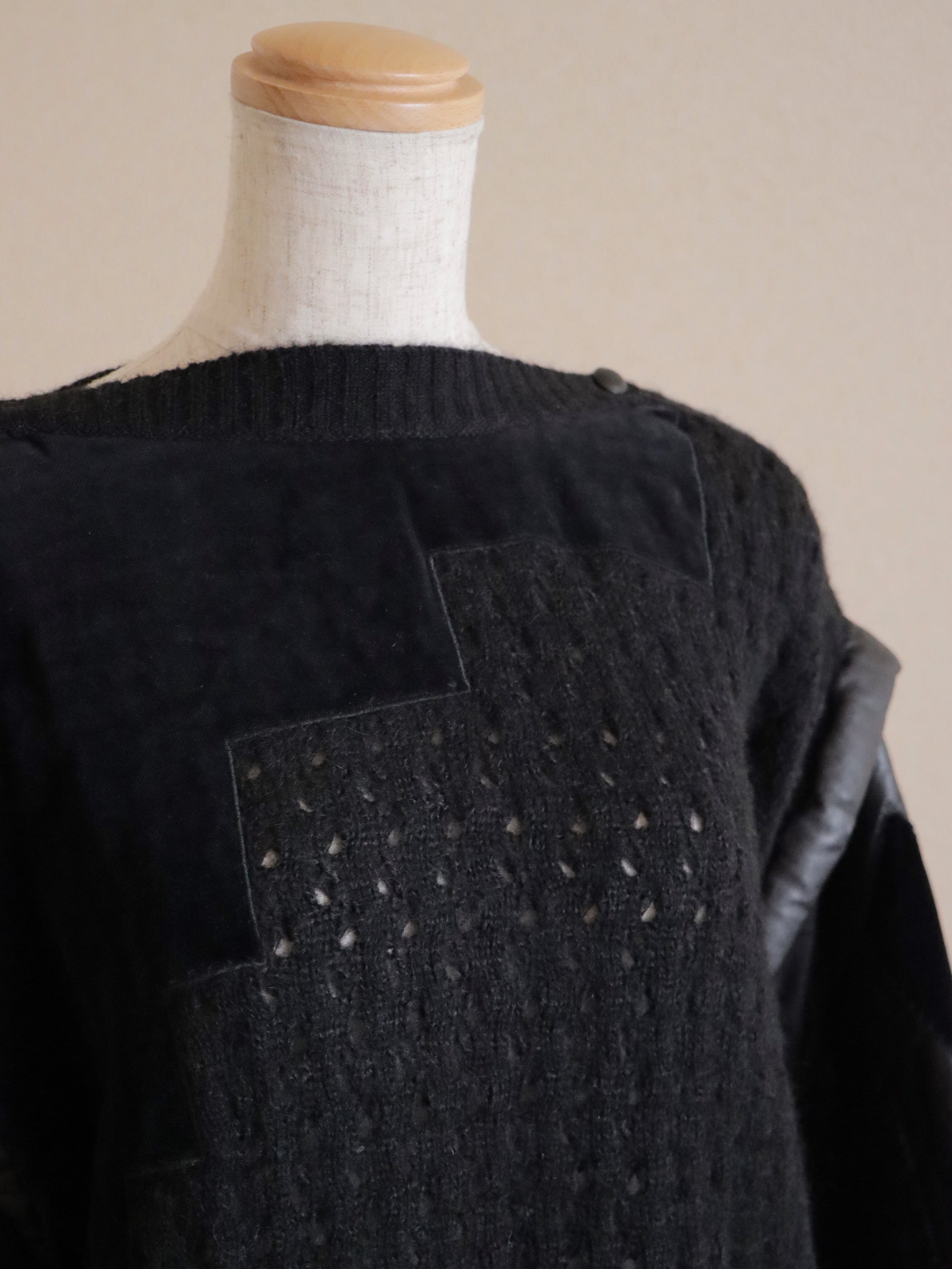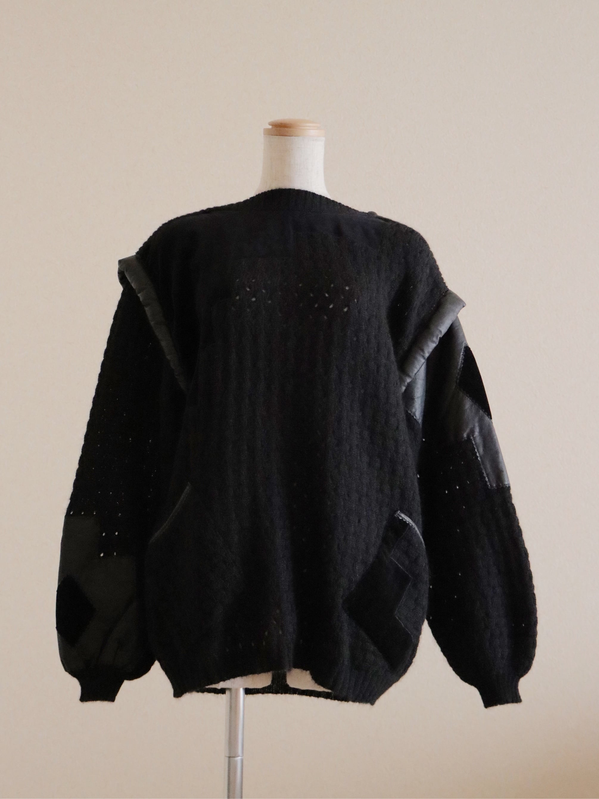 ●Kid mohair & leather & velour patchwork design pocket detail sweater.