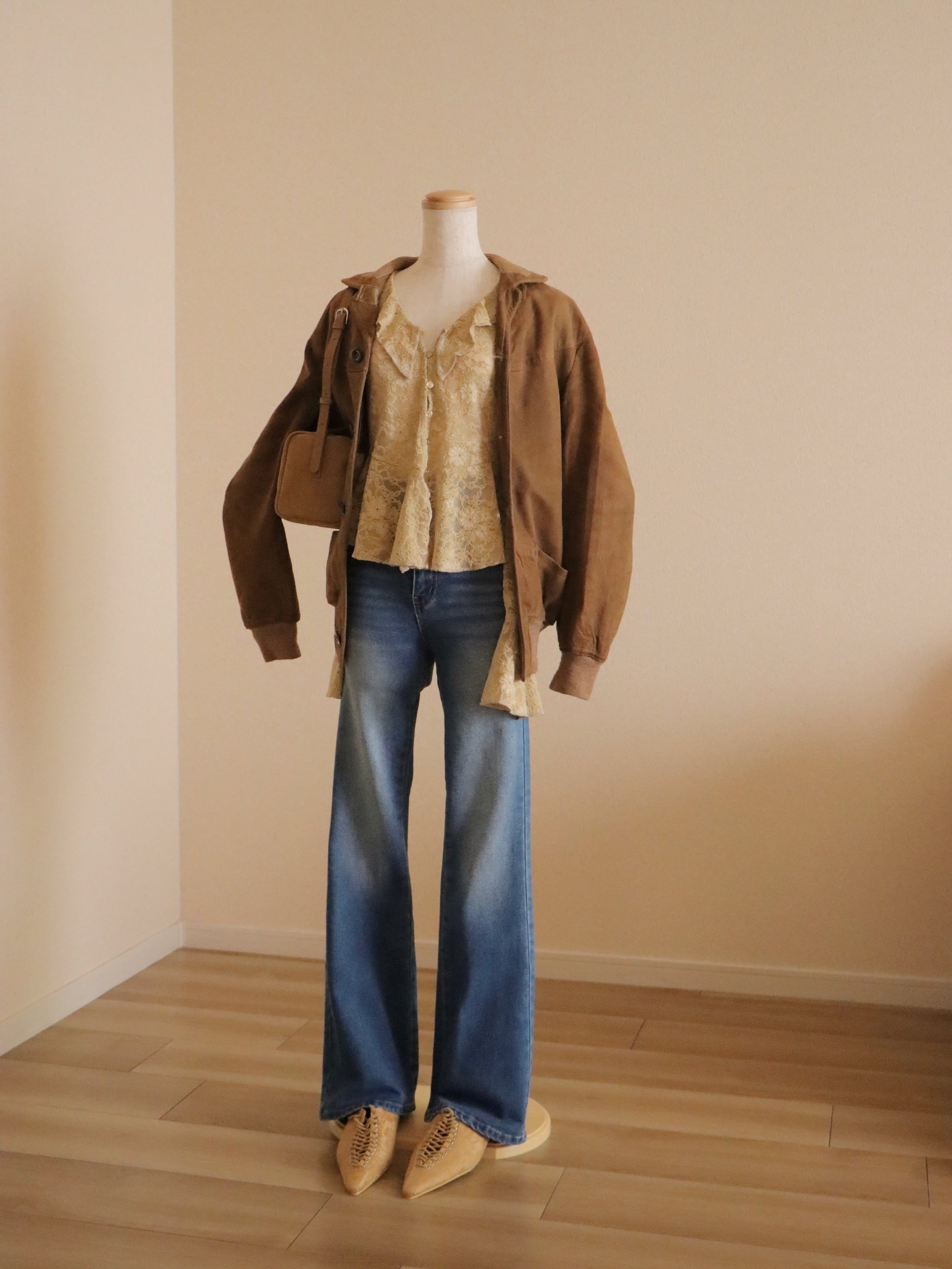 丸みのある肩まわりのシルエットが可愛く、今季トレンドのスウェード&ブラウン系の温かみのあるカラーで、スタイリングを楽しめる1着です。