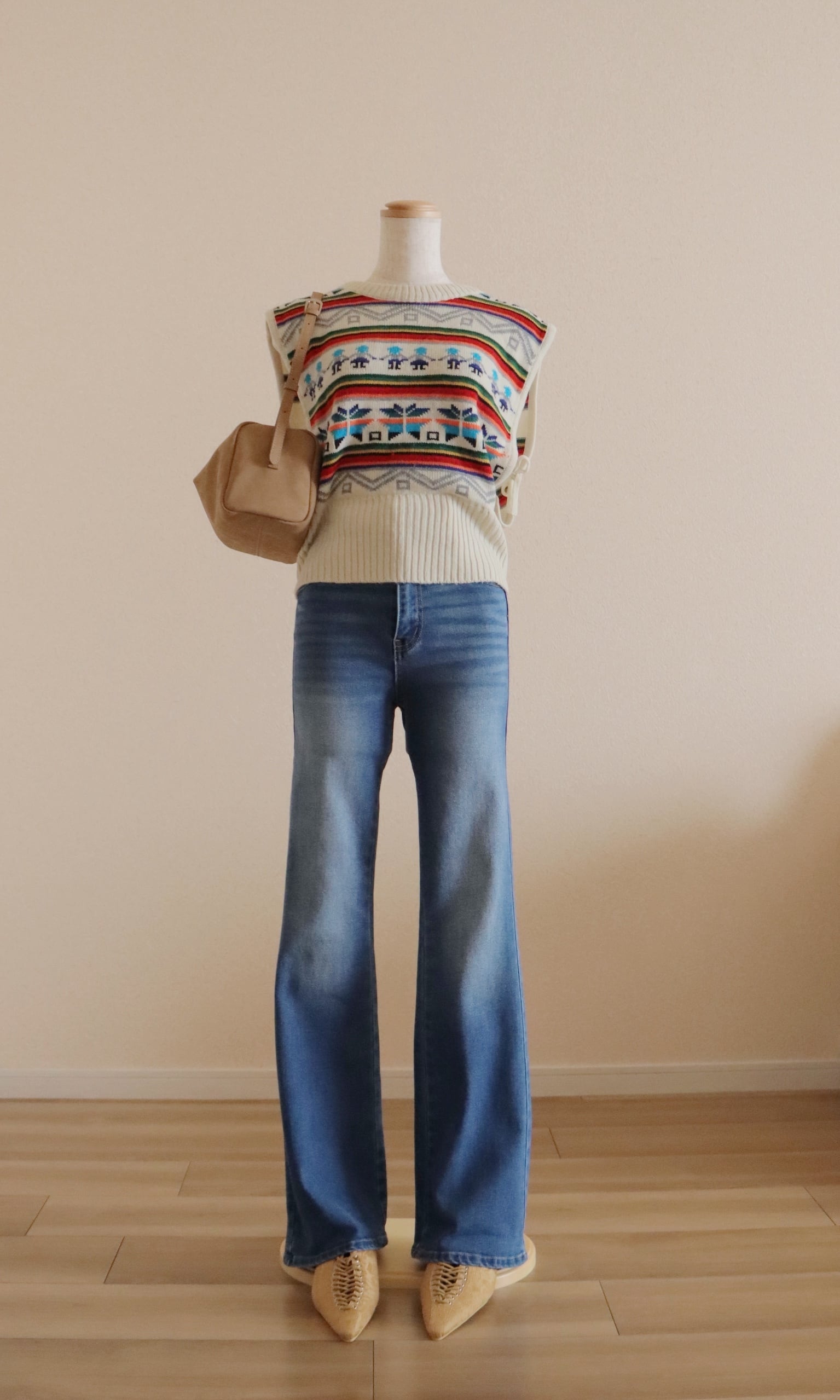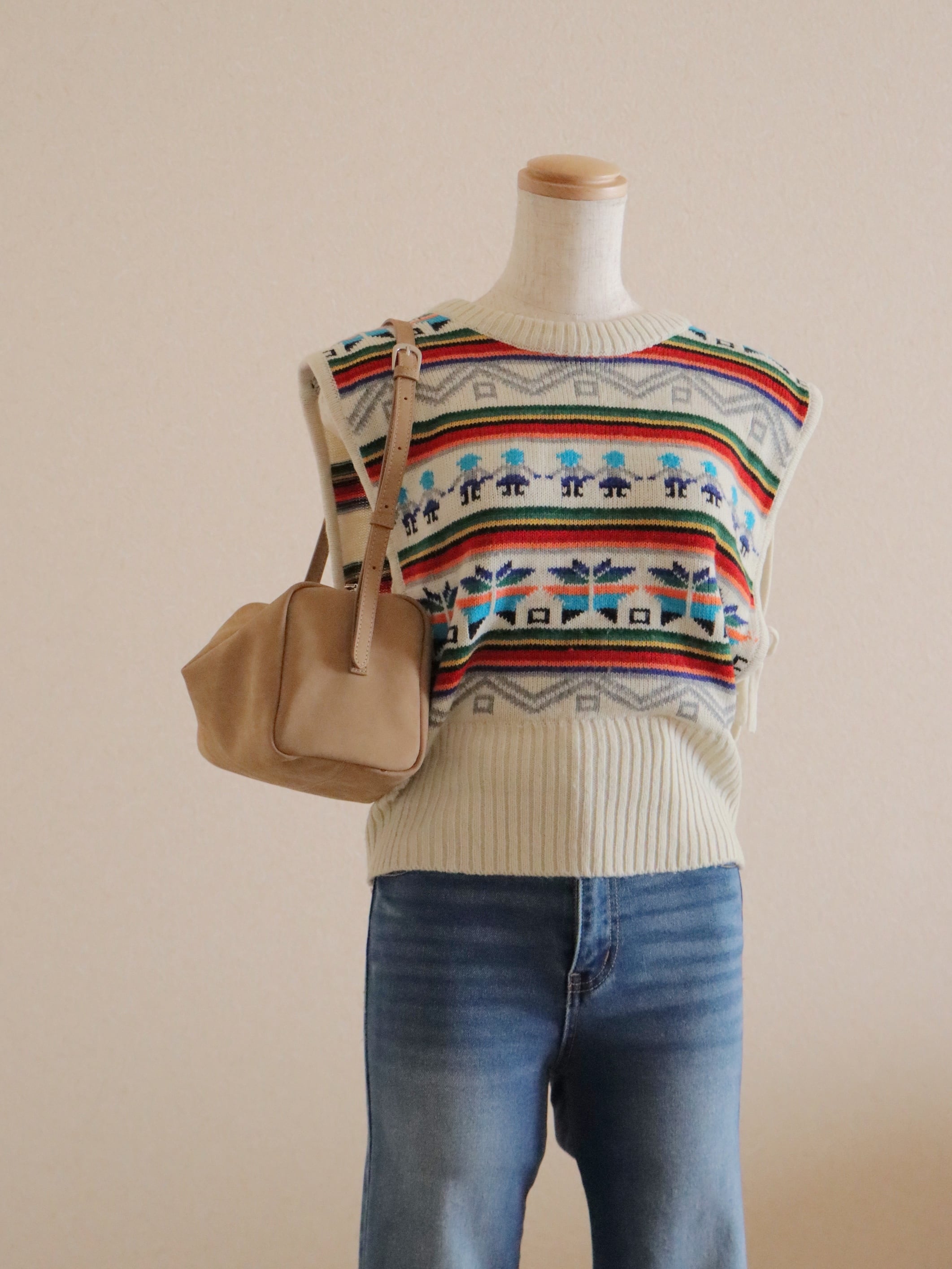 スタイリングの主役になってくれる配色が可愛い、これからの季節にお勧めのニットベスト。