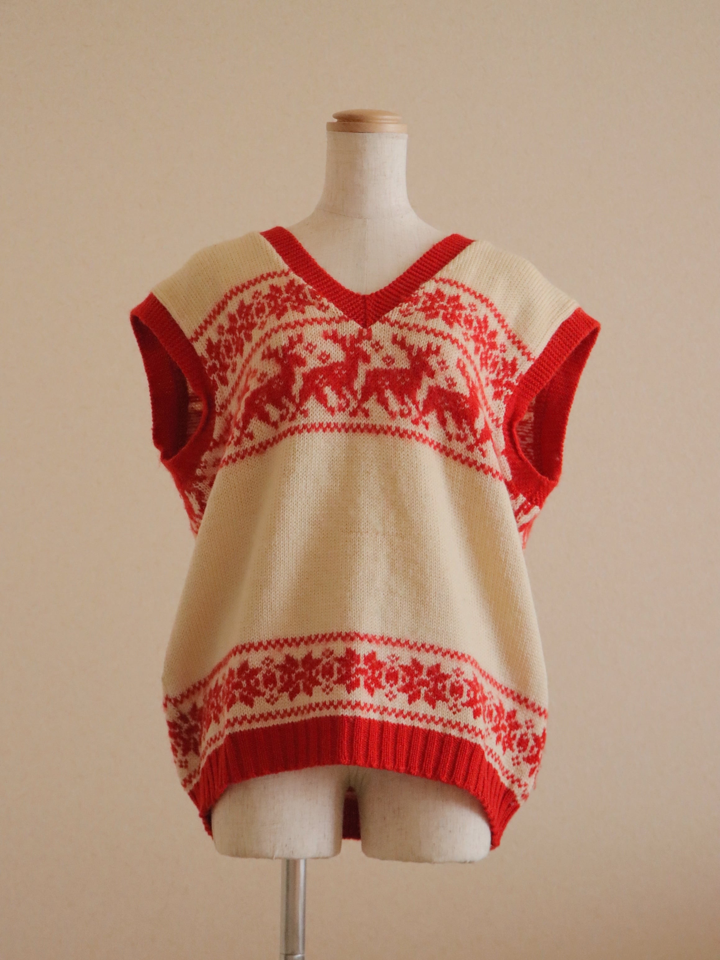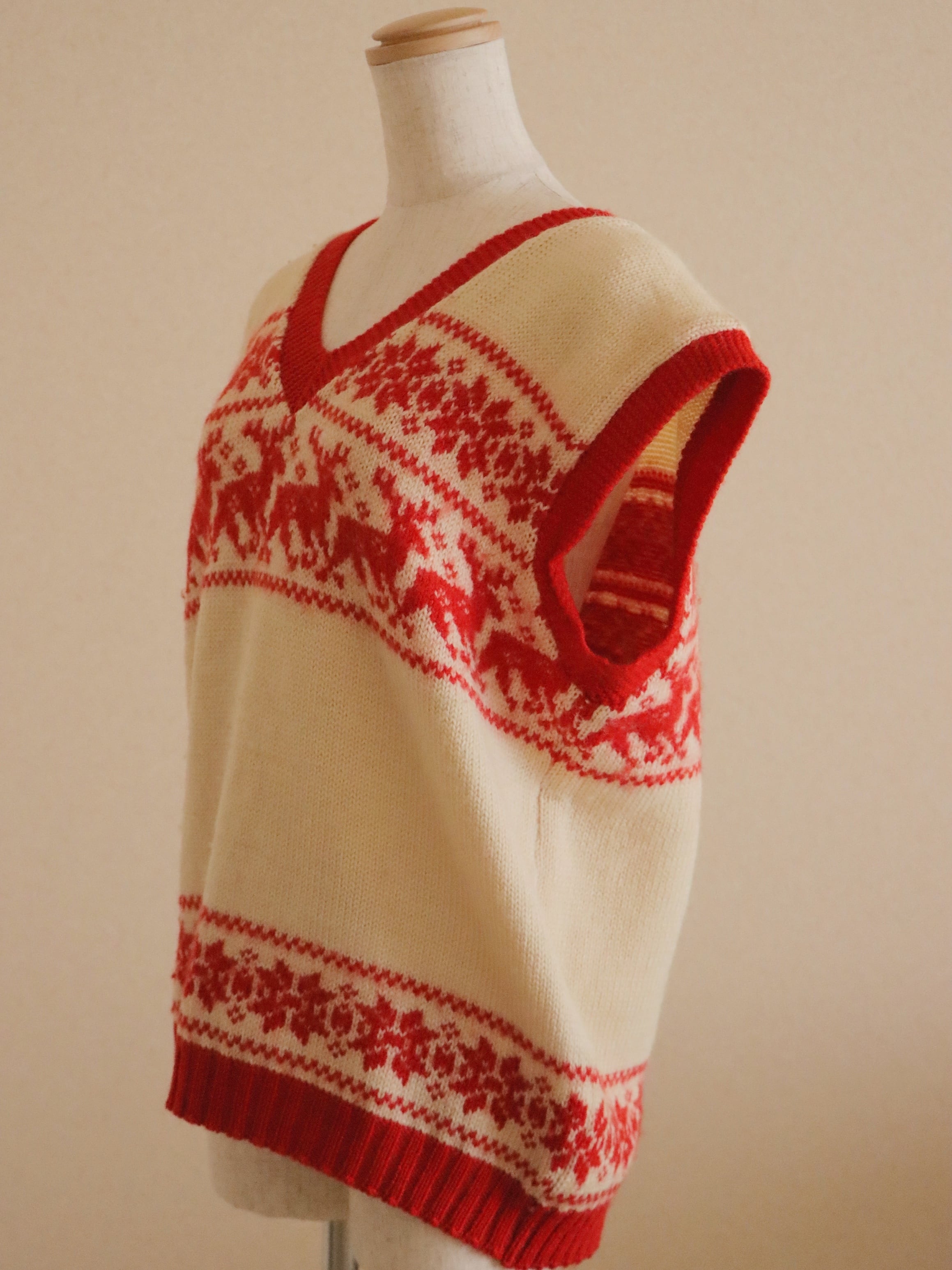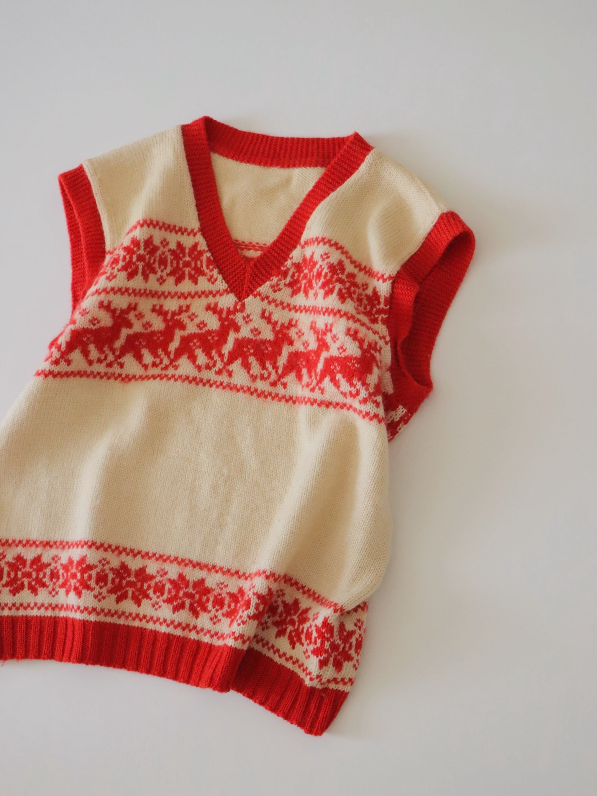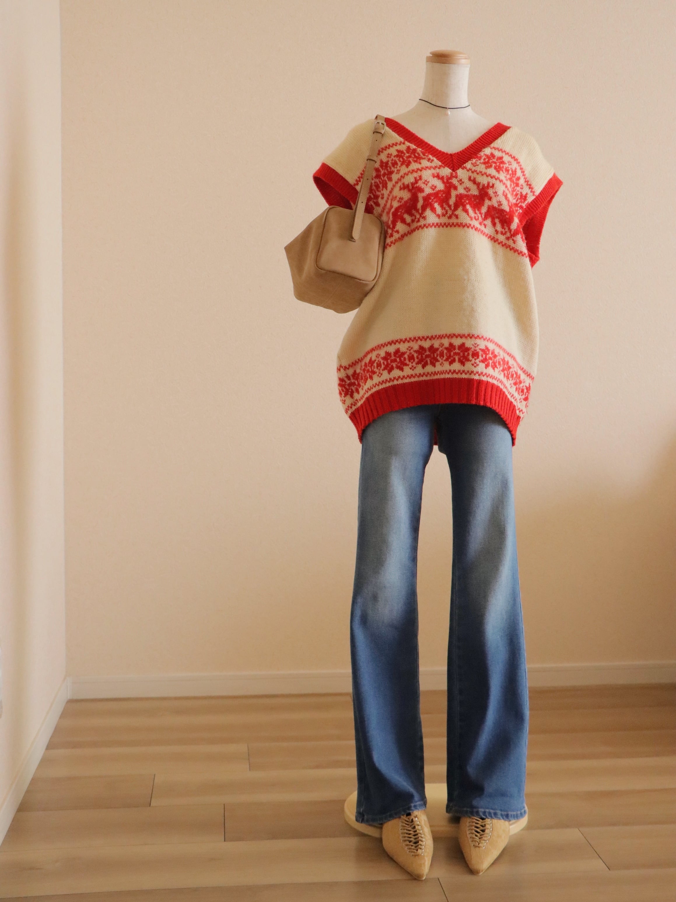 スタイリングの主役になってくれる配色が目を惹く、これからの季節にお勧めのニットベスト。