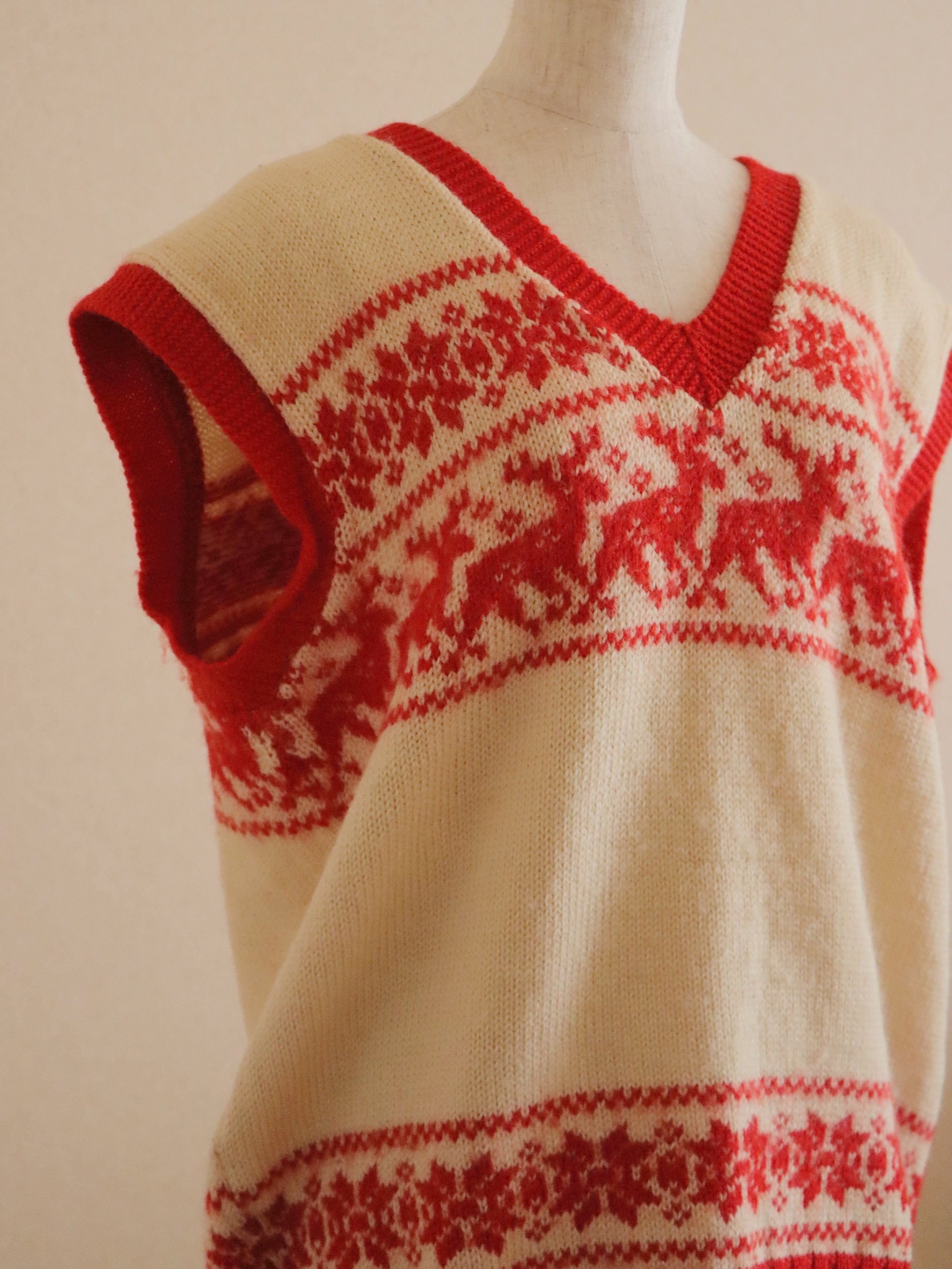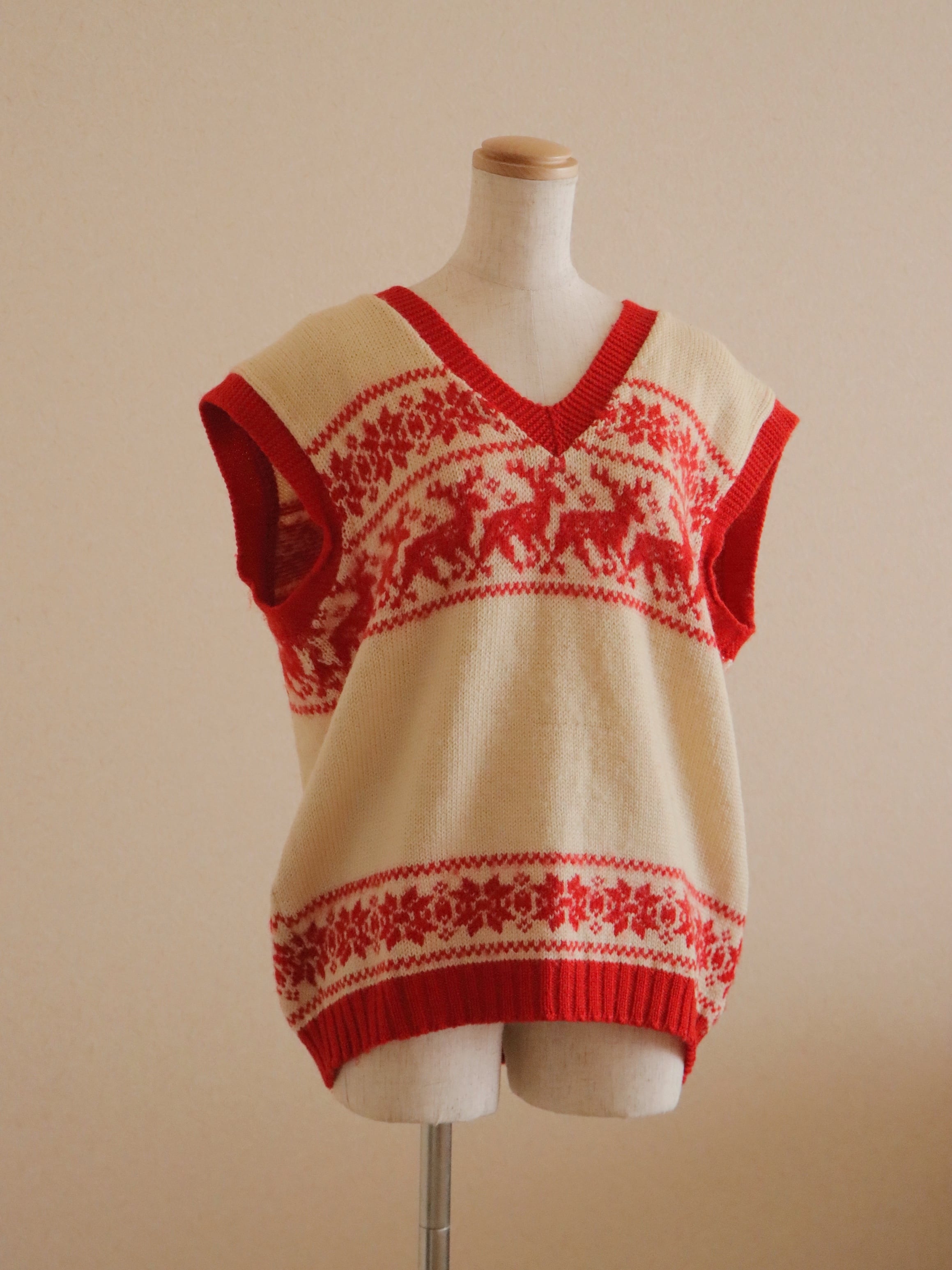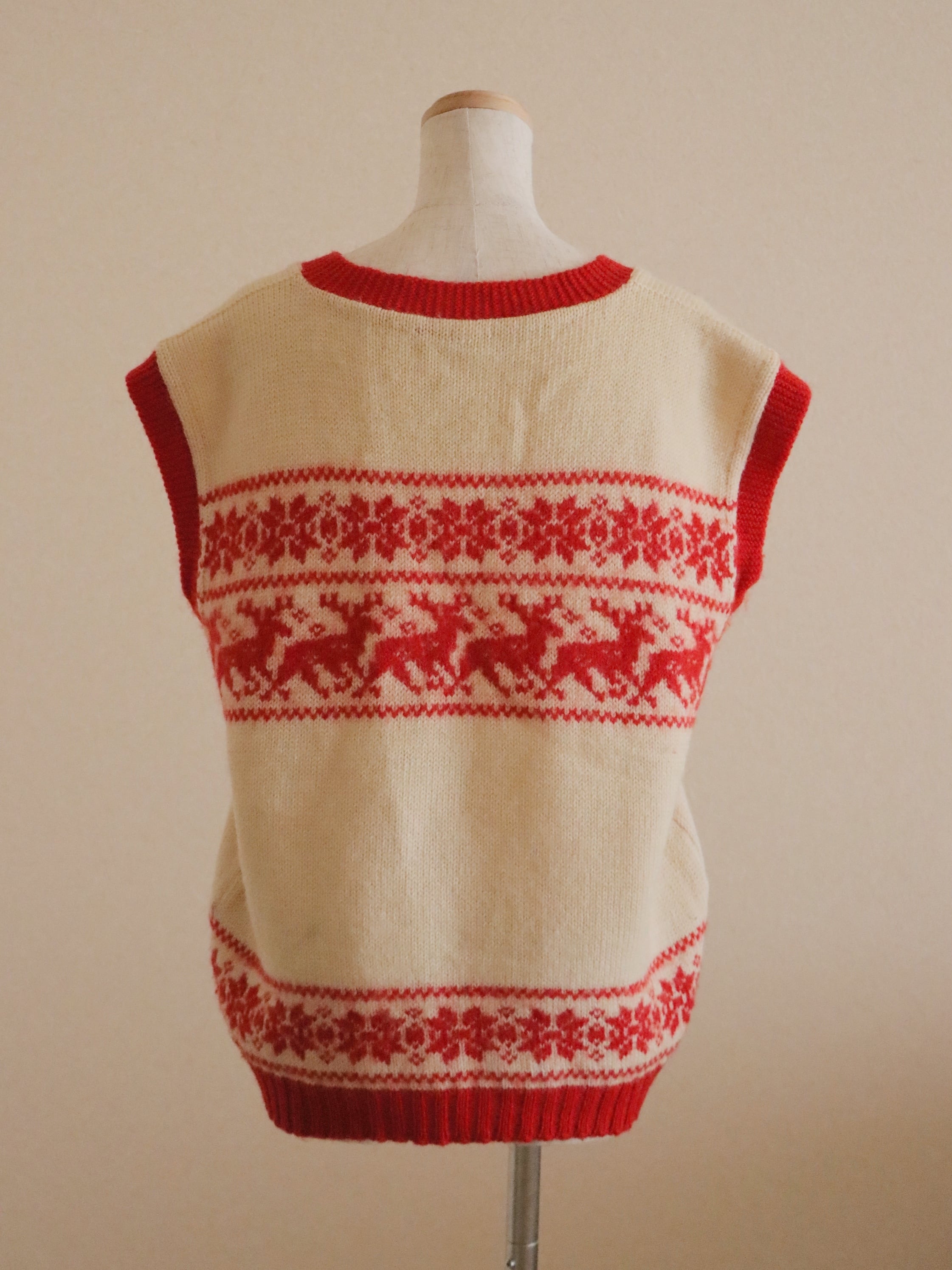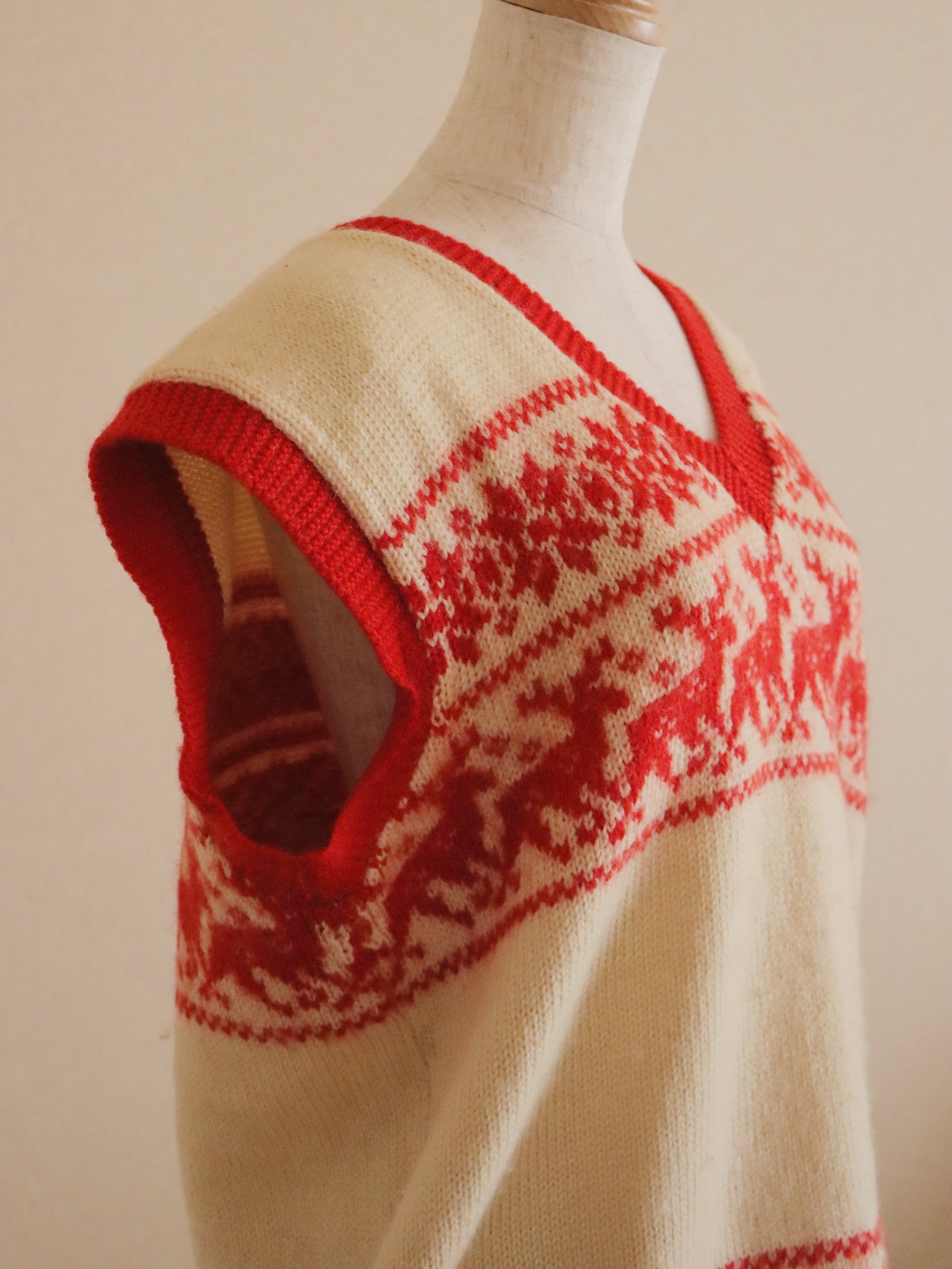 スタイリングの主役になってくれる配色が目を惹く、これからの季節にお勧めのニットベスト。