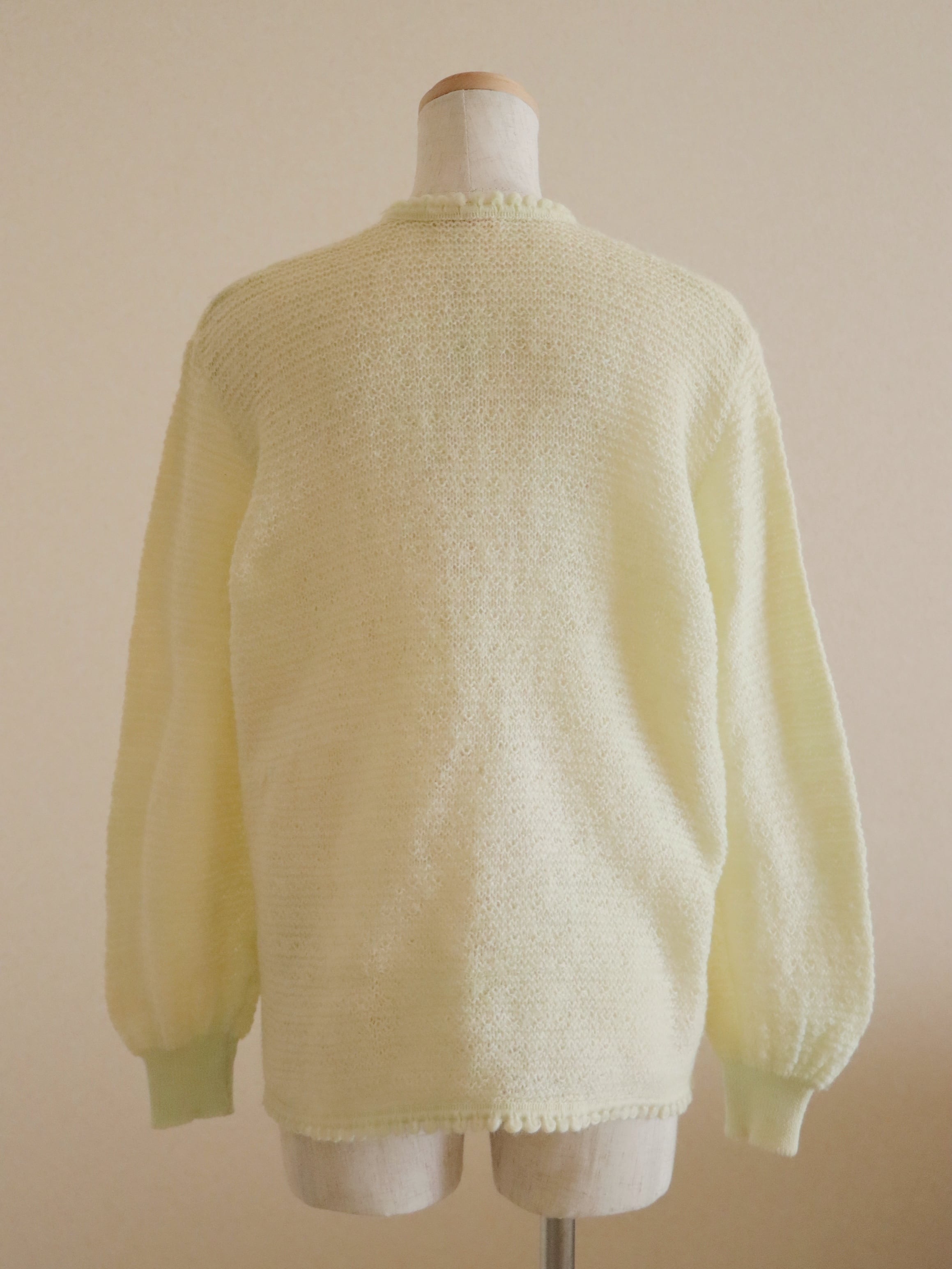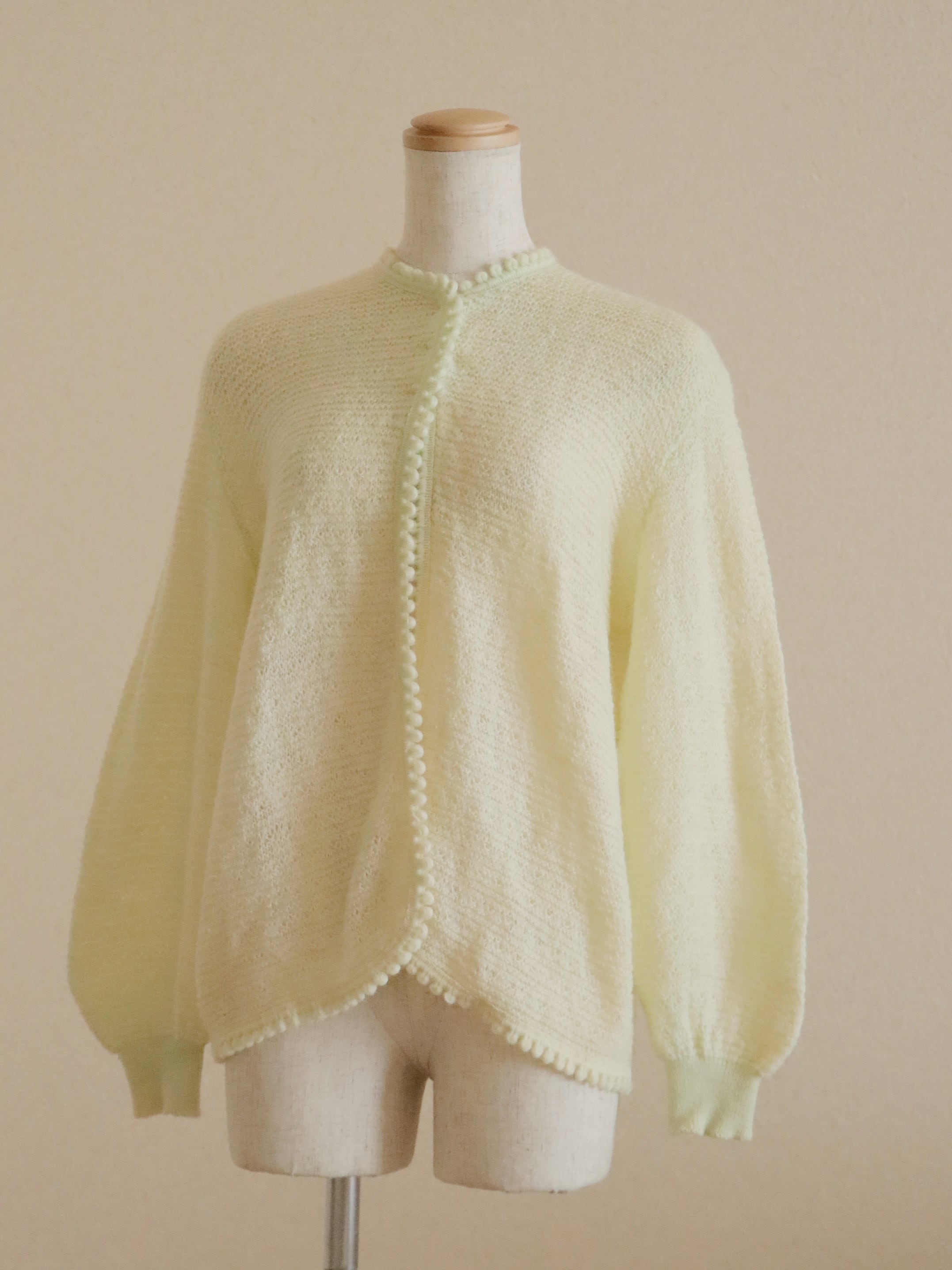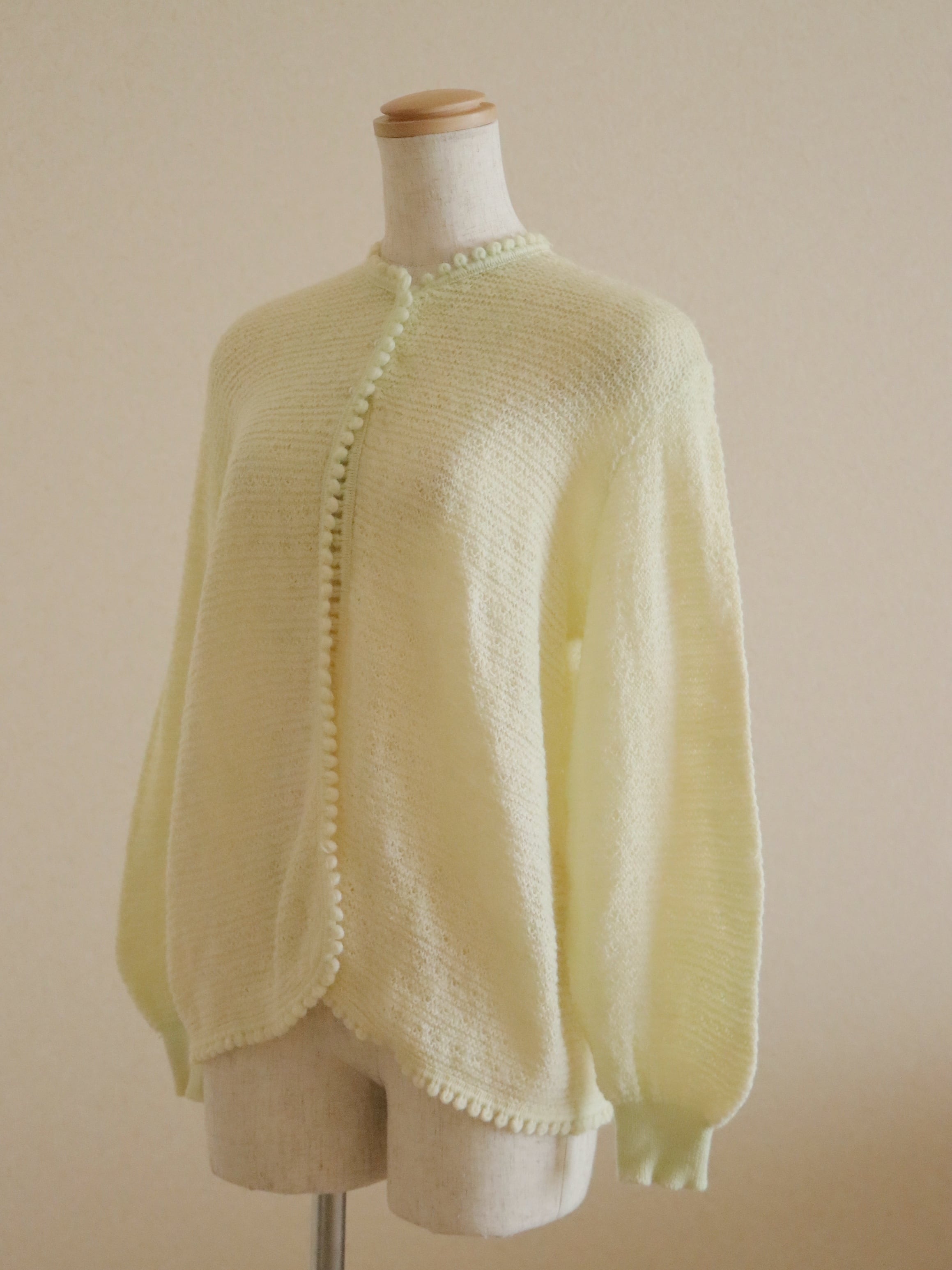 ライムグリーンイエロー系の淡く優しい色味が可愛い、これからの季節にお勧めのニットカーディガン。