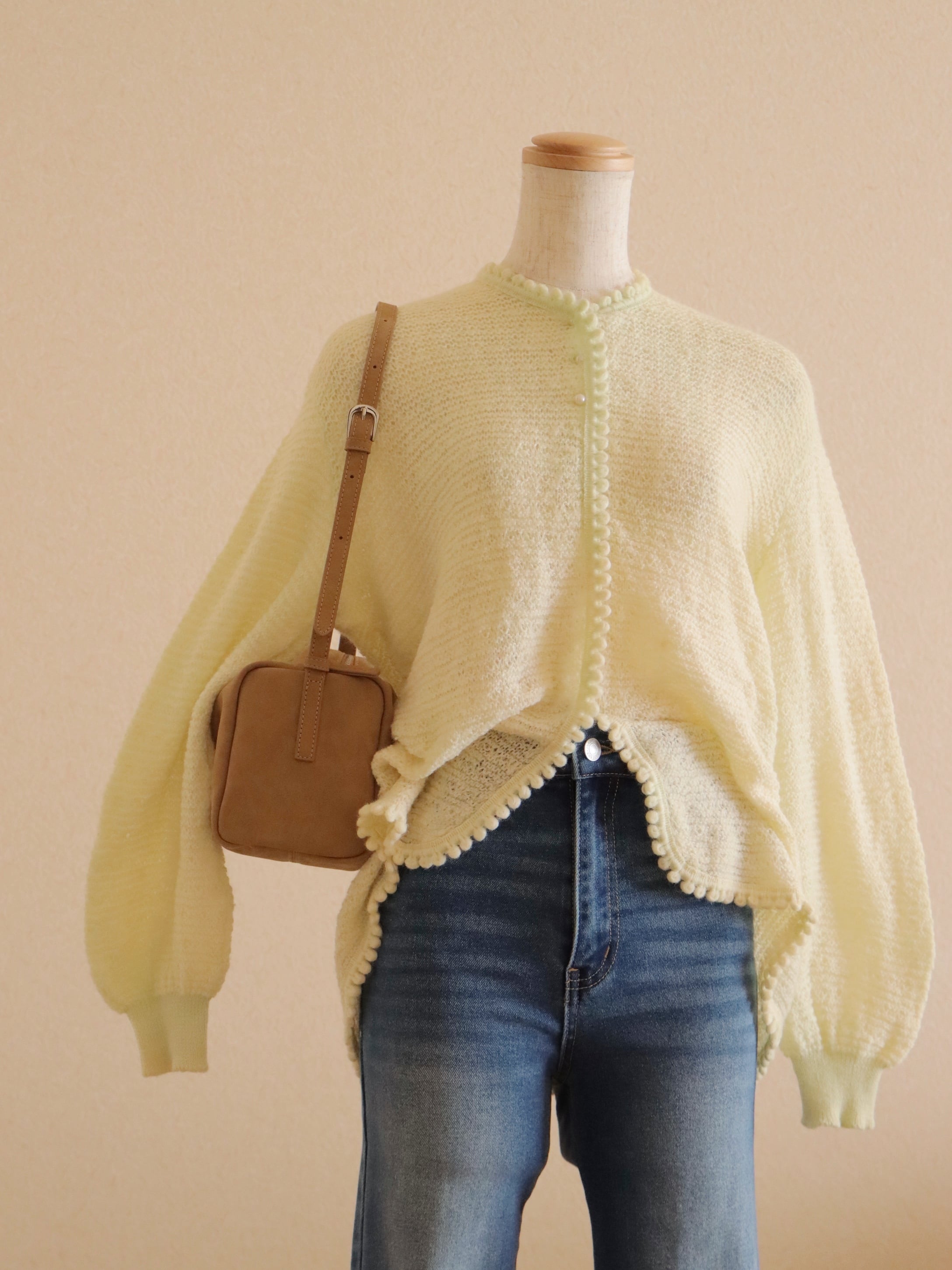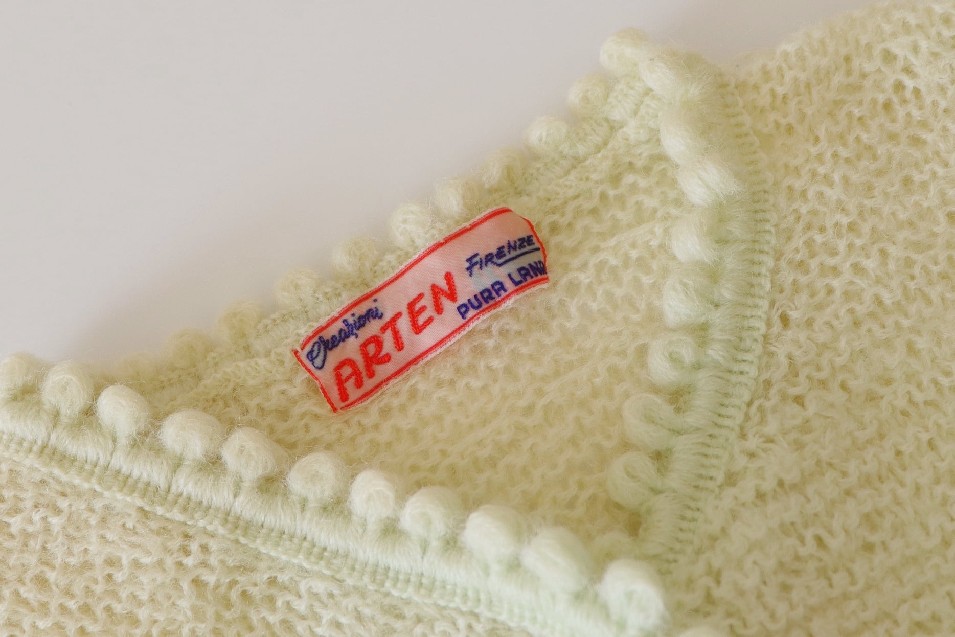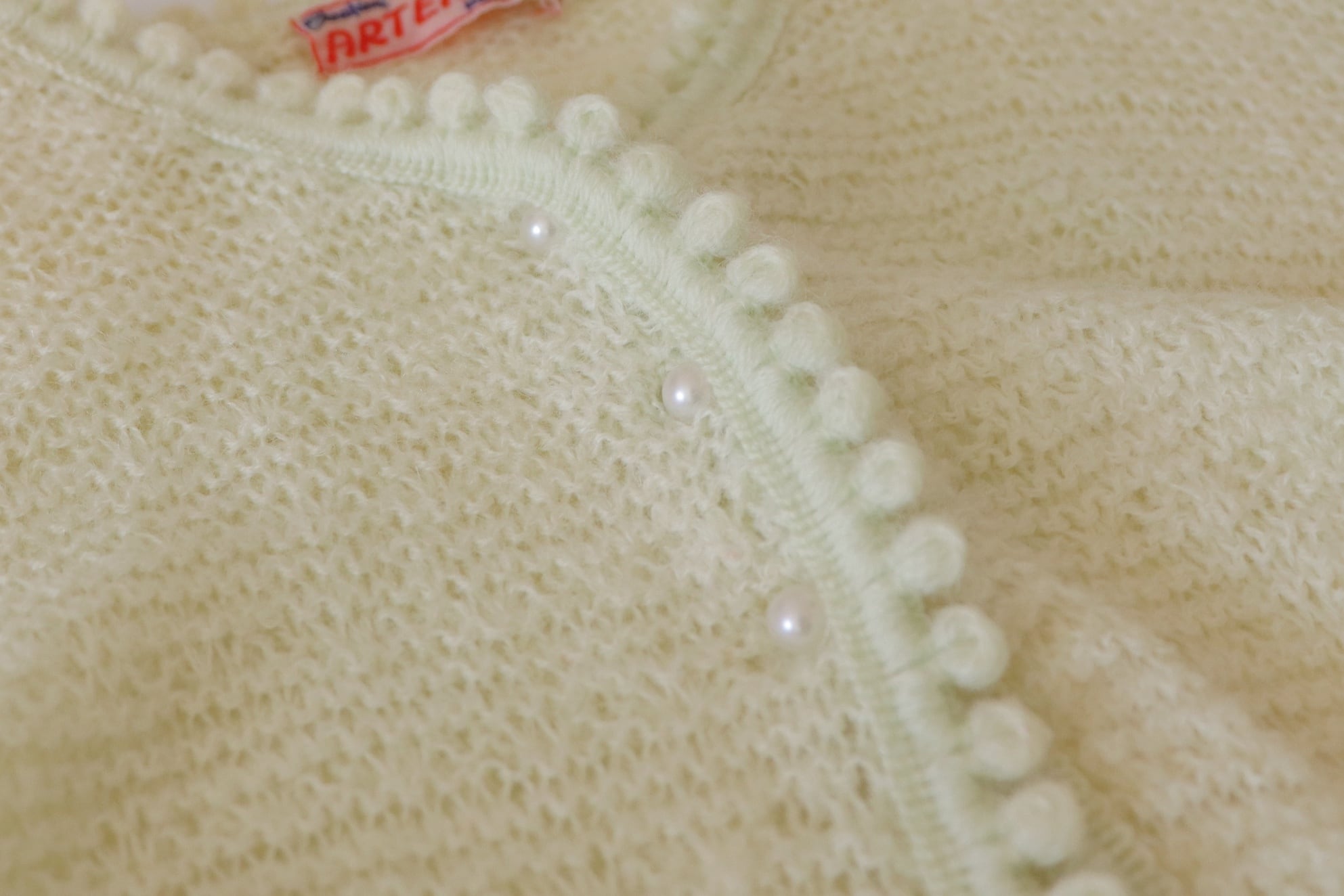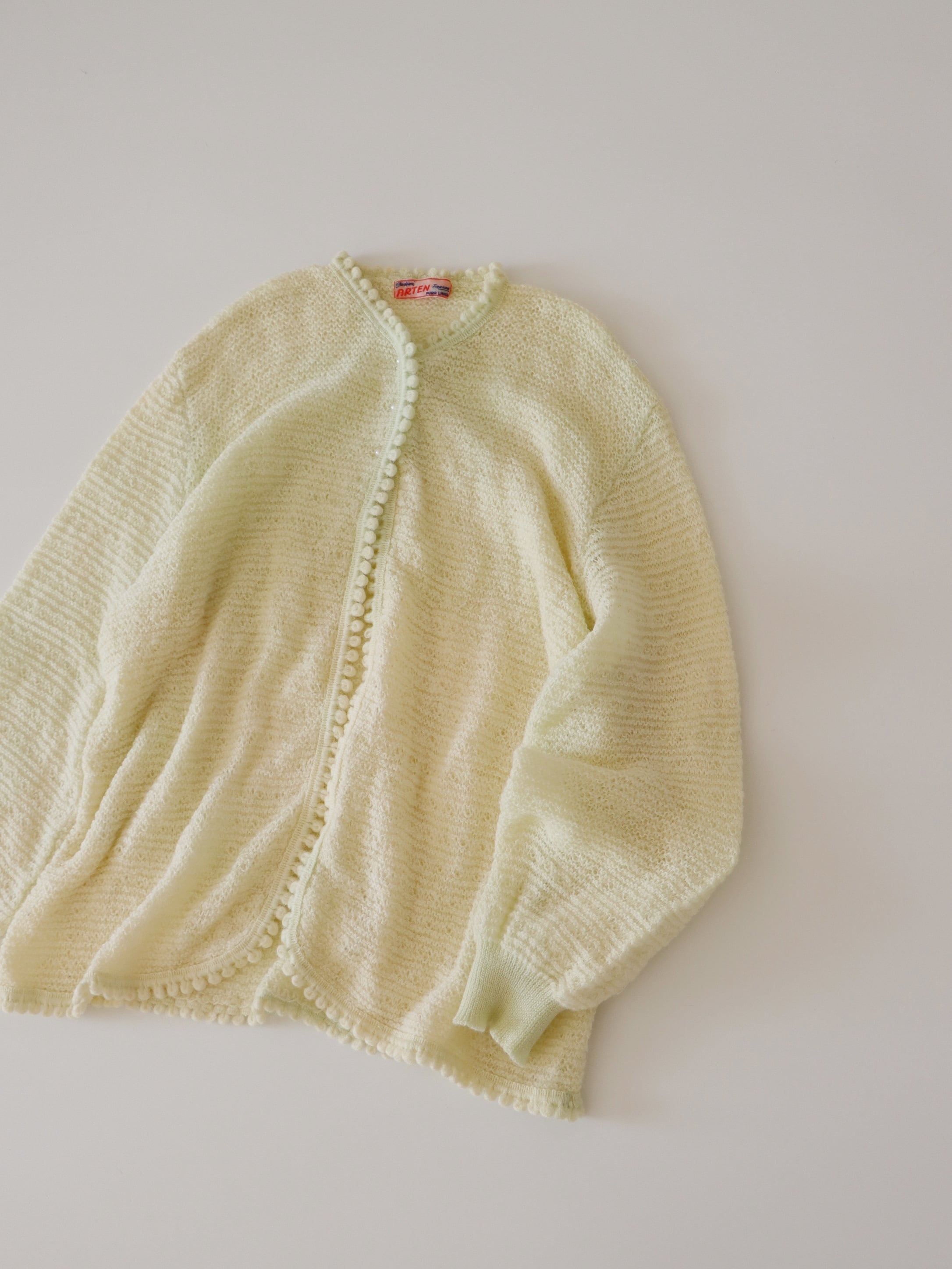 ライムグリーンイエロー系の淡く優しい色味が可愛い、これからの季節にお勧めのニットカーディガン。