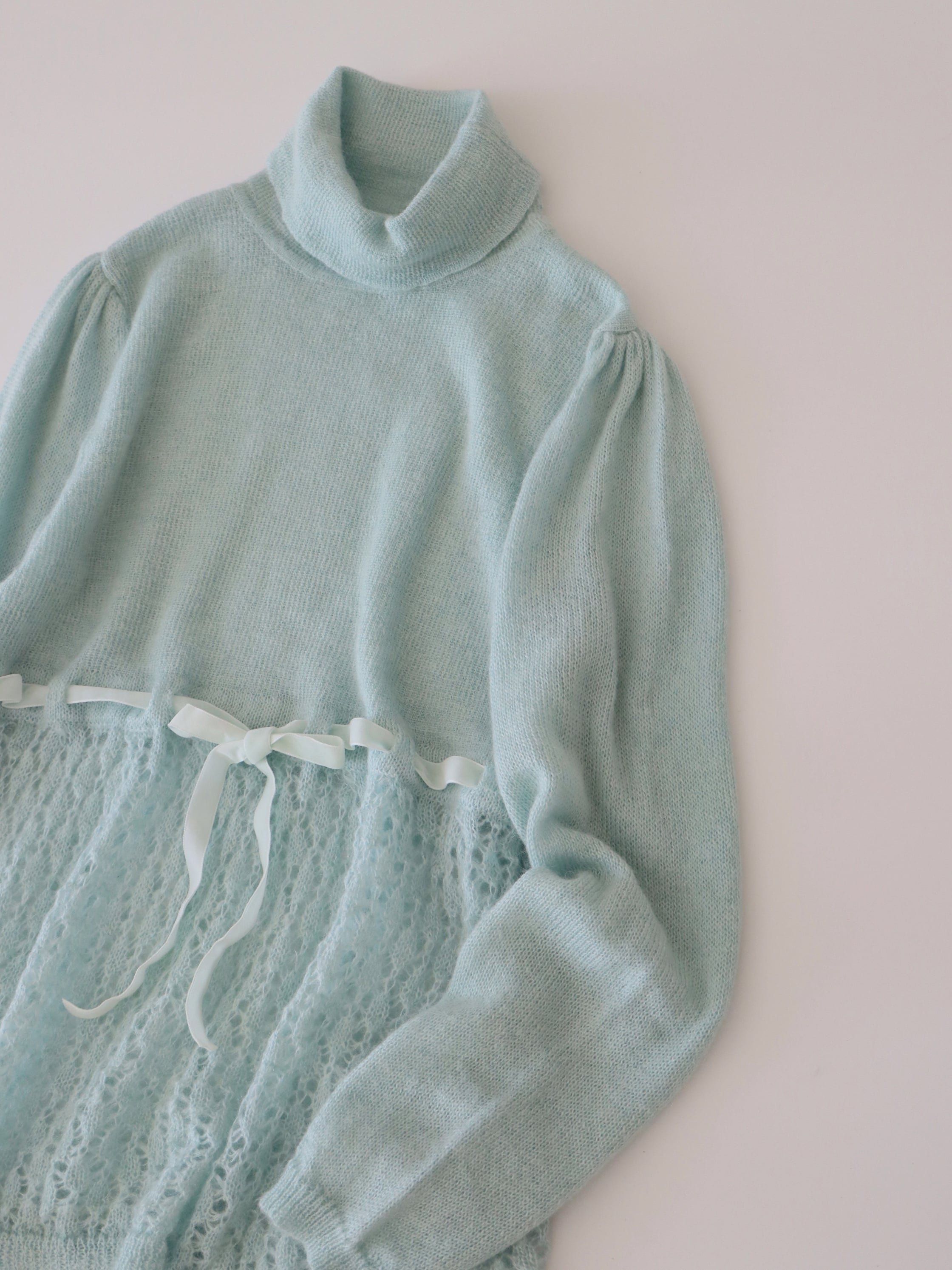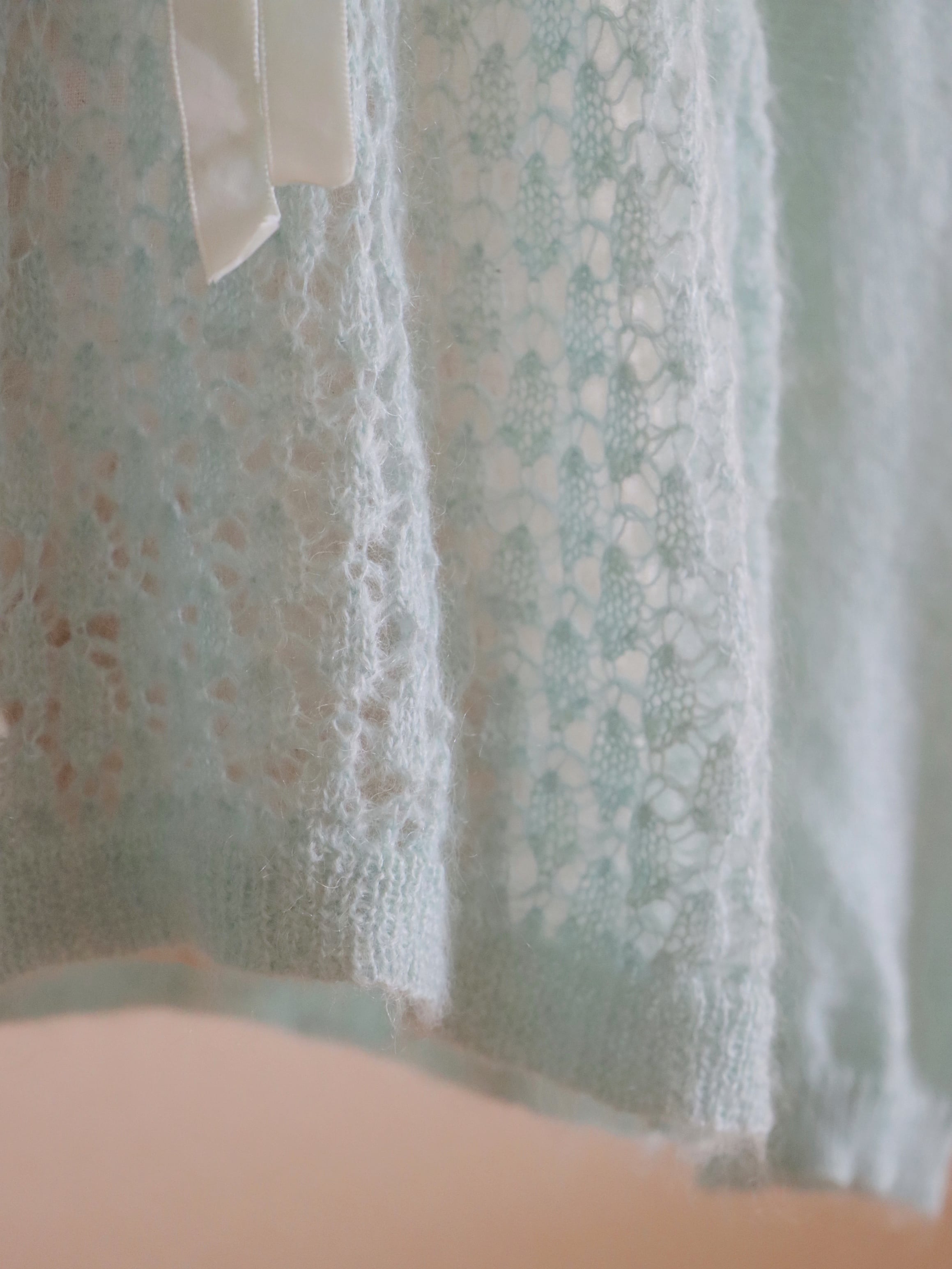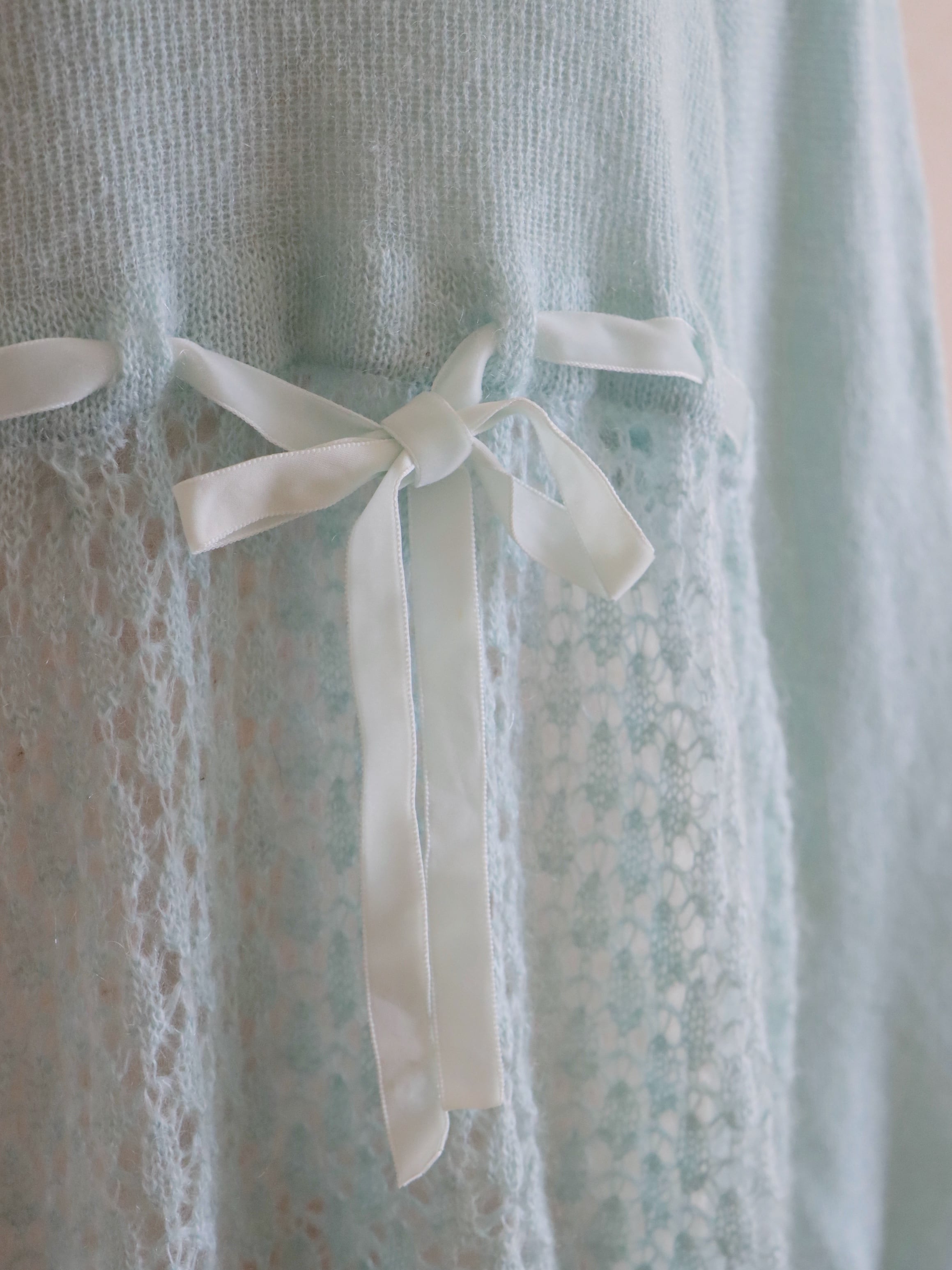 淡く優しい色味に、繊細に編まれたかぎ針編みとウエストのベロアリボンがアクセントになった、大人の上品さ溢れる1着です。