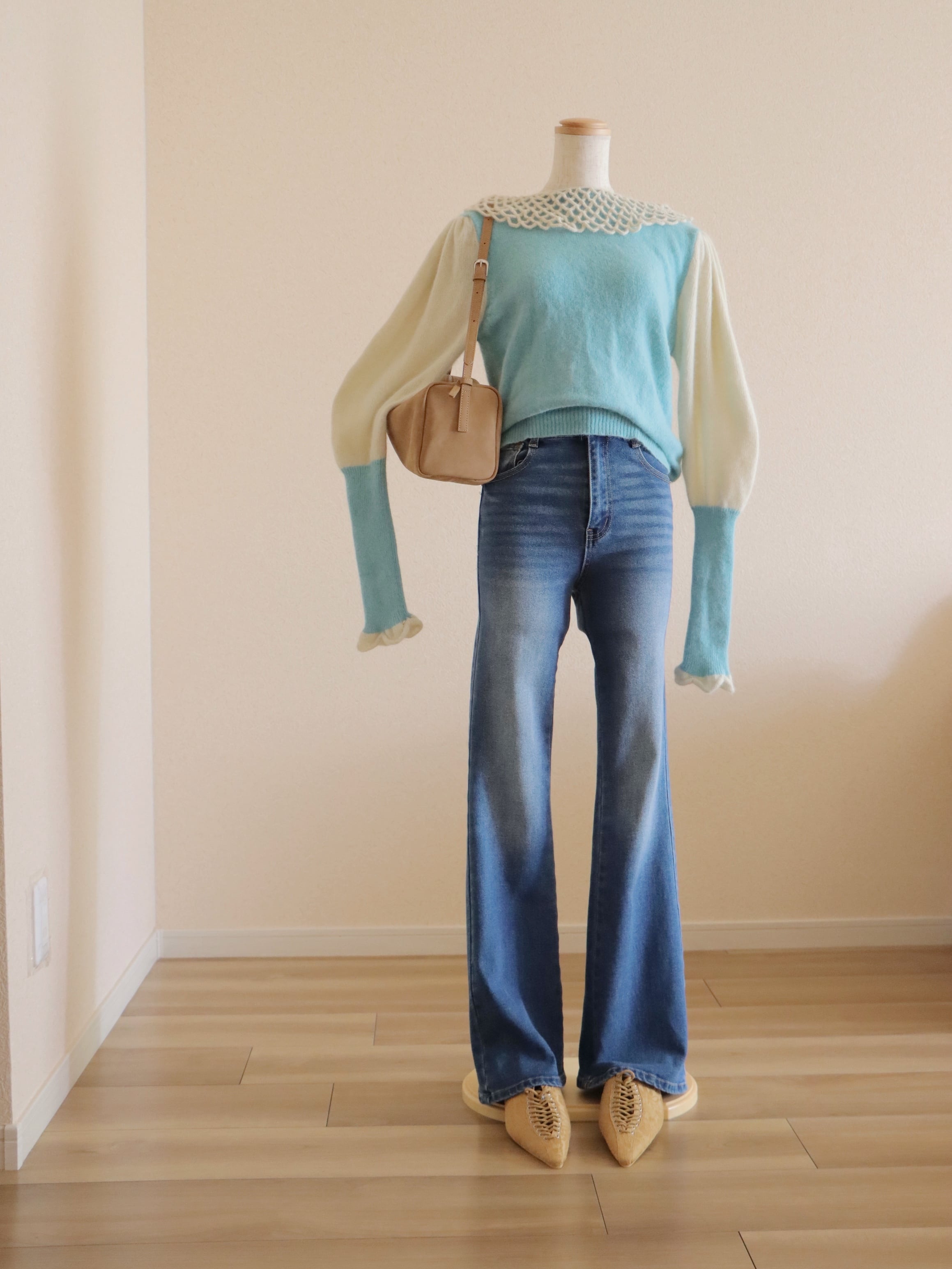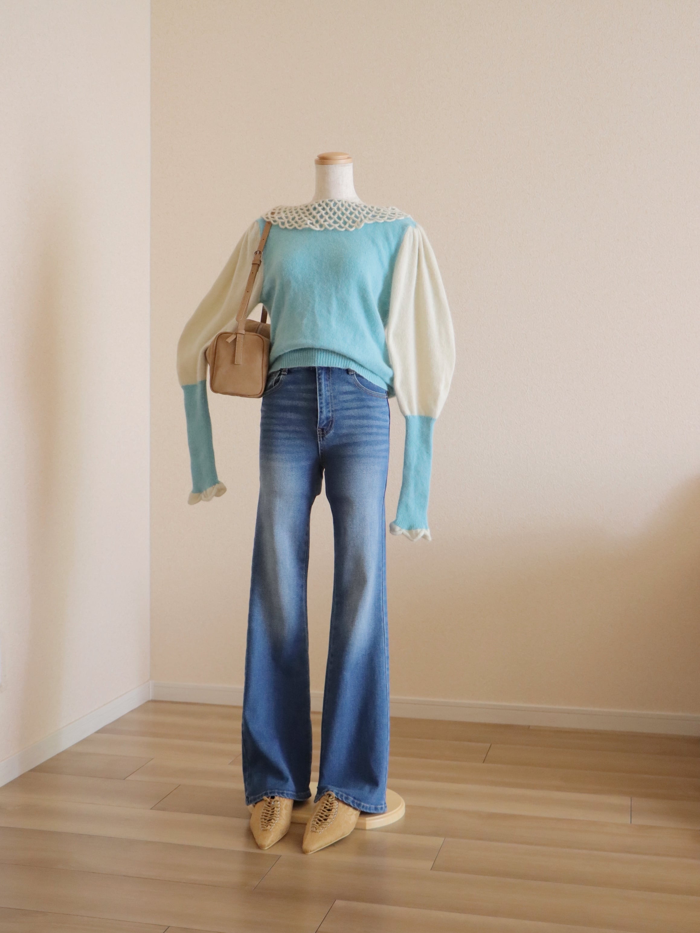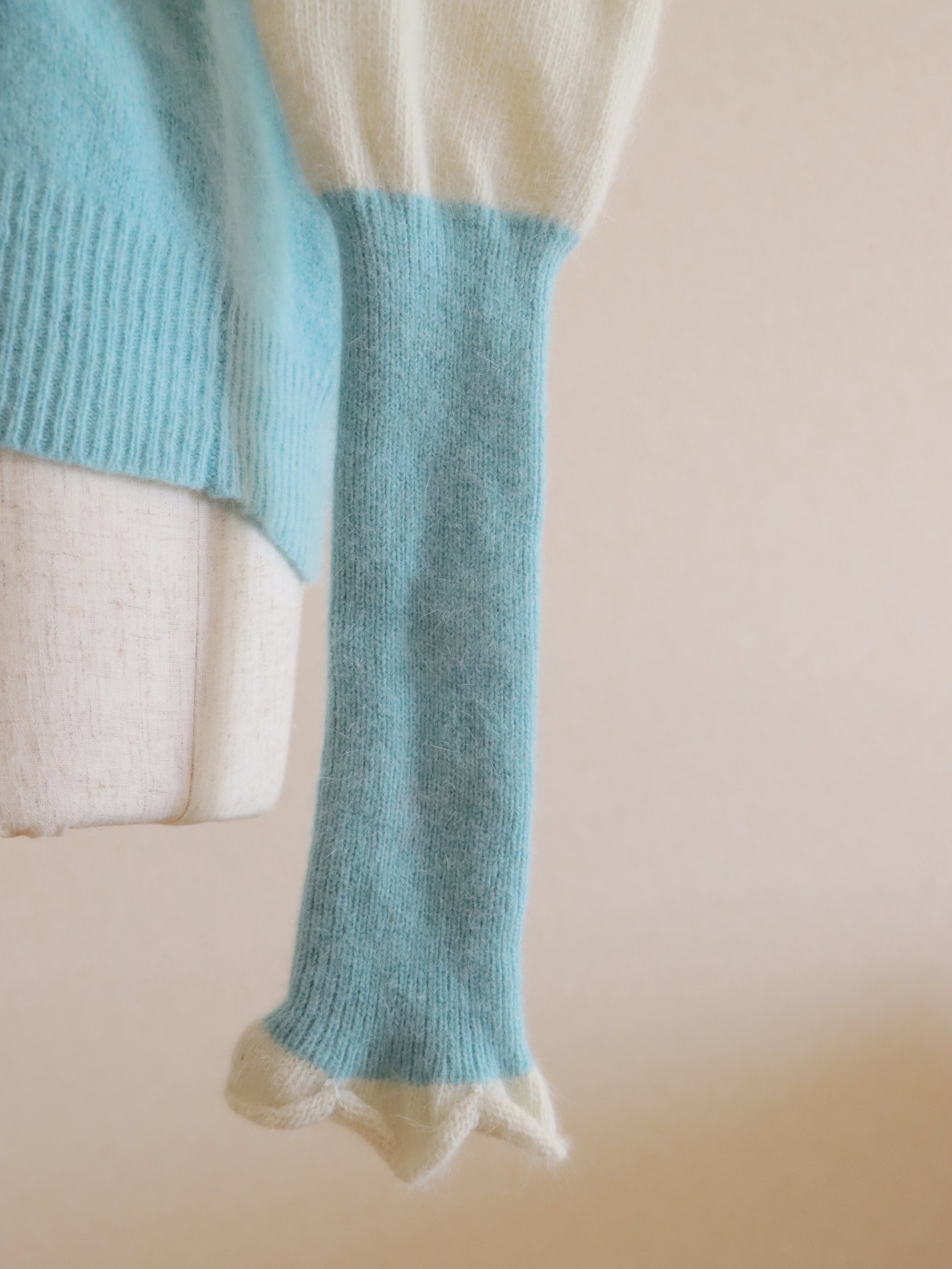 柔らかなアンゴラ素材が着心地良く、優しい配色にふんわりとした立体的なお袖が可愛い1着です。