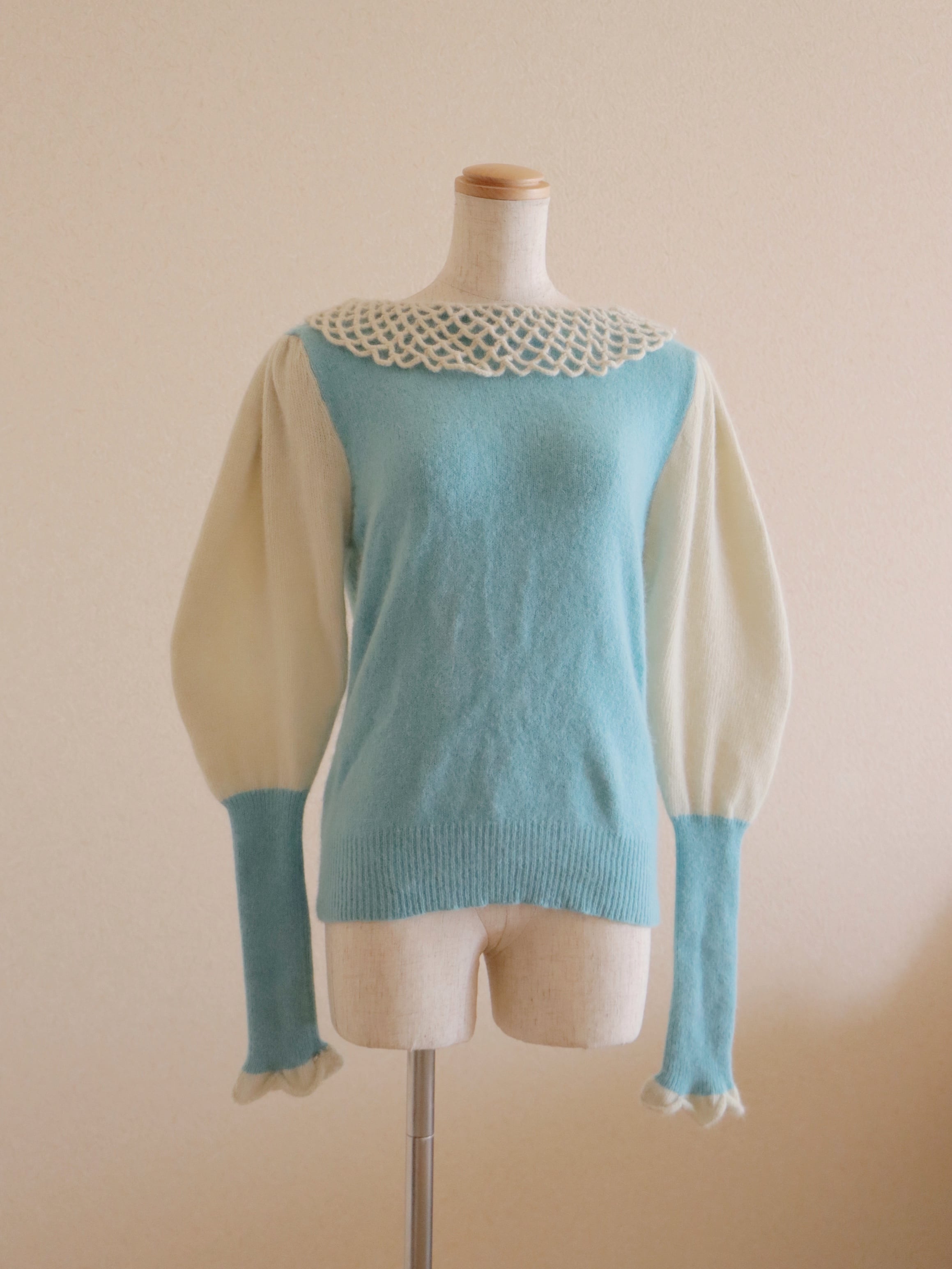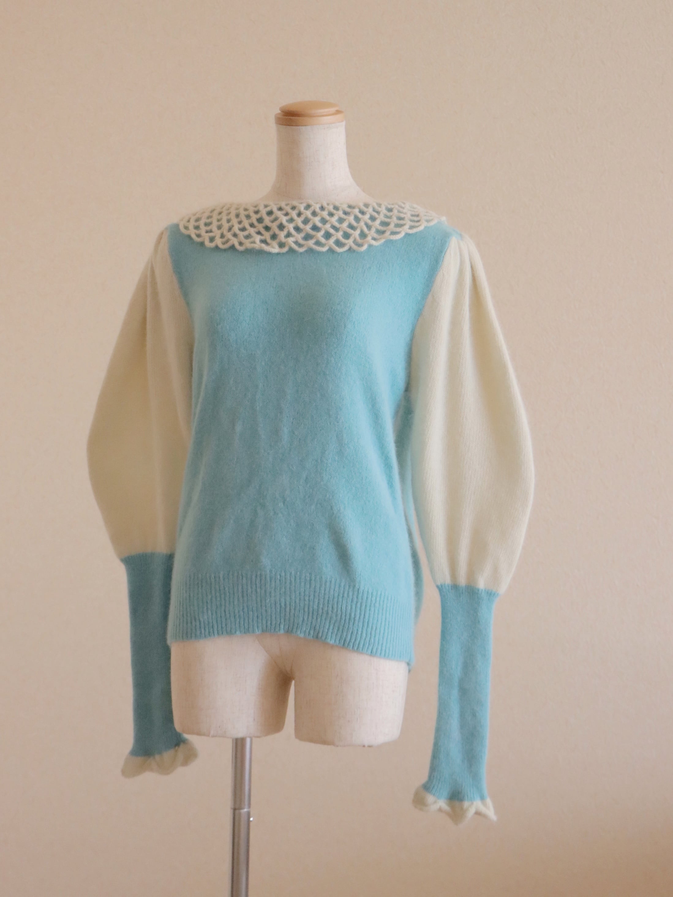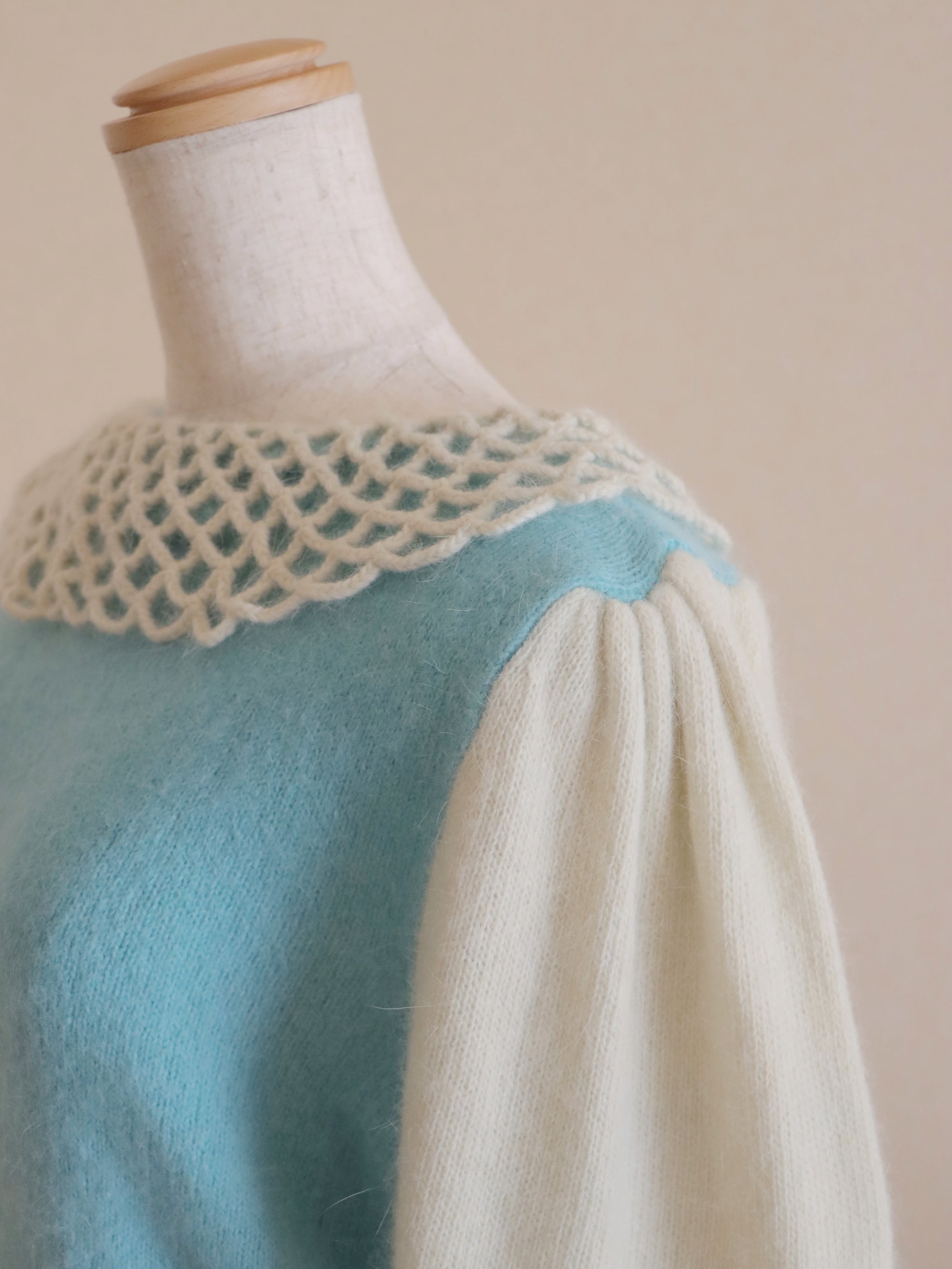 ●crochet lace collared Angora puff sleeve knitted top(blue& white).