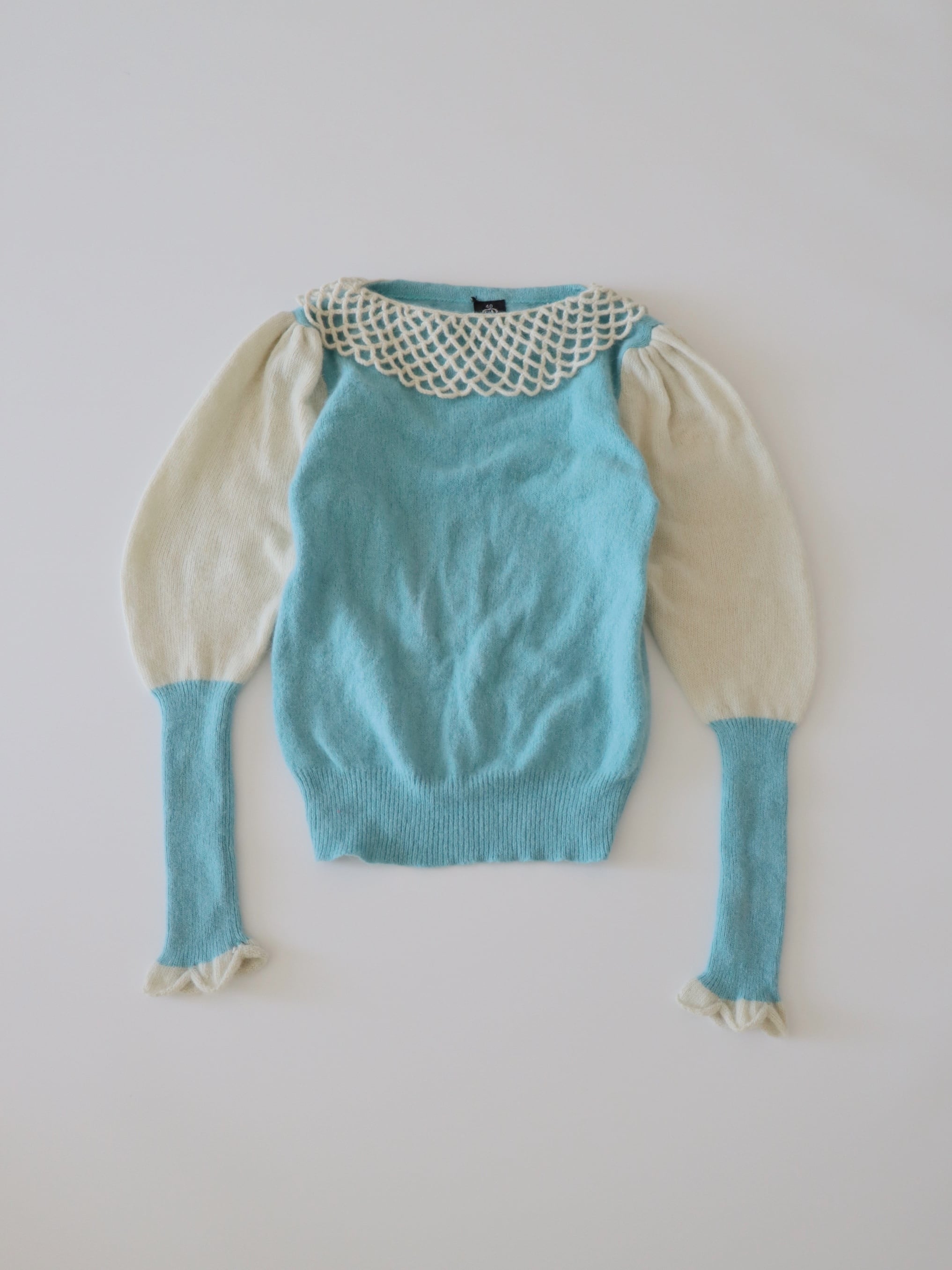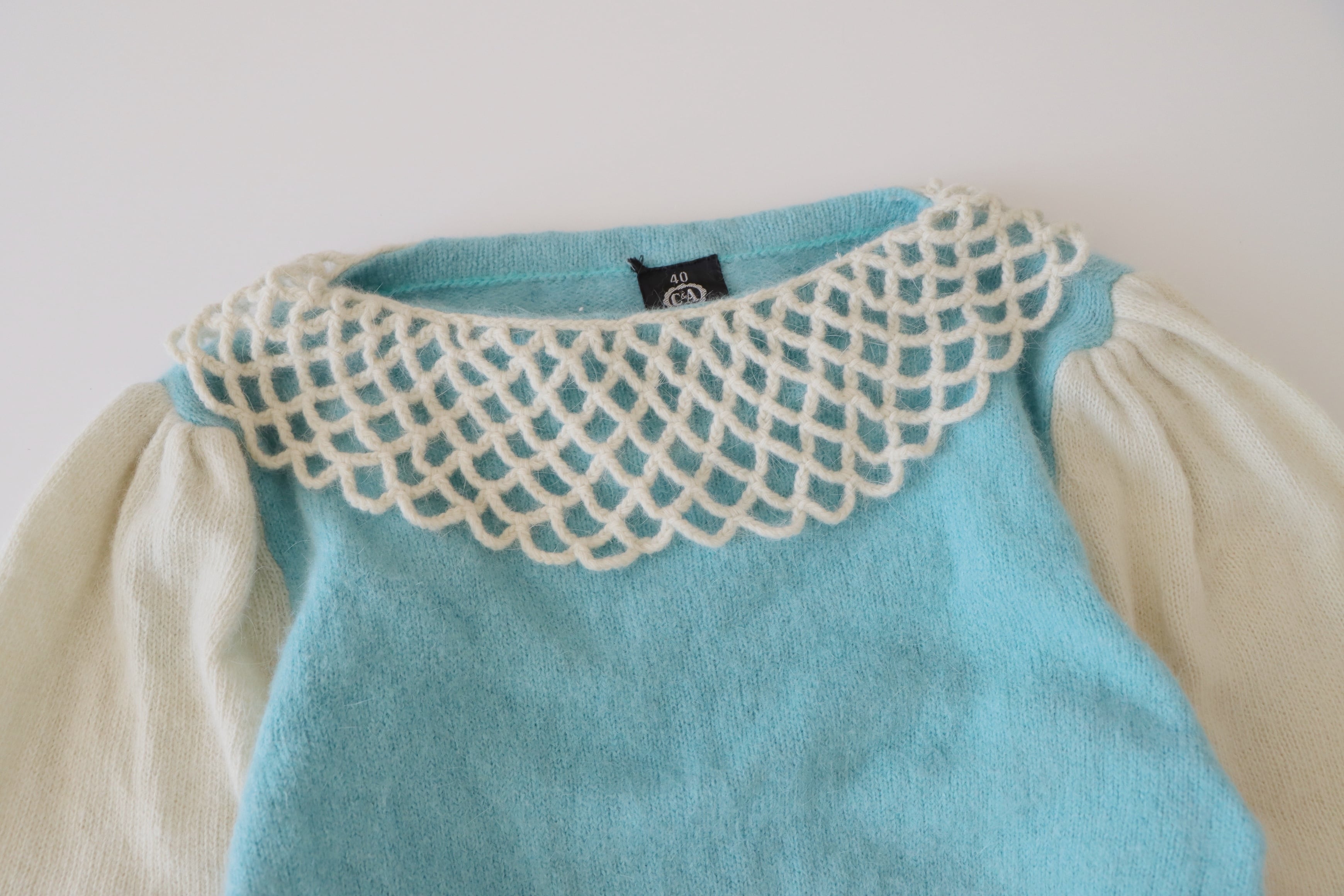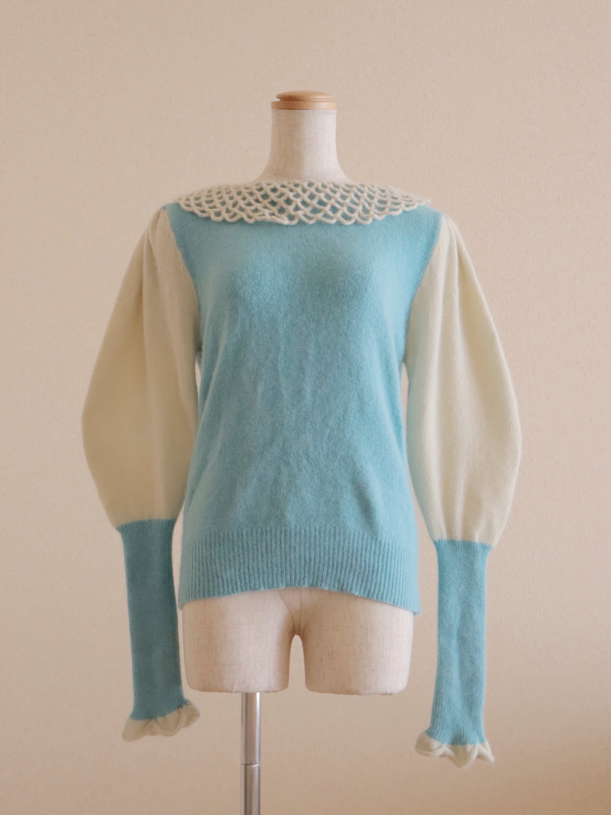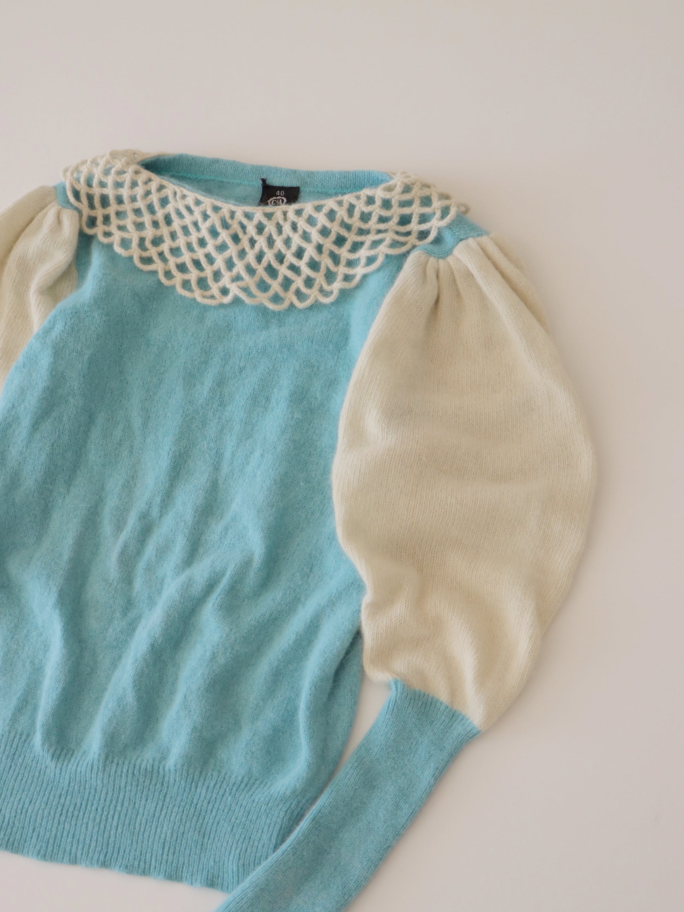 ●crochet lace collared Angora puff sleeve knitted top(blue& white).