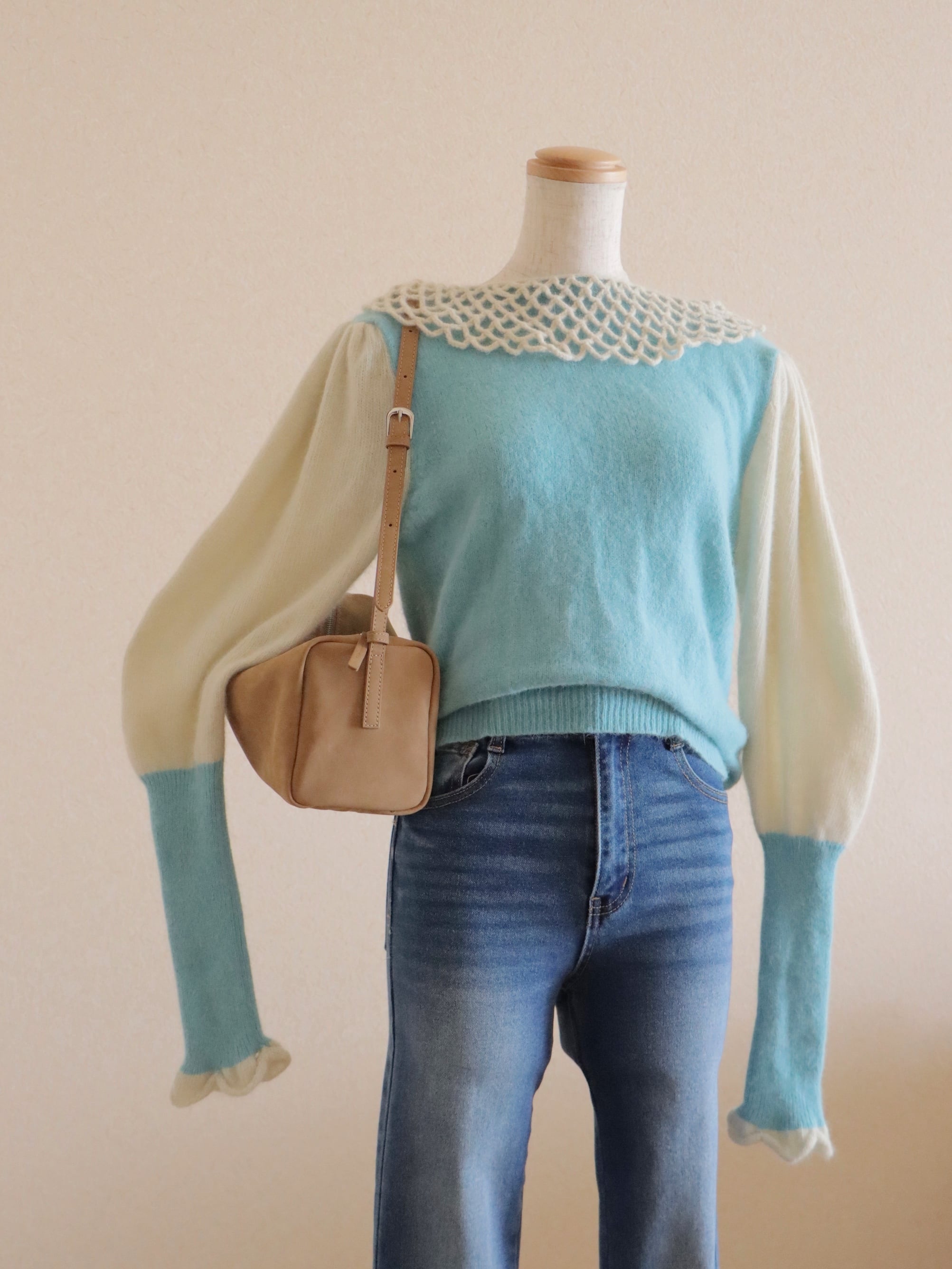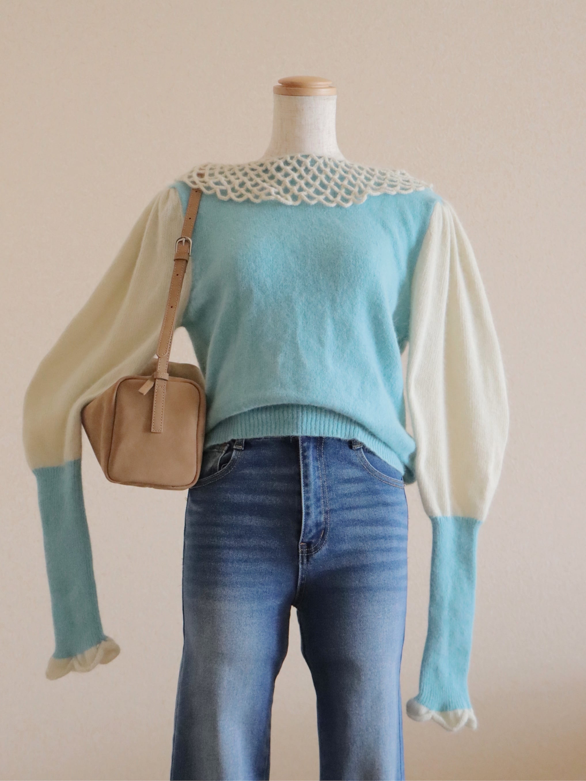 ●crochet lace collared Angora puff sleeve knitted top(blue& white)