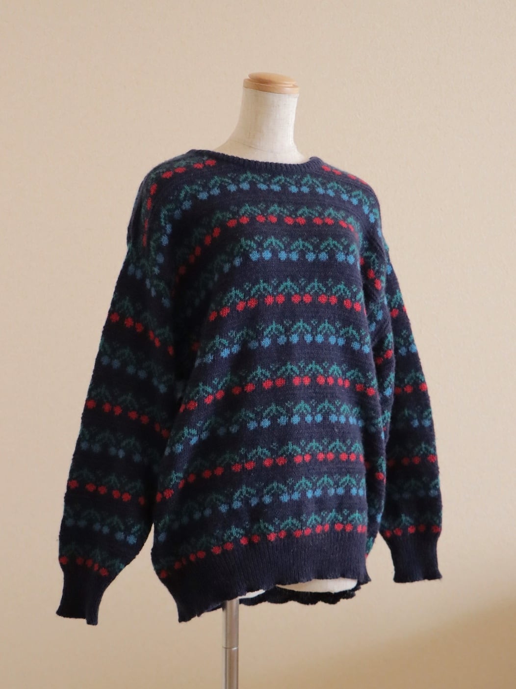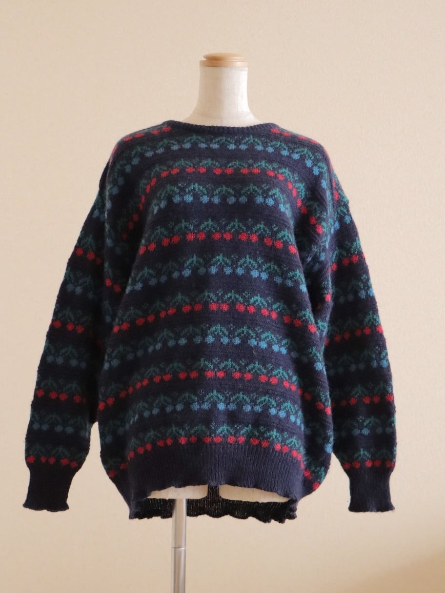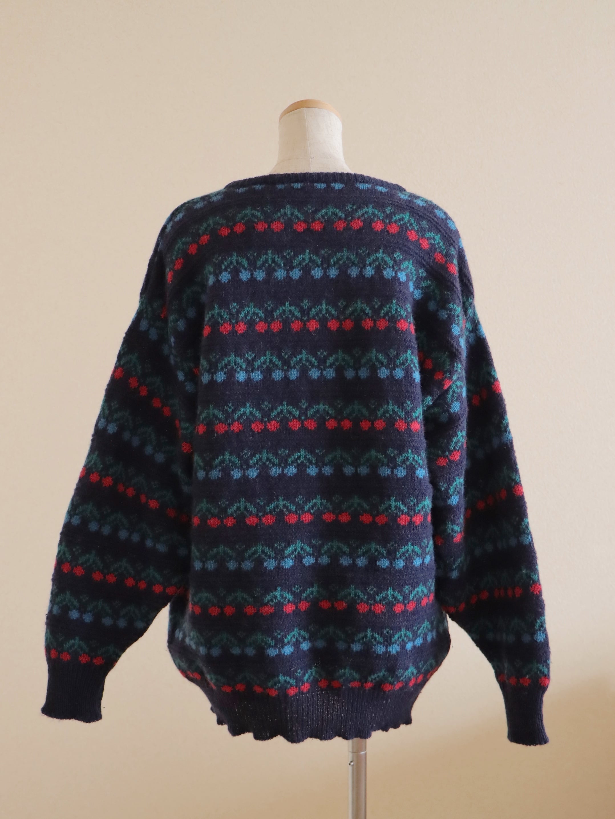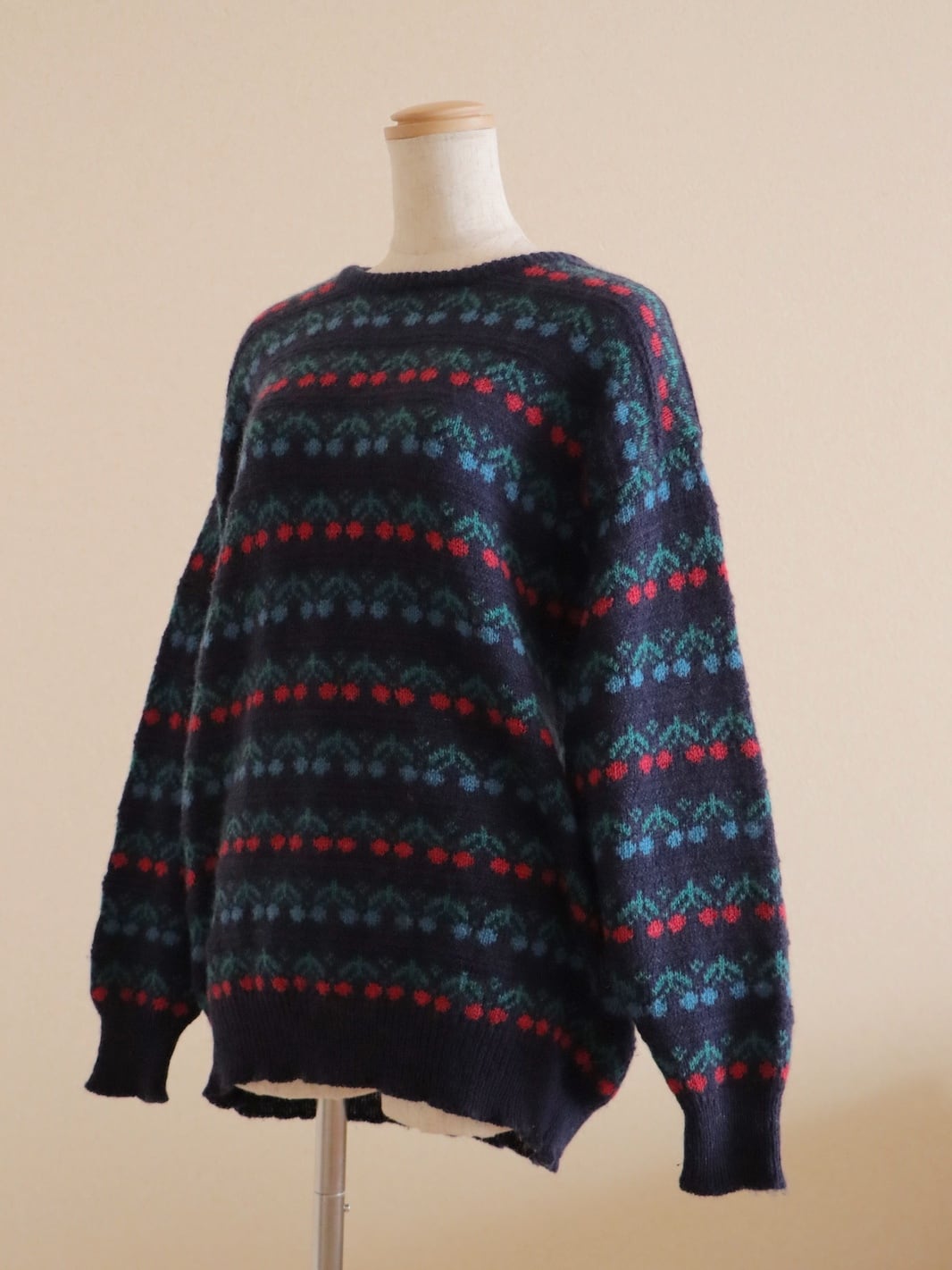 ●LAURA ASHLEY made in Scotland cherry jacquard fair isle wool sweater(navy)