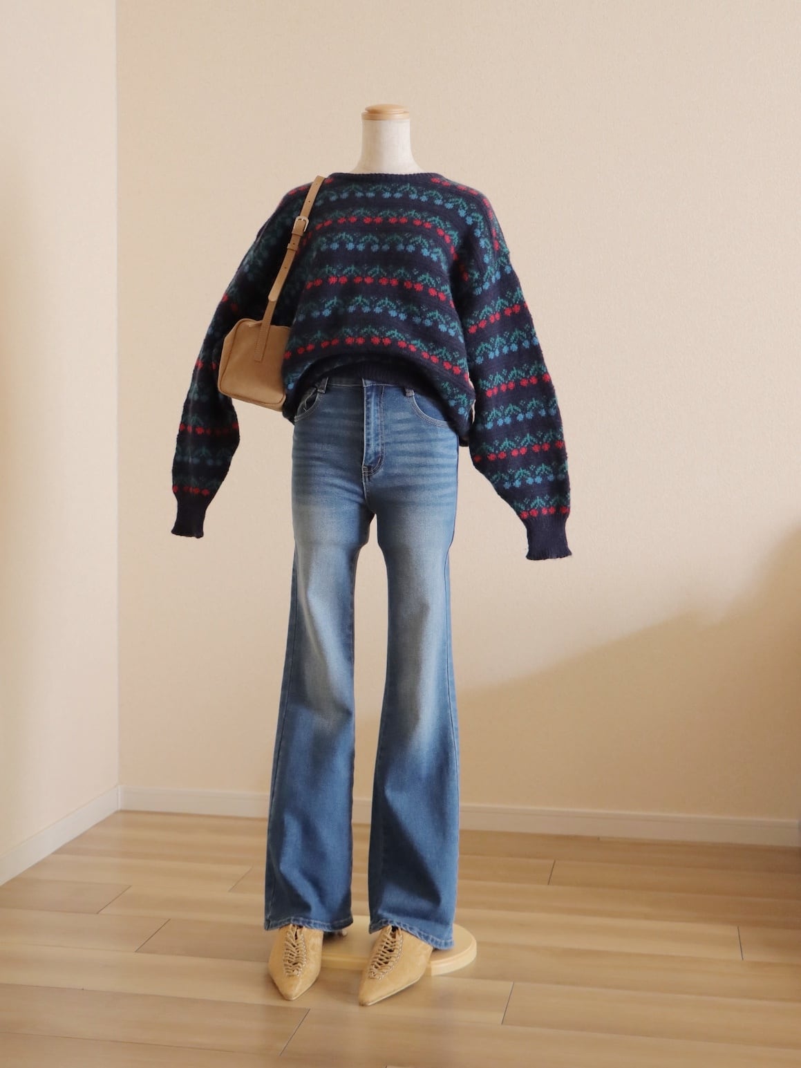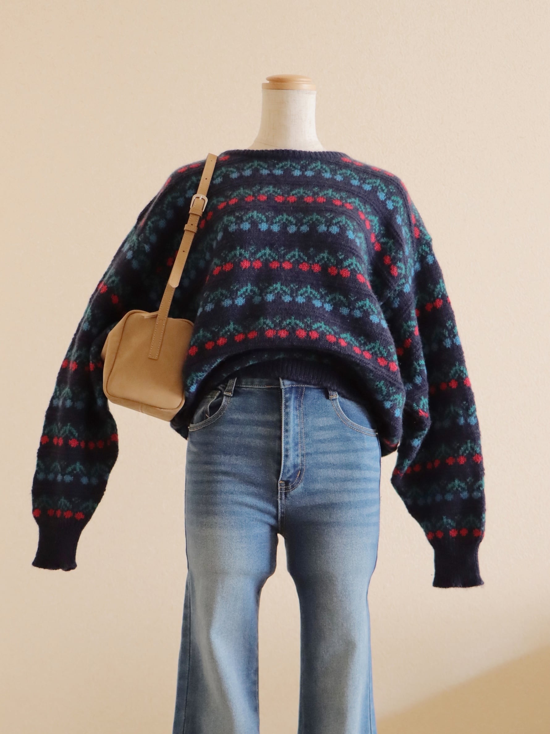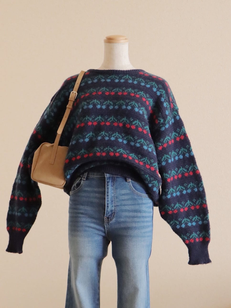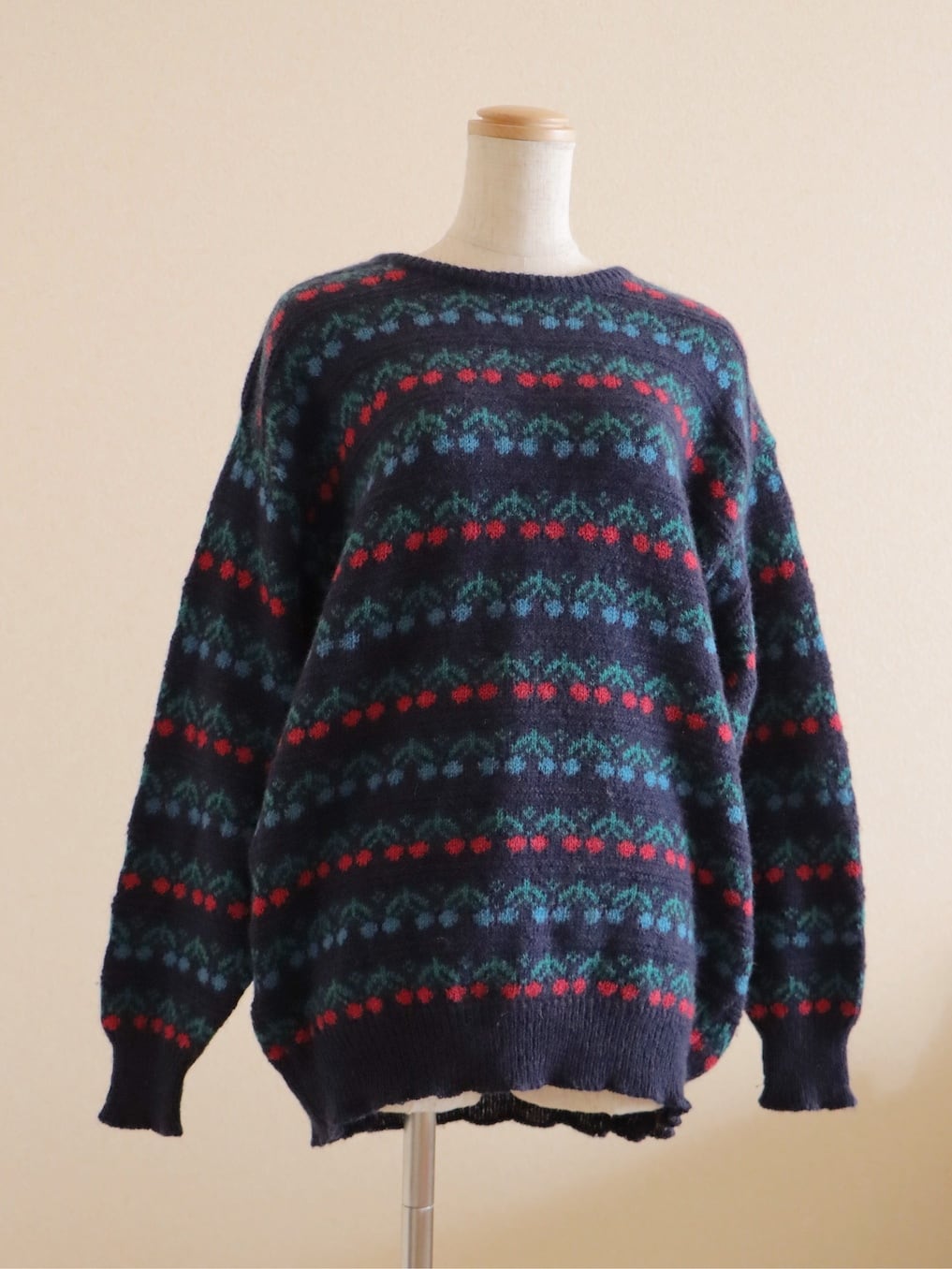 ●LAURA ASHLEY made in Scotland cherry jacquard fair isle wool sweater(navy)