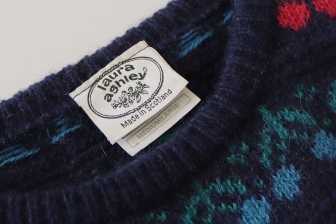 ●LAURA ASHLEY made in Scotland cherry jacquard fair isle wool sweater(navy).