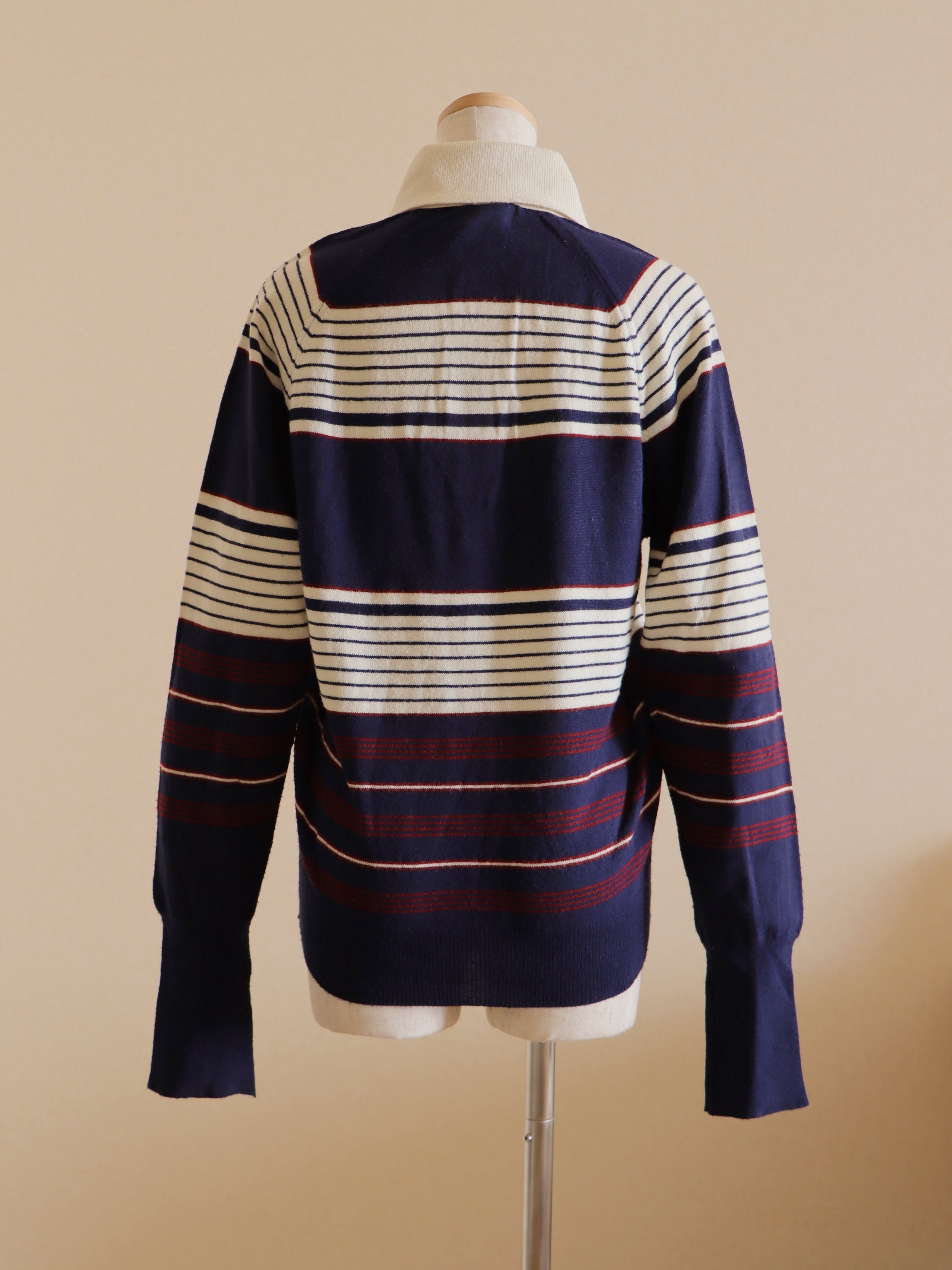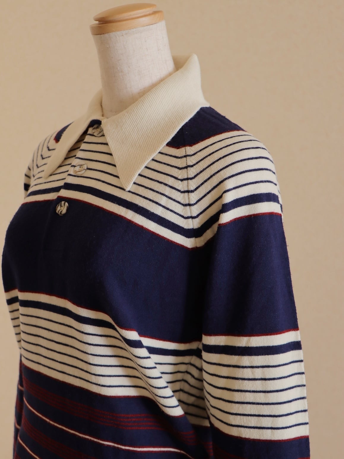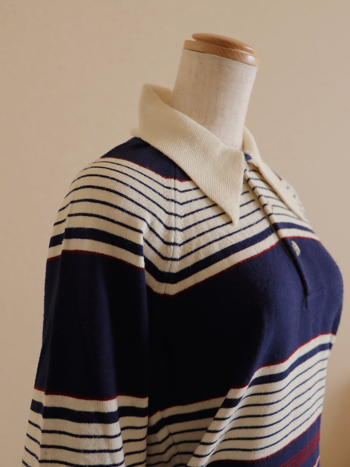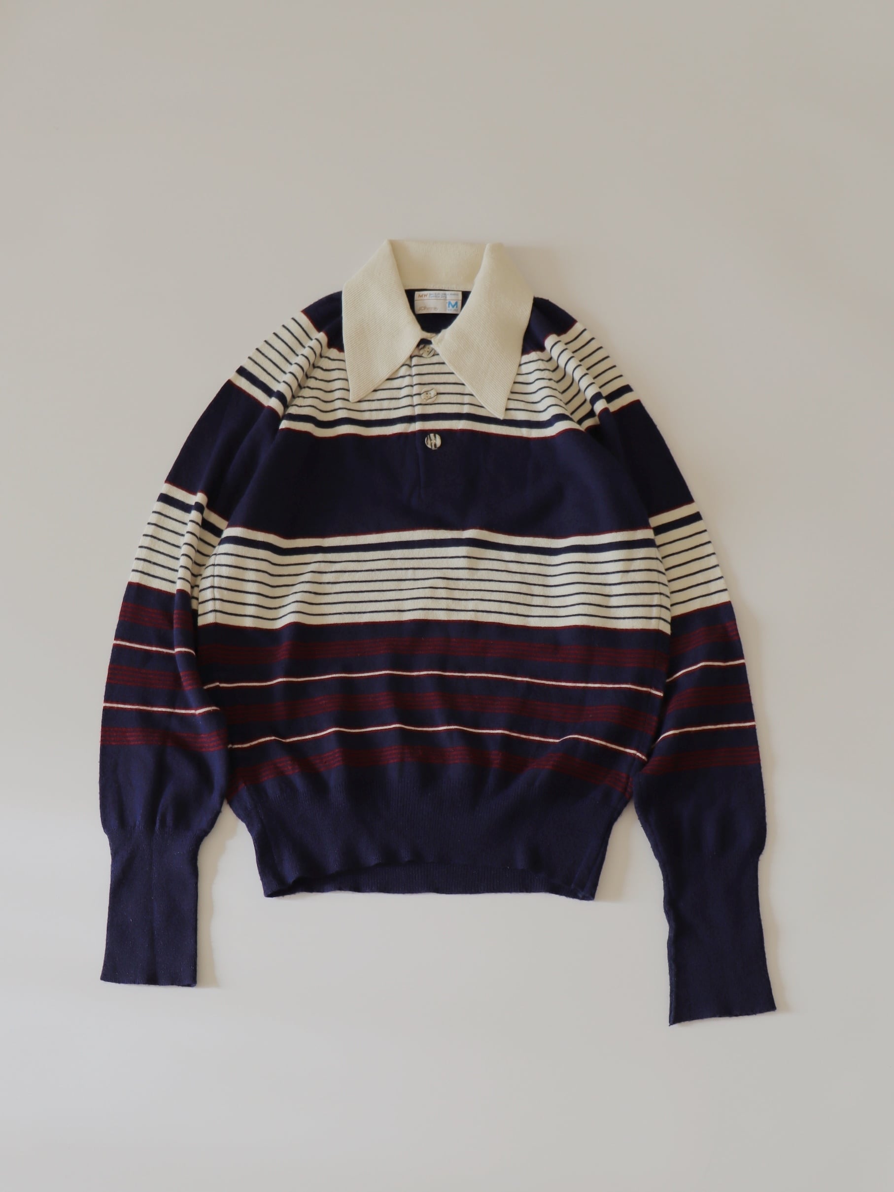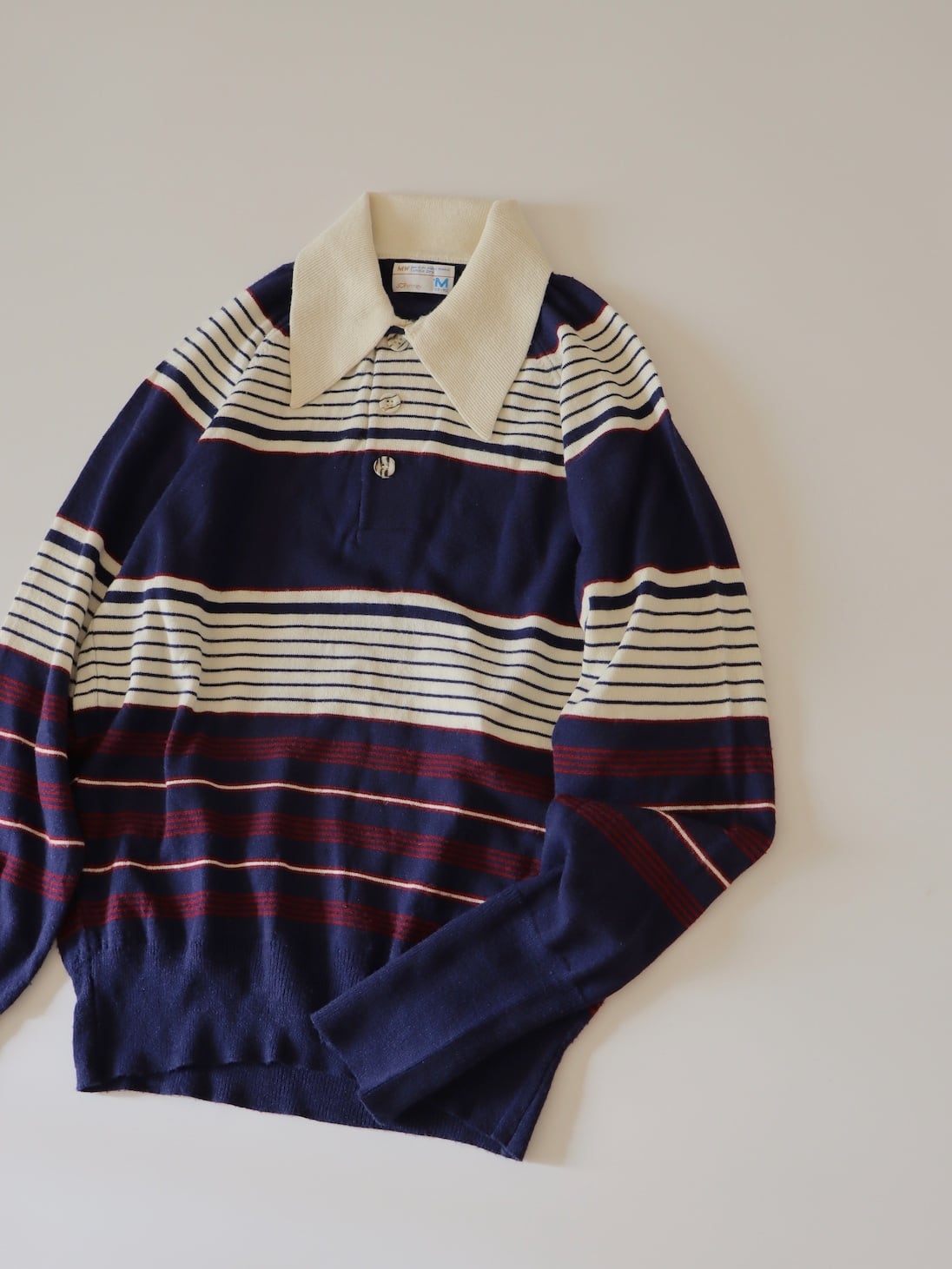 ●70s collared wool design navy & ivory color striped knitted sweater.