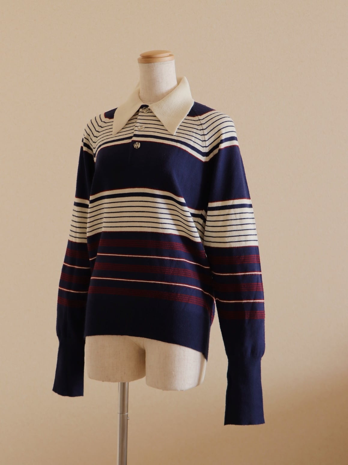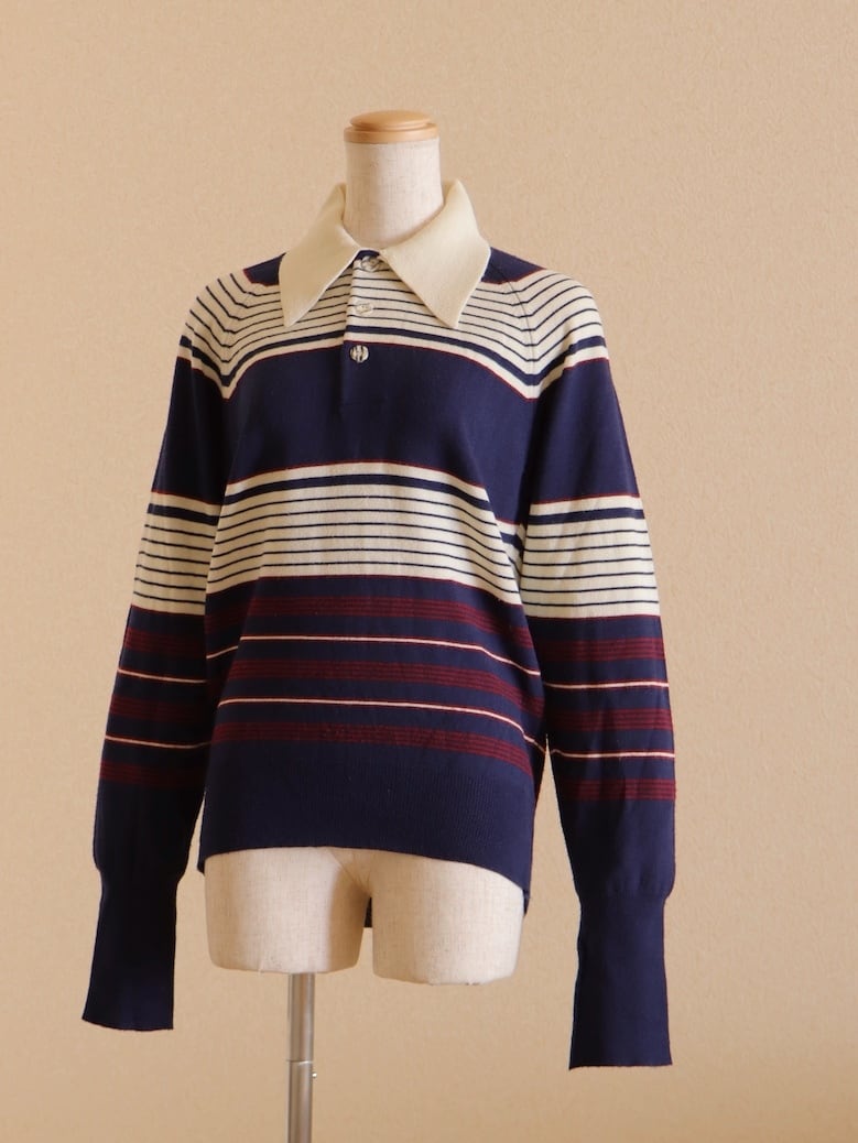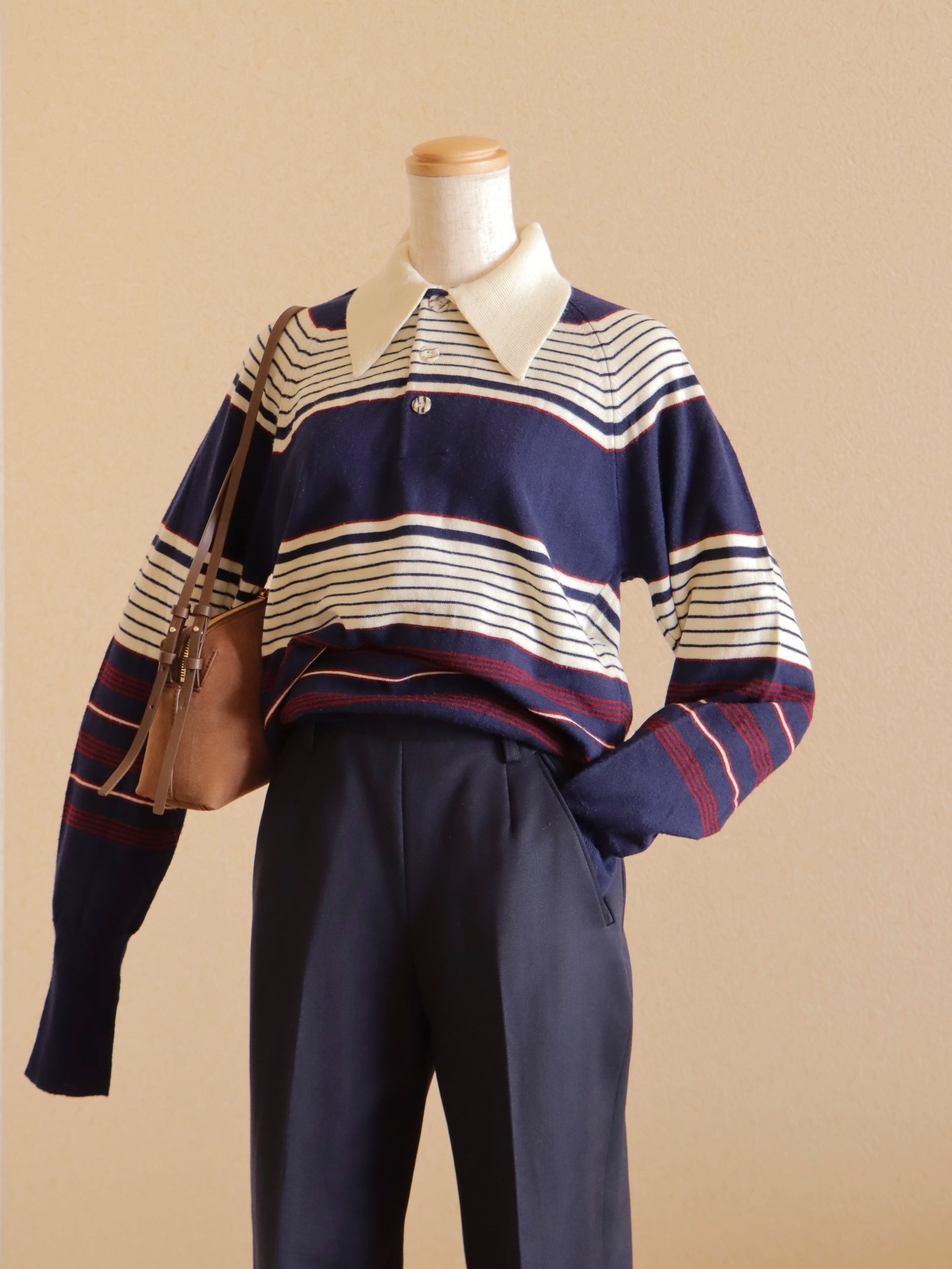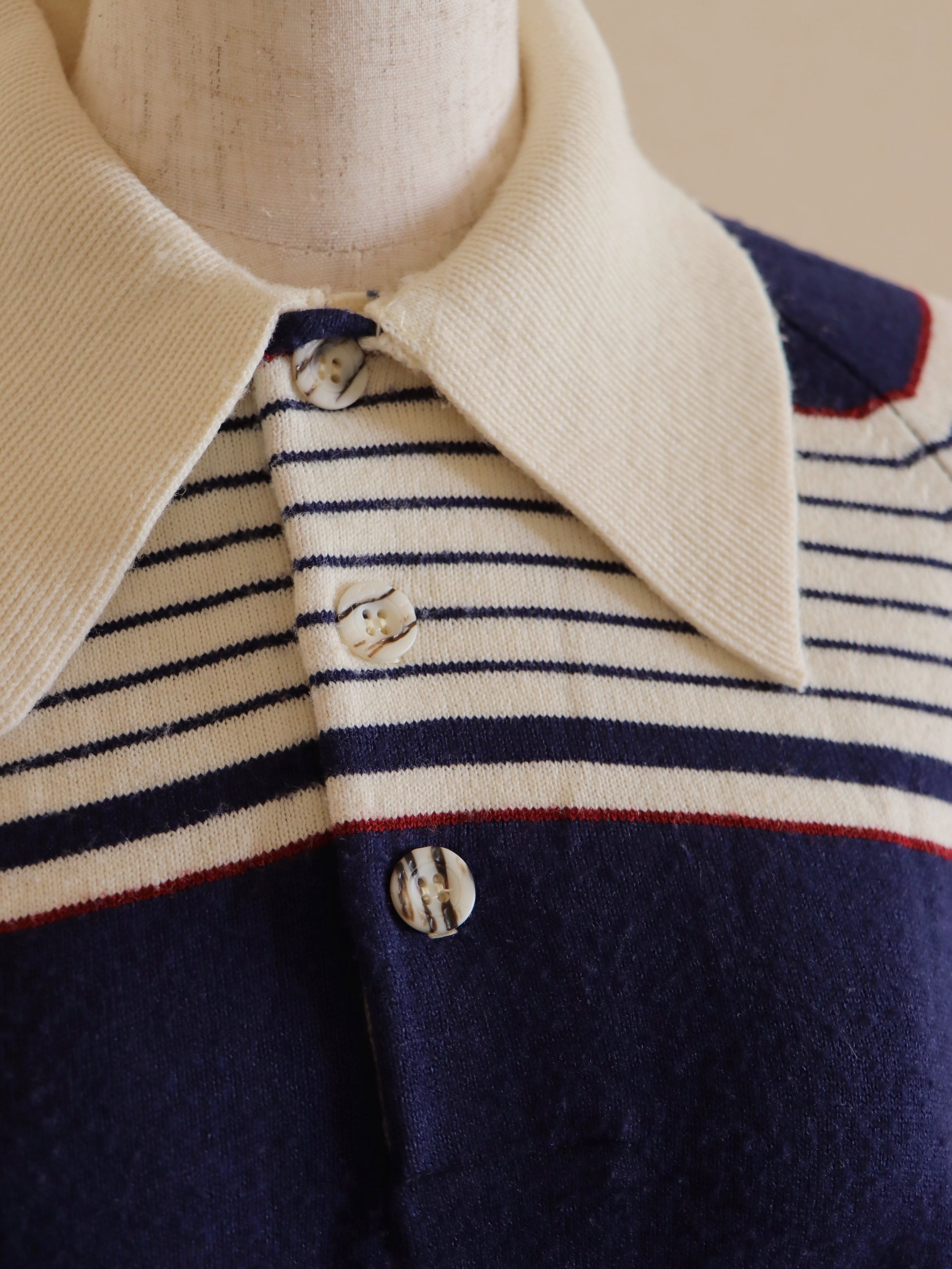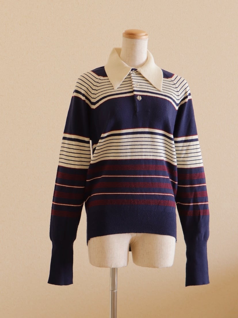 ●70s collared wool design navy & ivory color striped knitted sweater.