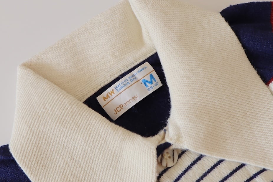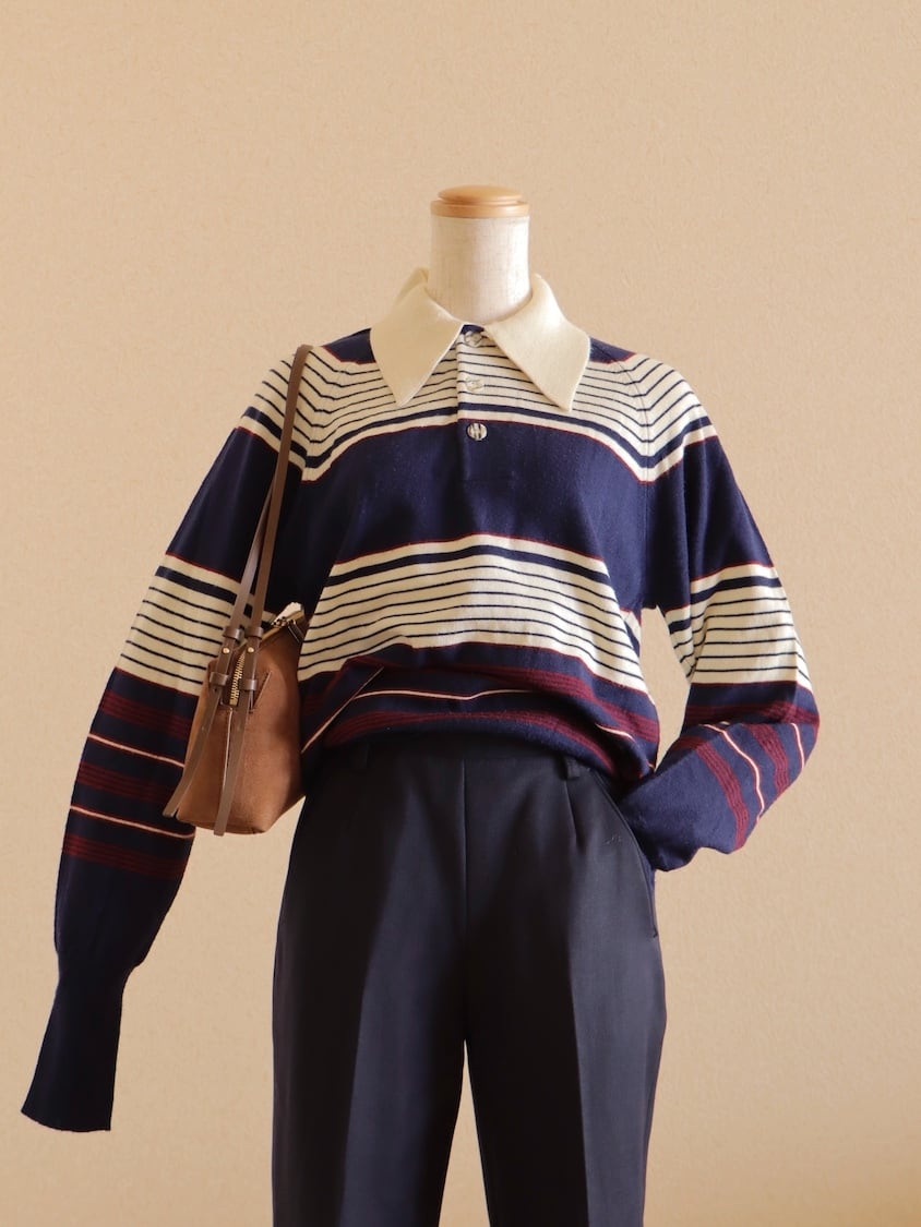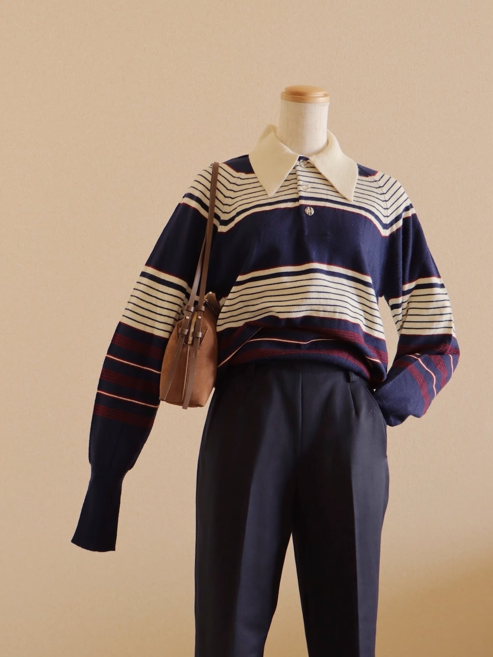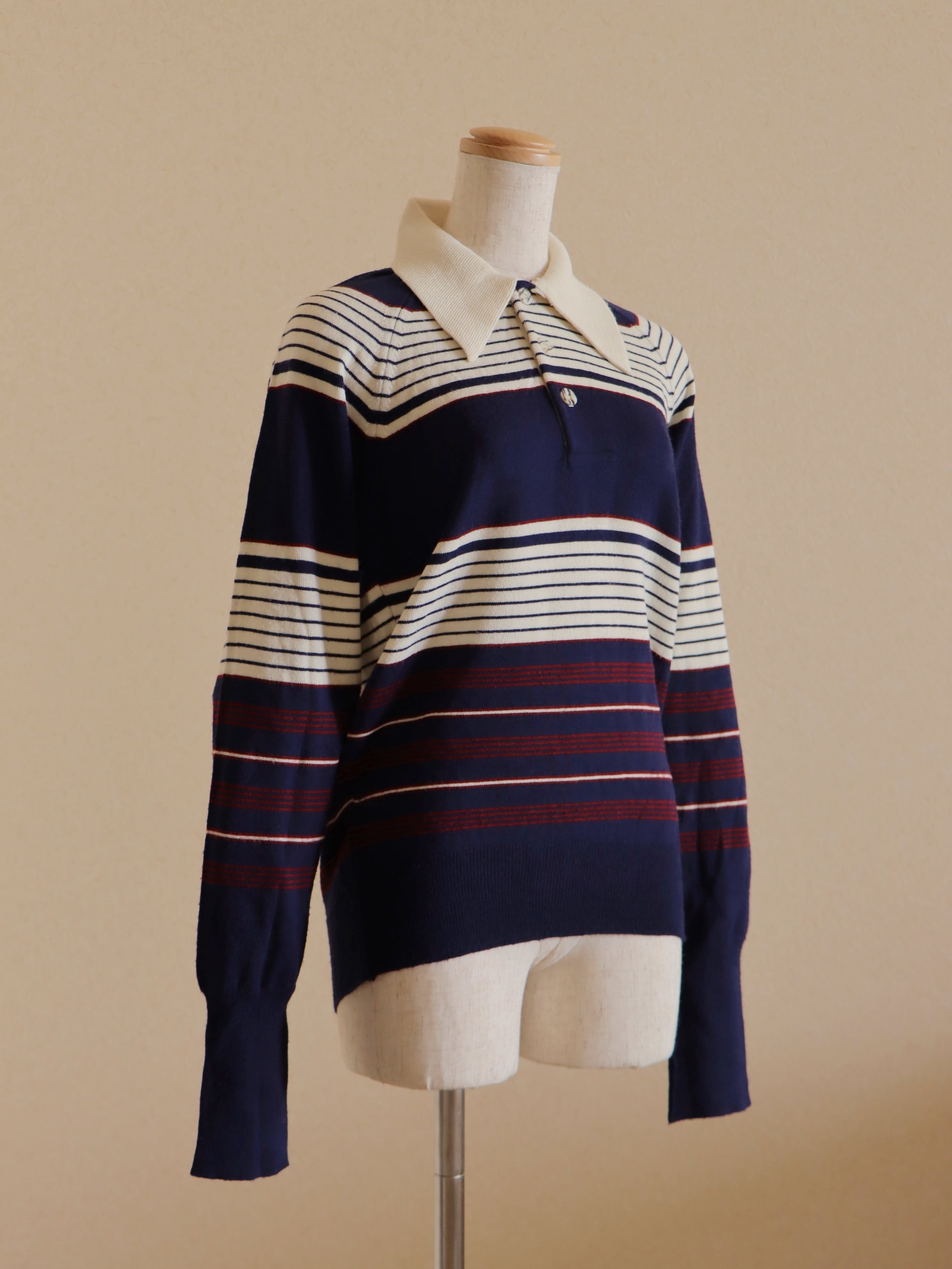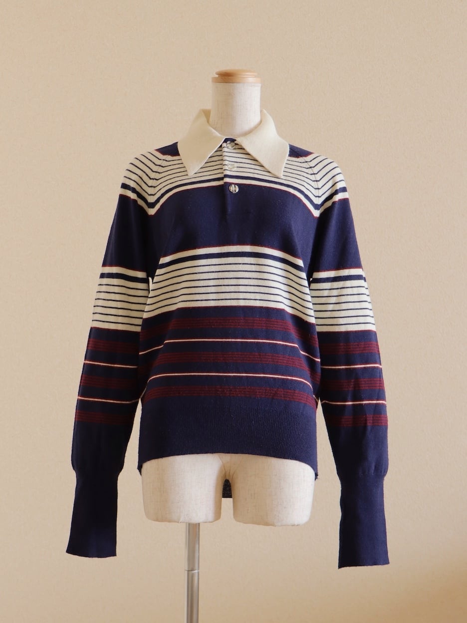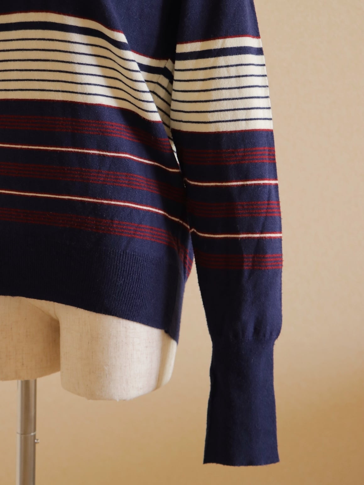 ●70s collared wool design navy & ivory color striped knitted sweater.
