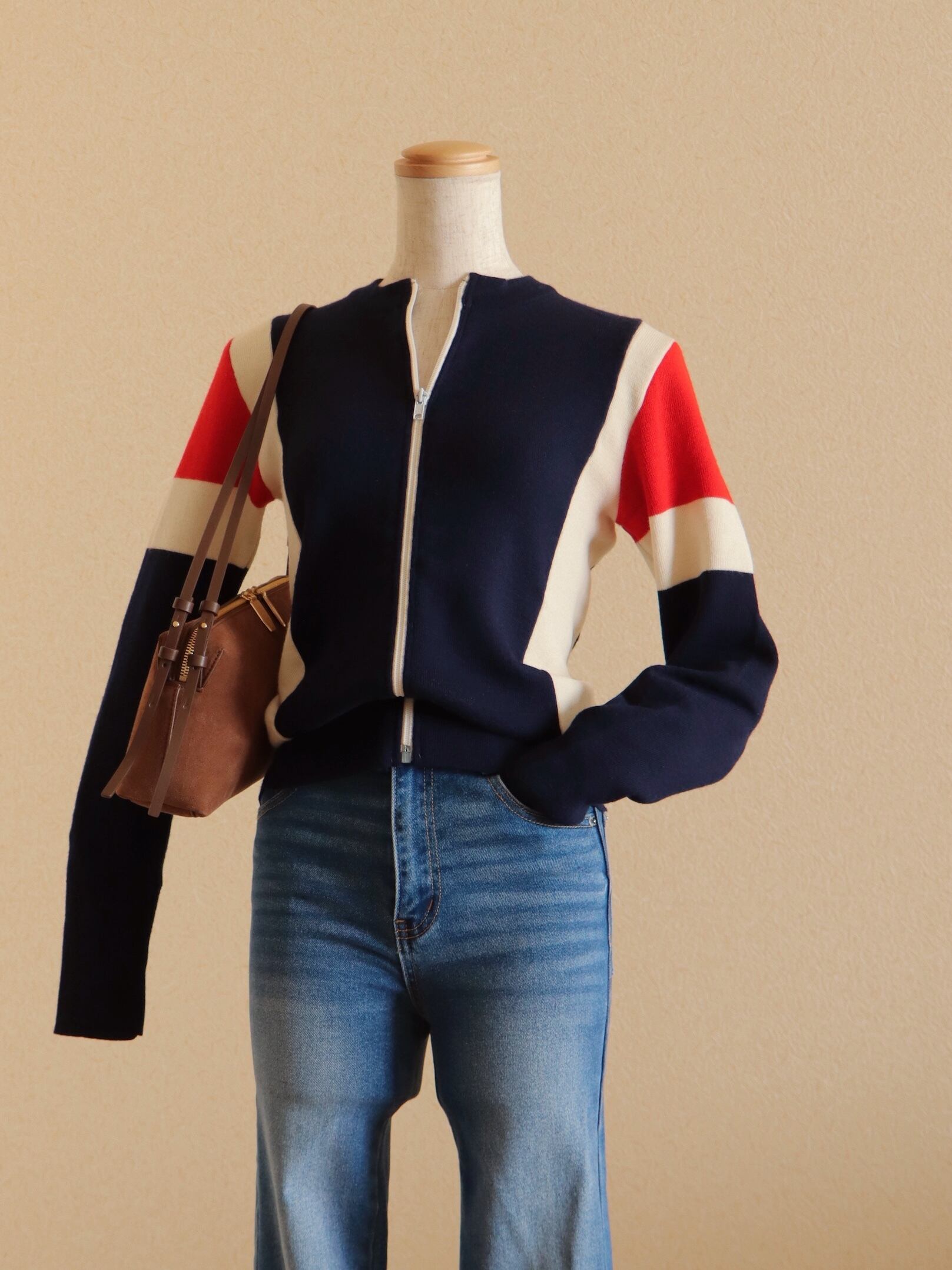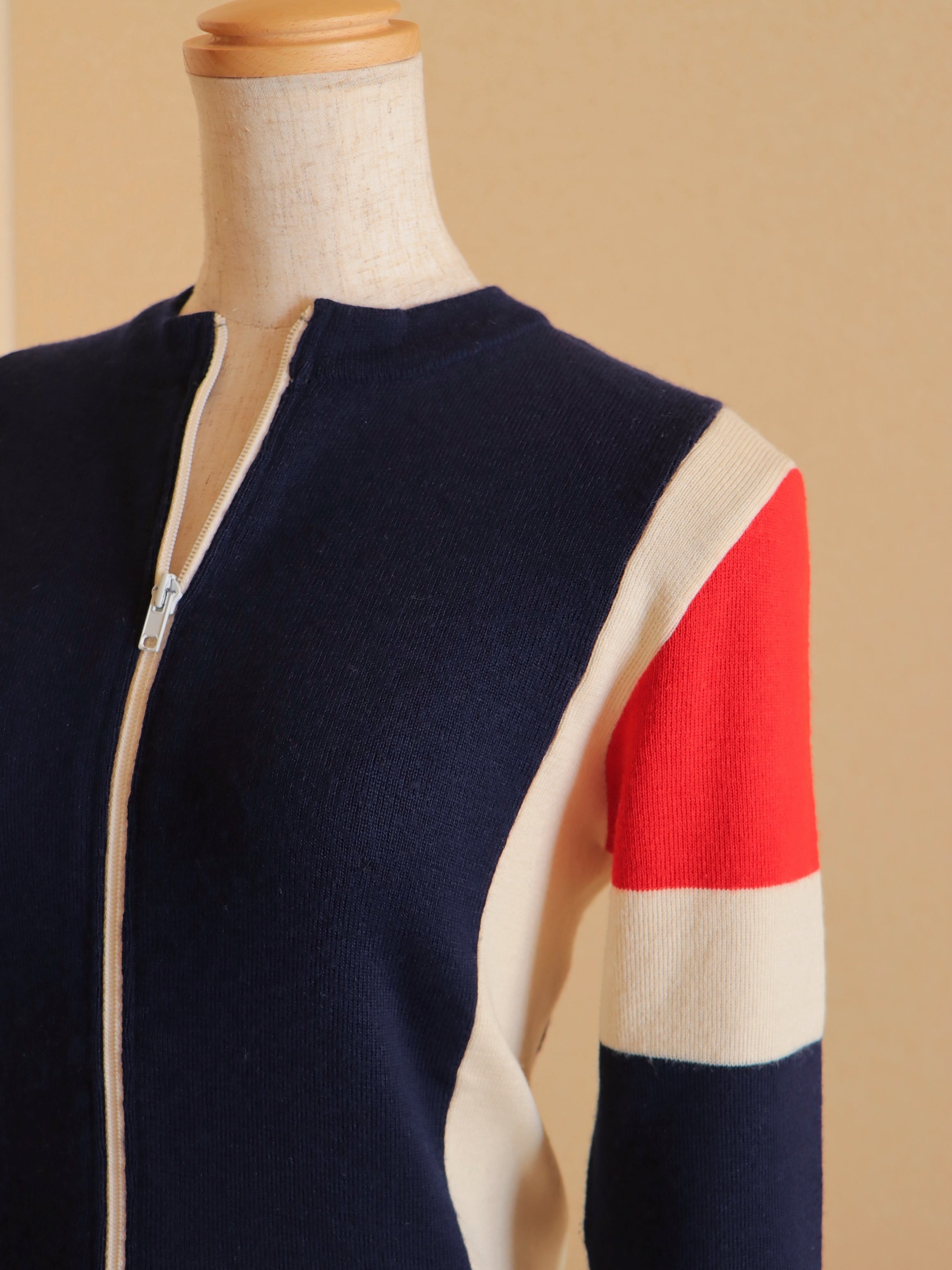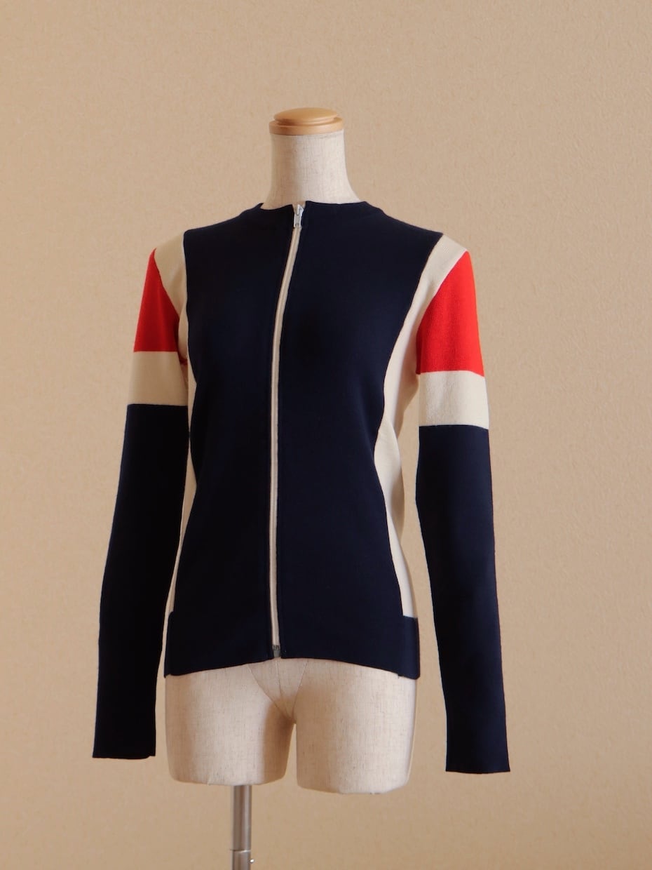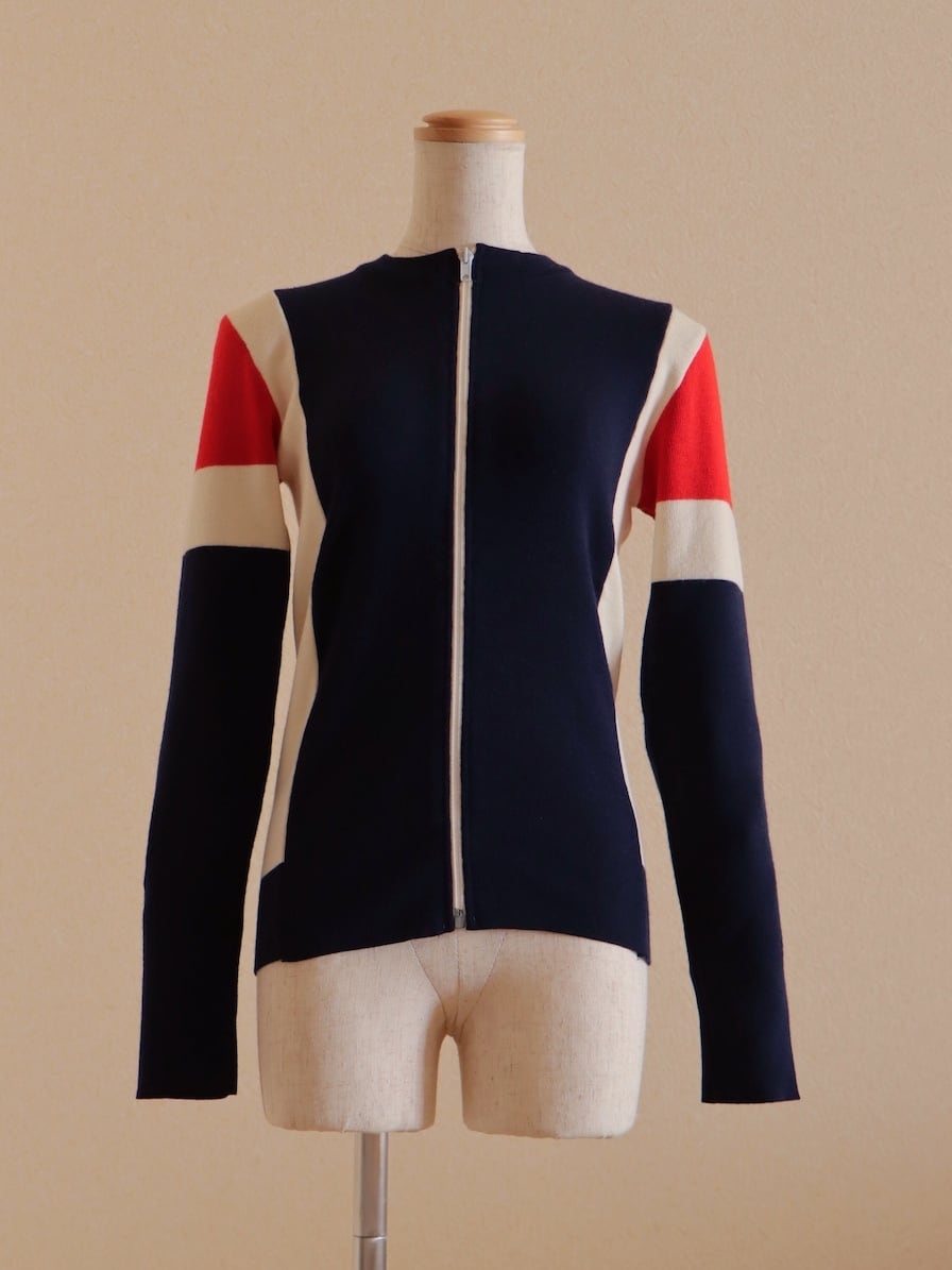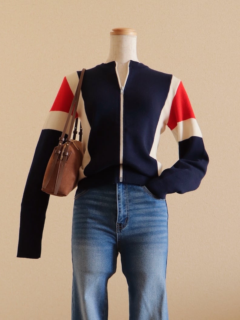 ●Tricolor color wool front zipper knitted cardigan top.