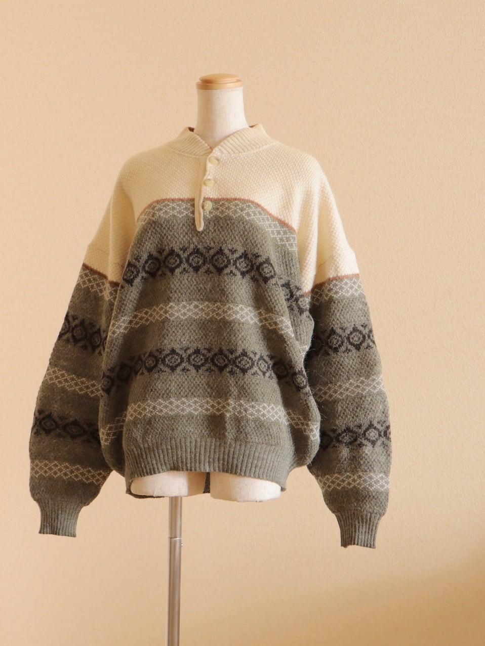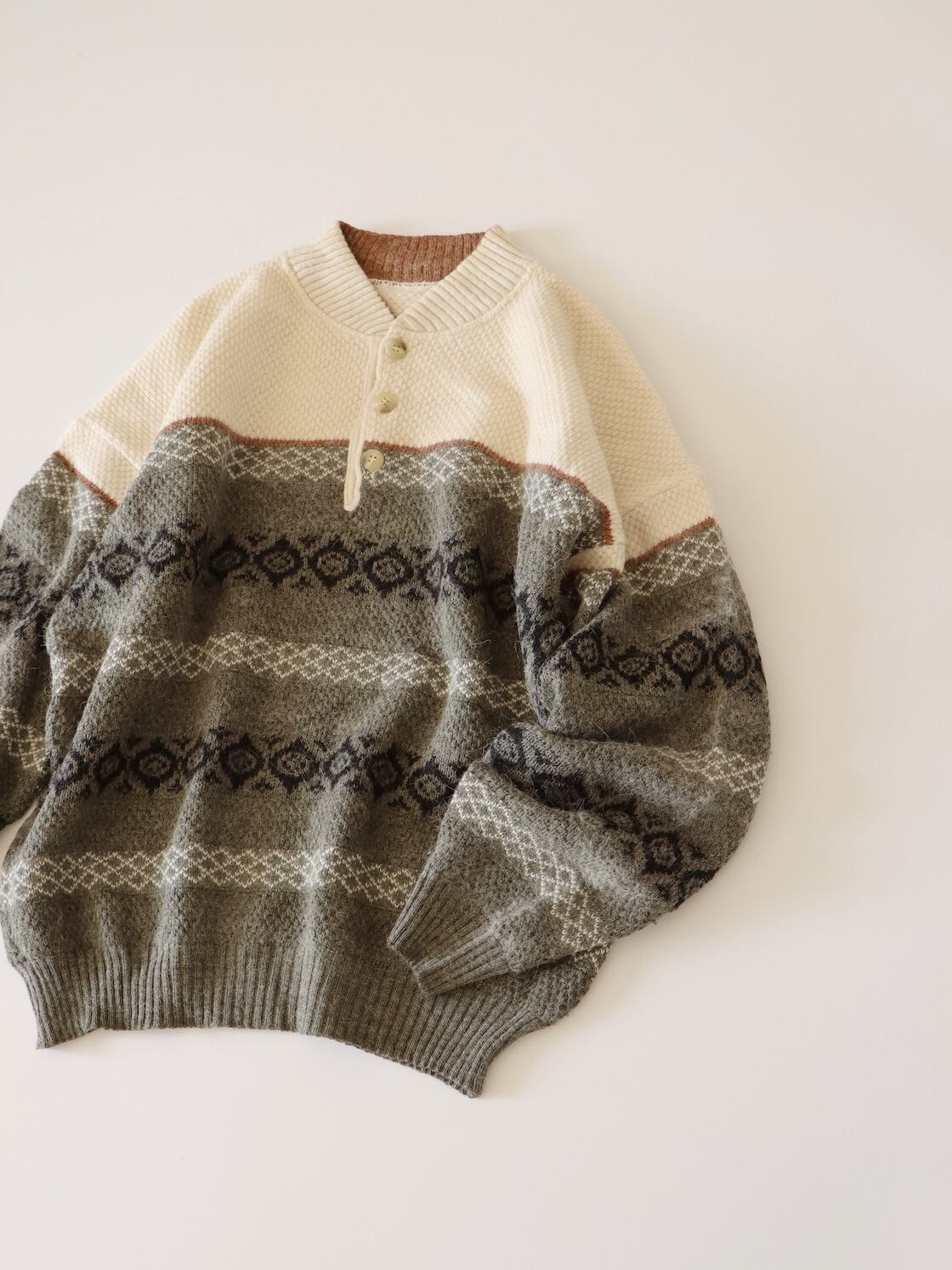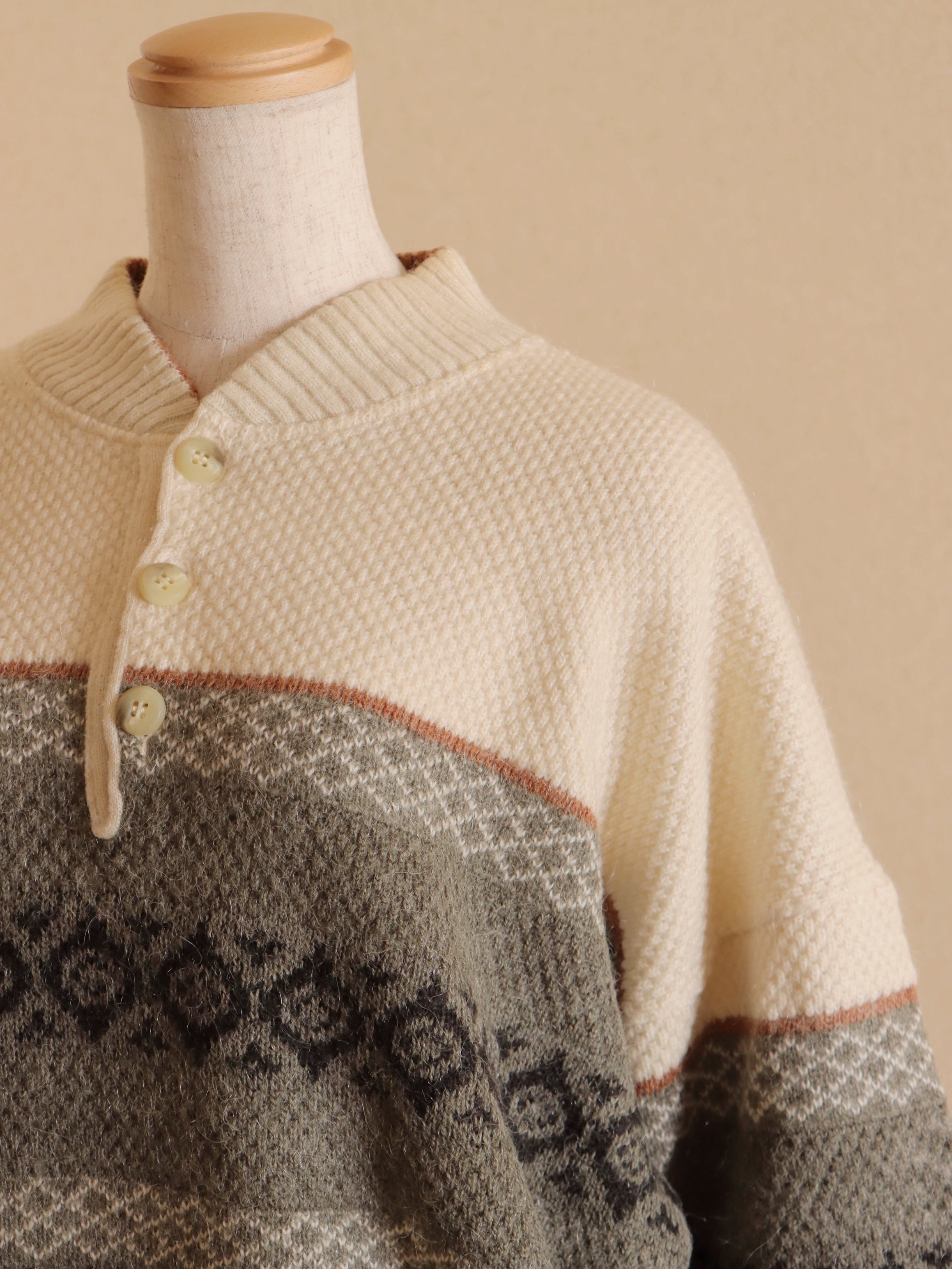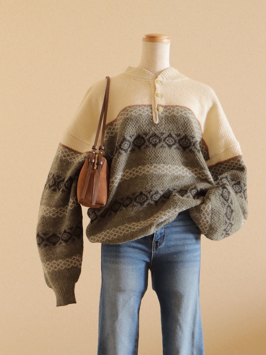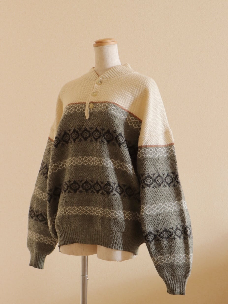 ●fair isle design half button wool sweater.