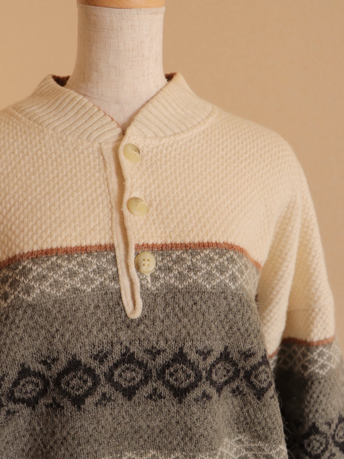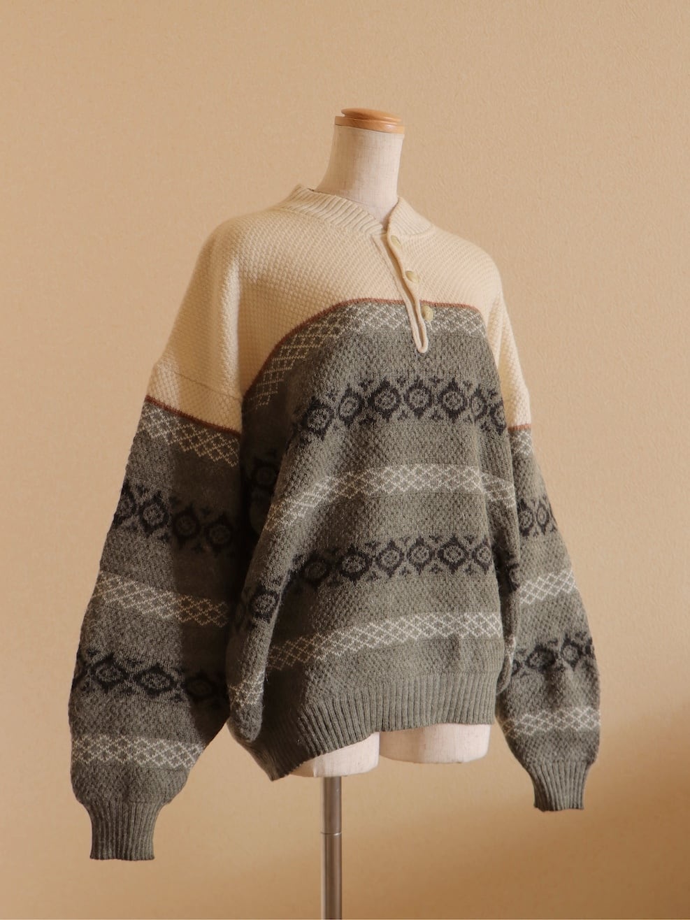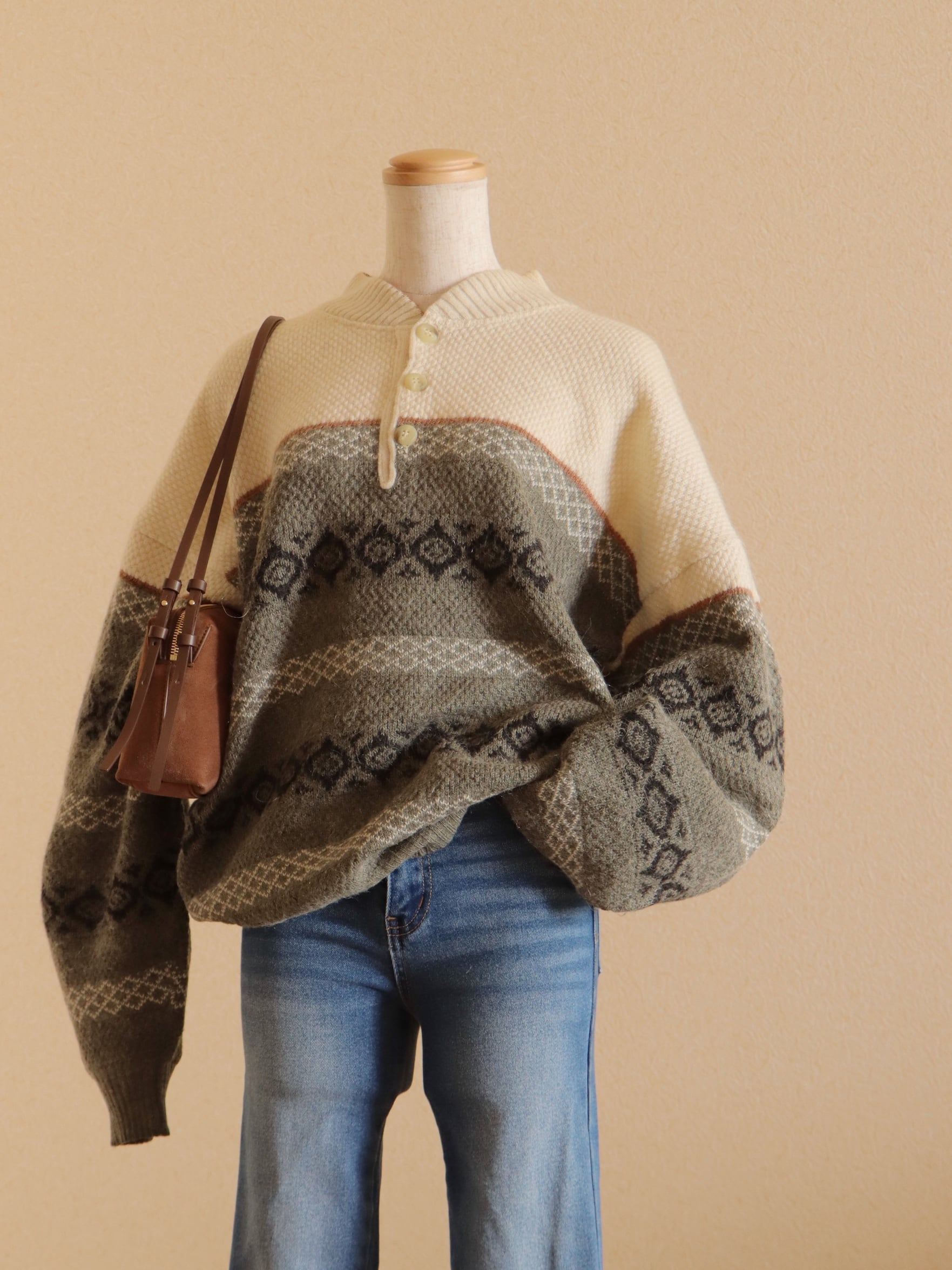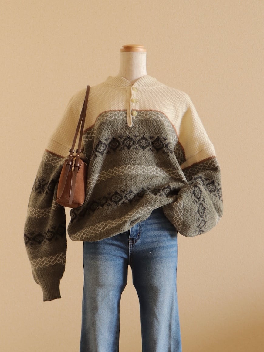 ●fair isle design half button wool sweater