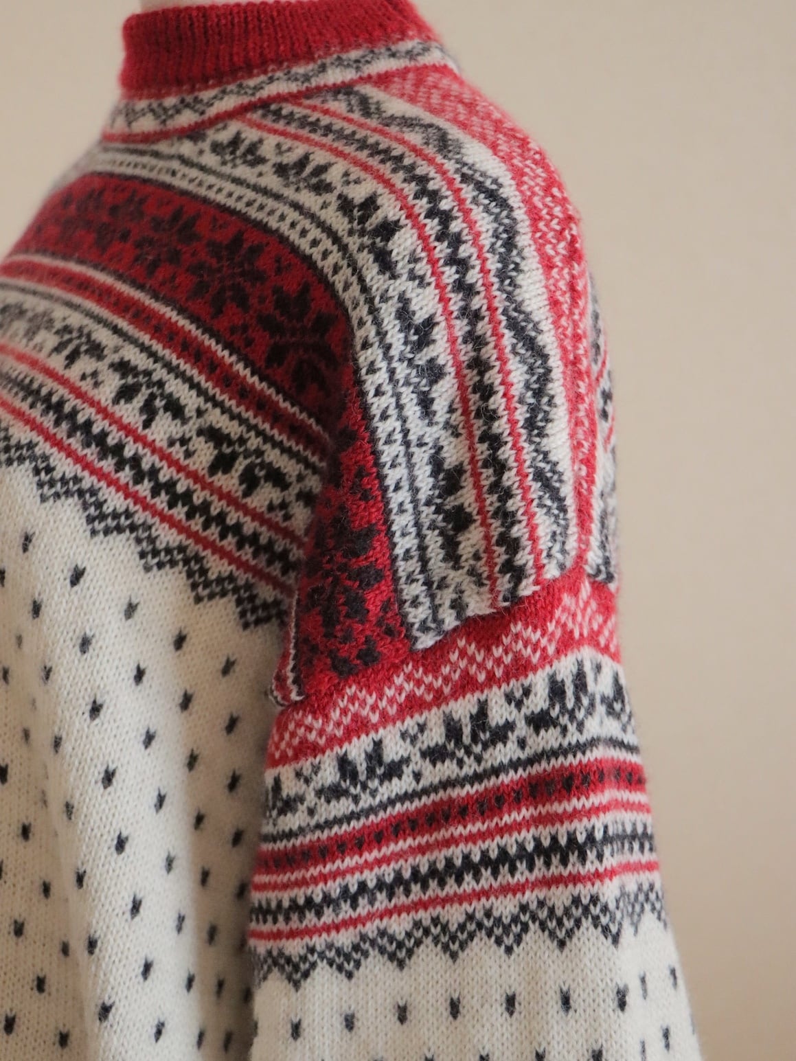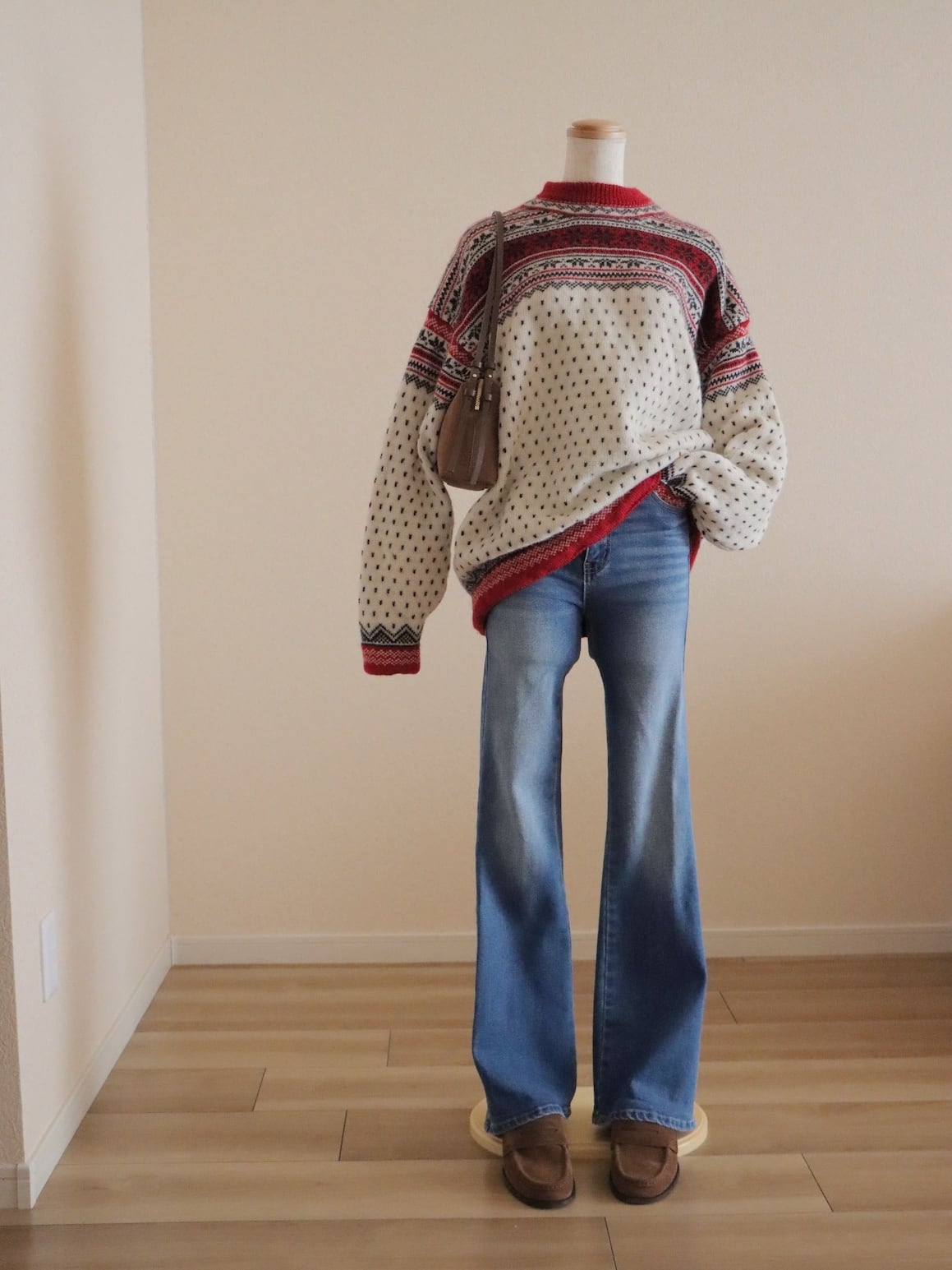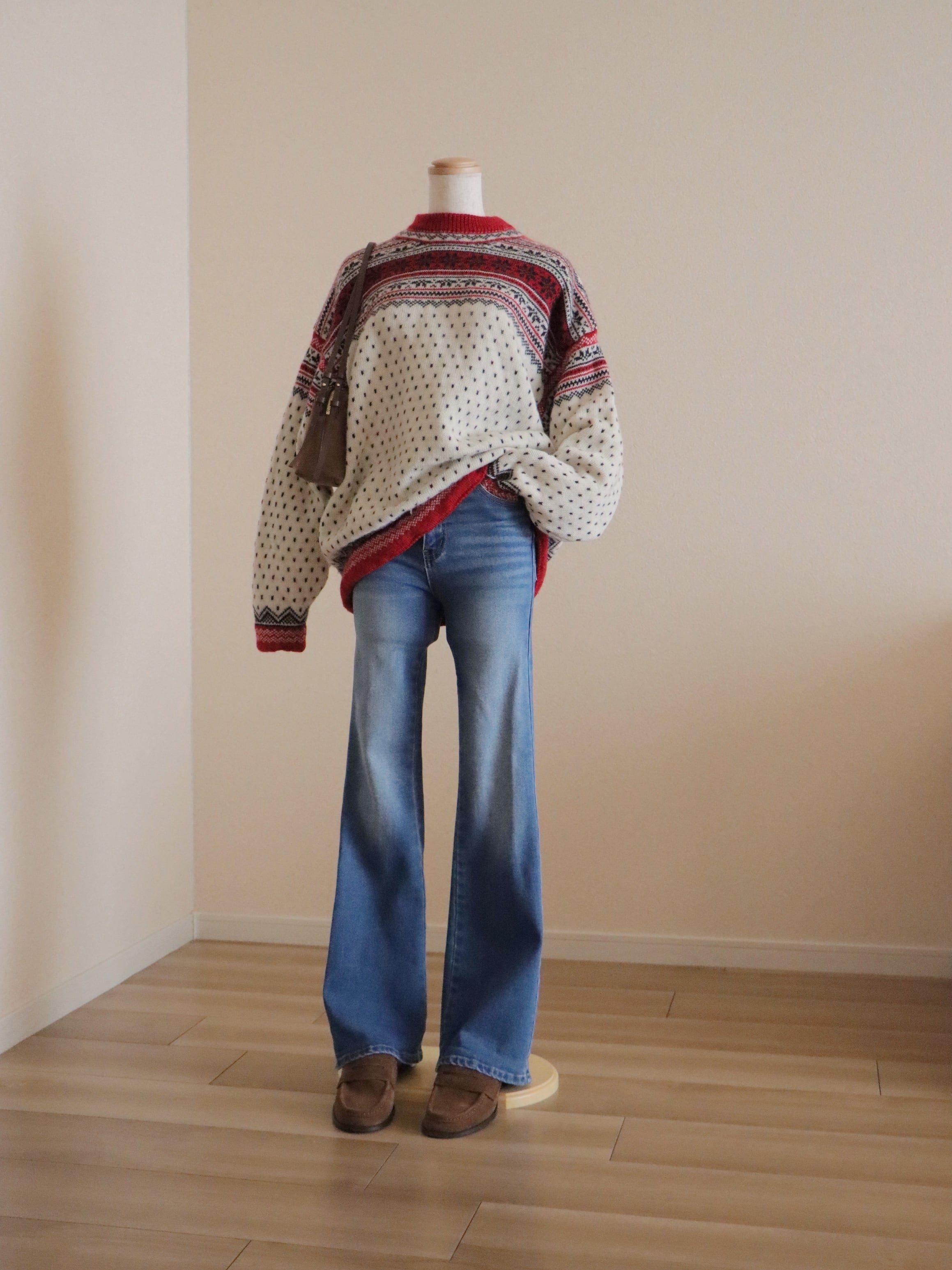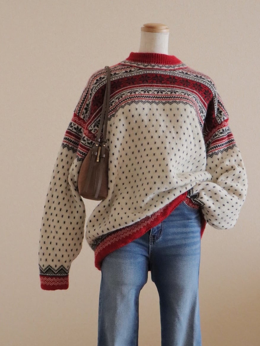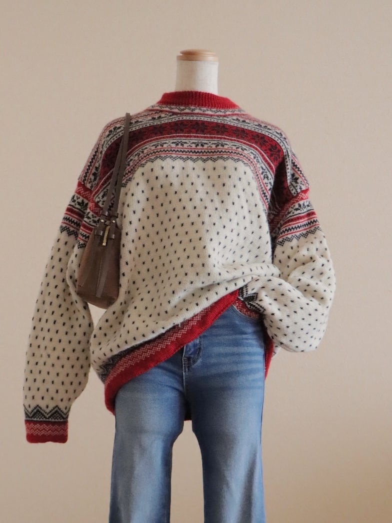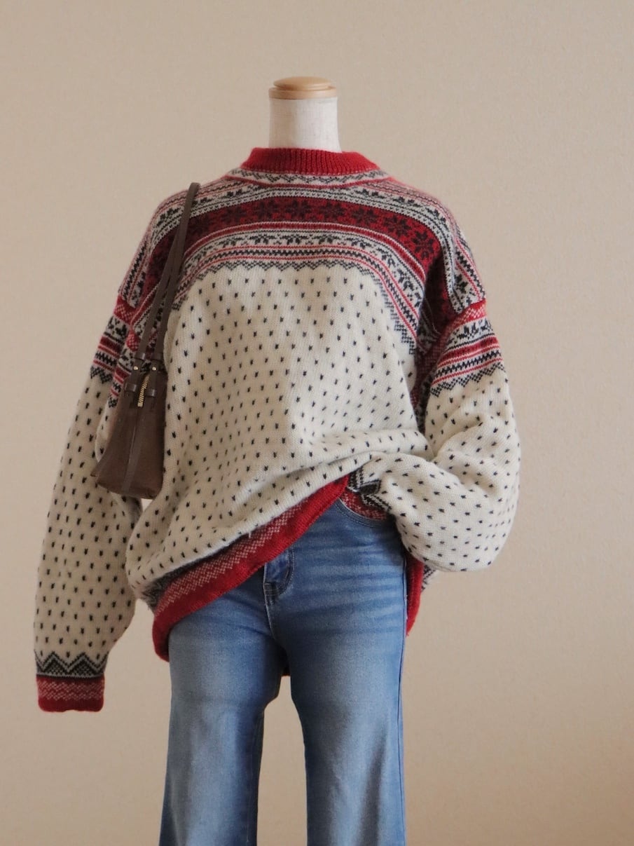 ●LAND'S END red color nordic design knitted wool 100% sweater