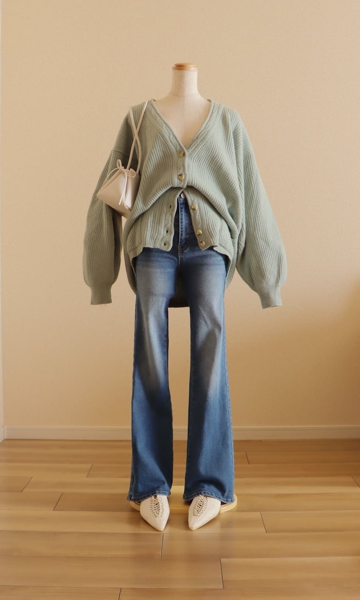 ゆったりルーズなシルエット感が可愛く、淡く優しいカラーで春先まで長くご愛用いただける1着です。
